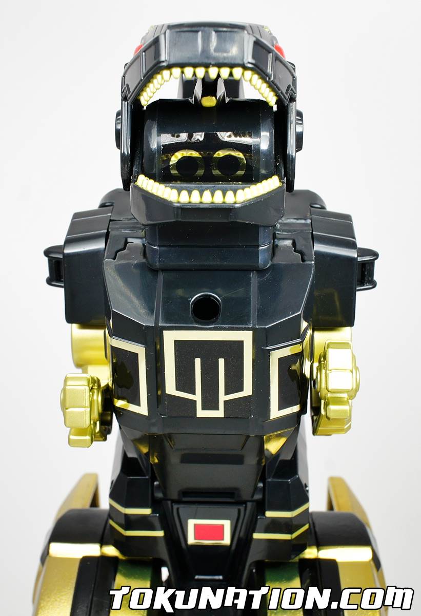 Mastadon Identical to the original Legacy release of the item, save for the black and gold colors, the Mastadon in my opinion is still the stand out item in the entire lineup of zords in this set. With more diecast in it than the others (the back of the Mastadon that forms the arms is made of diecast metal), the gold trimming on the zord as well as the gold paint/stickers just make it pop as a very visually appealing zord. The only downside, which will be repeated on all of the zords, is that dust will easily show on your figure because of the sheer amount of black plastic. Sabertooth Tiger Again, identical to the original Legacy release save for the colors, the Sabertooth Tiger suffers from the same issues, mainly that the forward legs just don't really work for this zord. I should clarify - they work (as in the thing can stand), but they just don't look right or function in a way that makes me think "This is a masterpiece toy!". Then again, I suppose it's not a "masterpiece" in name, but given the price, it should be. On top of that, stress on the plastic is easily shown, as I can see various cracks or dings in the molding. It gives me the feeling that this zord wasn't designed with longevity of mold-use in mind when it was created (this will be it's 3rd use, possibly 4th run depending on when the re-issue went in production). Triceratops The horns look great in gold colors. Otherwise, not much to write home about this version of the figure. Not the best, but far from the worst. Pterodactyl This is one of the better versions of this zord because the gold seems to really make the details of the molding pop more, which is nice because the original seemed really bland, even with the white coloring. Still, it feels pretty "cheap" because of the fact it's such thin plastic, even though it's not very cheap. Tyrannosaurus Rex Another stunning piece that really comes alive with the gold coloring. The black plastic does seem to mute out some of the other detailing that the previous red/gray version showed off. However, the articulation, the mouth movements, and just overall look make this, in my opinion, the continued stand out zord of the group. The Tank Mode I suck and can't get the Pterodactyl to stay in place, so he gets to balance on the T-Rex. Overall, a big massive imposing dinosaur tank is pretty impressive, and more so when unified in black and gold colors. The Megazord Mode The reason this paint scheme was done was to show off this mode in amazing black and gold colors. This truly is the only way to show off this figure and it shows that the color scheme was created for you to display the set in Megazord mode. The gold sword isn't metallic, simply gold shiny chrome, and it works. The Mastadon Shield stands out a little bit too because of the red eyes - a theme of all the zords in this set. The Good!
