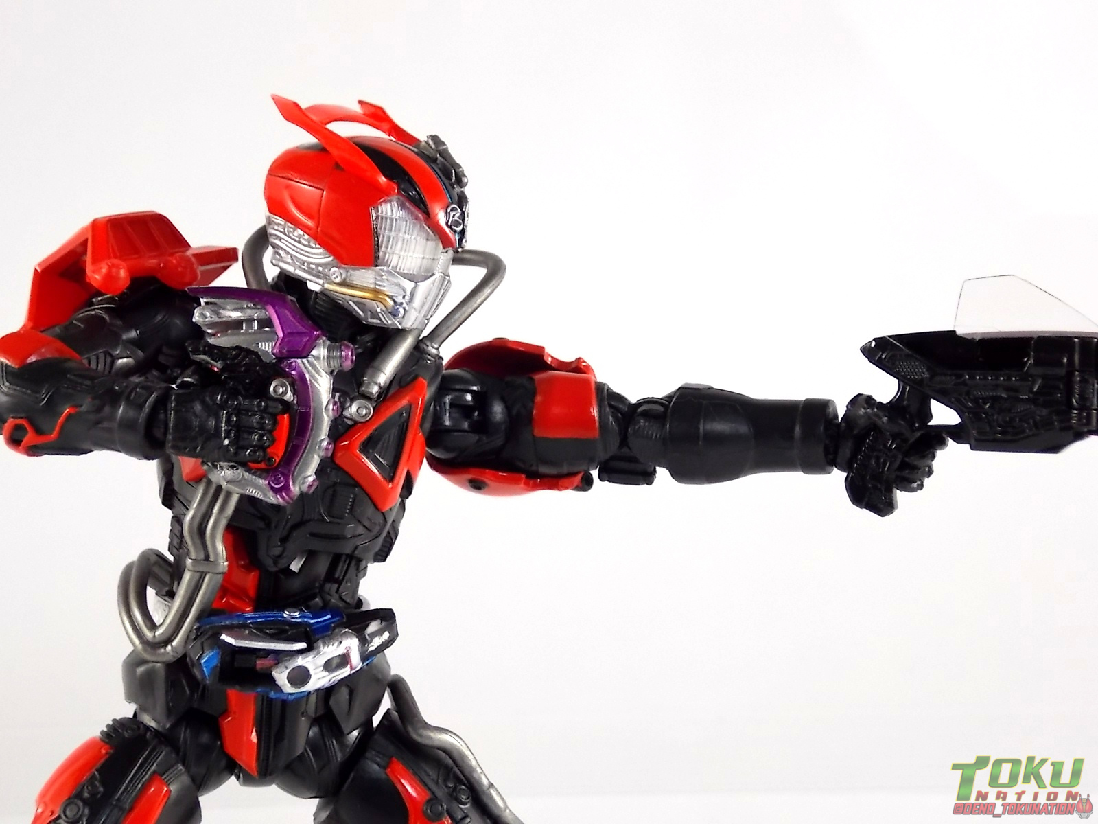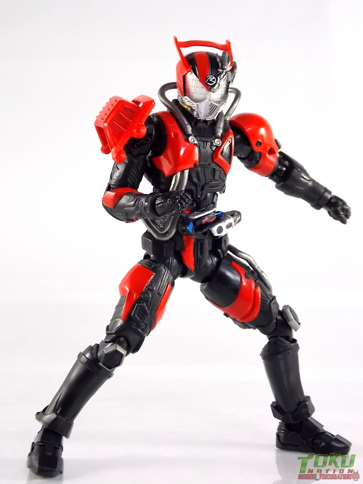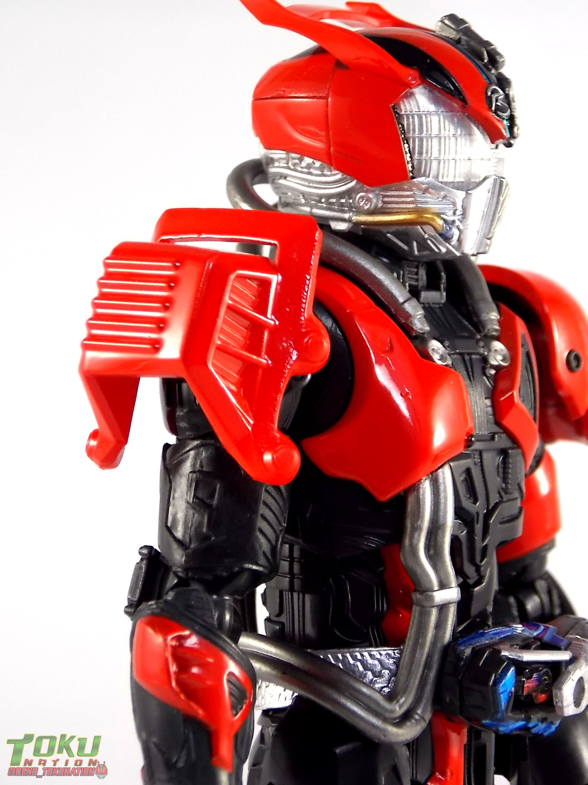 Drive really is all we need. Or at least in my case it is. The time has come once again for a Kamen Rider Drive gallery, this time focusing on the latest Tamashii Web Exclusive release for the series, S.H. Figuarts Kamen Rider Super Dead Heat Drive! Whoa that's a mouthful. Super Dead Heat Drive is a form exclusive to the film Kamen Rider Drive Surprise Future. A bit of junk heap of parts Super Dead Heat is accessed when Shinnosuke haphazardly tosses the Tridoron Key into Chasers' Mach Driver and the body resembles Mashin Chaser but with a retrofitted Drive Type Speed head. It's an interesting form to say the least. Read on below for more! **Much of this review will be very similar to my S.H. Figuarts Mashin Chaser review. The 2 share a nearly identical base body so there won't be much new to say on that point. Packaging Business as usual once again! Nothing new to report with the now standard Drive release packaging. Just some epic shots of Drive himself on the box. Otherwise we have seen this numerous times over up til now, just as with Type Technic, Heart, etc this is a Tamashii Web Exclusive so the box is windowless. Main Figure Just a heads up right up front, Super Dead Heat Drive's main body is 100% identical mold wise to that of Mashin Chaser. Take away the belt, head, and red paint and it's just straight up Mashin Chaser. There's nothing inherently wrong with that, it's accurate, but it needs to be pointed out. And much like Mashin Chaser, while Super Dead Heat looks gorgeous, he doesn't actually feature a ton of paint apps. Mostly because he doesn't need them, the red paint apps present are all that are needed on top of the gorgeously detailed black base body. The grey piping on his body is molded in the appropriate color from the outset. So while Super may not seem to have as many paint applications as other Figuarts, the details are all present. The Mashin Chaser/Super Dead Heat mold is probably one of the more elaborately molded Figuarts ever. Each thigh is unique, both forearms, both shoulders, his chest, head, everything really. This release in particular embodies a ton of chaotic opposite elements. That's mostly due to the rampart hodgepodge nature of how it's created in the film. Made from Mashin Chasers' body, with Mach/Chasers' Driver, & Drives' head makes for one very interesting combo. And thankfully the sculpt of the figure has captured this perfectly. The Mach Drive actually works well on this mold and doesn't impact waist articulation. For this release it's been paired with a Tridoron Key instead of a Signal Bike. Like the Bikes & Shift Cars it is removable but I wouldn't recommend it for fear of losing this tiny piece of plastic. While this head isn't nearly as elaborate as the molds original one, it's by far the most interesting part of the figure. There's just so much extra technical detailing that's been grafted onto the Type Speed head. It really helps sell the junker thrown together nature of this form. I wish there had been a better paint wash to bring out more of the finer details, but it still looks great. By the way those tubes I mentioned above? They're made of an awesomely flexible plastic so you're much less likely to break them than you think. They still tend to get in the way of moving the figure's torso a bit. But my biggest gripe with them is how difficult the abdominal tubes make it to use a Tamashii Stage properly. Most of the time the grabbing arms on one can't get under them and around the waist. Unless you have larger grabbing arms like those that come with Cloth Myth figures, they aren't big enough to wrap around the tubes on the outside either. So it's a pain to find a happy position with a stage. The shoulders and arms are still a bit of an issue with this release too. Though this body really does have a full range of motion, both shoulders have ball jointed pads on them designed to prevent you from lifting the arms up and fully out perpendicular to the body. The shoulders can be pulled down and out but when you try to bend them back and up the sheath around the shoulder impacts the torso. Rather than being able to put his arms in a 90 degree angle relative to the torso, you get more of about 75-80 degrees. So it's a bit hard to create his more iconic poses. One more thing to mention is that this figure retains Mashin Chaser's back port! Meaning Super Dead Heat is entirely compatible with the Busou Chaser Accessory Set! So if you want to give your Super Dead Heat a pair of rocking mechanical wings you can. I had some real fun with this in the images below. Oddly enough the connection for these wings on Super Dead Heat appears to be MUCH stronger than it was for my Mashin Chaser. They fall off of him very easily. On Drive though it's a very nice and snug fit. And wow do they look great with this body, pairing him up with a Door Gun & Handle Sword really does the trick too. As you'll read below Super Dead Heat Drive is a sparse release. Accessories The pickings are VERY slim: 3 - Sets of additional hands. And that is it. Now to be totally fair, Super Dead Heat doesn't have a Break Gunner like Mashin Chaser, nor does it technically have access to the Door Gun or Handle Sword. I've included images of these weapons as well as the Busou Chaser Accessory set with Super Dead Heat just to have some cool pictures. But he doesn't come with any of them. Though the hands he comes with, as straight repacks of what came with Mashin Chaser, are designed to hold a Break Gunner specifically while the other general "holding things" hands work for just about anything. This shouldn't be a surprise coming from Bandai, but would it have killed them to include something, anything really, to offset the price? Final Thoughts Taking us back to the lines sophomore outing using the Mashin Chaser body I expected only to be mildly please with this release. The minor functional issues of the mold are of course still present, and there's the accessory issue, but it's still 