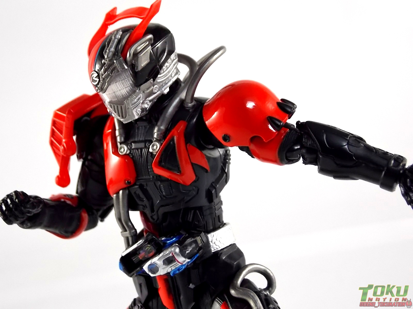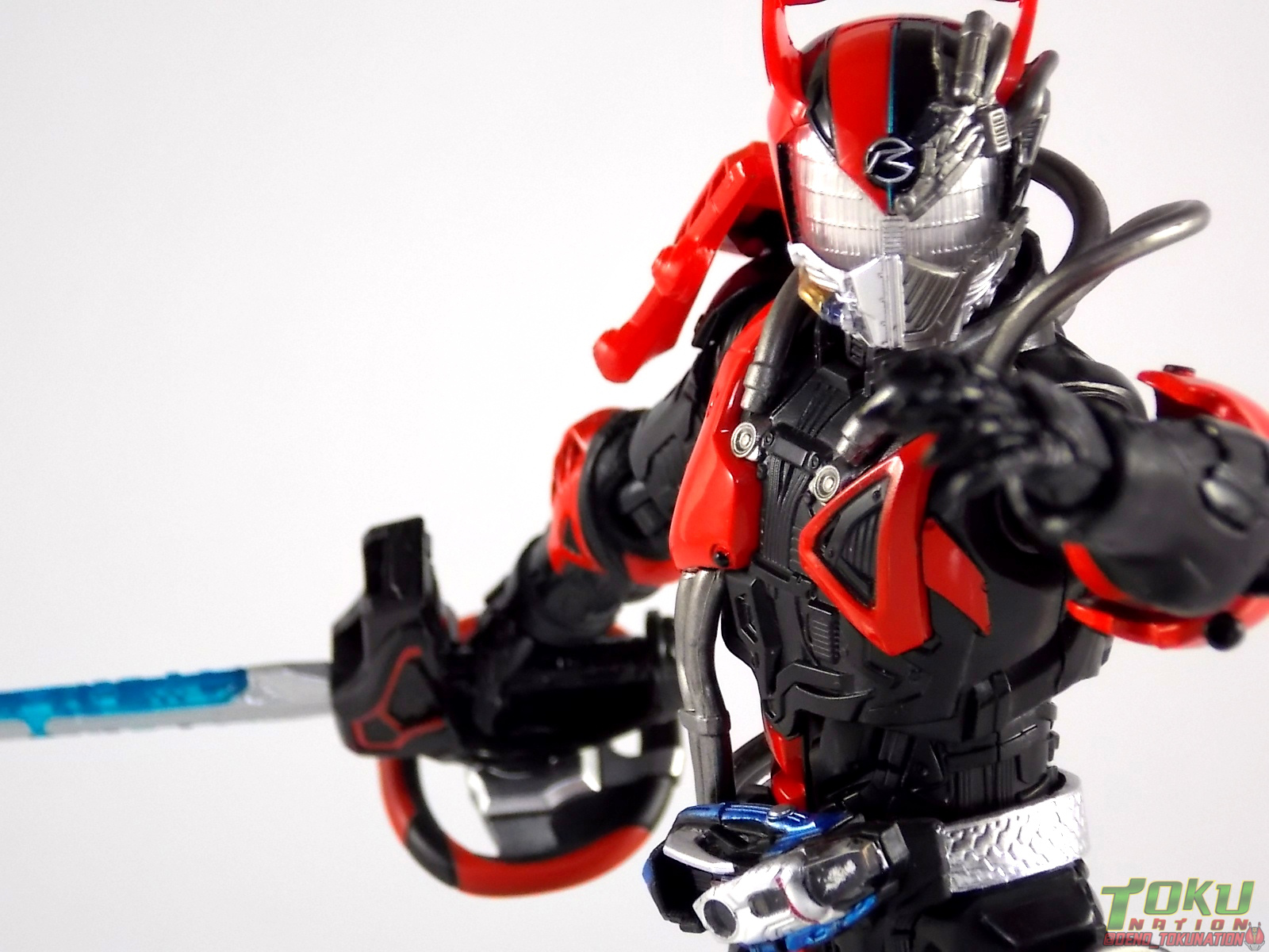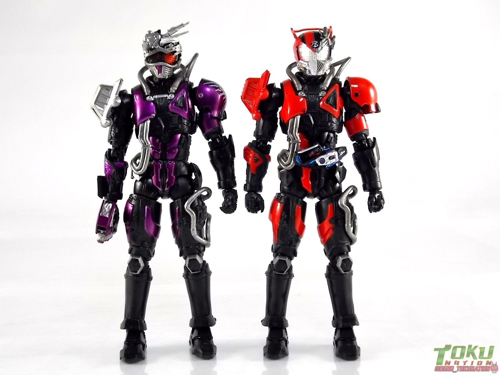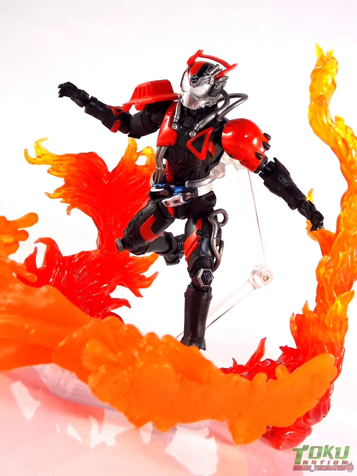 Drive really is all we need. Or at least in my case it is. The time has come once again for a Kamen Rider Drive gallery, this time focusing on the latest Tamashii Web Exclusive release for the series, S.H. Figuarts Kamen Rider Super Dead Heat Drive! Whoa that's a mouthful. Super Dead Heat Drive is a form exclusive to the film Kamen Rider Drive Surprise Future. A bit of junk heap of parts Super Dead Heat is accessed when Shinnosuke haphazardly tosses the Tridoron Key into Chasers' Mach Driver and the body resembles Mashin Chaser but with a retrofitted Drive Type Speed head. It's an interesting form to say the least. Read on below for more! **Much of this review will be very similar to my S.H. Figuarts Mashin Chaser review. The 2 share a nearly identical base body so there won't be much new to say on that point. Packaging Business as usual once again! Nothing new to report with the now standard Drive release packaging. Just some epic shots of Drive himself on the box. Otherwise we have seen this numerous times over up til now, just as with Type Technic, Heart, etc this is a Tamashii Web Exclusive so the box is windowless. Main Figure Just a heads up right up front, Super Dead Heat Drive's main body is 100% identical mold wise to that of Mashin Chaser. Take away the belt, head, and red paint and it's just straight up Mashin Chaser. There's nothing inherently wrong with that, it's accurate, but it needs to be pointed out. And much like Mashin Chaser, while Super Dead Heat looks gorgeous, he doesn't actually feature a ton of paint apps. Mostly because he doesn't need them, the red paint apps present are all that are needed on top of the gorgeously detailed black base body. The grey piping on his body is molded in the appropriate color from the outset. So while Super may not seem to have as many paint applications as other Figuarts, the details are all present. The Mashin Chaser/Super Dead Heat mold is probably one of the more elaborately molded Figuarts ever. Each thigh is unique, both forearms, both shoulders, his chest, head, everything really. This release in particular embodies a ton of chaotic opposite elements. That's mostly due to the rampart hodgepodge nature of how it's created in the film. Made from Mashin Chasers' body, with Mach/Chasers' Driver, & Drives' head makes for one very interesting combo. And thankfully the sculpt of the figure has captured this perfectly. The Mach Drive actually works well on this mold and doesn't impact waist articulation. For this release it's been paired with a Tridoron Key instead of a Signal Bike. Like the Bikes & Shift Cars it is removable but I wouldn't recommend it for fear of losing this tiny piece of plastic. While this head isn't nearly as elaborate as the molds original one, it's by far the most interesting part of the figure. There's just so much extra technical detailing that's been grafted onto the Type Speed head. It really helps sell the junker thrown together nature of this form. I wish there had been a better paint wash to bring out more of the finer details, but it still looks great. By the way those tubes I mentioned above? They're made of an awesomely flexible plastic so you're much less likely to break them than you think. They still tend to get in the way of moving the figure's torso a bit. But my biggest gripe with them is how difficult the abdominal tubes make it to use a Tamashii Stage properly. Most of the time the grabbing arms on one can't get under them and around the waist. Unless you have larger grabbing arms like those that come with Cloth Myth figures, they aren't big enough to wrap around the tubes on the outside either. So it's a pain to find a happy position with a stage. The shoulders and arms are still a bit of an issue with this release too. Though this body really does have a full range of motion, both shoulders have ball jointed pads on them designed to prevent you from lifting the arms up and fully out perpendicular to the body. The shoulders can be pulled down and out but when you try to bend them back and up the sheath around the shoulder impacts the torso. Rather than being able to put his arms in a 90 degree angle relative to the torso, you get more of about 75-80 degrees. So it's a bit hard to create his more iconic poses. One more thing to mention is that this figure retains Mashin Chaser's back port! Meaning Super Dead Heat is entirely compatible with the Busou Chaser Accessory Set! So if you want to give your Super Dead Heat a pair of rocking mechanical wings you can. I had some real fun with this in the images below. Oddly enough the connection for these wings on Super Dead Heat appears to be MUCH stronger than it was for my Mashin Chaser. They fall off of him very easily. On Drive though it's a very nice and snug fit. And wow do they look great with this body, pairing him up with a Door Gun & Handle Sword really does the trick too. As you'll read below Super Dead Heat Drive is a sparse release. Accessories The pickings are VERY slim: 3 - Sets of additional hands. And that is it. Now to be totally fair, Super Dead Heat doesn't have a Break Gunner like Mashin Chaser, nor does it technically have access to the Door Gun or Handle Sword. I've included images of these weapons as well as the Busou Chaser Accessory set with Super Dead Heat just to have some cool pictures. But he doesn't come with any of them. Though the hands he comes with, as straight repacks of what came with Mashin Chaser, are designed to hold a Break Gunner specifically while the other general "holding things" hands work for just about anything. This shouldn't be a surprise coming from Bandai, but would it have killed them to include something, anything really, to offset the price? Final Thoughts Taking us back to the lines sophomore outing using the Mashin Chaser body I expected only to be mildly please with this release. The minor functional issues of the mold are of course still present, and there's the accessory issue, but it's still 