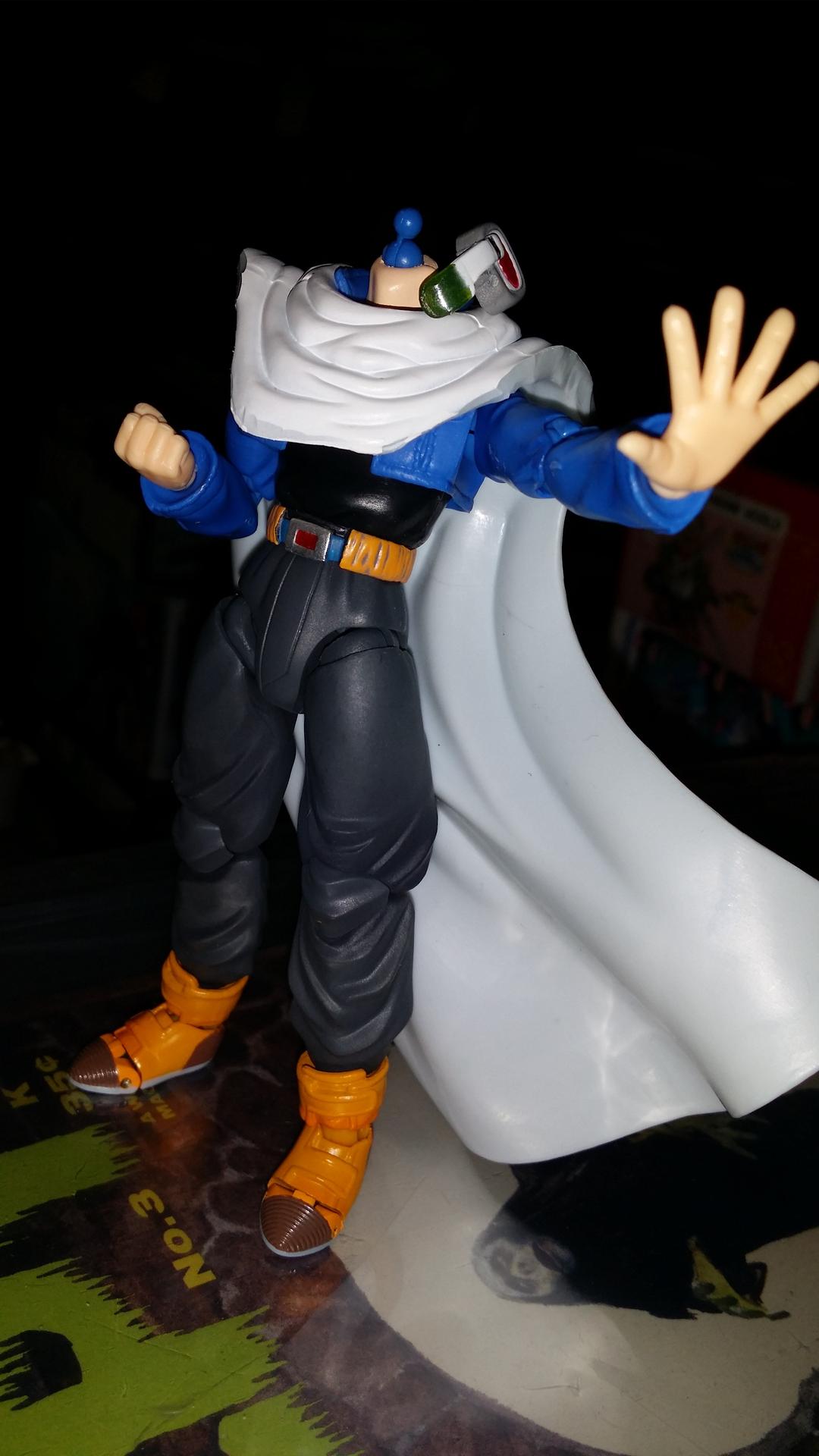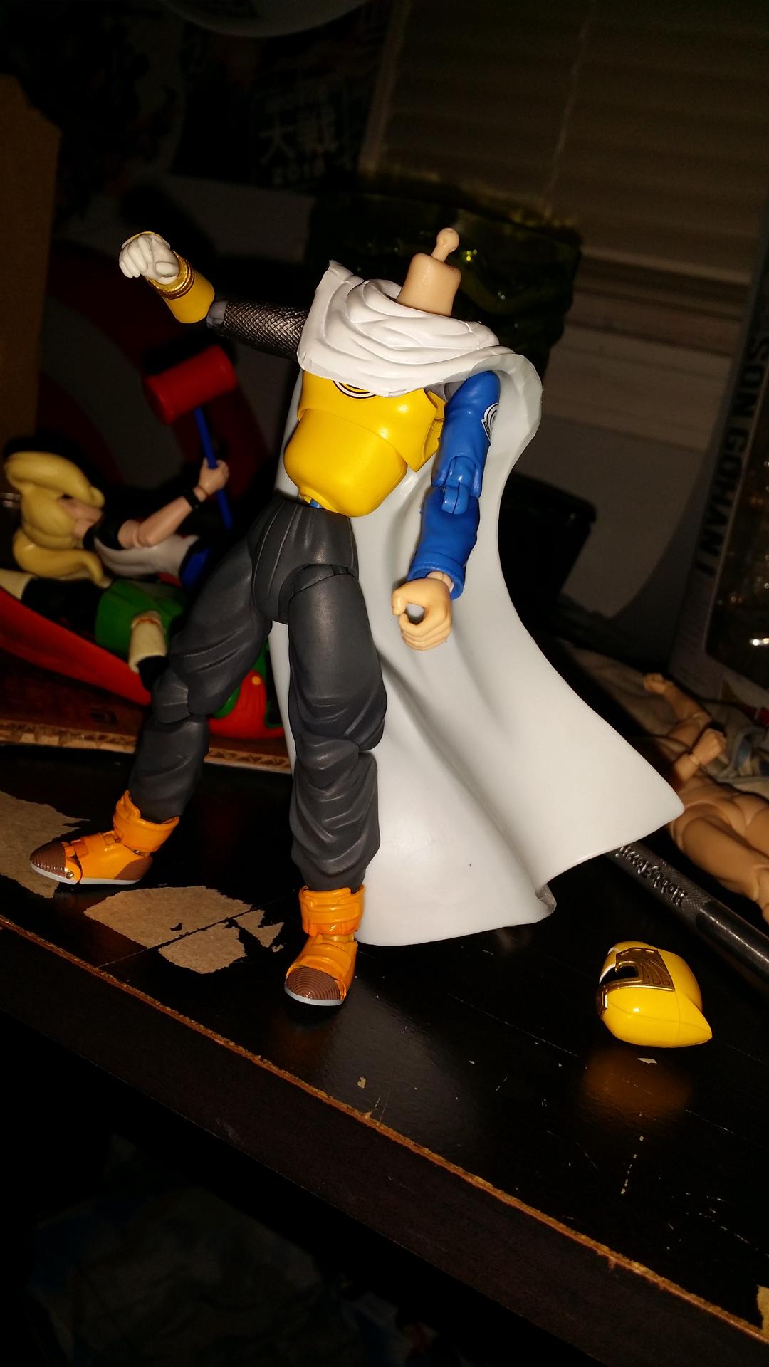 The generic stand in Time Patroller is a great design that's forgotten easily thanks to the games customization options. Luckily it just took a little quick thinking to customize this guy too. Future Warrior uses these parts: - Legs, waist, Belt, jacket, arms from S.H. Figuarts Trunks Premium Color -Torso and shoulder socket joints from S.H. Figuarts Hurricane Yellow -Neck and peg from S.H. Figuarts Body-Kun -Head from S.H. Figuarts Ultimate Gohan - cape & scouter come from some vintage US release DBZ figures Most of this just fit together well. I did have to use rubbing alcohol to remove the emblem on the Hurricane Yellow chest. I also ahd to shave down Body-Kuns neck to mek it fit Gohans head. The sockets from Yellows shoulders worked with this torso I jut swapped out Trunks sockets for them. It took some stretching to get Trunks jacket to fit this larger torso and it is not a great fit, but it works. This custom is still a WIP, but basically I've gotten the parts all fitted and placed, all this guy need to finish him off is a hole drilled in his head to fix the scouter to, and a nice red paint job for his hair. Otherwise he's all but done. It involved a lot of trial and error to get to this point but I like how it's shaped up. Let me know what you think!
