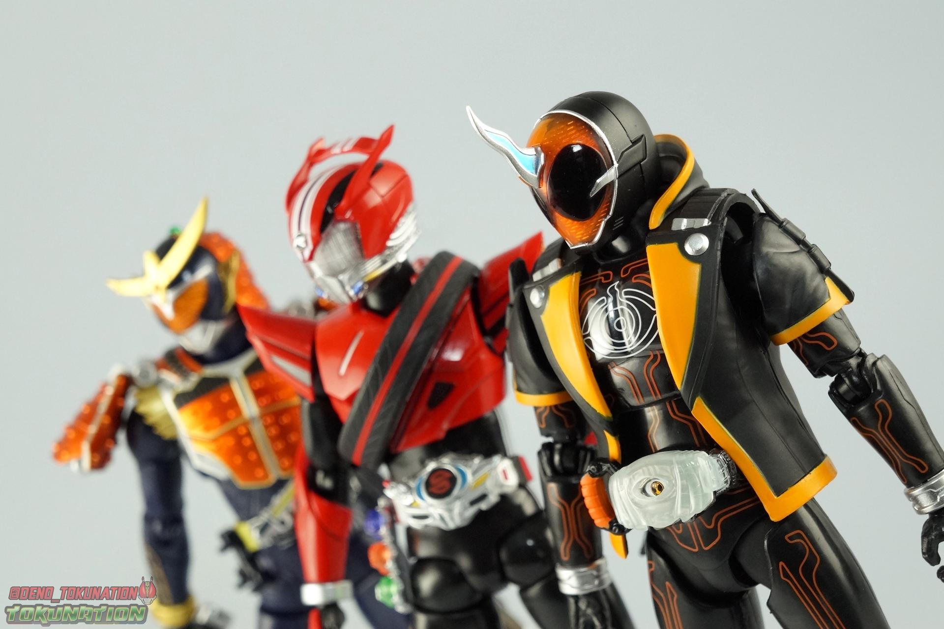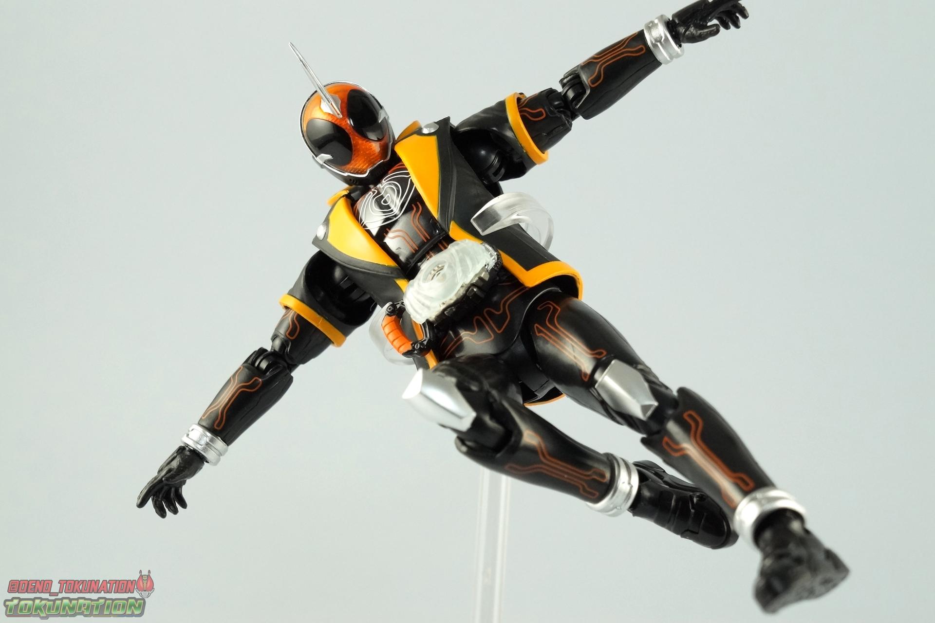 The latest Heisei Rider has made his debut in Bandai's long running collector's line with S.H. Figuarts Kamen Rider Ghost Ore Damashii! Takeru's 1st basic form, Ore Damashii is the embodiment of his own soul. In figure terms it's also our first outing with this line. So let's see how it'' be be shaping up. Packaging For starters the packaging is styled in the now very common slim box popularized during Kamen Rider Drive's run. It's not bad but it doesn't offer much to look at aside from some stock photos on the back. This 1st release of the figuart features a gold foil sticker on the window indicating it includes the 1st run bonus Yurusen figure. Similar to how S.H. Figuarts Sailor Moon had a 1st run sticker indicating the extra faces she came with. But all in all a pretty standard box. Main Figure Like many collectors you may be thinking that Ghost Ore Damashii will be a disappointment. And who could blame you? At the time of release this figure got quite a few negative reviews and there were more than a few stories about it's hit or miss QC. However I'll kick off my review by saying that, while Ghost is flawed, it's actually a quite solid figure. And that's coming from someone who hates the show itself, and generally doesn't care for this riders' design. For starters Ghost is painted in a combination of matte black & orange that while not bad, is lazily applied in spots. Especially around the trim on his Parka Ghost. However the finer details lining the glossy translucent parts of the armor are top notch. No imperfections at all. Likewise the ghost emblem on his chest is spot on and the head couldn't be more perfect. Ghost's head is a gorgeous brilliant orange that captures light perfectly. It just glows at the right angles. And for once I'm sold on those massive black eyes, they really give him a sense of depth and power I hadn't realized before. The Ghost Driver is a pretty bland opaque blue but much like it's DX counterpart this opaque face plate can be removed to expose the toothy monstrous face beneath. An Ore Damashii Eyecon is present but non-removable as it's sculpted in. It is however painted pretty well for something at that scale. Now lets talk about how Ghost moves. Again, many people have talked about how limited his articulation is. I'd like to dispel some of that myth. Ghost's leg design provides a full range of motion stunted only by the ankle tilts being just a bit limited. If they had a bit more forward/back room to move then they'd be great. But the cuff around the ankle limits that. The hips just need to be pulled down and rotated a little to clear the waste which is a relief, drop down hips are something I'm not a fan of. Here's the biggest issue the figure has though, the waist. While it certainly is possible to rotate it side to side, the flawed design also means you have to apply excessive for to the joint to make it move. This can make a scary loud clicking sound and can in some cases, as sadly evidenced by board member Barricade64, snap the waist in two entirely. I can't quite get my Ghost's waist to rotate that much and I certainly don't plan to force it. Liberal applications of shock oil to that joint seem to be the most popular fix. His jacket contributes to the restriction of the waist when it impacts the Driver, but more particularly it limits the upper body and shoulders. The arms themselves are actually pretty well thought out. Though mine must be a bad example of quality control. They keep pulling out of the body at the shoulder & elbow joints. It plugs right back together but it gets annoying while posing. The weakest piece of their design is the soft rubber shoulder sections. The "tabs" on the end are made of soft rubber so they don't get in the way while posing, as you can tuck the shoulders sort of up into the torso recesses. But they get bent very very easily. So watch out for those. I have to mention that wrist cuffs also nix just about any ankle tilt. When the hand is plugged on to the wrist it sits nearly flush so there isn't much room to work with. Finally Ghosts' head, as mentioned above, is perfect. But the molded folded down hoodie on his shoulders really limits how it can move. Forcing Ghost to look up when turned to one side or the other. The included normal hoodie accessory fixes that issue somewhat. Ghost Ore Damashii is more or less the spitting image of his TV counterpart. It's a great scale representation of a suit that I don't particularly care for, that somehow manages to make me like it. Posability issues aside, Ghost is actually a pretty great figure that fits right in with your other Heisei Riders. I've included comparison images with Gaim Orange Arms & Drive Type Speed as well below. Accessories Retail releases tend to come with a pretty nice array of accessories these days and Ghost is no slouch: 2 - sets of additional hands. 1 splayed open pair for posing, 1 "holding things" pair for use with his weapon. 1 - Gan Gun Saber. Once again this figure manages to surprise me and sell me on something I didn't like from the show. I felt the Saber looked clunky and silly in action but it scales well with the figuart and is surprisingly semi-functional. Now it can't replicate it's multitude of forms for various Ghost Changes like in show, but it can manage to do 2 of them. The default Blade Mode as well as Gun Mode. Just split the blade in half, plug the removed portion back on backwards, & fold the grip down to form the Gun. This is an unwieldy mode for it that thanks to the figures arm & shoulder design means it's difficult to 2-hand hold, but it's got a shotgun vibe to it that I like. 1 - hoodie (up). Intended to replace the default folded down hoodie, this piece can be used by removing the standard one as well as a small panel on the top of Ghosts' head. Then just plug this hoodie down on. Weirdly this hoodie which totally surrounds his head provides far far better neck movement. It's free floating so it's not attached to anything b