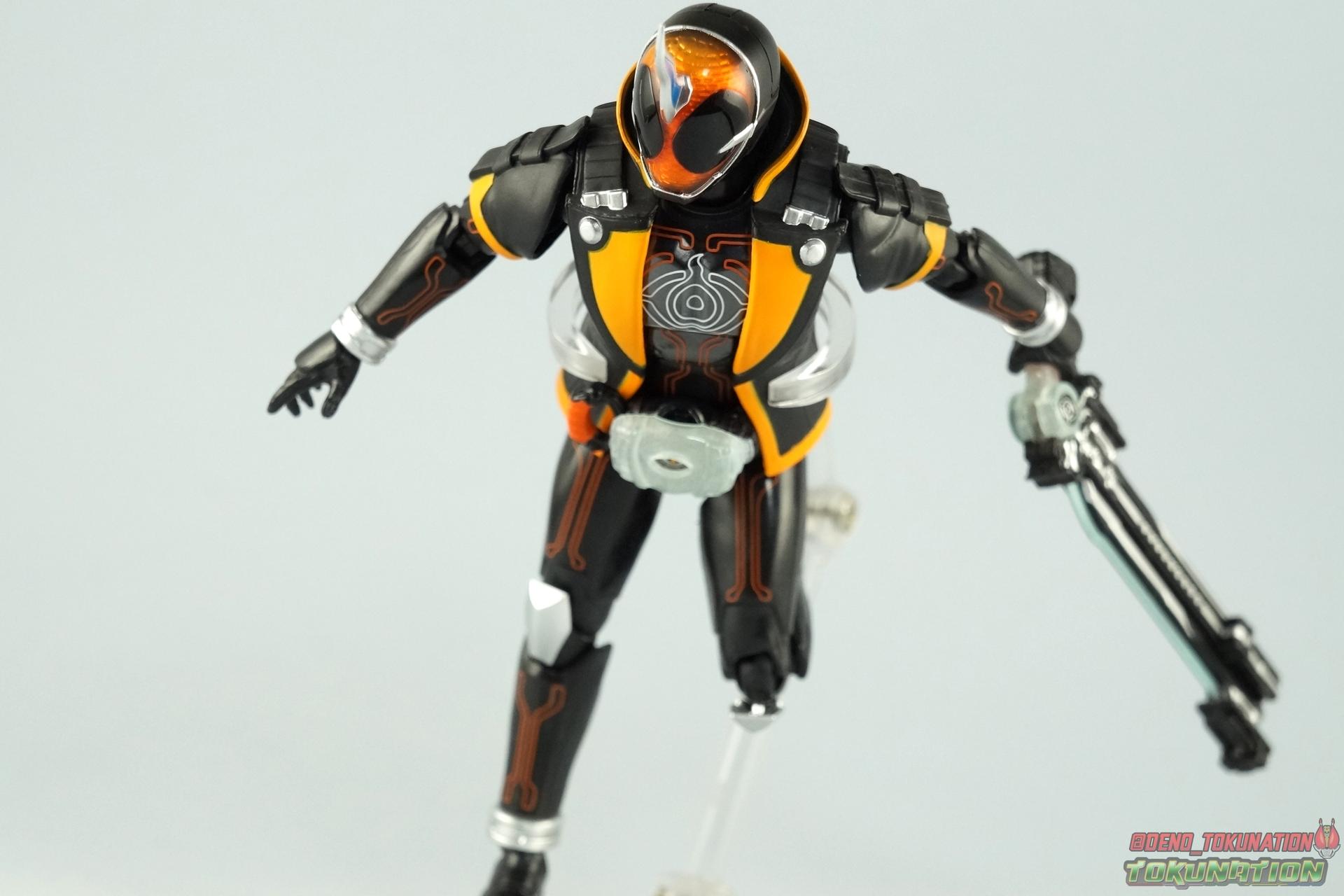 The latest Heisei Rider has made his debut in Bandai's long running collector's line with S.H. Figuarts Kamen Rider Ghost Ore Damashii! Takeru's 1st basic form, Ore Damashii is the embodiment of his own soul. In figure terms it's also our first outing with this line. So let's see how it'' be be shaping up. Packaging For starters the packaging is styled in the now very common slim box popularized during Kamen Rider Drive's run. It's not bad but it doesn't offer much to look at aside from some stock photos on the back. This 1st release of the figuart features a gold foil sticker on the window indicating it includes the 1st run bonus Yurusen figure. Similar to how S.H. Figuarts Sailor Moon had a 1st run sticker indicating the extra faces she came with. But all in all a pretty standard box. Main Figure Like many collectors you may be thinking that Ghost Ore Damashii will be a disappointment. And who could blame you? At the time of release this figure got quite a few negative reviews and there were more than a few stories about it's hit or miss QC. However I'll kick off my review by saying that, while Ghost is flawed, it's actually a quite solid figure. And that's coming from someone who hates the show itself, and generally doesn't care for this riders' design. For starters Ghost is painted in a combination of matte black & orange that while not bad, is lazily applied in spots. Especially around the trim on his Parka Ghost. However the finer details lining the glossy translucent parts of the armor are top notch. No imperfections at all. Likewise the ghost emblem on his chest is spot on and the head couldn't be more perfect. Ghost's head is a gorgeous brilliant orange that captures light perfectly. It just glows at the right angles. And for once I'm sold on those massive black eyes, they really give him a sense of depth and power I hadn't realized before. The Ghost Driver is a pretty bland opaque blue but much like it's DX counterpart this opaque face plate can be removed to expose the toothy monstrous face beneath. An Ore Damashii Eyecon is present but non-removable as it's sculpted in. It is however painted pretty well for something at that scale. Now lets talk about how Ghost moves. Again, many people have talked about how limited his articulation is. I'd like to dispel some of that myth. Ghost's leg design provides a full range of motion stunted only by the ankle tilts being just a bit limited. If they had a bit more forward/back room to move then they'd be great. But the cuff around the ankle limits that. The hips just need to be pulled down and rotated a little to clear the waste which is a relief, drop down hips are something I'm not a fan of. Here's the biggest issue the figure has though, the waist. While it certainly is possible to rotate it side to side, the flawed design also means you have to apply excessive for to the joint to make it move. This can make a scary loud clicking sound and can in some cases, as sadly evidenced by board member Barricade64, snap the waist in two entirely. I can't quite get my Ghost's waist to rotate that much and I certainly don't plan to force it. Liberal applications of shock oil to that joint seem to be the most popular fix. His jacket contributes to the restriction of the waist when it impacts the Driver, but more particularly it limits the upper body and shoulders. The arms themselves are actually pretty well thought out. Though mine must be a bad example of quality control. They keep pulling out of the body at the shoulder & elbow joints. It plugs right back together but it gets annoying while posing. The weakest piece of their design is the soft rubber shoulder sections. The "tabs" on the end are made of soft rubber so they don't get in the way while posing, as you can tuck the shoulders sort of up into the torso recesses. But they get bent very very easily. So watch out for those. I have to mention that wrist cuffs also nix just about any ankle tilt. When the hand is plugged on to the wrist it sits nearly flush so there isn't much room to work with. Finally Ghosts' head, as mentioned above, is perfect. But the molded folded down hoodie on his shoulders really limits how it can move. Forcing Ghost to look up when turned to one side or the other. The included normal hoodie accessory fixes that issue somewhat. Ghost Ore Damashii is more or less the spitting image of his TV counterpart. It's a great scale representation of a suit that I don't particularly care for, that somehow manages to make me like it. Posability issues aside, Ghost is actually a pretty great figure that fits right in with your other Heisei Riders. I've included comparison images with Gaim Orange Arms & Drive Type Speed as well below. Accessories Retail releases tend to come with a pretty nice array of accessories these days and Ghost is no slouch: 2 - sets of additional hands. 1 splayed open pair for posing, 1 "holding things" pair for use with his weapon. 1 - Gan Gun Saber. Once again this figure manages to surprise me and sell me on something I didn't like from the show. I felt the Saber looked clunky and silly in action but it scales well with the figuart and is surprisingly semi-functional. Now it can't replicate it's multitude of forms for various Ghost Changes like in show, but it can manage to do 2 of them. The default Blade Mode as well as Gun Mode. Just split the blade in half, plug the removed portion back on backwards, & fold the grip down to form the Gun. This is an unwieldy mode for it that thanks to the figures arm & shoulder design means it's difficult to 2-hand hold, but it's got a shotgun vibe to it that I like. 1 - hoodie (up). Intended to replace the default folded down hoodie, this piece can be used by removing the standard one as well as a small panel on the top of Ghosts' head. Then just plug this hoodie down on. Weirdly this hoodie which totally surrounds his head provides far far better neck movement. It's free floating so it's not attached to anything b