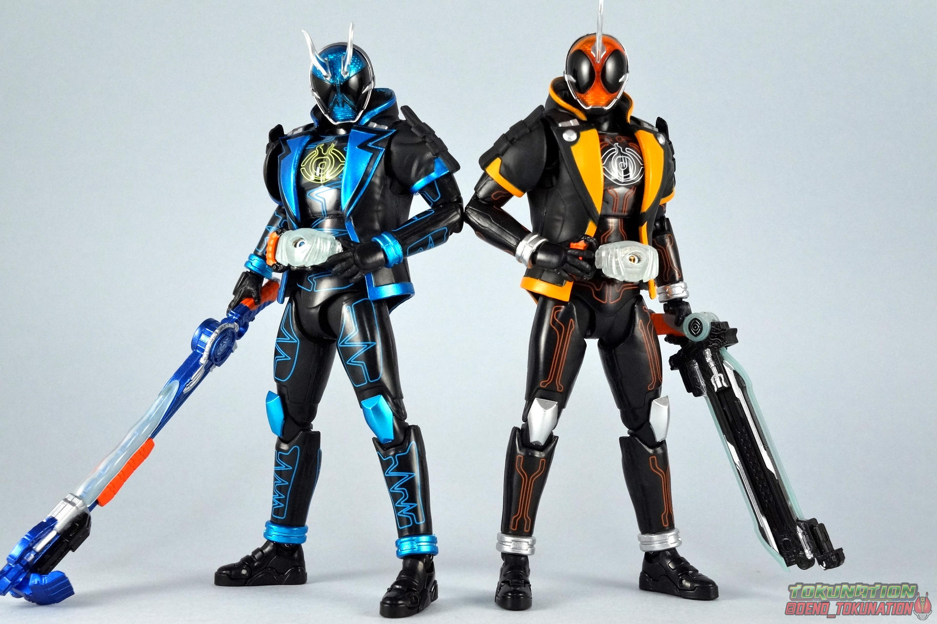 The second release in the fledgling Kamen Rider Ghost subline of S.H. Figuarts is here! The super cool secondary rider of the series, S.H. Figuarts Kamen Rider Specter! And he's brought with him a nice first run bonus much like his predecessor Ghost. ** This figure is part for part identical to Ghost Ore Damashii aside from accessories, paint, and the dual horns. Most of this review will be very similar to that one. Packaging As with Ghost, the packaging is that of the very common slim box popularized during Kamen Rider Drive's run. Same kind of boring design really. This 1st release of the figuart features a foil sticker indicating it includes the 1st run bonus Eyecons. But all in all a very standard box. Main Figure Like many collectors I thought Ghost Ore Damashii would be a disappointment in hand. And who could blame you? At the time of his release there were negative reviews and more than a few stories about it's hit or miss QC. But once I had Ghost in hand I really was charmed by his design. He wasn't executed perfectly, but he worked quite well and had a ton of personality. Now I'm reexamining that same mold and those same feelings with Kamen Rider Specter. Specter is painted in a combination of matte black & almost electric blue that manages to be applied more accurately than Ghosts' paint apps despite them being in the same places. The finer details lining the glossy translucent parts of the armor are top notch. No imperfections at all. Likewise the ghost emblem on his chest is spot on and the head couldn't be more perfect. Specter's head is a gorgeous deep & reflective blue that captures light magnificently. The toy manages to capture a bit more of the menace in his facial design than I think the show suit communicates. The Ghost Driver is the same bland opaque blue and like it's DX counterpart this opaque face plate can be removed to expose the toothy monstrous face beneath. A Specter Ghost Eyecon is present but non-removable as it's sculpted in. It is however painted pretty well for something at that scale. Now lets talk about how Specter moves. Again, its fair to to talk about the limitations of this mold. But first the positives. Specter's leg design provides a full range of motion stunted only by the ankle tilts being more limited by the ankle cuff. If they had a bit more forward/back room to move then they'd be great. The hips just need to be pulled down and rotated a little to clear the waste which is a relief, drop down hips are something I'm not a fan of normally. But here's the biggest issue the figure has, the waist. While it certainly is possible to rotate it side to side, the flawed design of the waist also means you have to apply excessive for to the joint to make it move. This can make a scary loud clicking sound and can in some cases break the waist. This has happened more than once to peoples' Ghosts. It could happen with Specter though I haven't heard such stories yet. I can't really get Specter's waist to rotate that much and I certainly don't plan to force it. Liberal applications of shock oil to that joint seem to be the most popular fix. His Ghost Parka contributes to the restriction of the waist when it impacts the Driver, but more particularly it limits the upper body and shoulders. The arms themselves are actually pretty well thought out and clearly made better than my Ghost, whose arms would fall off simply by being looked at. The weakest piece of their design is the soft rubber shoulder sections. The "tabs" on the end are made of soft rubber so they don't get in the way while posing, as you can tuck the shoulders sort of up into the torso recesses. But they get bent very very easily. So watch out for those. I have to mention that the wrist cuffs also nix just about any dynamic use of the hands When the hand is plugged on to the wrist it sits nearly flush so there isn't much room to work with. Finally Specter's head, as mentioned above, is perfect. But the molded folded down hoodie on his shoulders really limits how it can move side to side. Forcing him to look up when turned to one side or the other. The included normal hoodie accessory fixes that issue somewhat. Kamen Rider Specter is more or less the spitting image of his TV counterpart and a great scale representation of a suit that I didn't particularly care for. Poseability issues aside Specter will fit right into your collection and certainly into your Ghost display. I've included some comparison shots with previous Heisei Secondary riders for fun as well; Mach, Baron, Beast, Meteor, Birth, Accel, Diend. Accessories Retail releases tend to come with a pretty nice array of accessories these days and Specter is pretty on par: 3 - sets of additional hands. 2 different types of "holding things" pair for use with his weapon. The "trigger finger" pair is almost pointless though. The grip is so loose and his weapon so long & heavy that he can barely maintain a pose using them. The other pair of hands are splayed open for dramatic poses. 1 - Gan Gun Hand. Unlike Ghost's Gan Gun Saber this one doesn't really transform per se. Even in show the barely plausible Gun Mode is hardly different from the Rod Mode. Basically you only need to slide up the orange hand grip and close the fingers for Gun Mode. Neither form is very impressive and it winds up being a bit more like a big bat than anything. It's painted well but ultimately does nothing and is incredibly difficult to pose Specter with because of his shoulders and large broad chest. As mentioned above the hands included to hold this thing could have a tighter grip as well. 1 - hoodie (up). Intended to replace the default folded down hoodie, this piece can be used by removing the standard one as well as a small panel on the top of Specter's head. Then just plug this hoodie down on. Weirdly this hoodie, which totally surrounds his head, provides far far better neck movement. It's free floating so it's not attached to anything but it completely covers the hea