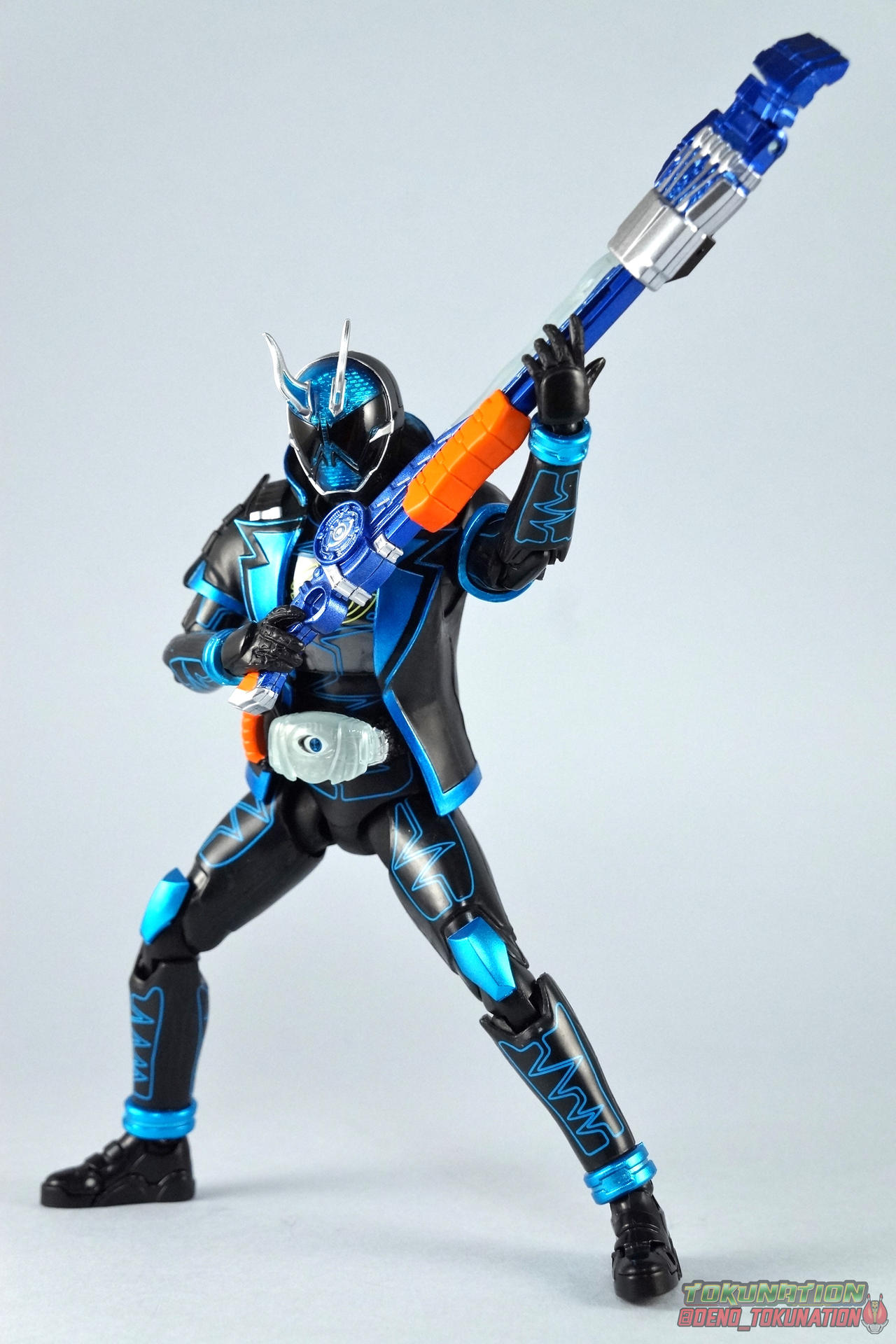 The second release in the fledgling Kamen Rider Ghost subline of S.H. Figuarts is here! The super cool secondary rider of the series, S.H. Figuarts Kamen Rider Specter! And he's brought with him a nice first run bonus much like his predecessor Ghost. ** This figure is part for part identical to Ghost Ore Damashii aside from accessories, paint, and the dual horns. Most of this review will be very similar to that one. Packaging As with Ghost, the packaging is that of the very common slim box popularized during Kamen Rider Drive's run. Same kind of boring design really. This 1st release of the figuart features a foil sticker indicating it includes the 1st run bonus Eyecons. But all in all a very standard box. Main Figure Like many collectors I thought Ghost Ore Damashii would be a disappointment in hand. And who could blame you? At the time of his release there were negative reviews and more than a few stories about it's hit or miss QC. But once I had Ghost in hand I really was charmed by his design. He wasn't executed perfectly, but he worked quite well and had a ton of personality. Now I'm reexamining that same mold and those same feelings with Kamen Rider Specter. Specter is painted in a combination of matte black & almost electric blue that manages to be applied more accurately than Ghosts' paint apps despite them being in the same places. The finer details lining the glossy translucent parts of the armor are top notch. No imperfections at all. Likewise the ghost emblem on his chest is spot on and the head couldn't be more perfect. Specter's head is a gorgeous deep & reflective blue that captures light magnificently. The toy manages to capture a bit more of the menace in his facial design than I think the show suit communicates. The Ghost Driver is the same bland opaque blue and like it's DX counterpart this opaque face plate can be removed to expose the toothy monstrous face beneath. A Specter Ghost Eyecon is present but non-removable as it's sculpted in. It is however painted pretty well for something at that scale. Now lets talk about how Specter moves. Again, its fair to to talk about the limitations of this mold. But first the positives. Specter's leg design provides a full range of motion stunted only by the ankle tilts being more limited by the ankle cuff. If they had a bit more forward/back room to move then they'd be great. The hips just need to be pulled down and rotated a little to clear the waste which is a relief, drop down hips are something I'm not a fan of normally. But here's the biggest issue the figure has, the waist. While it certainly is possible to rotate it side to side, the flawed design of the waist also means you have to apply excessive for to the joint to make it move. This can make a scary loud clicking sound and can in some cases break the waist. This has happened more than once to peoples' Ghosts. It could happen with Specter though I haven't heard such stories yet. I can't really get Specter's waist to rotate that much and I certainly don't plan to force it. Liberal applications of shock oil to that joint seem to be the most popular fix. His Ghost Parka contributes to the restriction of the waist when it impacts the Driver, but more particularly it limits the upper body and shoulders. The arms themselves are actually pretty well thought out and clearly made better than my Ghost, whose arms would fall off simply by being looked at. The weakest piece of their design is the soft rubber shoulder sections. The "tabs" on the end are made of soft rubber so they don't get in the way while posing, as you can tuck the shoulders sort of up into the torso recesses. But they get bent very very easily. So watch out for those. I have to mention that the wrist cuffs also nix just about any dynamic use of the hands When the hand is plugged on to the wrist it sits nearly flush so there isn't much room to work with. Finally Specter's head, as mentioned above, is perfect. But the molded folded down hoodie on his shoulders really limits how it can move side to side. Forcing him to look up when turned to one side or the other. The included normal hoodie accessory fixes that issue somewhat. Kamen Rider Specter is more or less the spitting image of his TV counterpart and a great scale representation of a suit that I didn't particularly care for. Poseability issues aside Specter will fit right into your collection and certainly into your Ghost display. I've included some comparison shots with previous Heisei Secondary riders for fun as well; Mach, Baron, Beast, Meteor, Birth, Accel, Diend. Accessories Retail releases tend to come with a pretty nice array of accessories these days and Specter is pretty on par: 3 - sets of additional hands. 2 different types of "holding things" pair for use with his weapon. The "trigger finger" pair is almost pointless though. The grip is so loose and his weapon so long & heavy that he can barely maintain a pose using them. The other pair of hands are splayed open for dramatic poses. 1 - Gan Gun Hand. Unlike Ghost's Gan Gun Saber this one doesn't really transform per se. Even in show the barely plausible Gun Mode is hardly different from the Rod Mode. Basically you only need to slide up the orange hand grip and close the fingers for Gun Mode. Neither form is very impressive and it winds up being a bit more like a big bat than anything. It's painted well but ultimately does nothing and is incredibly difficult to pose Specter with because of his shoulders and large broad chest. As mentioned above the hands included to hold this thing could have a tighter grip as well. 1 - hoodie (up). Intended to replace the default folded down hoodie, this piece can be used by removing the standard one as well as a small panel on the top of Specter's head. Then just plug this hoodie down on. Weirdly this hoodie, which totally surrounds his head, provides far far better neck movement. It's free floating so it's not attached to anything but it completely covers the hea