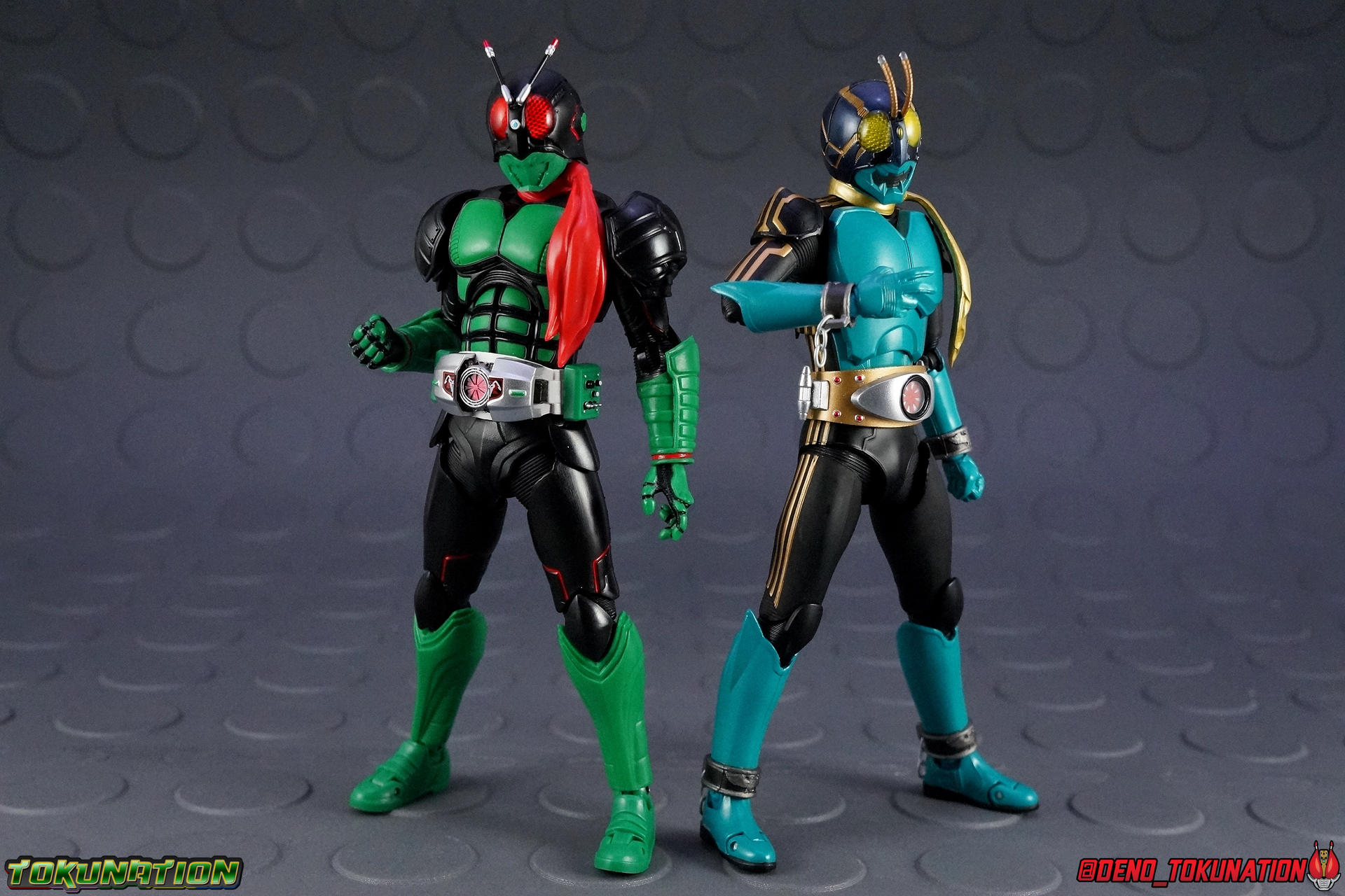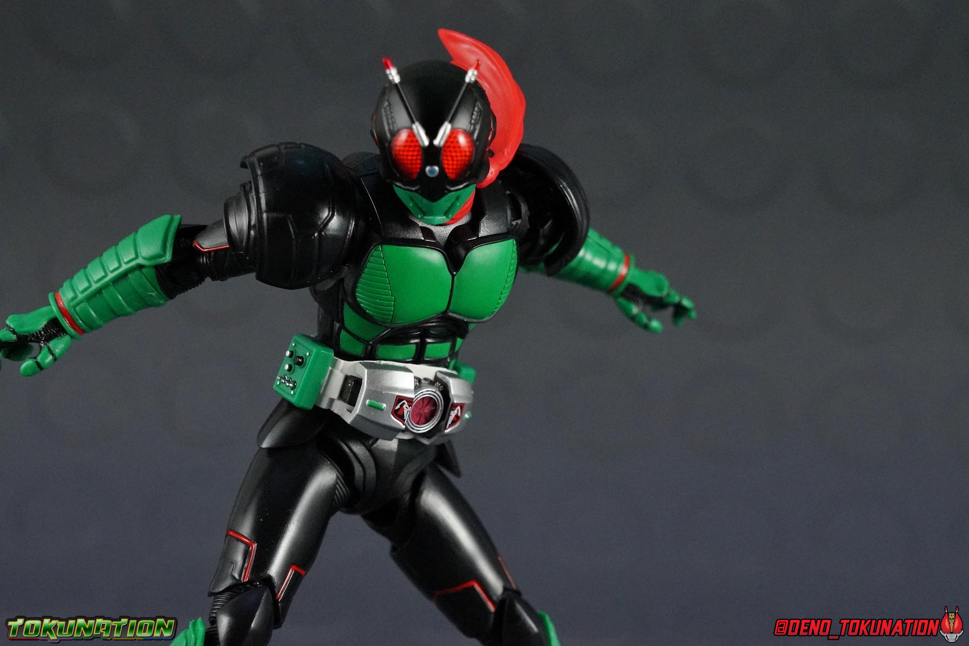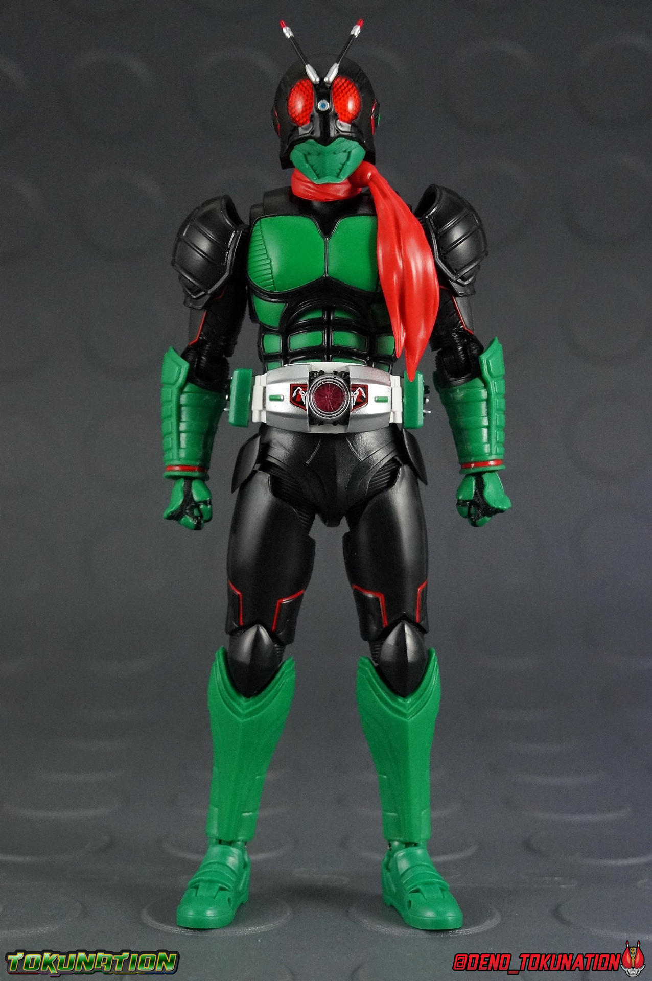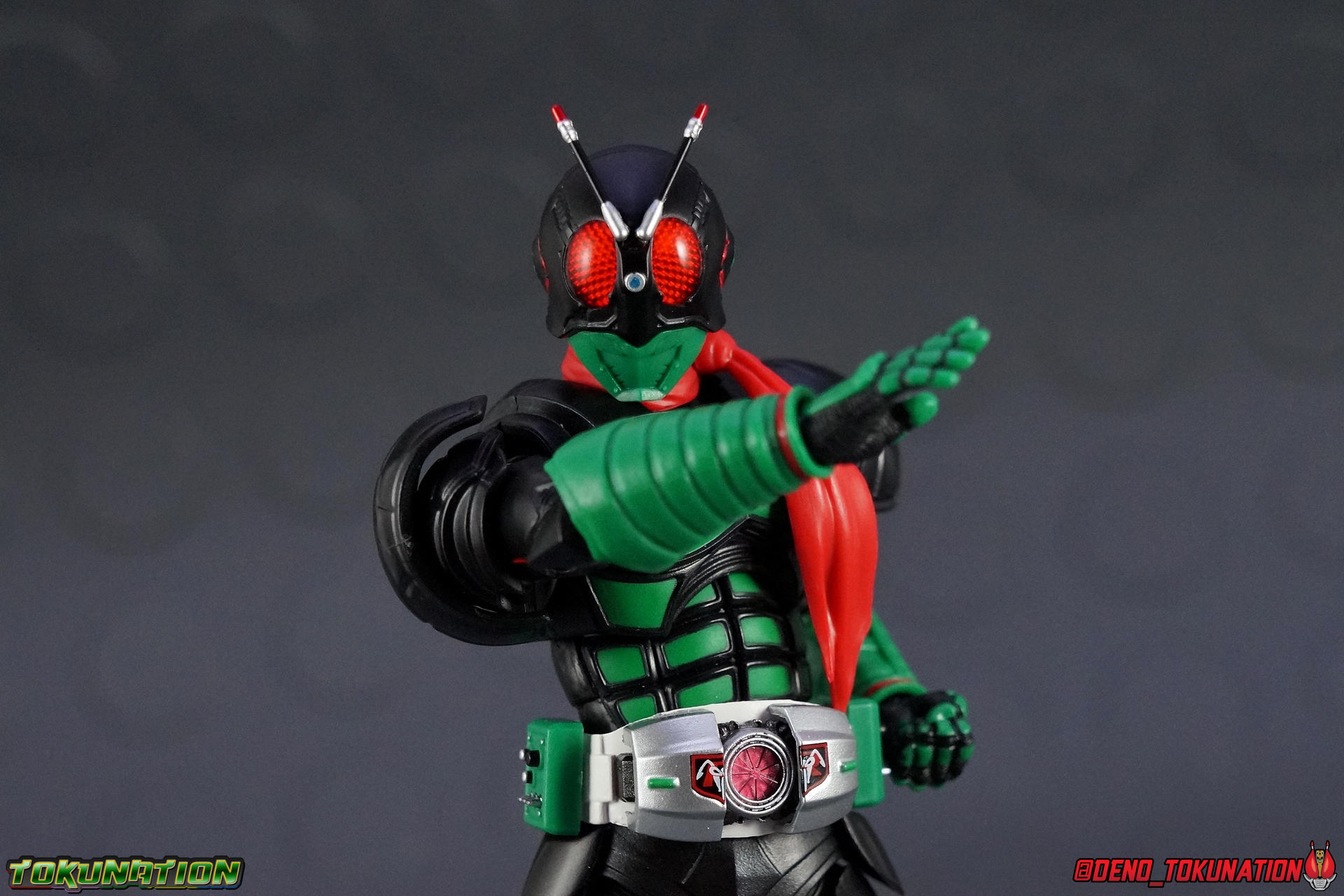 Debuting in the special Superhero Year tie-in film, Kamen Rider 1, the original Kamen Rider himself received his first new form in over 40 years! This form has yet to be explained or expanded upon since it's debut, and frankly time will tell if it ever will be. Despite Takeshi Hongo's numerous appearances in movies in recent years, and in fact the physical appearances of his original actor Hiroshi Fujioka in even more recent films, this is the first we've seen or heard of the so-called "Powered Up" Rider 1. A bulky behemoth that packs a real punch, today we're studying this unique upgrade in toy form with S.H. Figuarts Movie Kamen Rider 1 ! Packaging Unsurprisingly the packaging for this figure is the same Drive/Ghost style slim black box we've become accustom to. Without much flourish to packaging with the recent rider lines, it's all starting to a look a little too similar. I'm sure Ex-Aid will mix things up, especially given how it's inaugural S.H. Figuarts release will be a 3-pack. But given the fact that this is THE original Kamen Rider we're talking about, from his own movie no less, I expected something a bit more extravagant and impressive. Main Figure Wow. Color me impressed. When this form was initially revealed in magazine scans and movie trailers, it was derided by many (myself included) for being too big & bulky. Just too muscular, and well, thick. But the added bulk of this form makes a lot of sense given real world and fictional concerns, the aging of actor Fujioka and in fact of the Hongo character himself. But you'd be forgiven for expecting this figure to be limited. While undoubtedly CG movie magic and other special effects gave the physical suit a special flare & abilities all it's own, it's definitely not an entirely functional design. But I'm happy to report that the figuart IS! This isn't going to be the most poseable figuart you've ever purchased, but damn it all it's still a nice one. Movie Kamen Rider 1 is an entirely new sculpt from the ground up. This body isn't shared with any other release, though I can see aesthetic influences from another Showa turned Heisei redesign, Kamen Rider 3. But again, all new parts. The legs themselves have a fantastic mostly full range of motion, the usual necessary ankle tilts, a knee that could stand improvement but isn't detrimental, and hips that while good aren't perfect. You may be worried about the small hip armor components on the sides getting in the way but thankfully they can both angle up very very well, so the hips have plenty of clearance there. Sadly there are some pointy protrusions on the upper edge of the hips that can easily snag on the waist armor and in fact can flake or break quite easily. So watch out for those. Moving up to the new Typhoon belt, Rider 1 has gotten a significant upgrade here. When not in use this new style Typhoon has a shield that covers it with the traditional Tachibana Racing Club logo on the front. By default the belt is split open but the two halves can be removed and pegged in closer together to replicate this. Fun fact, I shot half of this gallery with the shield closed, and had to re-do all of it :P It's a welcome & unexpected feature though. The belt is also floating pretty freely around the waist and has some room to move up or down in case the hip armor needs a little more clearance or the abs do. The sculpted in ab section by the way is fantastic. Again this is where the figure tricks you with it's bulk, you expect it to be limited, but the upper torso joint floats perfectly on top. Allowing Rider 1 to arch his lower torso back and upper forward to give him really dynamic body language. I'm just impressed all around here. Even in the arms I expected severe limitation and found them to be really superb. More than most figuarts this one can actually accomplish it's signature poses! The traditional arm across the chest pose is nothing for this figure. Thanks in large part to how well the shoulders can come out from the main body, and how those massive shoulder pads (which are 2 pieces) can move independently to angle out of the the way. Perhaps my only complaint with the arms is that the wrist ball joints seem larger than the peg holes in the fists themselves, making it a little difficult to swap hands. Finally we come to the head, which to me is the one thing about this figure that departs the least from the original design(s). Well that and the classic muffler. The head definitely has more of a military style hardware look to it with the low edge covering the back of the neck. It feels more like armor and less like decoration you know? The eyes are a gorgeous red that's similar to what's used on Gold Drive so they really pop in the right lighting. But all in all this figure is fantastic. The sculpt & paint apps are on point, and the articulation is there. I totally get someone disliking this design, but once you have it in hand I don't know how you couldn't love it. It's just a top notch figure. Minor issues aside Movie Rider 1 really is just a great release. Accessories Nothing major or surprising here: 2- sets of additional hands. I'd hoped for more, like possibly bike riding hands. I know the new Movie Cyclone has never received a release date but Rider 1 works very well with most previous releases of the Cyclone as well. So those hands would have been great and cheap to produce inclusions. 1 - muffler/scarf. The ball on the neck is a bit too large to plug this on easily but once you get it on there it rotates very easily. I'm surprised a wind-swept version wasn't included like with previous Rider 1's. 1 - Rider Kick Effect part. An always welcome addition that often is left out from most non-Showa rider releases. I especially like the coloration on this one. It's got a little more uniqueness to it than most kick effects. And thankfully it locks onto the foot much more tightly than many I've dealt with previously. A pretty lite selection but mostly appropriate. There were no o