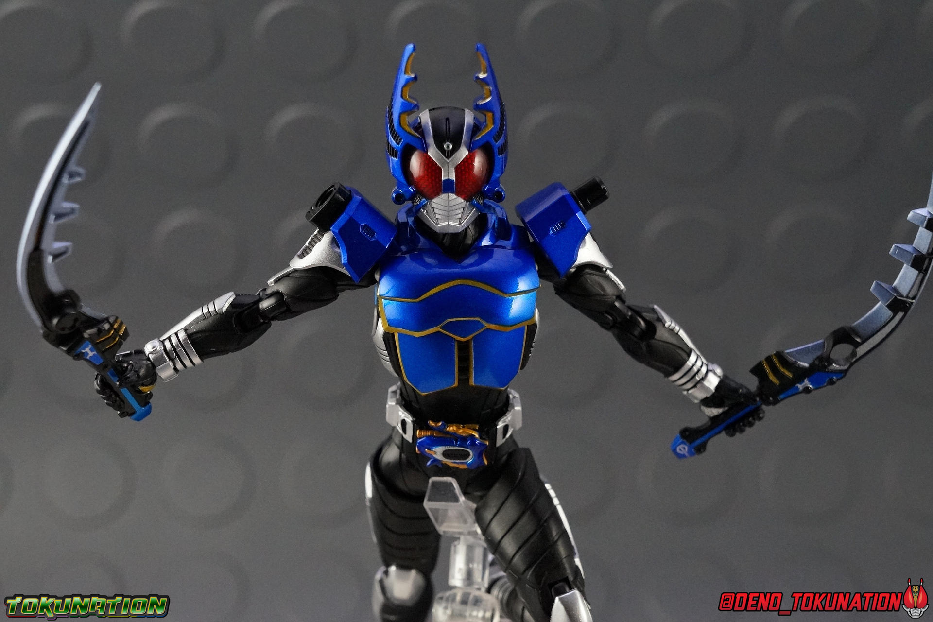 In September we took a look back at a fairly old release with the oroginal S.H. Figuarts Kamen Rider Gattack. That helped get us prepped and pumped for today's subject, the all-new and improved S.H. Figuarts Shinkocchou Seihou Kamen Rider Gattack! Rider Cutting! Packaging That wonderful premium Shinkocchou Seihou packaging returns! I recently said it when I reviewed Kuuga Ultimate Form, but this type of slipcover box really works for me. And it continues to sell the nature of the S.S. releases as a truly premium line. Plus, that cover artwork! Main Figure You may recall that when I looked back at the original Gattack release there were some pretty big issues. Granted that's a 5 year old figure, but the problems that exist in the original Kabuto line make them kind of eyesores in a modern collection. Well, to put it simply, Shinkocchou Seihou Gattack fixes every single one of them and looks dead sexy while doing it. For a quick idea of what this figure is like you can read through my old S.S. Kabuto review. These two figuarts share most of the same body parts with a few keys differences. But it's pretty clear that even after 2 years, the Kabuto style body that began the Shinkocchou Seihou line is still very very strong. S.S. Gattack is the one release I was probably most excited for than any other in this line. As an unashamed fan of the series, and a die hard fan of Gattack as the "real" main character, I couldn't be happier with this figuart. Much like S.S. Kabuto, the articulation is nuts on this thing. The new (I guess now old?) style hips provide a wide and balanced motion that allows you to replicate some of Gattack's most iconic poses & attacks. The arms are free of nearly all obstruction thanks to wonderfully hinged shoulder pads. The waist/ab area has incredible flexibility as well. I would say the hips are liited only by their design as they do impact the waist assembly a little more prematurely than I'd like. The same type of peg style hands featured on Kabuto are present here. It's still kind of odd that this type of hand has been so infrequently used. Not every S.S. Figuart has it even, which is odd. Of the 9 Shinkocchou Seihou releases thus far, only Kabuto & Gattack use this system. And Gattack doesn't even include the hand tree to store them. As I said way back when with Kabuto, I still don't really like them. They're fine, they get the job done, but I can't help but feel something is lost without a ball joint in the wrist. But that's a very minor nitpick. All in all this is a solidly built figure. About the only issue I've found with him is the head. The sculpt is dead on, it's finally the appropriate size & color, and it looks gorgeous (mine has one irritating silver fleck in the left eye). But the neck cuff prevents the head from tilting back and side to side as much as I'd like. That's probably my one gripe. The paint apps are masterful (eye issue aside), and thankfully Gattack's body is finally in the appropriate blue & gold colors. The gold accents finally look good on this release, the old one just looked so dull and you could barely see it on the folds of the armor. Speaking of, Gattack doesn't have poseable pecks like Kabuto did, though on Kabuto I never found they served much purpose. With this gallery I tried to replicate all of the shots from my original Gattack gallery, just to demonstrate how much of an improvement the Shinkocchou Seihou is. In functionality & personality, Kagami has never looked better. Pairing him with Kabuto is one of the more satisfying things I've gotten to do recently. Accessories As a far as Tamashii Web Exclusives go, Shinkocchou Seihou Gattack comes with a better than average accessory count. He does come with more or less everything he should. No glaring omissions but nothing over the top either: 3 - sets of additional hands. At least one set is pretty redundant. You get two sets of holding things hands. I know the 2nd set is meant for the Gattack Extender bike, but they're basically identical to the hands for holding weapons. I would have preferred some kind of expressive set of hands instead. 1 - Gattack Double Calibur set. These combining shotels are normally stored on his shoulders when not in use (though he can be often seen in show without them at all). When attached they can tend to get in the way of Gattack's head but angling them out of the way is pretty simple. I feel like they add a unique flare to his costume, and shoulder mounted weapons are certainly a feature you don't see much in toku costumes. He can use them individually like short swords or combine them into a pair scissor like mandibles for use with his Rider Cutting finisher. This set isn't largely different from those that came with the original but they do look much better thanks to more accurate paint applications. And the pegs on them look far less generic if that makes sense. 1 - Gattack Zecter. This version of the Zecter is the standard pre-henshin state of it. When the Zecter is flying around towards Kagami. You can put it on the belt as well to to replicate finishers but it does kind of suck that it isn't engineered like the Kabuto Zecter was. I know it just had a simple hinge but it was basically functional. Now I can't even have both detached Zecters at once since Kabutos' is non-removeable. I don't see too many reasons for this one to be included but it's fine for what it is. Again, no glaring omissions that I can think of. A Hyper Zecter would have been a fun inclusion but that wasn't very likely anyway. And Unlike S.S. Kabuto, Gattack does not include the "hand tree" to store the extras on when not in use. Which seems odd considering Gattack is one of the very very few figuarts to share this strange peg style of hand. In fact being only the second Shinkocchou Seihou release to have them. Final Thoughts As with any release in this line, I'm mostly floored by how fantastic it is. S.H. Figuarts Shinkocchou Seihou Kamen Rider Gattack is the premium mode