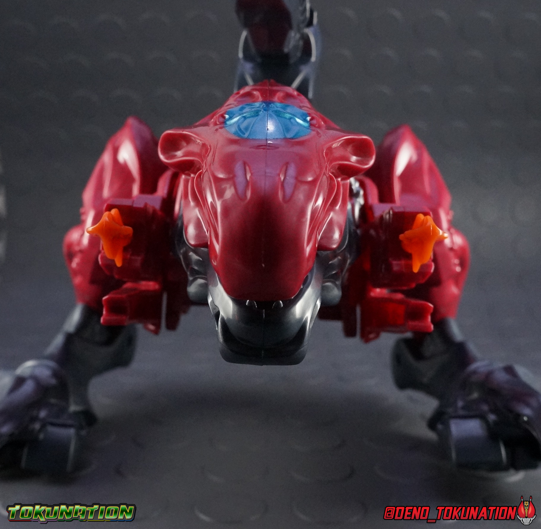 Even though the 2017 Power Rangers Movie is still about 3 months away, toys & merchandise for it have begun flooding retail stores nation wide! Morphers, Interactive Megazords, and of course the mighty T-Rex Battle Zord! Which is the subject of today's gallery. For the first "DX" style release for the movie line, let's see where the T-Rex Battle Zord sets the bar. Packaging Forgoing the traditional full box set release pattern of Megazords past, the Movie Megazord is split into it's 5 massive components, each sold separately. The T-Rex Zord comes packaged in a large open style box similar to what we normally see with roleplay weapons more often than anything else. The toy is mostly transformed into it's standard configuration (a few parts are detached for space), and a try me tab can be removed from the T-Rex's cannon to test the batteries as well. The included Red Ranger mini figure is attached to the box via a small bubble on the front as well. My only issue with open boxes like this is the potential for paint wear to a figure. We all know retail can be rough sometimes, and an irresponsible shopper can very easily mishandle a toy or collectible. With open boxes like this it's all to easy to get paint scuffs or scratches, or for something to go missing even. But that's more a personal pet peeve than anything detrimental to this boxes' layout. It's a pretty nice packaged piece actually. If a bit a too larger for my photo setup. Main figure The primary mode of this figure is of course the T-Rex. The transformation to it's part of the Megazord mode is something we'll touch on below. I've affectionately taken to calling the generously named "T-Rex" mode itself a xenomorph dinosaur. I'm still not sure I entirely get the reasoning behind basing this version of the Megazord on the MMPR one then taking the theme in such a totally, well, alien direction. The T-Rex appears to be the most recognizable of the bunch, but it still manages to look like every alien robotic dinosaur produced by a major toy company recently. Hello, Chomp & Stomp Grimlock? ![]() To get it fully into T-Rex mode out of the box you'll need to plug the right leg and missile launcher on as well as the electronic cannon on his back. The completed look is admittedly pretty menacing. Again, it's just a bit jarring. I get that this movie is going for an alien technological/organic mixture, but it's just weird you know? There's not a lot to do in this mode aside from the advertised "Dual Missile Firing Action" which on the back of the package would imply that the missile launchers are spring loaded. In actuality Bandai literally didn't spring for that. These are straight up pressure fire missiles. You have to push the rear end of one to get it to fire. Upside is no spring to weaken over time, downside being they're a bit weak. Luckily you probably won't lose them very easily either. The arms these missiles fire from benefit from the pegs used to attach them to the main body though as they can rotate a bit for some more action. While the included Cannon does have an electronic gimmick, which is a nice bonus, the package calls it out with "Battle Sounds" & "Jasons Voice". Battle Sounds, sure, that works. Jason's Voice however? No, not quite. The high pitched sound of a pre-teen speaks these lines rather than the more mature voice of Jason himself, Dacre Montgomery. I guess they couldn't get the voice clips needed but man what a let down. This figure misses the mark in a lot of ways anyway yet also doesn't get the voice right. The T-Rex mouth opens to accommodate the included Red Ranger pilot figure. But there's not really a seat in there. Just a ledge to put the back of his knees against. And because of the way the T-Rex head connects to the body it's hard to get the mouth open wide enough to set him in there normally. The biggest let down of this mode though is that it can't really do a lot more than stand in a static position. The super tight ratchet joints in the legs mainly exist to benefit the Megazord mode as they become the arms. But between them and the limited position the hip can rotate because for the pegs, you can't get much out of this guy. I should mention that thezord builder style pegs featured in these larger movie zords are much bigger than any others ever used in Bandai America's Power Rangers toys previously. Nothing is cross compatible here. The Movie Zords only work with Movie Zords and that's it sadly. So even if you like the ZB system, you can't utilize it with these toys. I did try and make a bi-pedal monster in the last image with just the T-Rex, it mostly worked, though it isn't stable. Getting to Megazord mode means taking this entire figure apart, which reveals the rest of it's flaws. Un-peg the legs and missile launchers from the sides first. This will reveal one giant hole through what will be the chest of the Megazord, you can literally see straight through. Removing these parts also reveals the very well sculpted Megazord chest and back. The peg holes just really break up the design. Inside of the chest you'll find the Megazord Head is stored. It just plugs down onto the body using another rather ugly black peg. The t-Rex head & Tail actually come off on sliding locks rather than proper ports or connectors, but for now set them aside. The T-Rex head, in what I find a generally lazy design flaw, simply plugs onto the back of the Megazord. Onto to the legs, these massive drumsticks are actually going to become the Megazord's arms. In the one piece of engineering I actually find pretty creative with this toy, most of the sculpted detail that makes up the arms winds up on the bottom of the feet, so without much complexity it remains hidden. To transform them you just need to rotate them back at the elbow/knee joint until they face the opposite direction. Now you'll see the sculpted in fists and texture details of the arms. Rather than using the sliding locks on the shoulders that the T-Rex head & tail did