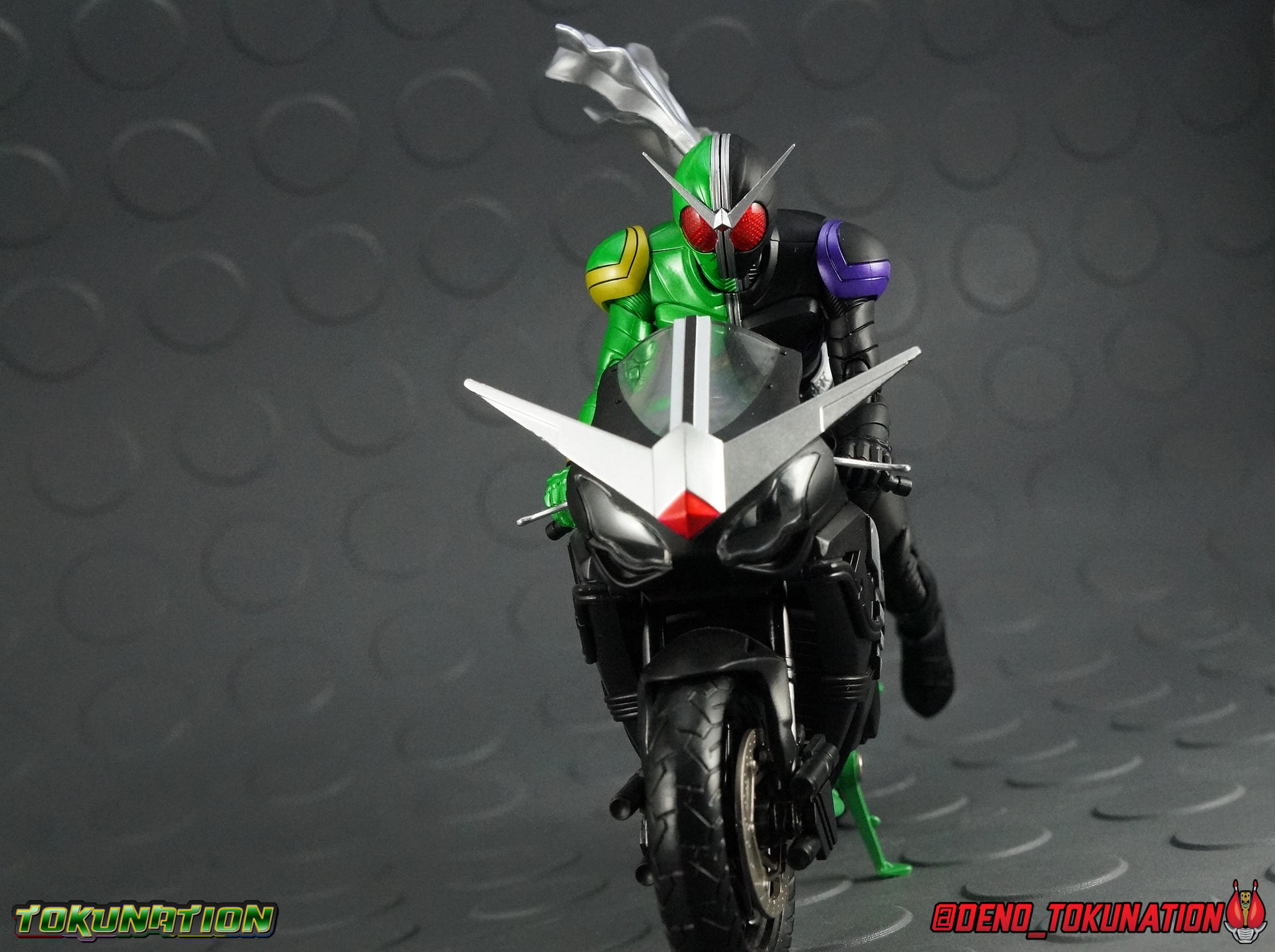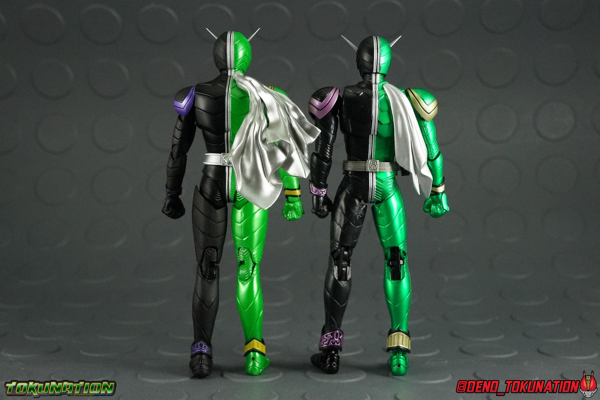 Once again Bandai have outdone themselves with another sophisticated modern update to a fan faovrite character. After years of being represented only by the original S.H. Figuart, collectors can finally upgrade their Kamen Rider W's with the S.H. Figuarts Shinkocchou Seihou Kamen Rider W! But is it the Figuart of year? Read on to find out that, yes, I think it is! Packaging The wonderful premium Shinkocchou Seihou packaging returns! If you've seen any of my recent reviews for Seihou Kuuga Ultimate or Seihou Gattack, etc etc, then you know I love this packaging, but it also isn't very different from release to release. Main Figure It's no secret that I have never been the biggest fan of Kamen Rider W. The show just didn't work for me on a number of levels. But I can respect that for many people it wound up being their access point into the franchise. And for those people more than most, there's been a glaring hole in their collection for years. A truly good SHF W. Well after 5 years of waiting, Bandai has finally rectified their mistakes. The original SHF W can go in the trash heap where it belongs, because Shinkocchou Seihou W is the renewal fans have deserved for years! This figure basically accurately recreates the suit you've seen in numerous episodes and movies down to it's finest details. I've said this many times with Shinkoccouh Seihou releases, but I truly think W is the peak of the line so far. In every conceivable way this figuart is a masterpiece. For a frame of reference, the original W Figuart was largely a product of it's time. A figure rushed to production with sloppy proportions, inaccurate details, no functional gimmicks, and an absolute dearth of accessories. In last 5 years this toyline has made huge strides towards striking the balance of accuracy & playability. And S.S. W is probably the peak at this point. For starters the S.S. release is completely the perfect shades of green & black. Finally after years of the ugly metallic on the original release, the S.S. embraces that wonderful shade of green and brings the suit design to life. Adding to this the gold & purple detailing are also the correct colors, the silver paint apps are on point, and the eyes are the correct shade of red. As you can see in the comparison shots below it's like night & day between these two. There is no comparison at this point, and then you look at the Double Driver. Not only does Seihou W feature an intricately detailed sculpt with appropriate paint apps for this device, it is entirely functional! Yes this Drive works just as it should including open slots for to-scale Gaia Memories to be used. This figuart includes (appropriately) the Cyclone & Joker memories, they fit into the slots very snugly as well so once in there they should be safe. But be careful when inserting them as they are easy to lose. The sides of the W Driver can fold down as well completing the look. If/when further W releases come out you'll be able to swap in their Gaia Memories as well, though obviously this figure can't split in half to form change. Now the Seihou W obviously has the look down, but does it have the functionality. Yes. In every sense of the word. Before now possibly the only poseable W figures released that could really pull off his signature poses and still look good doing it were the Master Grade Figurise model kit and perhaps the 12" Medicom figure. S.S. W has the articulation to pull off everything, and the proper sculpting for the joints needed for it to look perfect while doing so. How about those extending knee joints that look like a natural expansion of the costume, almost like fabric stretching? Or those seamless thigh swivels? Perhaps the masterful design of the shoulder pads & upper arms? Or the miraculous way the upper torso is designed. When I initially handled this figure I thought the torso was all one piece until I realized the upper body could move. It just looks that good in hand. This figure can pull off most any pose you recall the character making, and looks absolutely perfect while doing so. I've encountered a lot of truly great releases in the last year. But I believe this one takes the cake. Accessories 1 - Cyclone Gaia Memory. These small accessories can be used in either the Double Driver or the Maximum Drive slot on the right hip. They are extremely tiny, and extremely easy to lose. Do be careful with them. 1 - Joker Gaia Memory. These small accessories can be used in either the Double Driver or the Maximum Drive slot on the right hip. They are extremely tiny, and extremely easy to lose. Do be careful with them. 5 - sets of additional hands. Pretty much every iconic pose that W ever used. You couldn't ask for better character specific hands. 5 set's is just brilliant. As if the figure weren't already excellent enough, the hands just sell the body language it can pull off. 1 - muffler/scarf (short). The standard version of W's muffler. It can peg into the right shoulder blade and is hinged to move as needed. My only complaint about this smaller muffler is that it won't lay flat against W's back. It's molded in such a wavy position and the hinged joint it moves on doesn't allow for it to get very close to the main body. I get that W is known for his sweeping scarf in poses, but occasionally things do look more flat and static. I would have liked an alternate flattened scarf like we've seen in the past with numerous Showa Rider releases. 1 -muffler/scarf (long). Now this one is purely for cool posing. It's not really practical, especially due to it's considerable weight. The hinge on the peg can't entirely support it, so it can fall easily if moved to much. But it's not really a long term use accessory either. This one is obviously much larger and more wind swept. Honestly that's a pretty great set of accessories for W. I would say he should have included some effect parts, but the wind/cyclone Tamashii Act Effects that were released in tandem with him get the job done very wel
