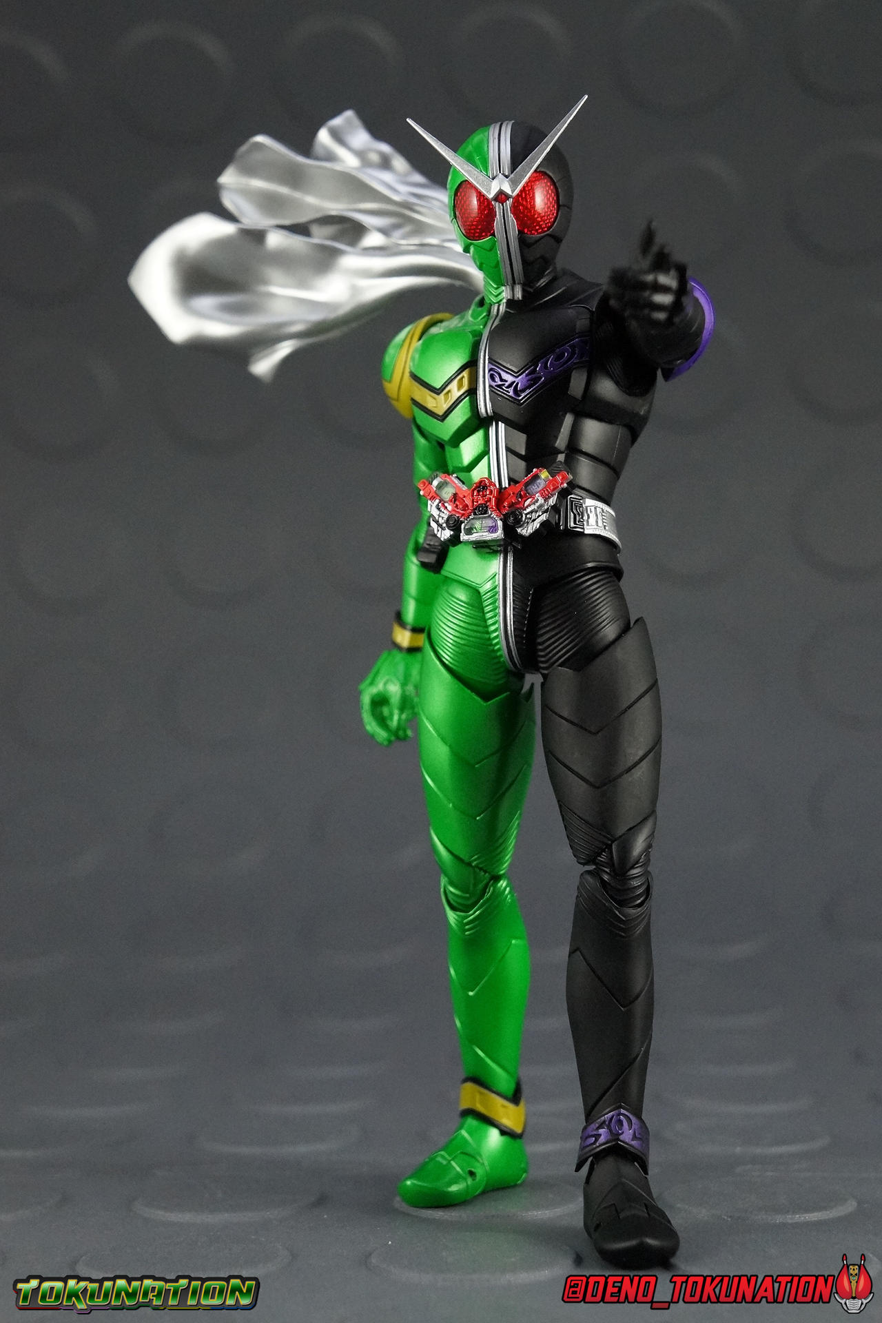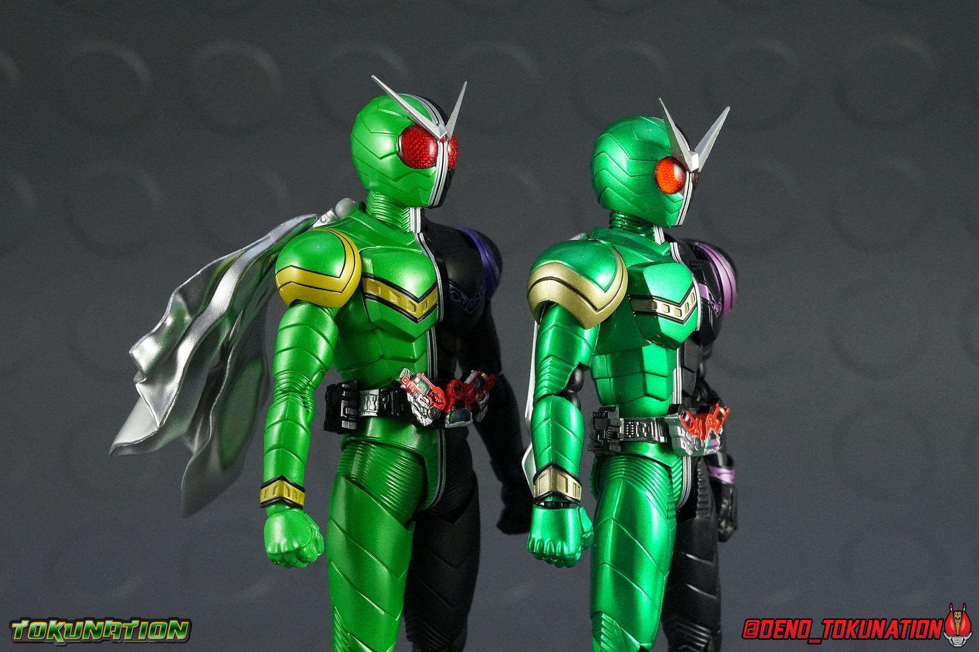 Once again Bandai have outdone themselves with another sophisticated modern update to a fan faovrite character. After years of being represented only by the original S.H. Figuart, collectors can finally upgrade their Kamen Rider W's with the S.H. Figuarts Shinkocchou Seihou Kamen Rider W! But is it the Figuart of year? Read on to find out that, yes, I think it is! Packaging The wonderful premium Shinkocchou Seihou packaging returns! If you've seen any of my recent reviews for Seihou Kuuga Ultimate or Seihou Gattack, etc etc, then you know I love this packaging, but it also isn't very different from release to release. Main Figure It's no secret that I have never been the biggest fan of Kamen Rider W. The show just didn't work for me on a number of levels. But I can respect that for many people it wound up being their access point into the franchise. And for those people more than most, there's been a glaring hole in their collection for years. A truly good SHF W. Well after 5 years of waiting, Bandai has finally rectified their mistakes. The original SHF W can go in the trash heap where it belongs, because Shinkocchou Seihou W is the renewal fans have deserved for years! This figure basically accurately recreates the suit you've seen in numerous episodes and movies down to it's finest details. I've said this many times with Shinkoccouh Seihou releases, but I truly think W is the peak of the line so far. In every conceivable way this figuart is a masterpiece. For a frame of reference, the original W Figuart was largely a product of it's time. A figure rushed to production with sloppy proportions, inaccurate details, no functional gimmicks, and an absolute dearth of accessories. In last 5 years this toyline has made huge strides towards striking the balance of accuracy & playability. And S.S. W is probably the peak at this point. For starters the S.S. release is completely the perfect shades of green & black. Finally after years of the ugly metallic on the original release, the S.S. embraces that wonderful shade of green and brings the suit design to life. Adding to this the gold & purple detailing are also the correct colors, the silver paint apps are on point, and the eyes are the correct shade of red. As you can see in the comparison shots below it's like night & day between these two. There is no comparison at this point, and then you look at the Double Driver. Not only does Seihou W feature an intricately detailed sculpt with appropriate paint apps for this device, it is entirely functional! Yes this Drive works just as it should including open slots for to-scale Gaia Memories to be used. This figuart includes (appropriately) the Cyclone & Joker memories, they fit into the slots very snugly as well so once in there they should be safe. But be careful when inserting them as they are easy to lose. The sides of the W Driver can fold down as well completing the look. If/when further W releases come out you'll be able to swap in their Gaia Memories as well, though obviously this figure can't split in half to form change. Now the Seihou W obviously has the look down, but does it have the functionality. Yes. In every sense of the word. Before now possibly the only poseable W figures released that could really pull off his signature poses and still look good doing it were the Master Grade Figurise model kit and perhaps the 12" Medicom figure. S.S. W has the articulation to pull off everything, and the proper sculpting for the joints needed for it to look perfect while doing so. How about those extending knee joints that look like a natural expansion of the costume, almost like fabric stretching? Or those seamless thigh swivels? Perhaps the masterful design of the shoulder pads & upper arms? Or the miraculous way the upper torso is designed. When I initially handled this figure I thought the torso was all one piece until I realized the upper body could move. It just looks that good in hand. This figure can pull off most any pose you recall the character making, and looks absolutely perfect while doing so. I've encountered a lot of truly great releases in the last year. But I believe this one takes the cake. Accessories 1 - Cyclone Gaia Memory. These small accessories can be used in either the Double Driver or the Maximum Drive slot on the right hip. They are extremely tiny, and extremely easy to lose. Do be careful with them. 1 - Joker Gaia Memory. These small accessories can be used in either the Double Driver or the Maximum Drive slot on the right hip. They are extremely tiny, and extremely easy to lose. Do be careful with them. 5 - sets of additional hands. Pretty much every iconic pose that W ever used. You couldn't ask for better character specific hands. 5 set's is just brilliant. As if the figure weren't already excellent enough, the hands just sell the body language it can pull off. 1 - muffler/scarf (short). The standard version of W's muffler. It can peg into the right shoulder blade and is hinged to move as needed. My only complaint about this smaller muffler is that it won't lay flat against W's back. It's molded in such a wavy position and the hinged joint it moves on doesn't allow for it to get very close to the main body. I get that W is known for his sweeping scarf in poses, but occasionally things do look more flat and static. I would have liked an alternate flattened scarf like we've seen in the past with numerous Showa Rider releases. 1 -muffler/scarf (long). Now this one is purely for cool posing. It's not really practical, especially due to it's considerable weight. The hinge on the peg can't entirely support it, so it can fall easily if moved to much. But it's not really a long term use accessory either. This one is obviously much larger and more wind swept. Honestly that's a pretty great set of accessories for W. I would say he should have included some effect parts, but the wind/cyclone Tamashii Act Effects that were released in tandem with him get the job done very wel