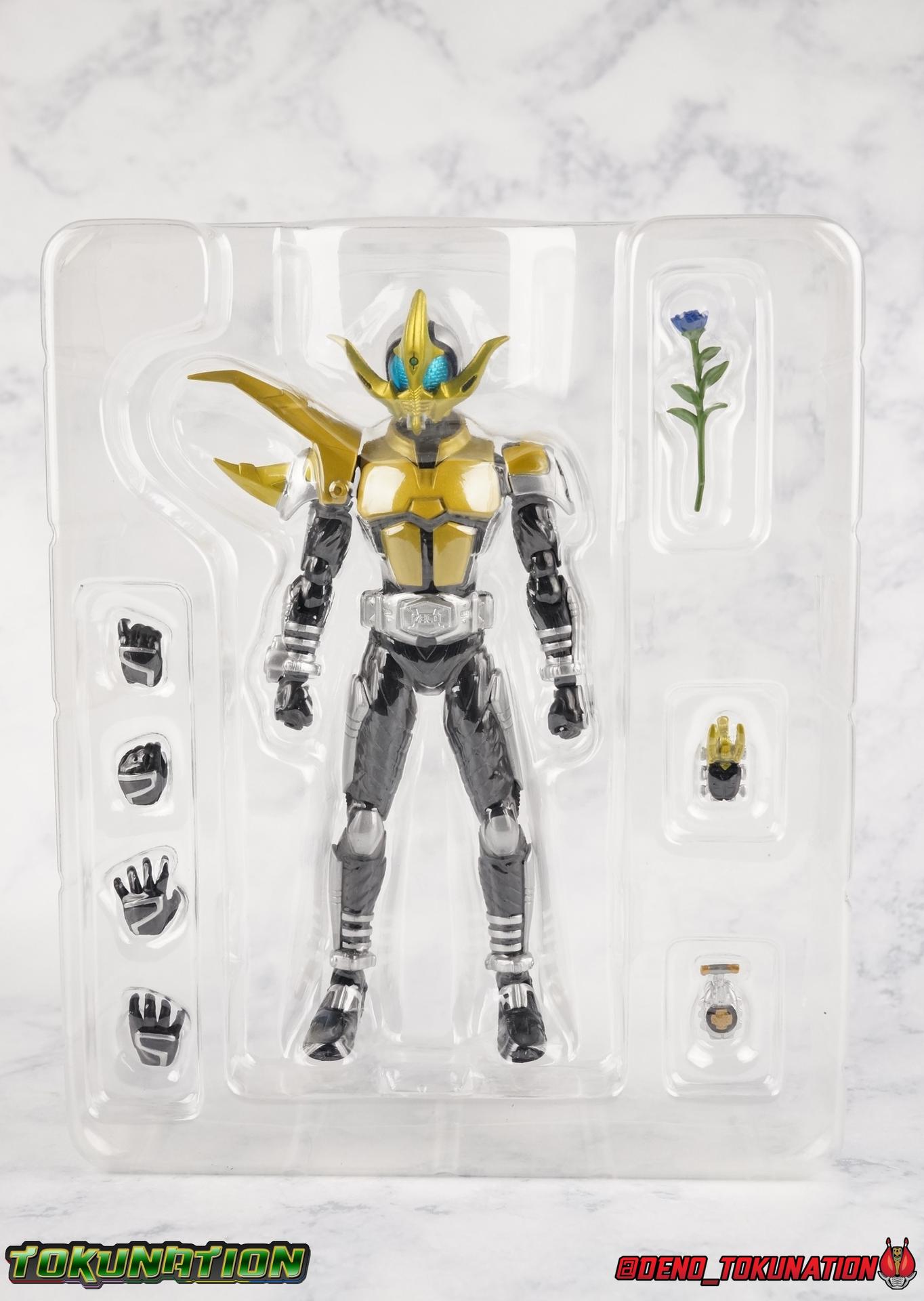With Shinkochou Seihou releases in full swing, particularly for Kamen Rider Kabuto, I thought it was time we went back to take an extensive look at the trio of new riders that were introduced in Kabuto's film. Exclusive to God Speed Love, each of the 3 riders, Hercus Ketaros & Caucasus, has their own allegiance to one of the various future factions of ZECT. And even though ultimately each of them were sacrificial lambs for Tendou's path to the past, they all had particularly strong designs. We'll focus on each briefly below, be forewarned that the mold each of these figures uses as a base is the original Kabuto/Dark Kabuto mold, NOT the Seihou release. These are the original releases, they are quite dated, they do still have many faults of that original mold. Faults that most of the releases in the original Kabuto line suffered from. I won't focus on their functionality for too long as that mold doesn't really have much to offer in discussion anymore. Post #1 will focus on Hercus & Ketaros while Post #3 will primarily focus on Caucasus. If you'd like to hear my thoughts on this older body mold please feel fee to thumb through my original release Gattack & Dark Kabuto galleries for an idea. Packaging Each of these figures hails from an era of S.H. figuarts when gray scale plain boxes were the norm. So it's no shock that the packaging is incredibly boring for each of these figures. Main Figures Hercus: We'll start here with the silver Hercules Beetle themed Kamen Rider Hercus. A pretty basic repaint of the original Kabuto mold, Hercus does feature a new head and right shoulder. The new shoulder reminds me more of a Rhinoceros beetle than his actual head does, but I do like the double pronged nature of the heads' design. One large horn striking forward from the forehead, and a small upward pointing blade from the chin. While not the most exciting of the 3 new riders, it has a uniqueness all it's own. Aside from these changes Hercus also has a remolded right wrist which now has a brace and port for the included Hercus Kabutech Zecter to attach. Accessories: 2 sets of additional hands, 1 Hercus Zecter, and 1 ZECT Kunai Gun (gun mode). That's pretty lite, but also quite standard for the time of his release. I can't recall any of the original Kabuto riders actually including both the Kunai Gun and it's actual kunai mode. Technically he can wield it as the axe form too, but it's not quite the right shape or size for that. Ketaros: Next up we have the rust brown Centaurus Beetle themed Kamen Rider Ketaros. Another basic repaint of the original Kabuto mold, Ketaros does feature a more elaborately molded new head than Hercus. The new shoulder is identical to the one on Hercus, just with different paint apps. The new head however is a vast departure, I get the impression of dragonfly & scorpion combined in his visor design. It really is something else. The way that unique part splits the compound eyes is pretty striking, it's much less safe than most of the Kabuto rider form helmets were. Not exactly my favorite of the 3 movie riders, Ketaros is still a nice departure from Hercus' blandness. Aside from these changes Ketaros also the remolded right wrist which now has a brace and port for the included Ketaros Kabutech Zecter to attach. Accessories: 2 sets of additional hands, 1 Ketaros Zecter (a repaint of the Hercus Zecter), and 1 ZECT Kunai Gun (Kunai mode). That's pretty lite, but still standard for the time of his release. My guess is that he includes the Kunai mode of the kunai gun simply to differentiate Ketaros a bit more from Hercus. And that actually does help some. Caucasus: Now we arrive at easily my favorite of the 3 movie riders, the golden Caucasus Beetle themed Kamen Rider Caucasus! While still not a huge departure from the original Kabuto mold, or in fact the other 2 movie riders, Caucasus somehow winds up as my favorite of the 3. He features the same remolded shoulder as the other 2, with different paint apps again. And he also features another fantastic elaborate head. Ketaros was really interesting looking, but Caucasus almost appears to have a giant mustache. Which is somehow way more awesome? I also really like how the blue compound eyes offset the gold armor. Each of these molds carries about the same weight personality wise, but this one some how squeaks out as my favorite. Like the others his right wrist has been remolded with a new brace to accommodate the included Caucasus Kabutech Zecter. Accessories: 2 sets of additional hands, 1 Caucasus Zecter, 1 Hyper Zecter, and 1 blue rose. Even though Caucauss doesn't even include a simple repack of a weapon like the others do, he really comes with all he needs. The signature blue rose he's seen with in the film is a fantastic touch, and the Hyper Zecter is a must. Final Thoughts I have to say that even though these are all based on a pretty inferior mold, these figures still hold up decently. Obviously they're a bit undersized to scale correctly with today's line of Shinkocchou Seihou riders from Kabuto, but they can get the job done on a budget until the real deal comes out. If you see the trio cheaply I'd recommend picking them up to fill out a display at least. Kamen Riders Hercus, Ketaros, & Caucasus are worth that at least. But I'm also a huge Kabuto fan, the movie especially really worked for me. Often times people site Den-O as the first time that a Kamen Rider theatrical movie directly impacted the plot of the TV series, but really, it's Kabuto. If future Tendou hadn't managed to defeat Caucasus & steal the Hyper Zecter, as well as travel to the past, the original TV series would have never happened. Without this alternate future that's actually a prequel, the show wouldn't exist. And I love that. That's probably where a huge chunk of my attachment for these 3 designs comes from as well. But enough of me pontificating. Check out the full gallery below and let that be the deciding factor for you.