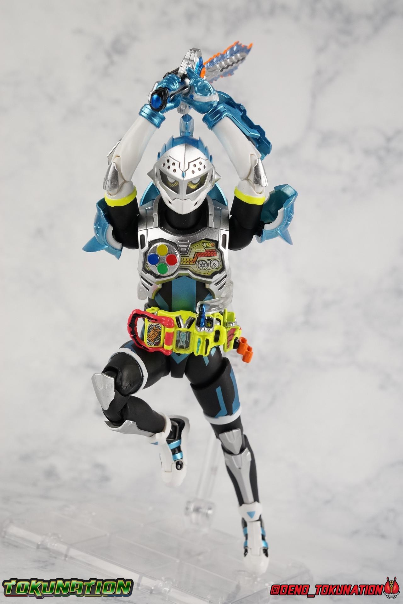 "Taddle Quest!" And we're back for part 2 of our Mighty Action X Beginning Set gallery series! Last time we took a look at the first rider in this set with S.H. Figuarts Kamen Rider Ex-Aid Action Gamer Level 2, this time we get to spend some time with the world's greatest surgeon, S.H Figuarts Kamen Rider Brave Quest Gamer Level 2! Each of the 3 figures in the Mighty Action set will be photographed separately. So that's 3 different full galleries! This gallery is part 2 of 3. We've already knocked out Ex-Aid, today takes care of Brave, and next time it's Snipe! Packaging The Mighty Action X Beginning set is a rather large 3-pack. Something that's rarely tried with figuarts release. The last 3-pack in recent memory was the Hakaider Squad set, that was a web exclusive release, and it didn't sell well. So for Bandai to take a chance on 3 unique riders from Ex-Aid, and release them at retail, that was pretty surprising. The box is a rather colorful 3-tone type that really pops, definitely befitting of the series it's from. Honestly the figures in box would make for a nice display piece if you'd like to pick up the individual figures to open too. It just looks good. The 3 riders come in one large tray with their hands, while the Mighty Action X stage as well as their unique weapons are in a separate tray below. Main Figure Obviously each Ex-Aid rider has a pretty radically different design, as with any series each character is unique. But they also tend to share some design influence, and in many cases parts reuse. The Ex-Aid line, at least so far as Level 2 forms are concerned is a prime example of this. Each suit has it's own unique detailing and colors, but at a basic level they feature the same mold. Sporty type shoes, the bike shorts look, the driver, the chest plate. You see what I mean. So although Ex-Aid and Brave Level 2 look very different, they also have a ton of similarities. So a good portion of my review will be very similar to that of Ex-Aid. If you'd like to skip a bit further down below then feel free as there will be a bit of rehash here. As with Ex-Aid, Brave features a ton of complex detail that we don't normally see each year. Paint apps and small molded details galore. Even more so than Ex-Aid, Brave is lavish. From the Ground up the new Ex-Aid type body is pretty solidly built. Though the ankles are still a huge fault for me. They don't have the full range of motion they need for Brave to assume many of the dynamic poses he's known for. You'll find that wide stances are just really really difficult to achieve, which means he's always gonna be a bit off balance. The knees have a great bend that helps add to Taddle Quest's sort of adventurous platformer theme. And all that being said, the paint apps for the legs are exquisite. I loved the black striping on Ex-Aids legs, but the blue detailing on top of the matte black finish on Brave's legs is really striking. That holds true for his entire under suit, it's just really gorgeous. One of the more elaborate pieces on the figure is the Gamer Driver itself. This entire device is extraordinarily detailed for something at this scale. The Driver handle can flip shut, thus hiding the rider read out on the front screen as well. The right of the driver has 2 slots for Gasshats. One is already attached in the form of the Taddle Quest Gasshat. It's kind of a dummy item though as it's really just the handle portion that pegs in. To the right of the driver, is a Gashat holster. There are 2 slots for extra Gasshats as well as 1 slot for a Critical Finish to be inserted. This whole assembly just looks fantastic. I'm taken back to Gaim Orange Arms and the wonderful design of his Sengoku Driver. This level of functionality is always impressive. I won't sell the rest of the upper body short either. Brave is absolutely breathtaking but his chest detailing is magnificent. The paint apps on the outer layer are crisp and clear, but I'm so impressed by the Rider Gauge label within his chest. Again, unlike Bandai's previous failures with labels (Kiwami Arms) this is flawless. On the flip side of the torso is the deactivated Level 1 head. As with Ex-Aid it's a bit stylized and shrunk down, but wow it looks good. It's such a strange detail for me to love but I do. Not to be forgotten are the arms, which admittedly only have one flaw that I'm bothered by, it's the same as with Ex-Aid. The shoulder pads. Every time I try to stretch the arms out it's like rather than sliding out properly the pads just pop off again. But it's a minor issue. The wrists are solid, the elbows fully functional and the bicep swivel welcome as always. Finally that brings us to the head. While Ex-Aid's head still seems to get a far bit criticism, I don't see how you could complain with Brave. That design is sharp, solid, and gorgeous. Somehow that head just wonderfully conveys Hiiro's dour attitude and sternness. It just oozes Mr. perfect surgeon. My only issue with it is the inconsistency of the white paint on the chin. Mine had a few flecks chipped off right out of the box, and I don't know that that's a common issue. But it bothers me a bit. Otherwise I think the shape & sculpt of the head are totally on point. It's a great new body mold with a brand new personality slapped onto it. I love it! Accessories Brave, much like Ex-Aid, comes with a pretty basic assortment but it's also basically everything you need for him: 4 - Sets of additional hands. That's 1 more set than Ex-Aid came with which I find odd, but I'll take it. Basically the only difference with Brave is the extra set is a totally open palm with spread fingers. 1 - Explosive Freezing Gashacon Sword. As the name implies this weapon carries both heat & cold abilities. In show this was represented by the blade transforming, on both sides, between the two forms. However this toy version opts for a blade that has fire on one side & ice on the other. It simply rotates at the base for whatever your preferred use is. It'