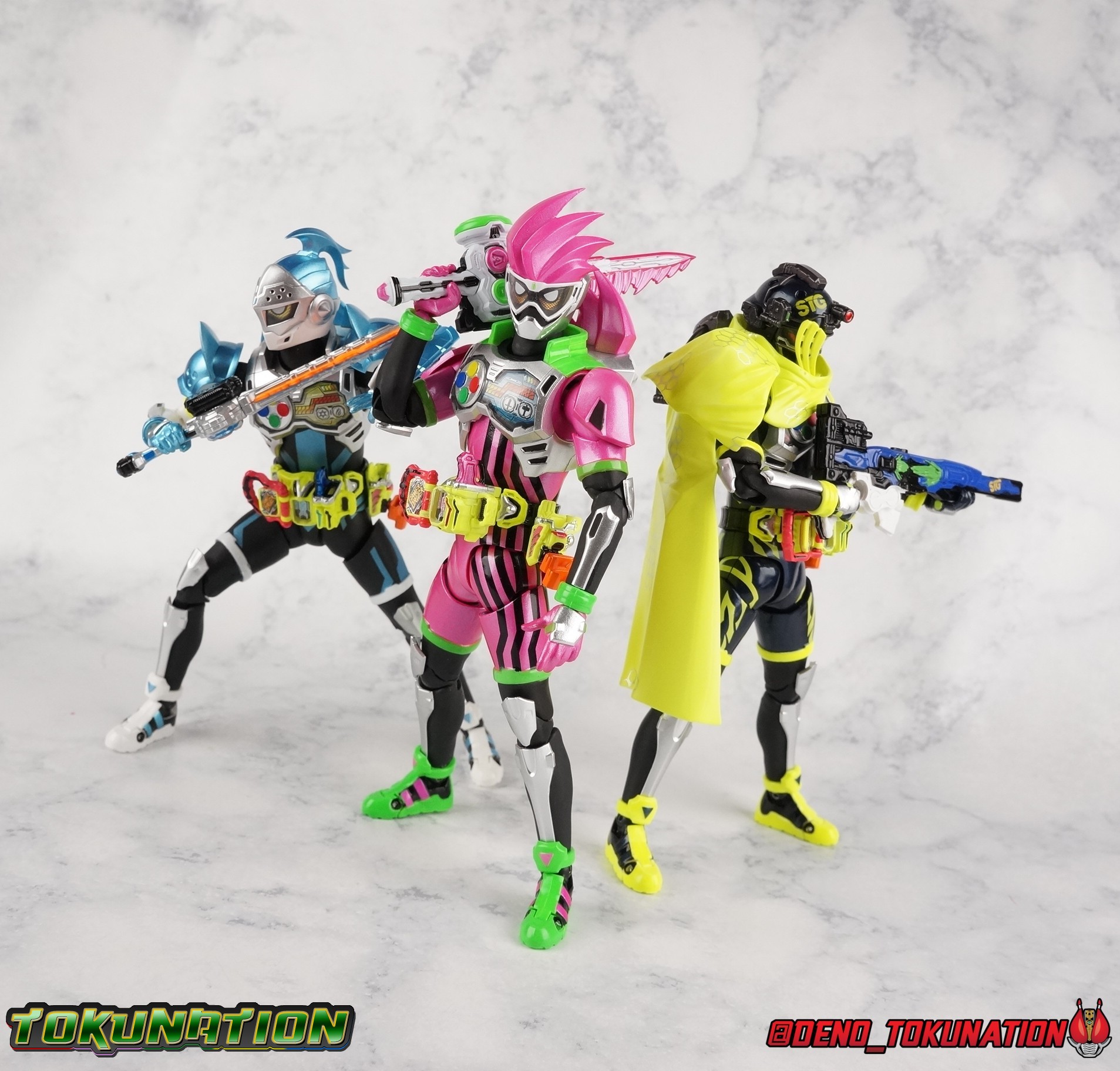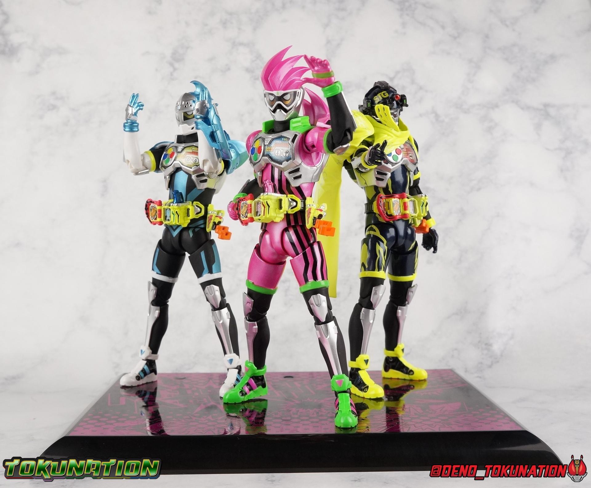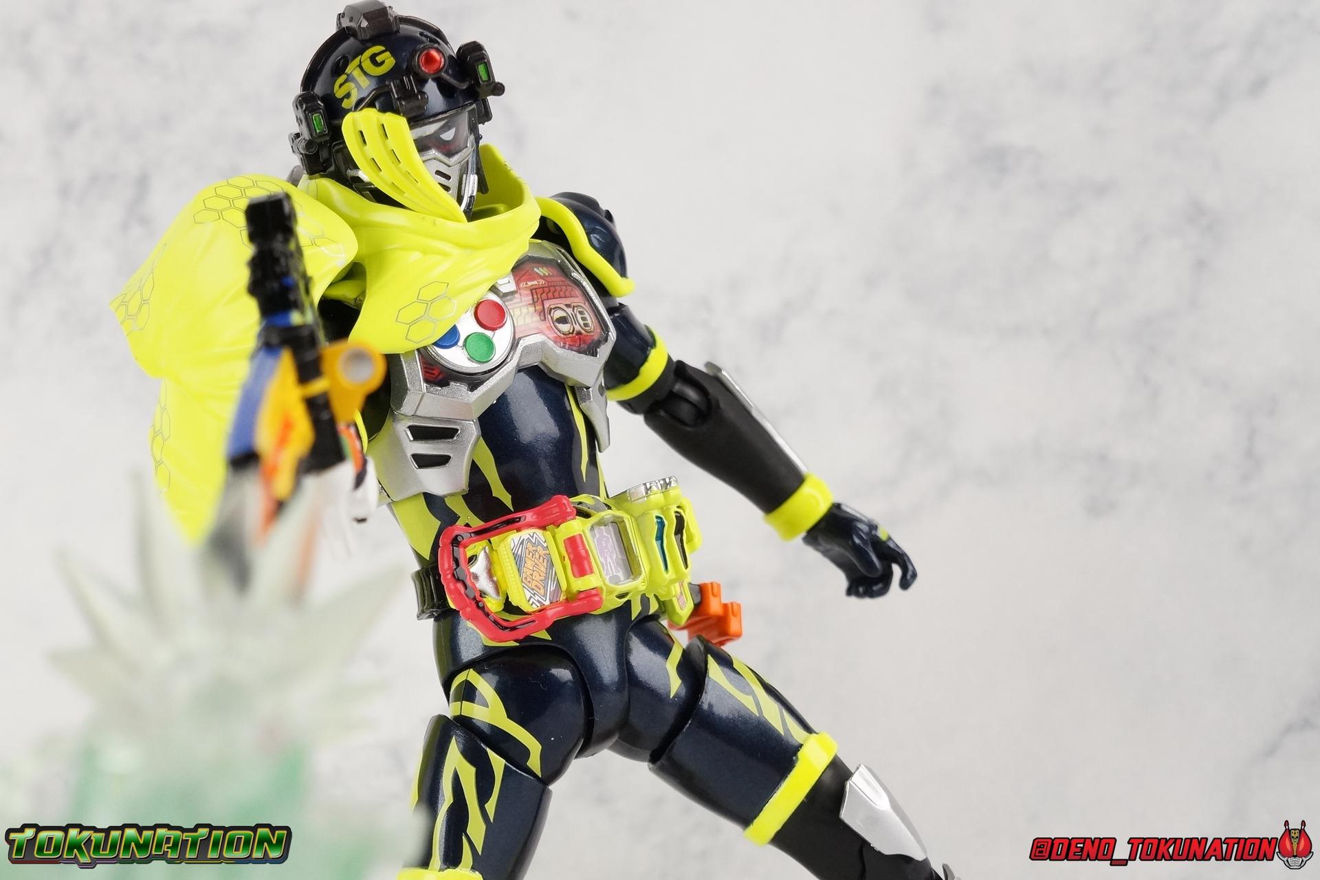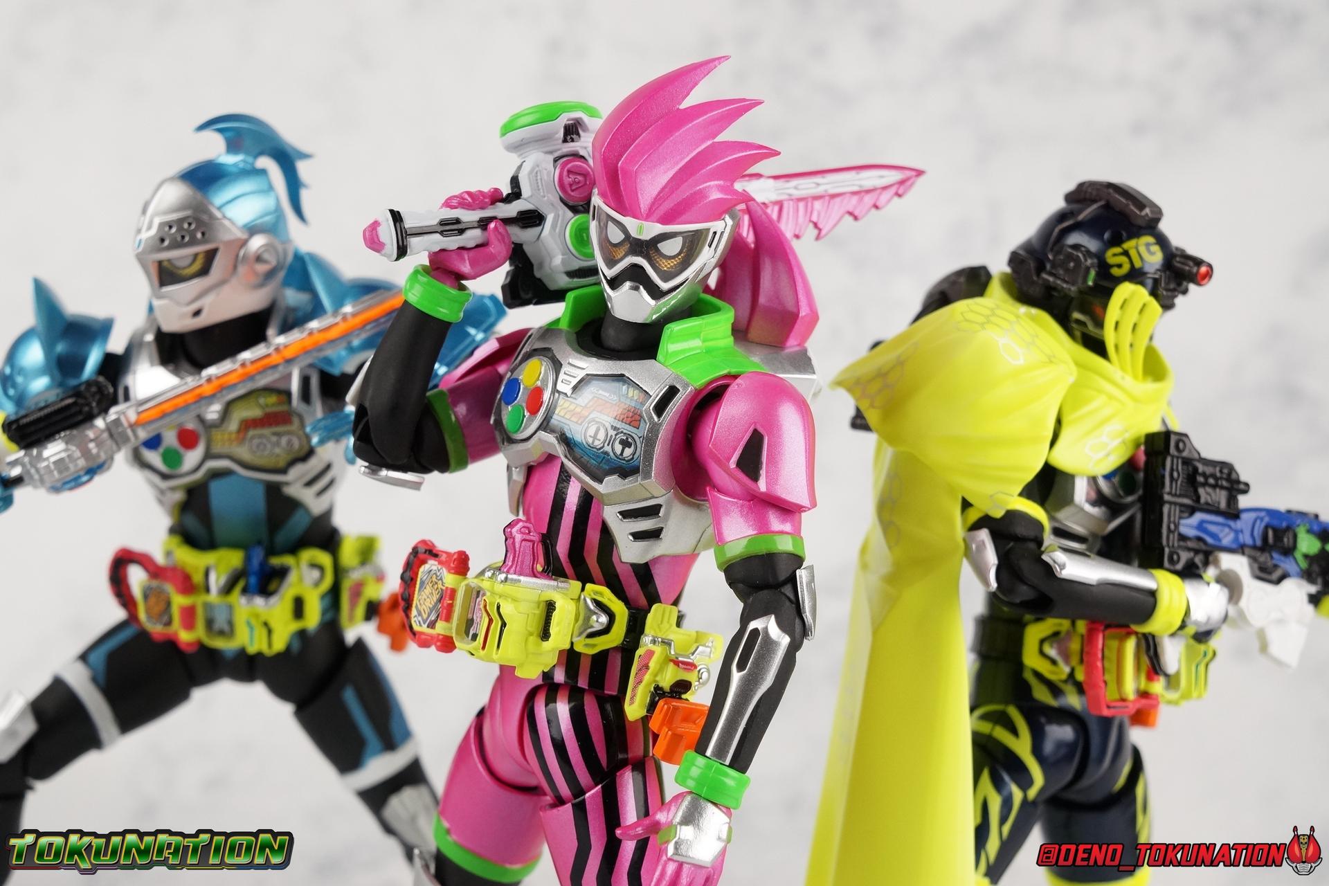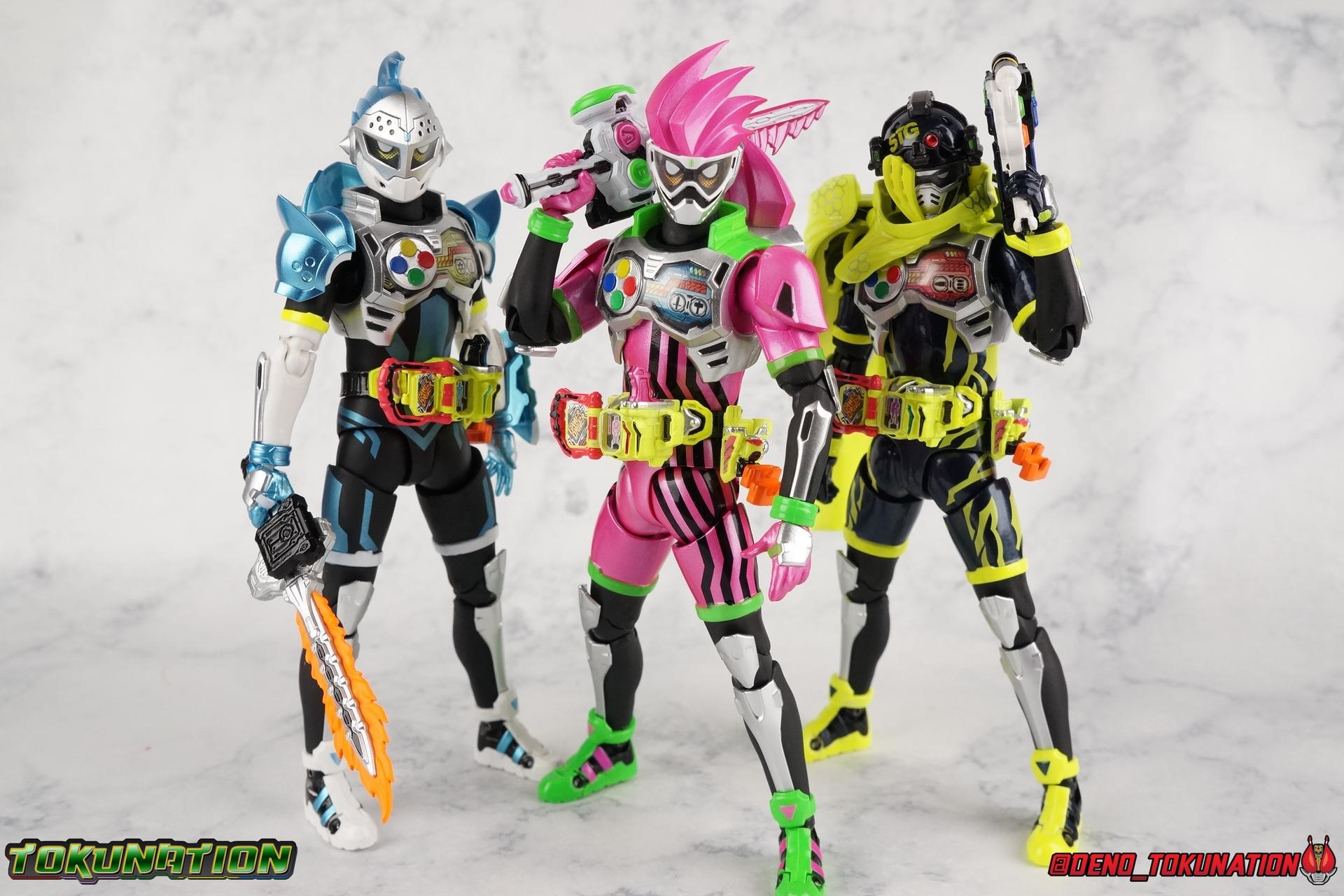 We're back for the final part of our Mighty Action X Beginning Set gallery series! S.H. Figuarts Kamen Riders Ex-Aid Action Gamer Level 2, & Brave Quest Gamer Level 2. And this time we get to end things with everyone's favorite unlicensed doctor, S.H Figuarts Kamen Rider Snipe Shooting Gamer Level 2! Packaging The Mighty Action X Beginning set is a rather large 3-pack. Something that's rarely tried with figuarts release. The last 3-pack in recent memory was the Hakaider Squad set, that was a web exclusive release, and it didn't sell well. So for Bandai to take a chance on 3 unique riders from Ex-Aid, and release them at retail, that was pretty surprising. The box is a rather colorful 3-tone type that really pops, definitely befitting of the series it's from. Honestly the figures in box would make for a nice display piece if you'd like to pick up the individual figures to open too. It just looks good. The 3 riders come in one large tray with their hands, while the Mighty Action X stage as well as their unique weapons are in a separate tray below. Main Figure ** Special note, I lost the Bang Bang Shooting Gasshat about halfway through this gallery and simply could not find it for several hours. So some pictures are of Snipe with it missing. Sorry! Each Ex-Aid rider has a pretty radically different design, as with any series each character is unique. But they also tend to share some design influence, and in many cases parts. The Ex-Aid line, at least so far as Level 2 forms are concerned is a prime example of this. Each suit has it's own unique detailing and colors, but at a basic level they feature the same mold. Sporty type shoes, the bike shorts look, the driver, the chest plate. You see what I mean. So although Ex-Aid, Brave, & Snipe look very different, they also have a ton of similarities. This review will echo nearly everything I have said about Ex-Aid & Brave as the mold is mostly identical. Please feel free to skip ahead to photos if you like. As with the last two riders, Snipe Level 2 features a ton of complex detail that we don't normally see each year. Paint apps and small molded details galore. Snipe may look slightly more dull by comparison, but that's just his more drab color scheme. Still, from the Ground up the new Ex-Aid type body is pretty solidly built. Though the ankles still lack the freedom of movement they need. You'll still find that wide stances are just really really difficult to achieve, which means he's always gonna be a bit off balance. This could be more of a detriment with a character like Snipe, the FPS based Bang Bang Shooting should mean this figure can pull off stable balanced poses, but it can be difficult. All that being said though, the paint apps for the lower part of the body are still top notch, even if again the whole package is a bit more drab. The bright green striping on Snipe's thighs is well done, just not as exciting. One of the more elaborate pieces on the figure is the Gamer Driver itself. This entire device is extraordinarily detailed for something at this scale. The Driver handle can flip shut, thus hiding the rider read out on the front screen as well. The right of the driver has 2 slots for Gasshats. One is already attached in the form of the Bang Bang Shooting Gasshat. It's kind of a dummy item though as it's really just the handle portion that pegs in. To the right of the driver, is a Gasshat holster. There are 2 slots for extra Gasshats as well as 1 slot for a Critical Finish to be inserted. This whole assembly just looks fantastic. I'm taken back to Gaim Orange Arms and the wonderful design of his Sengoku Driver. This level of functionality is always impressive. I won't sell the rest of the upper body short either. Snipe may not be as striking as his predecessors but his chest detailing is just as magnificent. The paint apps on the outer layer are crisp and clear, but I'm so impressed by the Rider Gauge label within his chest. Again, unlike Bandai's previous failures with labels (Kiwami Arms) this is flawless. On the flip side of the torso is the deactivated Level 1 head. As with Ex-Aid it's a bit stylized and shrunk down, but wow it looks good. It's such a strange detail for me to love but I do. Not to be forgotten are the arms. Sadly this is where I take great issue with the figure. Snipe's shoulder sash is absolute junk. Plain and simple. It does nothing but hinder articulation and be frustrating. You can angle the pieces of it which are ball-jointed, but not enough for anything meaningful. Most of the time the parts simply pop off before getting into a position that's useful. It's sculpted well and the jointed nature of it doesn't detract from it's look, but it's very poorly executed. Finally that brings us to the head. While Ex-Aid's head still seems to get a far bit criticism, & Snipes collar color is incorrect, I don't see how you could complain with Brave's likeness frankly. That design is sharp, solid, and gorgeous. I like the extra mile Bandai went to making Taiga's "bangs" a removable piece as well. It's on a small pege so it can be rotated as needed when moving the head, this way when it impacts the collar you move it without fear of breakage. Smart move! Accessories Snipe's accesories are a bit more similar to Ex-Aid, he comes with a pretty basic assortment but it's also basically everything you need for him: 3 - Sets of additional hands. The same basic set up as Ex-Aid, Snipe's holding things hands are just specifically designed for his Magnum. 1 - Gashacon Magnum (Handgun Mode). Like Ex-Aids Gashacon Breaker, Bandai opted for a swap out part rather than a functioning weapon. The Magnum in Handgun Mode looks good, but is very difficult to get Snipe to hold properly. The grip is actually too big for the set of hands it's intended for. Otherwise I think it looks pretty nice, even if the paint is a bit too thick. 1 - Gashacon Magnum Rilfe Mode Barrel. A swap out part, you just remove one side of the Magnum and add this on