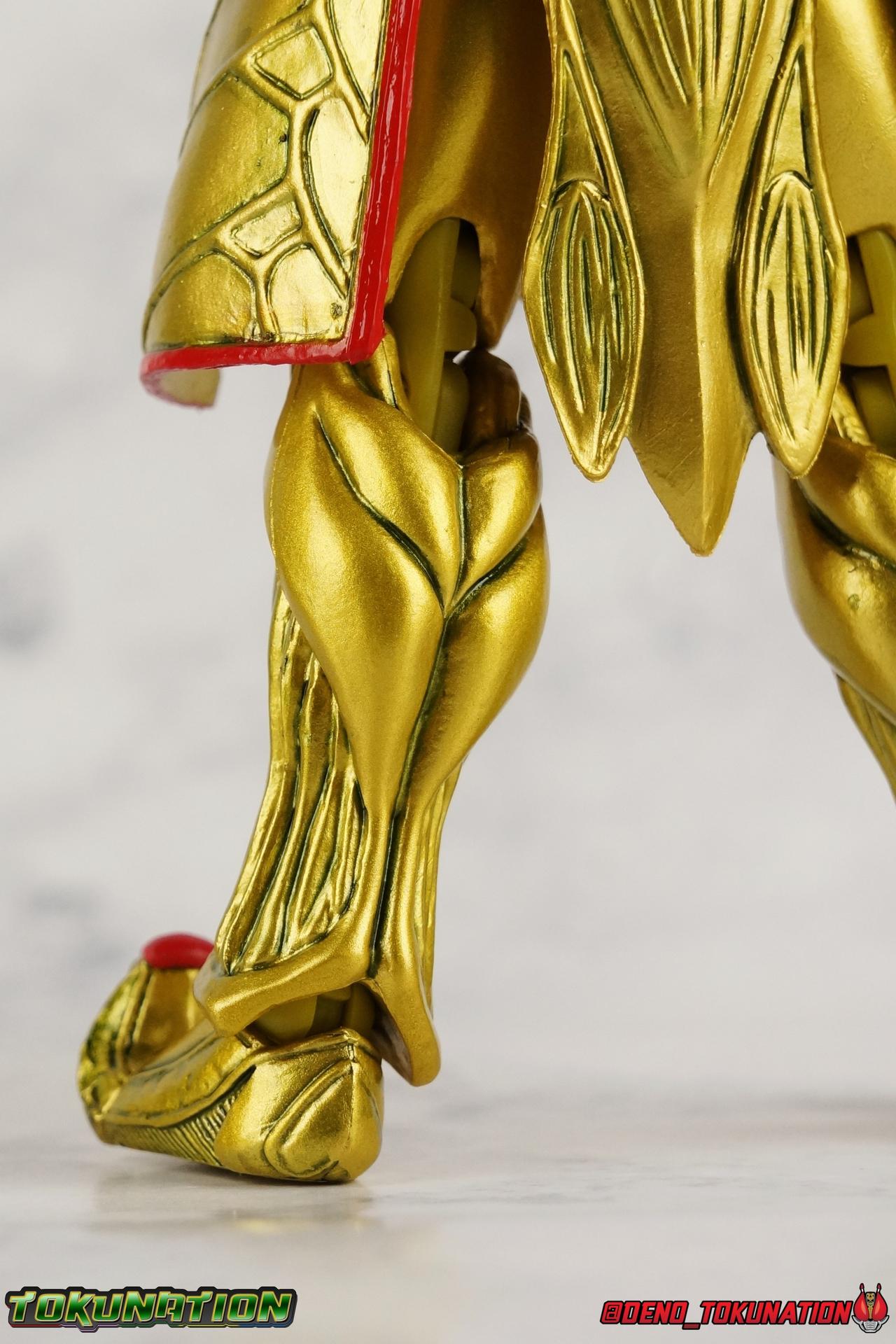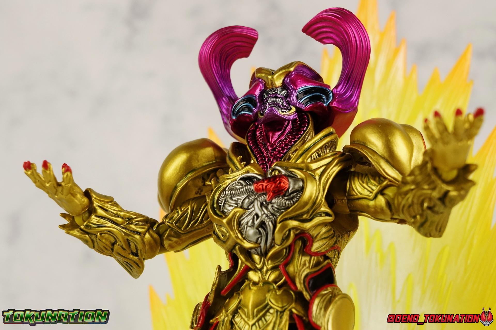 ** As with a lot of releases in the Drive line, this is another repaint mold. SO my review is going to be very similar to the original Heart Roidmude Gallery. Packaging The packaging for this release is literally identical to that of the original S.H. Figuarts Heart. We've just got some new stock photos of this gorgeous golden boy. It's still a rather boring box design, but the intricate details of Heart go a long way even in stock photos. Main Figure Takeyuki Takeya has always been a master of details, and his wonderful design for Heart has made the transition to figure form, at least visually, very well. Kaijin SHF's are few and far between nowadays, gone are the glory days of the Dopants, Greed, & even Zodiarts when there were many villainous releases to accompany the heroic riders. In fact this Over Evolved repaint of Heart is only the second such release in the entirety of the Drive toyline. And that's out of about 20 individual figure releases. We saw a prototype of Brain Roidmude some time back at a Tamashii Nations event but he's never seen the light of day again. I would guess that Over Evolved Heart is likely our last Kaijin from this series, so let's take a look at him. The original Heart release didn't set the bar very high in quality terms, but Over Evolved Heart certainly does a better job. Heart is a gorgeously sculpted figure. Seriously it's like the show suit was shrunken down to perfect miniature. In terms of sculpt it's unbeatable. The intricate designs and etching of the suits are perfectly represented here. From Hearts' feet to his incredible head everything looks great, though the weathered paint wash on his golden parts seems to be a tad bit misapplied. But perhaps the best features to point out are the actual chest and Hearts' well, heart. It's just gorgeous. It looks like it could beat with some devilish blood flow at any point. And the new paint job for Over-Evolved Heart helps bring out these details even more. The various musculature's and striations on his body just look so much more alive this go around. This Figuart however is functionally an awful toy. Plain and simple. Where Heart excels in sculpt, he fails miserably in design. The legs in particular are just bad. Thanks to the skirt armor, which again looks great, the legs can barely move whatsoever. I've managed to get him in a few decent poses but only briefly and often only with support from a Tamashii Stage. Hearts legs can barely move outwardly and certainly don't have much range forward or back, add to this his rather clownish feet and even basic poses can be difficult. Thankfully this release at the very least has corrected to terribly loose hips. My original Heart can barely even stand. Over Evolved Heart however has plenty of supporter. Moving up the body, the arms may as well be vestigial. They serve no purpose. Despite huge wrists the hands move freely, the elbows work even. But the bicep swivels are all but impossible to use as it only moves about a quarter turn, almost like something is blocking each arm internally from moving more. And the arms have the ability to move slightly up & forward or back, but are immediately stopped by the massive shoulder pads. Pads that for some bizarre reason can only rotate forward or back on a swivel. There is no hinged joint to allow them to move up with the arm. Effectively killing almost any good pose you want to have the arms in. Couple these issues with the torso that can barely swivel or lean forward at all, and you probably understand my disappointment. Even arching the back just slightly will topple this guy over. The head is also pretty terribly designed. Again it's a BEAUTIFUL sculpt but the massive frill/neck piece coming up out of the torso has minimal rotational movement and the head sitting atop it has only slightly more. Again, Over Evolved Heart is incredibly gorgeous. The golds & purples featured on the mold this go around are incredible. They bring out all of the most delicious details of this mold. But as with the original release, physically this figure lacks proper articulation. Accessories And here's the worst part of this release: 3 - sets of hands. That's it. Just straight up repaints of those included with the original Heart. Not unexpected, but still a bit disappointing. As with the original, one set of hands are a type of closed fist "holding things" pair. They're open through the center as though a small pole of some sort could fit through his grasp. But no such mention is made in the instructions as to what these are for, and no accessory with any Drive Figuart that I own has any discernible way of interacting with Heart while using that type of hand. Unfortunately Over Evolved heart does not come with the AI Drive Driver & Shift Brace. I realize this seems like a weird thing for me to bring up. But when Heart returned in the Mach/Heart V-Cinema, when he used his Roidmude form he was still wearing the Shift Brace. And later took out the AI Driver to use his first Rider form, Speed/Wild/Technic. I think it would have been a really nice touch for this figure to at least include the brace even if it wasn't just fixed to his wrist. But alas, Over Evolved Heart comes out with the same paltry selection of accessories as the original one. Final Thoughts I love love LOVE Takayuki Takeya's incredible design work for this show. The Roidmude are some of his best creations ever. That being said, once again the transition to figure form has been less than perfect. The original Heart Roidmude was my first big disappointment with this line, Over Evolved Heart Roidmude manages to be better thanks to it's glorious paint scheme, but that's about it. Functionally this is still the same flawed mold we got two years ago. I still love Heart's character, even more so after his V-Cinema return, so I'm always willing to own more figuarts like this. I just wish that some improvements could have been made to his articulation. As is I can only recommend Ove