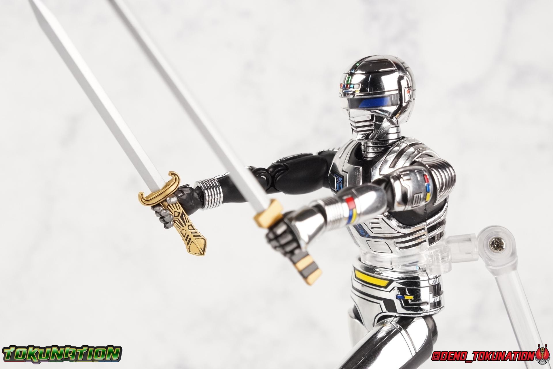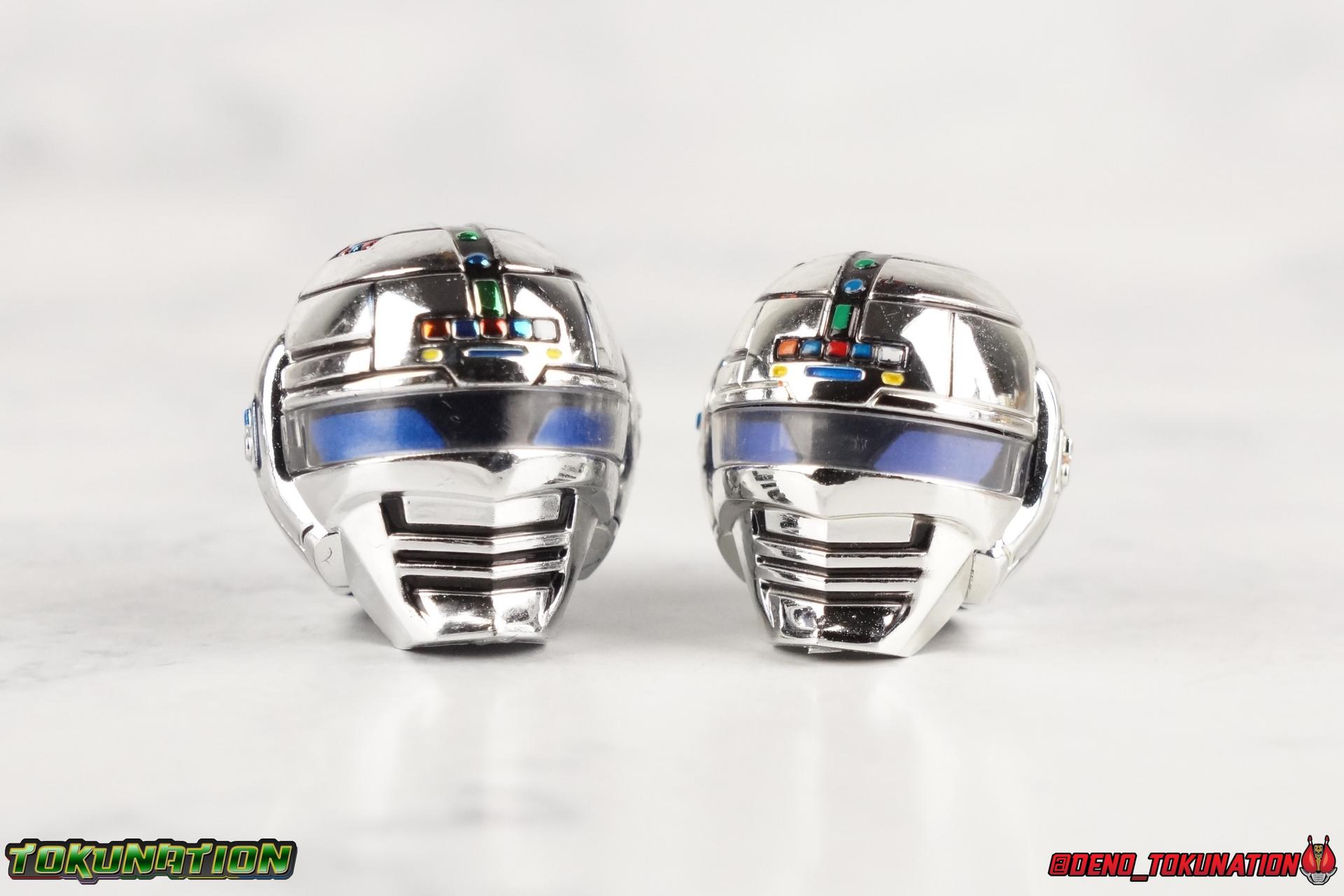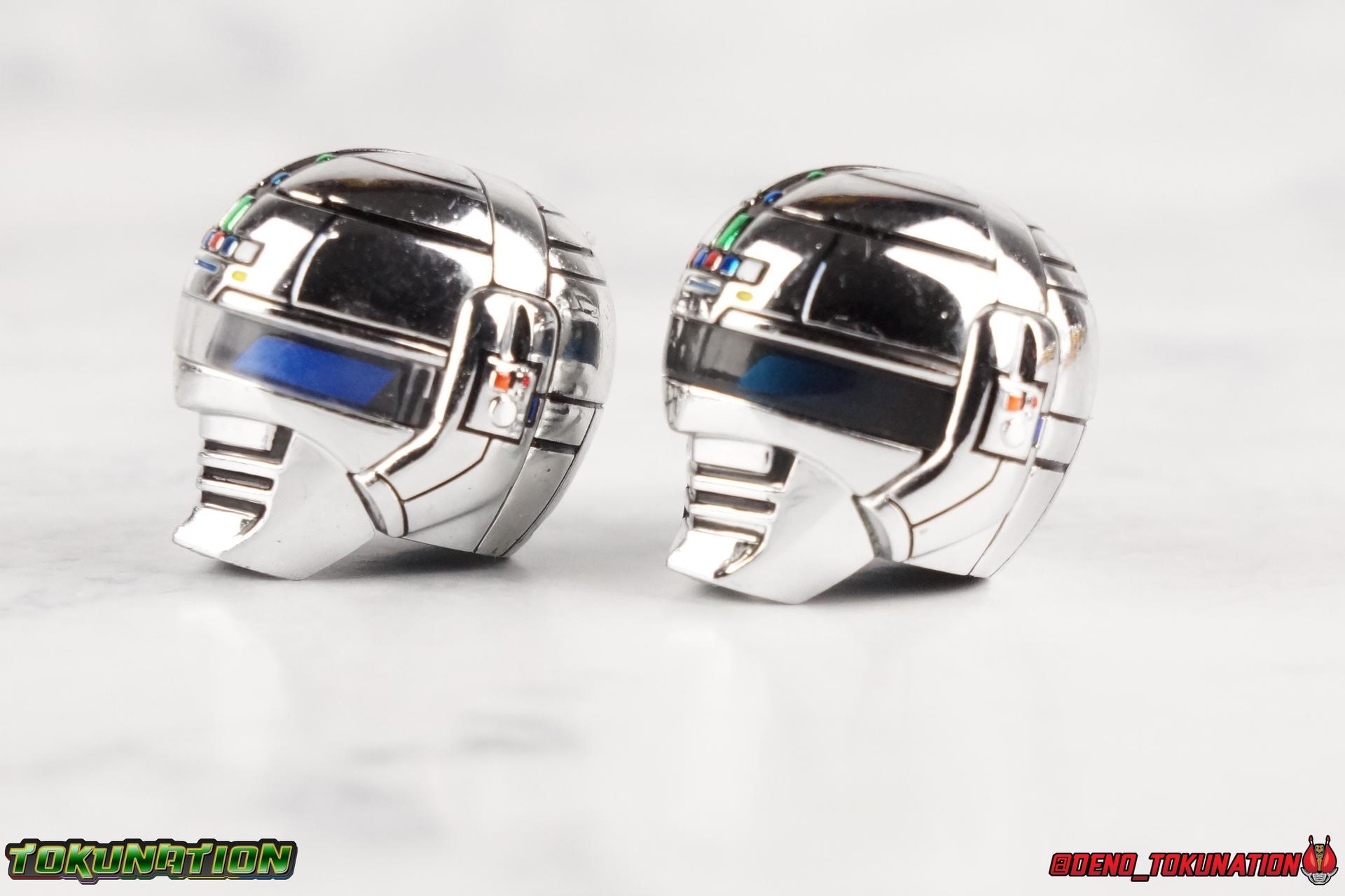 Over 4 years ago Tamashii Nations graced us with a pair of inaugural releases that launched the Metal Heroes sub-line for S.H. Figuarts. Back then we were treated to Gavan & his successor Gavan Type G. Now, during the new golden age of Metal Heroes it seems, Bandai is treating us to a pair of Renewals, one for each of these heroes! So today we're taking a look at the first of those released with S.H. Figuarts Space Sheriff Gavan Type G Space Squad Version! ** Physically this toy is very very similar to the original releases of Space Sheriff Gavan & Gavan Type G, though it's ostensibly meant to be a renewal of that mold. There are physical differences but the accessories and better paint apps are the most appreciable things you'll notice with this release. Just fair warning. Also, this gallery consists of 100+ images spread across the first 3 posts. So be sure to check out the whole thing! Packaging I actually really dig the new box that Bandai's come up with for Gavan Type G this time around. The first two Gavan releases both came in boxes that were themed around the original TV series aesthetic and each was partially color swapped to differentiate them from each other. This time it gets a bit more of a space theme going on thanks to the movie this release promotes. I just generally like it better to be honest. Main Figure So like I said up above, this mold is VERY similar to the original mold used for Gavan & Type G. In fact this one is simply a bit more thick and wide than that one. You'll notice wider hips, a more thick abdomen, a chest plate that sticks out a bit further, and just generally more clearance for these joints than the original had. But that's about it, ultimately these changes don't amount to a ton of appreciable improvements. So be forewarned this review will have many similarities to my old original Gavan gallery. Note that in comparison shots, the Space Squad version will be on the left with the original Type G on the right. Now with the statements I made above out of the way, I want to start by saying that this mold really is a great improvement over the original. It's not immediately something you notice, but more something that comes to mind as you handle it further. Starting at the bottom, the feet don't get a lot more clearance, so there isn't much to talk about there. The knees have the same old bends, but the hips are vastly improved. Not only are they stronger, no more sagging joints, but they have much more clearance for rotating than the old one. And that brings us up to the waist, where with the old one it was very gaunt and narrow, looking very awkward from the sides. This version beefs things up nicely enough to make it look like a real person is conceivably in there. And there isn't a ton of articulation lost either. By far the greatest improvement of the new Type G is the chest and head details. They are far more bright and elaborate, matching his appearance in Space Squad and in fact his first appearance in Gavan The Movie. I had never realized until now just how inaccurate the chest detailing on the first Type G was. Also you can see Gavan's "eyes" beneath the standard black visor quite a bit better. They should always be at least partially visible like this. Even when you aren't using the included laser scope head. So this release gets top marks for this as well. The head itself is a hair larger and more proportional to the body than the first release as well. Just adding to the overall improved look of this release over the original. I'll also mention that the arms aren't terribly different from the first one, though the shoulders seem to have much better clearance than before. But the hands, my god the best improvement is right there. You can actually change out the hands without fear of shearing off a razor thin wrist peg in the process, which happened with the first original Type G I owned and was very common throughout that production run. Ultimately this figure may not appear physically to be all that different. But in reality the small changes and differences made to it from the first release really are appreciable. I have to say I'm still fairly unsatisfied with the chrome applications this go around. While not inaccurate, the imperfections, scratches, and smudging to the chrome make it look like a used product. But all of these imperfections were present straight out of the box well. I wish Bandai would go with a more flat gray metallic paint app, like those on Juspion. But the reflective chrome is more accurate I suppose. A better application process needs to be used is all. Accessories This section is where the biggest differences between the the original release and the Space Squad one exist: 1 - Laser Scope head. This alternate head replicates Type G's visor lighting up as it does periodically. Originally an ability meant to allow classic Gavan to detect invisible monsters, it's since become synonymous with moments of either character powering up, or having showy flashy action. It's my preferred way to display this figure actually. I like how the eyes really pop. 3 - sets of additional hands. One set for weapon holding, one set of open palms, then a split pair that includes a flat karate chop style hand, and one with a set of two fingers pointing forward to recreate the Lazer Z Beam attack, or to hold the end of the Laser Blade. 1 - Laser Blade (Origin Version). A blade forged on Juspion's homeworld, one who can wield it properly is assured victory. This is the one weapon which sets apart this version from the original Type G release. That release came packed with the same classic Laser Blade that classic Gavan did. Both of the Gavan figuarts were packed with it. This new Origin version is a bit more ornate and elaborate in design. It's also the version of the Laser Blade that Geki/Type G is seen using in the Space Squad film after Mad Gallant destroys the original. So while the actual figuart itself may be similar physically to the 1st 