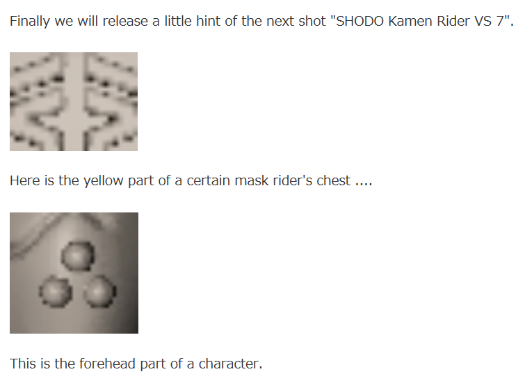 In this blog entry, Shodo VS wave 7 was officially announced, but not shown. However, two clues were given. Who could these be? I believe the first one is OOO's. It lines up with the Tiger Medal's eyebrows pretty much exactly. The second one, I've seen Leangle suggected and it seems likely, but I'm going to guess Kazari to go with OOOs. |