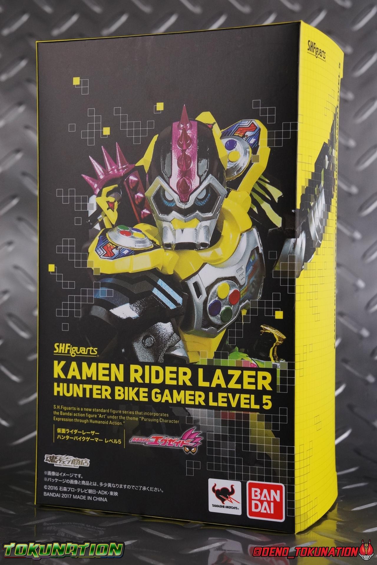 The last time we got to handle Kujou Kiriya it was in his excellent and unorthodox Rider Machine based Bike Gamer Level 2 form. Fans of Kamen Rider Ex-Aid will undoubtedly know that Kamen Rider Lazer finally received a humanoid rider suit when he attained the Giri Giri Chambara derived Level 3 form. And while that's definitely the figure many fans were hoping for, for now at least we've been treated to one step beyond that with this new release, S.H. Figuarts Kamen Rider Lazer Hunter Bike Gamer Level 5! This release gives us almost the full 4-player co-op team that defeated the Bugster Graphite. We still don't have a proper Fang Ex-Aid, but for the time being this looks to be the best we'll get. Let's jump in! Packaging Themed very similarly to Lazer Level 2's box, Level 5 has some bright, loud, packaging and I still really dig it. With no packaging window as all web exclusives are these days. As with the others the colors really pop and I like the character portrait on the front. That's about all there is to say on this one Main Figure A companion piece to Brave Level 5 & Snipe Level 5, Lazer Level 5 brings something old and a little something new to the table. This figure is predominantly new parts; the torso, upper legs, feet, head, all new. The arms and shins are reused from previous Level 5 releases of Ex-Aid, Snipe & Brave. Where Snipe & Brave each had one arm and leg from the Drago Knight Hunter Z armor, Lazer gets the matching set. Honestly this release is the first one in the line outside of Lazer Level 2 to really bring something truly new to the table though with the torso parts. For the leg components, Lazer Level 5 has his new clawed feet, which while a bit on the narrow side are actually pretty nice and stable. Despite the "Drago" in the name of this forms Gashat, these feet are carried over from the Level 3 form. Again the shin armor parts are reuses from the others, but the upper legs are all brand new. These thicker chunky thighs help sell this bulky form a bit bitter, and to their merit they work well. The issue comes up when you have to deal with the hip skirt armor. The armor is on a pair of ball joints when it should have been on side hinges, and they should have been hinged in the middle to allow greater movement in the legs. As you can see in my photos below, the skirt armor really knocks out a usable chunk of the leg motion that would allow this figure to be way more dynamic otherwise. While in this area, the Gamer Driver is still great even if the paint apps on mine are a bit shoddy this go around. The Driver handle can still flip shut. The functionality it features is still surprising. As with Brave & Snipe, Lazer has a "dummy" Drago Knight Hunter Z Gashat in addition to his own Bakusou Bike, both of which are removable. You can insert it as with any other Gashat into the Critical Finish slot on the Gashat Holster or a compatible Gashacon weapon. Speaking of the holster there's also what is meant to be the Level 3 Gir Giri Chanbara Gashat in the holster. As with with the others it's sparsely detailed and non-removable. The torso is by far where the most new work went into this figure. Where we had a lot of body part reuse with all the previous Ex-Aid releases, this torso is all new. Surprisingly, this torso is the best one in the line. The lower and upper halves of the body both have a really nice fluid range of motion and they don't really impact anything that hinders their movement. The backside of the torso has a new shrunken down version of the Level 1 form head as well as the Level 2 engine block. Excellent detailing as always even with paint that's a bit spotty this time. The actual head on the body is brand new though, but it's one we know we'll see again too. Both in show and toy form the Level 5 Lazer head is reused for his Level 0 Lazer Turbo form. The head feels about the right size with the bulk of this Level 5 body, and it should be just the right amount of over-sized for the Level 0 body. I'm really pleased with how that sculpt turned out. One negative to the upper body though, even though we have both of the improved Drago Knight arms from Snipe & Brave on this release, and even some nice hinged shoulder pads on top of them, the vestigial handlebars of the Level 2 form really get in the way. In fact I was worried I'd broken one when I moved the shoulder pad and it made a nasty click against the handlebar. Just be careful. Limitations aside I'm quite happy to have this form. I know plenty of people dislike it compared to Level 3, but I honestly don't like 3 or even 5 all that much. Lazer Turbo is where it's at for me. But it's only a matter of time before Lazer Level 3, the one everyone wants, happens. Now that we have the torso and most of the legs for it with Level 5, it would really be a no brainer to give us this one. Accessories Unfortunately, Lazer Level 5 only includes a few sets of hands. 4 sets of hands to be exact. Open excited hands, calm open palms, posed half pointing hands, and oddly, a set for holding weapons. They're perfect for handlebars or weapons like the Gashacon Sparrow that comes with GenM Level X. But Lazer Level 5 doesn't come anything they're useful for. And it's nearly impossible to get this figure up on Lazer Level 2 to ride it. I'm really baffled as to why this release didn't include the same plastic word bubbles that Snipe & Brave did. Those inclusions really helped sell those figures to me personally. Though I think it's fair to say that the nature of this figure being the only announced humanoid Lazer at the time, helped sell it in pre-orders. But it should have come with more. Anytime a figuart only includes extra hands, it's difficult to contain my disappointment. Final Thoughts All in all this is a pretty solid release taking some of what we've already seen and tossing something new into the mix to keep us interested.The neutered leg articulation is a real bummer, but Kiriya's personality still shines through with