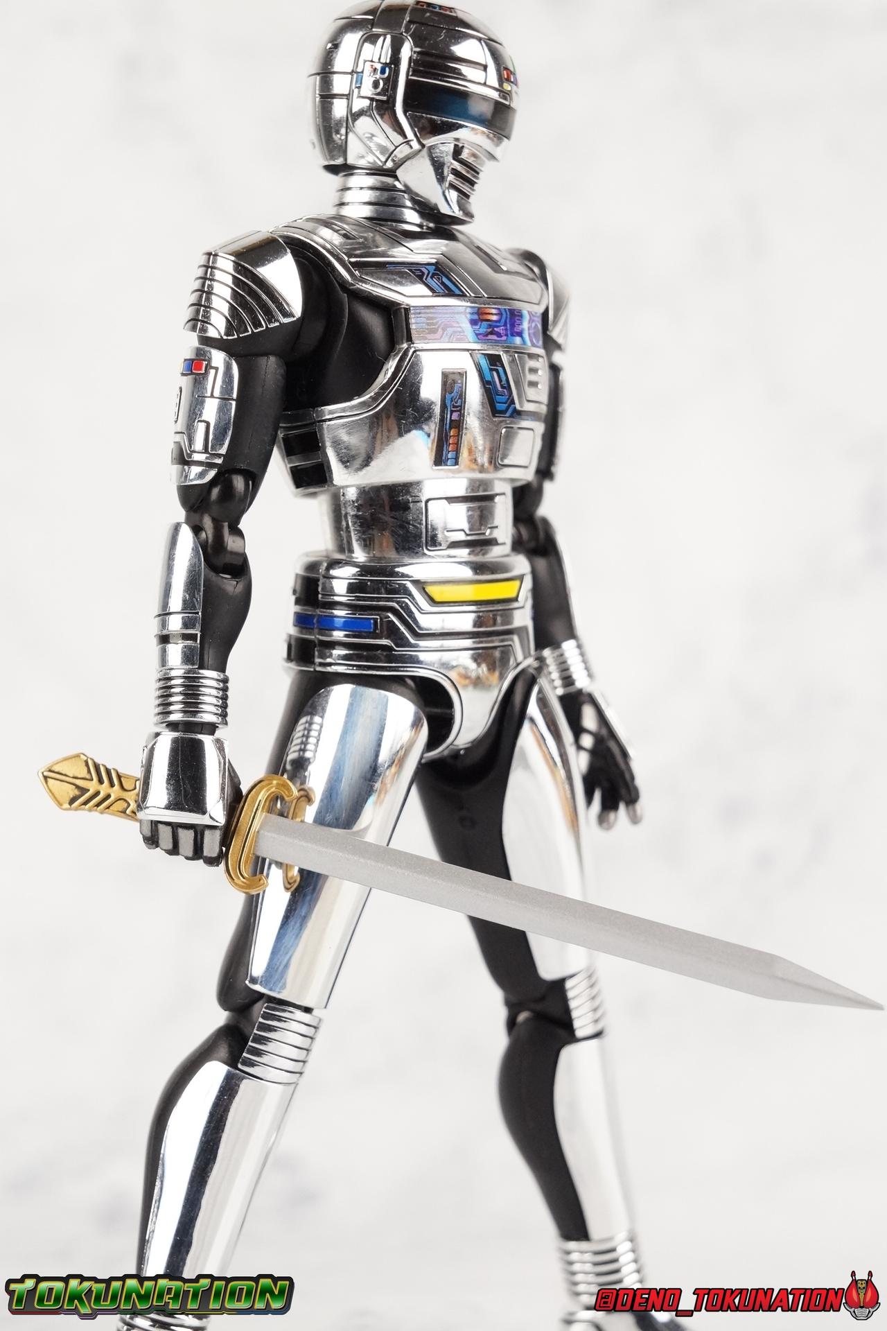 Over 4 years ago Tamashii Nations graced us with a pair of inaugural releases that launched the Metal Heroes sub-line for S.H. Figuarts. Back then we were treated to Gavan & his successor Gavan Type G. Now, during the new golden age of Metal Heroes it seems, Bandai is treating us to a pair of Renewals, one for each of these heroes! So today we're taking a look at the first of those released with S.H. Figuarts Space Sheriff Gavan Type G Space Squad Version! ** Physically this toy is very very similar to the original releases of Space Sheriff Gavan & Gavan Type G, though it's ostensibly meant to be a renewal of that mold. There are physical differences but the accessories and better paint apps are the most appreciable things you'll notice with this release. Just fair warning. Also, this gallery consists of 100+ images spread across the first 3 posts. So be sure to check out the whole thing! Packaging I actually really dig the new box that Bandai's come up with for Gavan Type G this time around. The first two Gavan releases both came in boxes that were themed around the original TV series aesthetic and each was partially color swapped to differentiate them from each other. This time it gets a bit more of a space theme going on thanks to the movie this release promotes. I just generally like it better to be honest. Main Figure So like I said up above, this mold is VERY similar to the original mold used for Gavan & Type G. In fact this one is simply a bit more thick and wide than that one. You'll notice wider hips, a more thick abdomen, a chest plate that sticks out a bit further, and just generally more clearance for these joints than the original had. But that's about it, ultimately these changes don't amount to a ton of appreciable improvements. So be forewarned this review will have many similarities to my old original Gavan gallery. Note that in comparison shots, the Space Squad version will be on the left with the original Type G on the right. Now with the statements I made above out of the way, I want to start by saying that this mold really is a great improvement over the original. It's not immediately something you notice, but more something that comes to mind as you handle it further. Starting at the bottom, the feet don't get a lot more clearance, so there isn't much to talk about there. The knees have the same old bends, but the hips are vastly improved. Not only are they stronger, no more sagging joints, but they have much more clearance for rotating than the old one. And that brings us up to the waist, where with the old one it was very gaunt and narrow, looking very awkward from the sides. This version beefs things up nicely enough to make it look like a real person is conceivably in there. And there isn't a ton of articulation lost either. By far the greatest improvement of the new Type G is the chest and head details. They are far more bright and elaborate, matching his appearance in Space Squad and in fact his first appearance in Gavan The Movie. I had never realized until now just how inaccurate the chest detailing on the first Type G was. Also you can see Gavan's "eyes" beneath the standard black visor quite a bit better. They should always be at least partially visible like this. Even when you aren't using the included laser scope head. So this release gets top marks for this as well. The head itself is a hair larger and more proportional to the body than the first release as well. Just adding to the overall improved look of this release over the original. I'll also mention that the arms aren't terribly different from the first one, though the shoulders seem to have much better clearance than before. But the hands, my god the best improvement is right there. You can actually change out the hands without fear of shearing off a razor thin wrist peg in the process, which happened with the first original Type G I owned and was very common throughout that production run. Ultimately this figure may not appear physically to be all that different. But in reality the small changes and differences made to it from the first release really are appreciable. I have to say I'm still fairly unsatisfied with the chrome applications this go around. While not inaccurate, the imperfections, scratches, and smudging to the chrome make it look like a used product. But all of these imperfections were present straight out of the box well. I wish Bandai would go with a more flat gray metallic paint app, like those on Juspion. But the reflective chrome is more accurate I suppose. A better application process needs to be used is all. Accessories This section is where the biggest differences between the the original release and the Space Squad one exist: 1 - Laser Scope head. This alternate head replicates Type G's visor lighting up as it does periodically. Originally an ability meant to allow classic Gavan to detect invisible monsters, it's since become synonymous with moments of either character powering up, or having showy flashy action. It's my preferred way to display this figure actually. I like how the eyes really pop. 3 - sets of additional hands. One set for weapon holding, one set of open palms, then a split pair that includes a flat karate chop style hand, and one with a set of two fingers pointing forward to recreate the Lazer Z Beam attack, or to hold the end of the Laser Blade. 1 - Laser Blade (Origin Version). A blade forged on Juspion's homeworld, one who can wield it properly is assured victory. This is the one weapon which sets apart this version from the original Type G release. That release came packed with the same classic Laser Blade that classic Gavan did. Both of the Gavan figuarts were packed with it. This new Origin version is a bit more ornate and elaborate in design. It's also the version of the Laser Blade that Geki/Type G is seen using in the Space Squad film after Mad Gallant destroys the original. So while the actual figuart itself may be similar physically to the 1st 