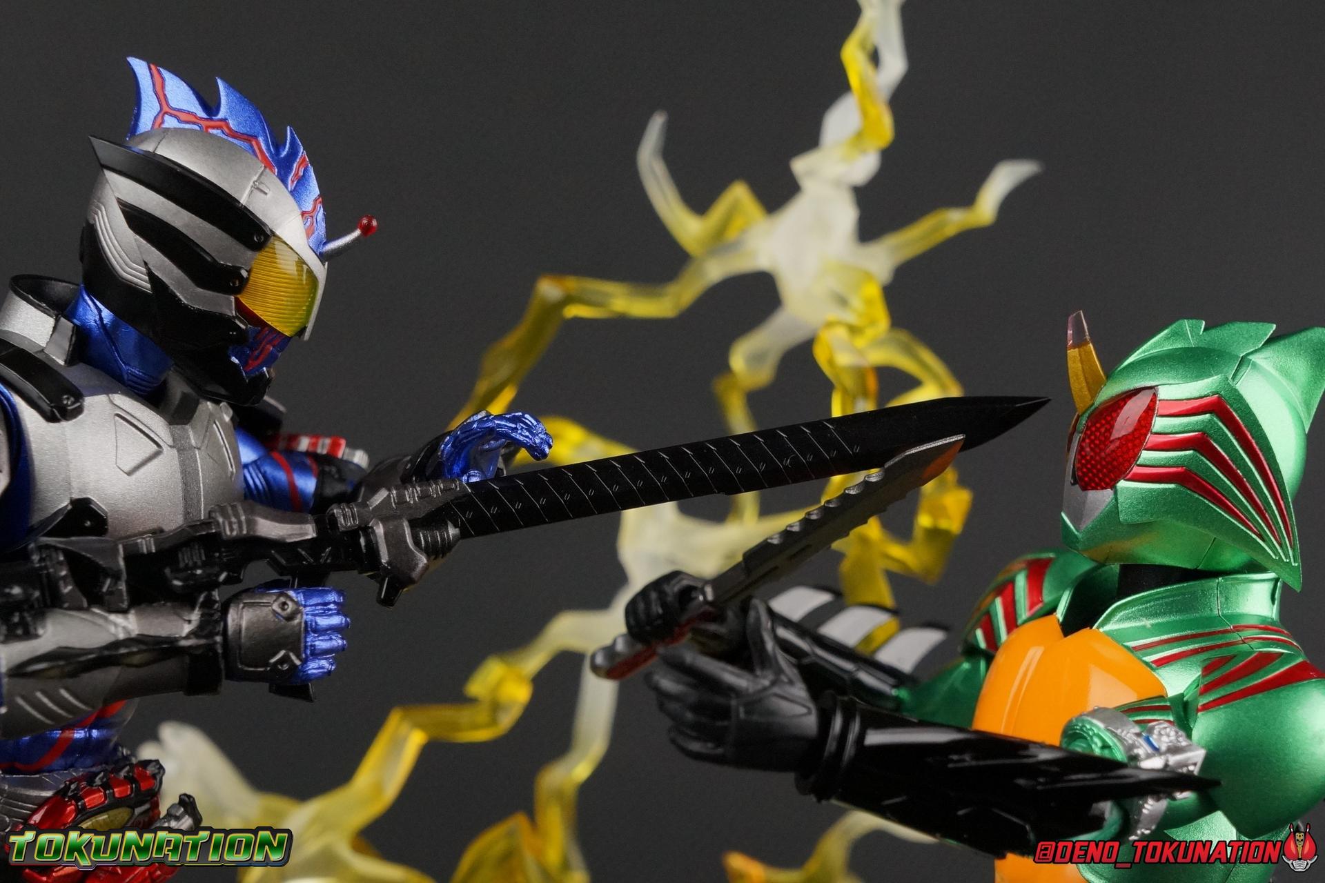 It took Chihiro most of his life to discover what he truly was, an Amazon. But not just any, he was the son of Jin Takayam, Amazon Alpha. He was also the Point of Origin for an entirely new generation of Amazons, the source of their Lysogenic Cells. A threat to all of humanity and other Amazons, Chihiro wanted to do the right thing, he also wanted to live as close to a normal life as possible with Iyu. But fate wouldn't allow that. Ultimately, Chihiro came to blows with his long lost father Jin as well as Amazon Omega Haruka Mizusawa. While it would seem the fates wouldn't allow Chihiro to live his days in peace, or even as the hero he thought he wanted to be, he at least went out a fighter standing his ground against the odds. Today we take a look at the first figuart based on this chaotic & torn character, S.H. Figuarts Kamen Rider Amazon Neo (Amazon JP Edition)! Packaging As with the previously released Amazon Japan Exclusive versions of Amazon Alpha, Amazon Omega, and even the original Showa Amazon, Neo comes in a brown corrugated style cardboard box that mimics an Amazon shipper. This box is also a bit larger than the standard retail release of Neo thanks to the included recolored flame effects. The nature of this material makes the stock photos quite hard to see, but I still like the gimmick of the packaging itself. Main Figures I want to preface this by saying I was not initially sold on this figuart. I just didn't wow me in official photos the same way the first Alpha & Omega figures did. Neo's design in show is great, but the colors were always washed out by the filter. But I'm happy to report that in figure form, Neo is exquisite. The metallic blue paint on the body seriously pops and the red accent lines are just the perfect shade of blood red. The matte gray and metallic silver parts are great compliments to one another as well. The paint work is really just fantastic on this figure. Now how functionality? Well, again, based on the official images I didn't expect much out of Neo. Both Alpha & Omega had things in their design that really bugged me. Things that neutered a bit of their articulation. And despite his bulky armored nature, Neo is a really free moving and well balanced figure. The ankles are unobstructed so you can get nice solid balance from them. Their forward motion is limited only by the bottom of the shin armor, but not terribly so. The knees are really perfect. Unlike with Omega where the leg fins limited the legs to 90 degree angles, Neo is free to move. Now I've never been a fan of the "old style" of drop down hips. I wasn't particularly excited for them with this figure because of how they break up the blue on the suit. But honestly they work really well here and don't detract from the figure nearly as much as I'd assumed they would. At the waist we have an exquisite sculpt and paint hob for the new Neo Amazons Driver. The compound eye on it is just gorgeous, it's my favorite part. I am disappointed that the Amazons Injector isn't removable or functional but that's a minor gripe. Now Neo's core body is way better than I'd anticipated. The upper body is engineered in such a way that it allows you to arch the back up and lean him forward for really savage and animal like poses, though it does expose a gap on his back side when done. The arms are free of most obstruction thanks to some great shoulder pad design, swivel biceps, and rotating forearm guards. My only real gripe with the arms is that the fist pegs are a little tight, and the left arm which features the Neo Amazons Register has difficulty keep a flame effect on because of said Register. My favorite part of the figure by far is the head. I always thought Neo's design was super interesting. As with all Amazons he's an organic creature, but his rider form encases him in technological armor. And if you seen the series it certainly plays into the inner demon part of his character. Suffice it to say the head communicates this better than any part of the figure as we can see his blood red compound eyes peeking out from behind the yellow visor, as well his jaw line. He looks like a caged beast, appropriately. I honestly can't get over how much better this figure is than I'd been expecting. It's just great all around. Accessories Neo comes with most everything in his repertoire: 2 - sets of extra hands. A bit on the lite side unfortunately. The included pairs give you two types of open hands, one set that looks a little more savage given Chihiro's nature. I am surprised not to see any "holding" hands for a future bike release or anything else. Most likely when Neo's Jungraider inevitably is released it will include the necessary hands. 1 - Amazon Injector. These seringe like items are used by Chihiro, and later Haruka, to activate their Neo Amazons Drivers. The one in the Driver is not removeable, and this accessory doesn't really serve much purpose to be perfectly honest. There isn't even a hand included that can hold it. 1 - Right Arm with Amazon Neo Blade. Rather than include the blade as a separate accessory that attaches to the arm itself, forgoing the difficulty of putting the grip in his hand. This forearm is actually pretty easy to replace and I appreciate this option rather than just a separate accessory. 1 - Set of Red Flame Effects. This set is a recolor of the popular Tamashii Flame Effects tailor made for Amazon Neo. Amazon JP versions of Alpha & Omega also included sets of flames. Alpha's were also red but with a white tint to them whereas Neo's have more of a pink tinge. Amazon Sigam as a Tamashii Web Exclusive also included flames colored purple. Not too shabby. These Amazon JP editions always please me because of the flames effects.I would have liked more hands, but the biggest miss here is that there is no Neo Hook included. It's a minor weapon compared to the blade, but I'd like to think it will be included with any extra hands, whenever Neo's Jungraider comes along. The same happened with
