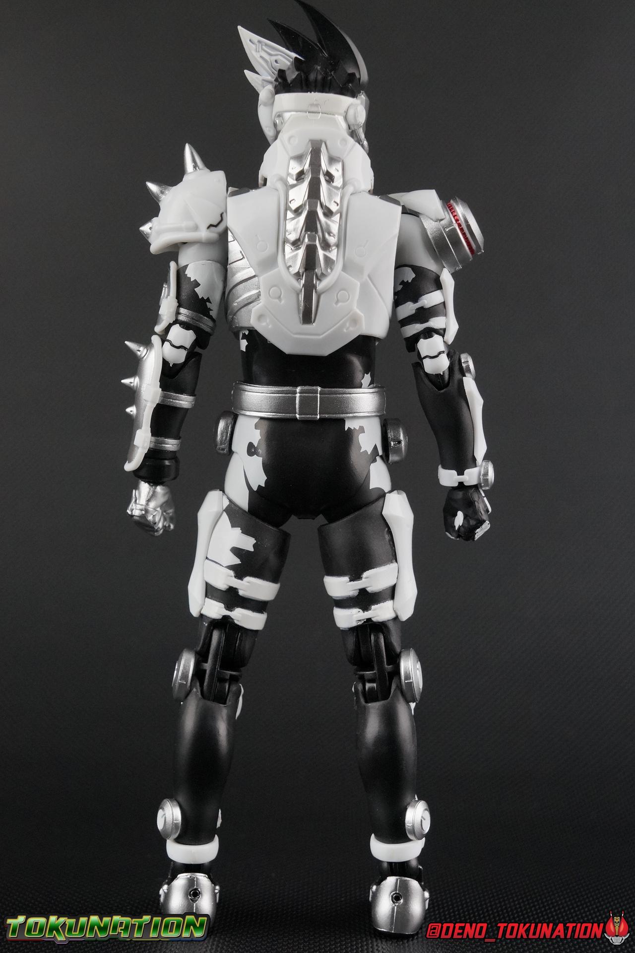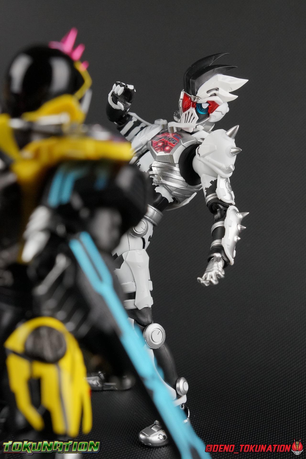 We've waited so very long for the one true hero to arrive. Finally, months after the end of Kamen Rider Ex-Aid, the first figuart of the one and only god himself Kuroto Dan has arrived! While Bandai has opted to go with (arguably) Kuroto's most popular and beloved form first, they did also just release his Level 2 Action Gamer form as a Tamashii Nations 2017 exclusive. Using the data of death, his own in fact, Kuroto Dan has become the Dangerous Zombie! This is our gallery of the excellent S.H. Figuarts Kamen Rider GenM Zombie Action Gamer Level X! Packaging GenM Level X comes in what is now standard packaging for Ex-Aid Web Exclusives. It's not nearly as right or loud, but it's a theme I still really dig. With no packaging window as all web exclusives are these days. As with the others the colors pop well and I like the character portrait on the front. That's about all there is to say on this one. Main Figure This figure was easily one of my most anticipated releases this year. The suit design for Level X is truly brilliant. It strikes the perfect balance of chaos and order as well as good an evil. Playing perfectly into Kuroto's nature and personality. This figure is an exquisite execution of the design. If you never immediately noticed this before, Zombie Gamer's design is very much based on a skeleton. It's easy to just see the black & white and not look at the finer details. But if you take a second glance, one of the most notable aspects of this is in the legs, where we begin. The shins themselves are actually bones. A majority of the rest of the design is more subtle, but I love how the shins look. I have a slight issue with how they protrude out just far enough at the bottom to mess with the forward motion of the ankles. I was able to get GenM into some very very precarious poses for this gallery. But it took an exorbitant amount of trial and error to do so. I will say I'm pretty disappointed in the quality of the paint work on the legs themselves though. The white bands around the hips and the black accenting them is very poorly applied on my copy, there almost appears to be a white haze over the black paint and several white flecks as well. GenM Level X marks the first instance of the Buggle Driver for Ex-Aid figuarts as well. It also marks a change in how Gashats are handled. The finer details of the Driver are a bit soft for my tastes, particuarly on the buttons on the front. But the paint work is really great, and the readout on the driver is very sharp.The Dangerous Zombie Gashat is very much like previous SHF Gashats, in that it is a dummy piece with just the handle and upper portion to plug into the Driver. However it is also substantially smaller than Gashats present in Gamer Drivers for reasons I don't understand. I tried recreating GenM Level 0X at the tail end of this gallery using Ex-Aids Drivers so you should be able to see the size difference. Of note, you can't just create Level 0X by doing this swap. Standard Level X's Rider Gauge is totally different. Speaking of the chest, the details on the Rider Gauage are actually really really nice. Bandai's label work has massively improved since the old Kiwami Arms debacle. Every Ex-Aid rider so far has had really crisp Rider Gauges and GenM Level X is no different. I particularly like the two bars just under the neck of the figure that simulate clavicle bones as well. These are actually hinged to move for some reason, but they never really get in the way of anything. On the flip side of the torso I am in LOVE with the details for GenM's spine. They just sell that skeletal nature of the design all that much more. GenM's arms are about as standard as you can get, Nothing too terribly special, the paint work is much nicer than the legs thankfully. The right shoulder pad bugs me just enough because it's easy to pop off the joint. But that's a minor gripe. Finally, that, head. That absolutely gorgeous sculpt. That broken visor and exposed eye. Bandai nailed that headsculpt perfectly. Being able to arch the head back or crane it over tot either side again helps sell the maniacal nature of this form. Overall GenM has very standard articulation as well, with just enough extra play in the joints to pull off some great menacing zombie poses very reminiscent of what we saw in the TV series. Accessories Kuroto comes with the perfect accessories to remind you of just how evil he was at an early point in the series: 5 - sets of additional hands. I love how the right hands have that skeletal paint work on the back of them. I honestly never noticed it til I had this figure in hand and I just LOVE little details like that. I think some of these sets could look a little more menacing and expressive but they do get the point across of who and what Dan was at this point in his (first) life. There's a few pairs of open hands in various poses as well as two pairs to hold the included weapons in either mode. 1 - Gashcaon Sparrow. The trademark weapon of Kamen Rider Lazer Level 3, and later his Lazer Turbo form. This was a trophy that Dan kept for himself after he killed Kiriya. The fact that this accessory is included with the GenM figuart instead of an actual Lazer one is just deliciously satisfying. The two halves can plug together in the middle by way of a small white tab. This hardly ever works on mine. It's a terrible part fit so the two halves constantly force each other apart, so that's frustrating. Alternatively the two can be held in the Sickle Modes instead. That's it for accessories but that's honestly perfect. The pipe dream would have been to include a Gamer Driver and Gashacon Breaker for GenM Level 0X. But the chest gauge would have had to be different as well. So that's understandable. I expect to see Level 0X released fully on it's own at some point as well. Final Thoughts I, like many collectors, heavily anticipated the release of this figure. Kuroto Dan is to many myself included, easily the most memorable and interesting ch