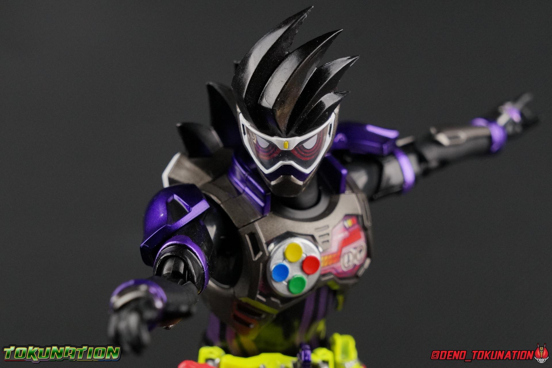 At long last, Kuroto Dan arrives in his original form! While we previously took a look at the exceedingly popular Level X/Dangerous Zombie release, now we have him as he was first presented in his Level 2 form! This figure, oddly, came out as a Tamashii Nations 2017 exclusive. While this was clearly done because of it's nature as a very simple repaint, as has been the trend with event exclusives of years past, the characters' immense popularity made this a less than ideal situation. In light of this Tamashii opted to make this figure available as a Lucky Draw Web Exclusive item at a later date as well, with the caveat that it would not include the Shakariki Sports bike. So of course I had to have this more complete version. So let's take a look at S.H. Figuarts Kamen Rider GenM Action Gamer Level 2 & Shakariki Sports! Packaging Now THIS is something interesting. Event exclusives have had some great box art over the last few years. See Dark Kabuto, Proto-Drive & Lemon Energy Baron. This year however, Tamashii Nations has gone over the top for their 10th anniversary. GenM comes packaged in a special 2-box slipcase set. The outer slipcase in mint green has a fantastic stock photo of the figure and bike that I think looks really sharp. The inner packaging is two separate boxes, one containing GenM, and one containing the Shakariki bike. GenM's box is identical to what we we'll see with the Web Exclusive release coming next year and fits in line with the rest of the toyline perfectly. The Shakariki bike comes in a separate purple monotone box that I really like. It reminds me of the way the Tires & Effect bonuses were packaged for Kamen Rider Driver, though obviously on a larger scale this time. Main Figure We're back once again with a mold we know all too well! The original Ex-Aid mold has been used as a basis for a majority of figures in the line so far including Ex-Aid himself as well as Snipe, Brave, their upgrades, and the Mighty Brothers. But very specifically the figure we're looking at today, Genm Level 2, is a 100% repaint of Ex-Aid Level 2 with no physical alterations whatsoever. GenM is a pretty lavish repaint of this original mold, and a dead sexy one. But the physical portions of this review will be a carbon copy of what I wrote for Ex-Aid. Feel free to skip down a bit if you like. GenM Action Gamer Level 2 utilizes the familiar Mighty Action X body type we've come to know and love. Bringing with it all the meticulous molded details and paint apps we've previously seen before. TMuch as with Ex-Aid, this figure is just lavishly executed. From the Ground up this body type is a sold build. Physically I still nitpick the ankles on this mold, they still feel a bit limited, especially moving forward. And getting GenM into a good pose is a total necessity for his character. So you really have to work with these feet. The knees have a great bend that helps add to the general athletic platformer theme of the figure. Sadly, as with GenM Level X, I find the paint apps on the legs, and in several other places to be a bit sloppy. There are plenty of flecks on the thighs and minor defects that are an annoyance on an expensive event exclusive such as this one. The Gamer Driver for this figure is the same standard one we've seen close to 10 times now. I still think it's an incredible to-scale replica. The appropriate readout and Game title have been added to this release. The Driver handle can flip shut, thus hiding the rider read out on the front screen as well. The right of the driver has 2 slots for Gasshats. One is already attached in the form of the Proto-Mighty Action X Gasshat. As is standard this is a dummy Gashat that can be reattached to any compatible Driver, holster, or Gashacon weapon. To the right of the driver, is a Gashat holster. There are 2 slots for extra Gasshats as well as 1 slot for a Critical Finish to be inserted. As with Ex-Aid, GenM's chest detailing is magnificent. And unlike the Mighty Brothers the interior label used for the Rider Gauge is flawless. The paint apps on the outer layer are crisp and clear here for the most part as well. I should point out that much like Brave having an incorrectly colored collar piece, GenM too is wrong. His shoulder/collar area should be purple but has instead been left silver. On the flip side of the torso is the deactivated Level 1 head. It's a bit stylized and shrunk down, but that's as it should be if TV CG magic could really work in toy form. Not to be forgotten are the arms, which admittedly only have one flaw that I'm truly bothered by, and that's the shoulder pads. Not because they impact the articulation, but because they pop off easily when fully extending the arms. I had the same problem with my Ex-Aid though oddly not with the Mighty Brothers. But it's a minor issue. The wrists are solid, the elbows fully functional and the bicep swivel welcome as always. Finally that brings us to the head. This is where the most egregious paint issues are present. The white paint used for the visor is just pitifully applied. Lot's of hazy overspray around the edges and a ton of flecks on the visor itself. The "hair" of the helmet likewise has a number of white flecks that really detract from it's overall look. Otherwise I think the shape of the head is generally great, and the hair looks very solid. Lots of people took issue with this head on the original Ex-Aid release, but I've always thought it looked spot on. Accessories 4 - set of hands. 3 varieties of open palm hands and 1 set for holding things, weapons or bike handles. 1 - set of Gashacon Bug Visor parts. This accessory is actually split into a few pieces though out of box it comes in the Chainsaw Eliminator mode. Although the saw form is not the standard mode of the weapon. The Bug Visor itself is just a plate in the center that makes up most of the mass of the accessory. It's attached to a long board with the saw extended on one end. The EXP Grip Knuckle is likewise a separate pa