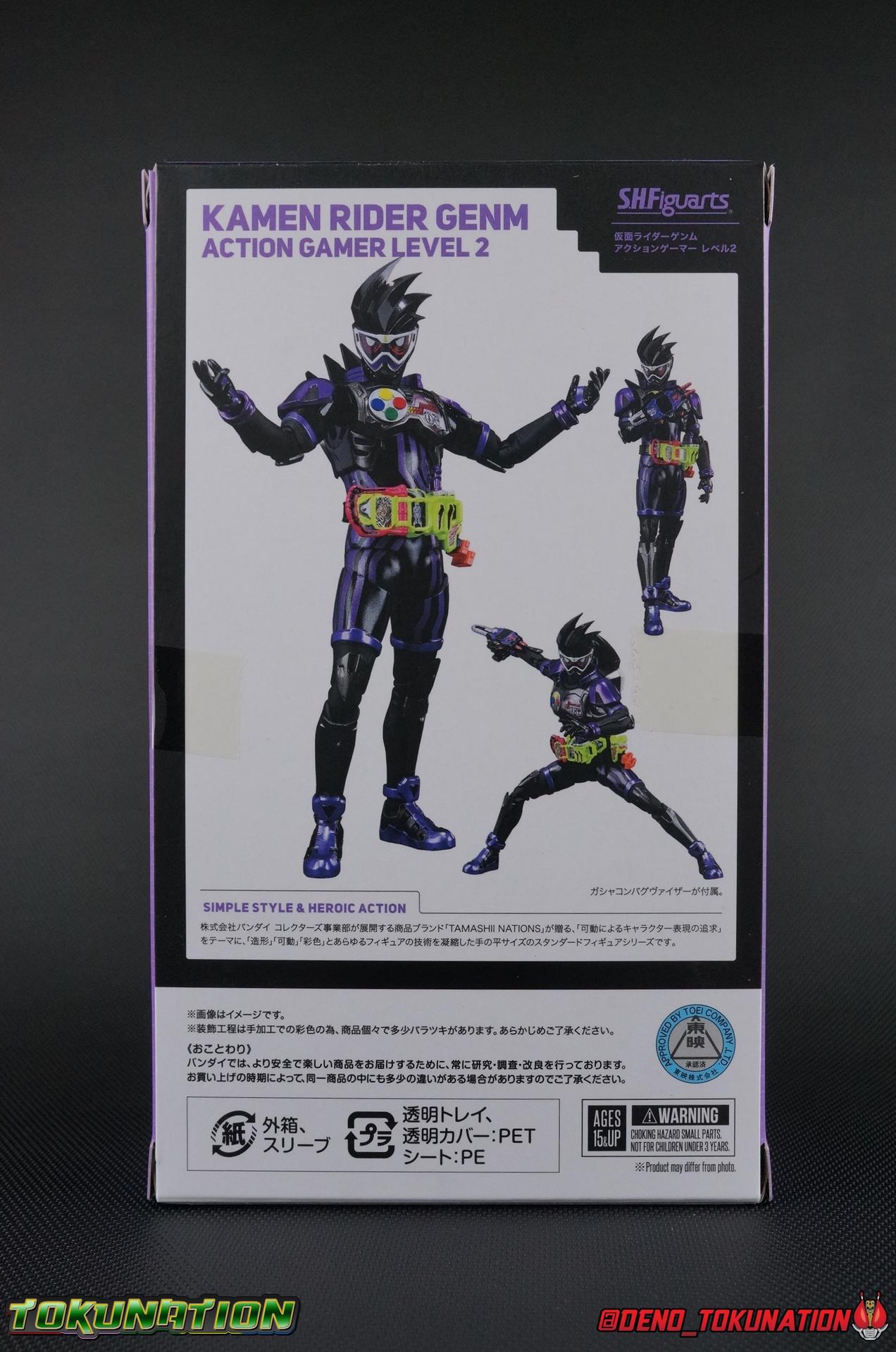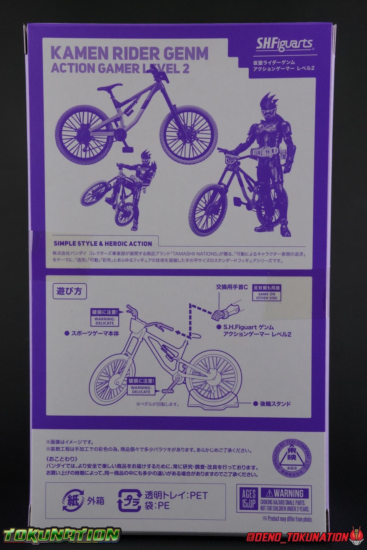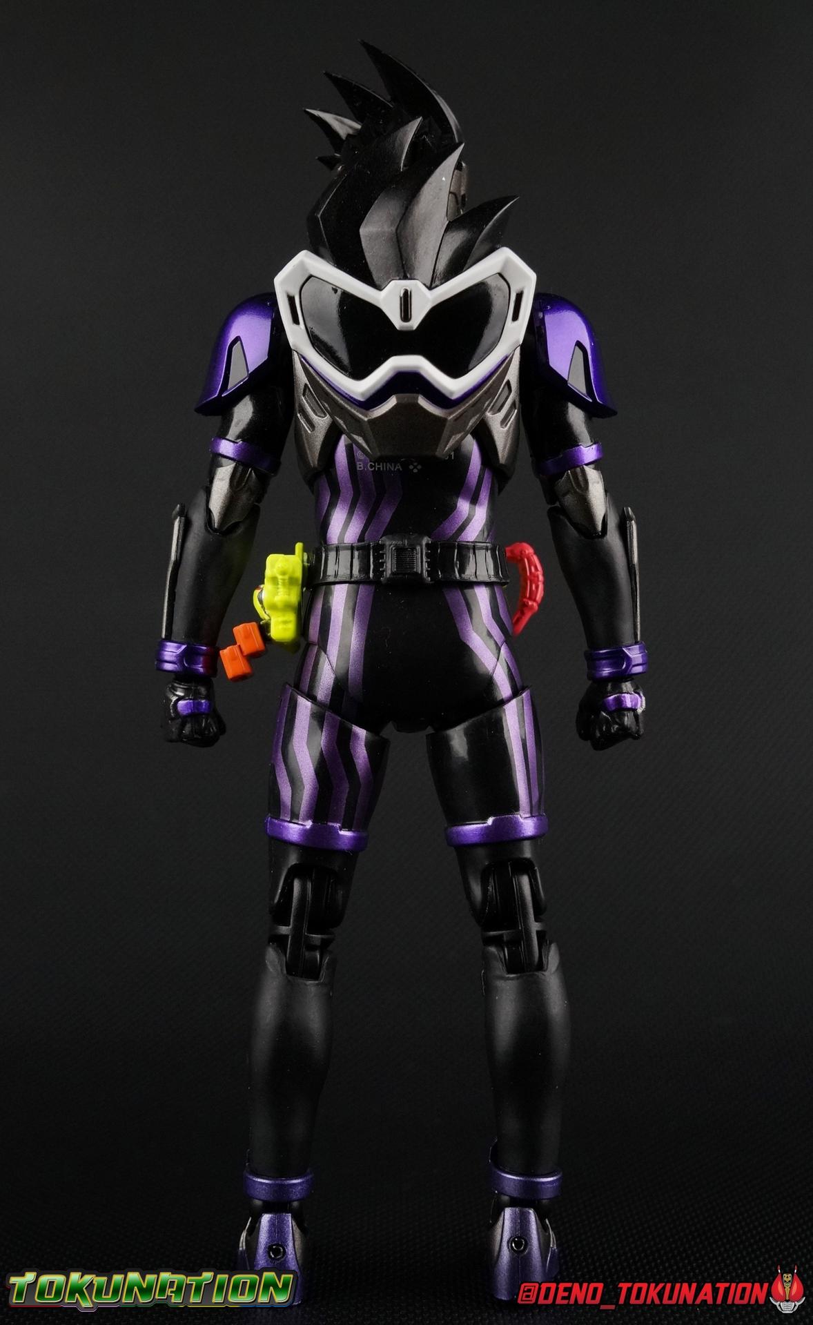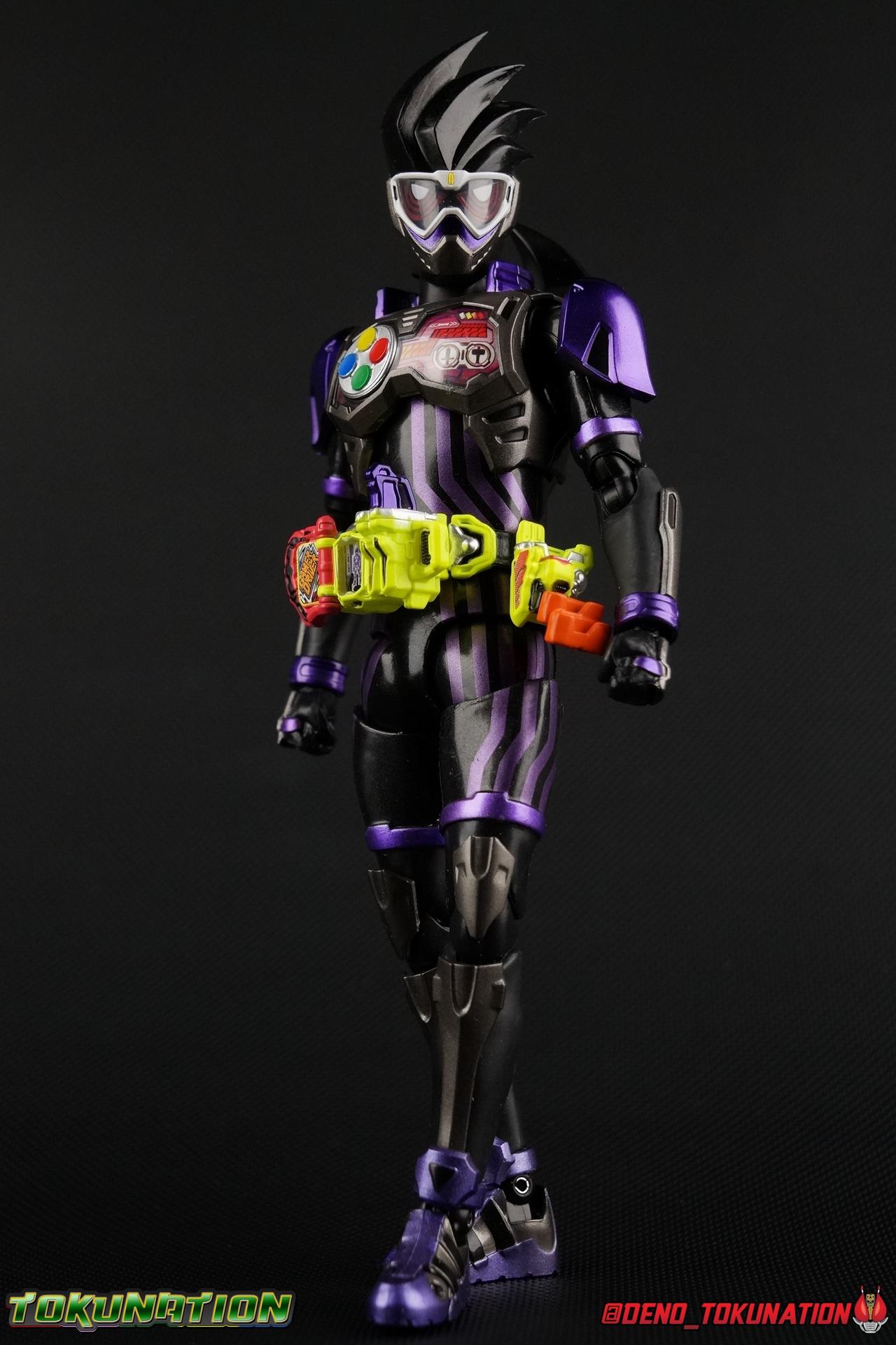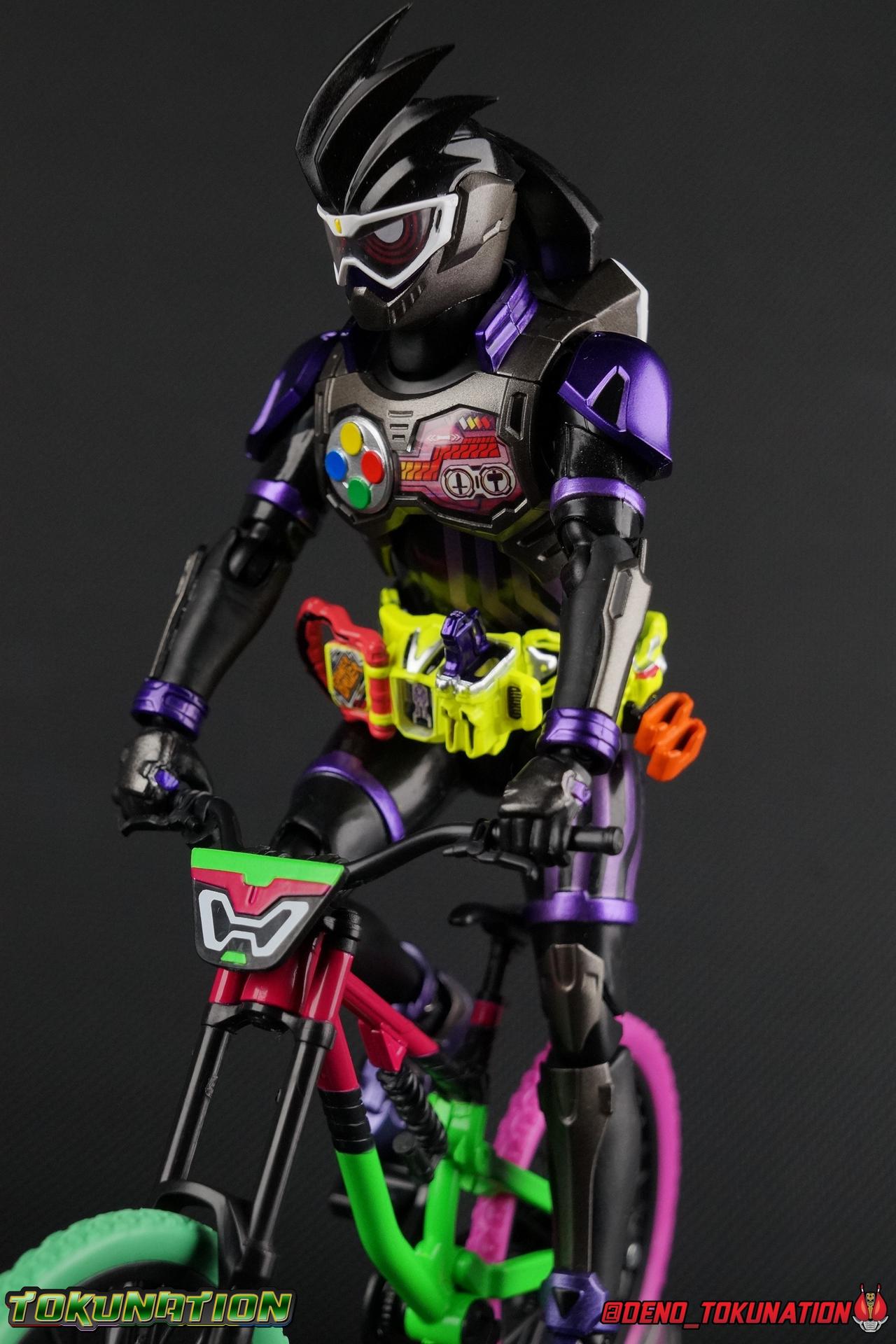 At long last, Kuroto Dan arrives in his original form! While we previously took a look at the exceedingly popular Level X/Dangerous Zombie release, now we have him as he was first presented in his Level 2 form! This figure, oddly, came out as a Tamashii Nations 2017 exclusive. While this was clearly done because of it's nature as a very simple repaint, as has been the trend with event exclusives of years past, the characters' immense popularity made this a less than ideal situation. In light of this Tamashii opted to make this figure available as a Lucky Draw Web Exclusive item at a later date as well, with the caveat that it would not include the Shakariki Sports bike. So of course I had to have this more complete version. So let's take a look at S.H. Figuarts Kamen Rider GenM Action Gamer Level 2 & Shakariki Sports! Packaging Now THIS is something interesting. Event exclusives have had some great box art over the last few years. See Dark Kabuto, Proto-Drive & Lemon Energy Baron. This year however, Tamashii Nations has gone over the top for their 10th anniversary. GenM comes packaged in a special 2-box slipcase set. The outer slipcase in mint green has a fantastic stock photo of the figure and bike that I think looks really sharp. The inner packaging is two separate boxes, one containing GenM, and one containing the Shakariki bike. GenM's box is identical to what we we'll see with the Web Exclusive release coming next year and fits in line with the rest of the toyline perfectly. The Shakariki bike comes in a separate purple monotone box that I really like. It reminds me of the way the Tires & Effect bonuses were packaged for Kamen Rider Driver, though obviously on a larger scale this time. Main Figure We're back once again with a mold we know all too well! The original Ex-Aid mold has been used as a basis for a majority of figures in the line so far including Ex-Aid himself as well as Snipe, Brave, their upgrades, and the Mighty Brothers. But very specifically the figure we're looking at today, Genm Level 2, is a 100% repaint of Ex-Aid Level 2 with no physical alterations whatsoever. GenM is a pretty lavish repaint of this original mold, and a dead sexy one. But the physical portions of this review will be a carbon copy of what I wrote for Ex-Aid. Feel free to skip down a bit if you like. GenM Action Gamer Level 2 utilizes the familiar Mighty Action X body type we've come to know and love. Bringing with it all the meticulous molded details and paint apps we've previously seen before. TMuch as with Ex-Aid, this figure is just lavishly executed. From the Ground up this body type is a sold build. Physically I still nitpick the ankles on this mold, they still feel a bit limited, especially moving forward. And getting GenM into a good pose is a total necessity for his character. So you really have to work with these feet. The knees have a great bend that helps add to the general athletic platformer theme of the figure. Sadly, as with GenM Level X, I find the paint apps on the legs, and in several other places to be a bit sloppy. There are plenty of flecks on the thighs and minor defects that are an annoyance on an expensive event exclusive such as this one. The Gamer Driver for this figure is the same standard one we've seen close to 10 times now. I still think it's an incredible to-scale replica. The appropriate readout and Game title have been added to this release. The Driver handle can flip shut, thus hiding the rider read out on the front screen as well. The right of the driver has 2 slots for Gasshats. One is already attached in the form of the Proto-Mighty Action X Gasshat. As is standard this is a dummy Gashat that can be reattached to any compatible Driver, holster, or Gashacon weapon. To the right of the driver, is a Gashat holster. There are 2 slots for extra Gasshats as well as 1 slot for a Critical Finish to be inserted. As with Ex-Aid, GenM's chest detailing is magnificent. And unlike the Mighty Brothers the interior label used for the Rider Gauge is flawless. The paint apps on the outer layer are crisp and clear here for the most part as well. I should point out that much like Brave having an incorrectly colored collar piece, GenM too is wrong. His shoulder/collar area should be purple but has instead been left silver. On the flip side of the torso is the deactivated Level 1 head. It's a bit stylized and shrunk down, but that's as it should be if TV CG magic could really work in toy form. Not to be forgotten are the arms, which admittedly only have one flaw that I'm truly bothered by, and that's the shoulder pads. Not because they impact the articulation, but because they pop off easily when fully extending the arms. I had the same problem with my Ex-Aid though oddly not with the Mighty Brothers. But it's a minor issue. The wrists are solid, the elbows fully functional and the bicep swivel welcome as always. Finally that brings us to the head. This is where the most egregious paint issues are present. The white paint used for the visor is just pitifully applied. Lot's of hazy overspray around the edges and a ton of flecks on the visor itself. The "hair" of the helmet likewise has a number of white flecks that really detract from it's overall look. Otherwise I think the shape of the head is generally great, and the hair looks very solid. Lots of people took issue with this head on the original Ex-Aid release, but I've always thought it looked spot on. Accessories 4 - set of hands. 3 varieties of open palm hands and 1 set for holding things, weapons or bike handles. 1 - set of Gashacon Bug Visor parts. This accessory is actually split into a few pieces though out of box it comes in the Chainsaw Eliminator mode. Although the saw form is not the standard mode of the weapon. The Bug Visor itself is just a plate in the center that makes up most of the mass of the accessory. It's attached to a long board with the saw extended on one end. The EXP Grip Knuckle is likewise a separate pa