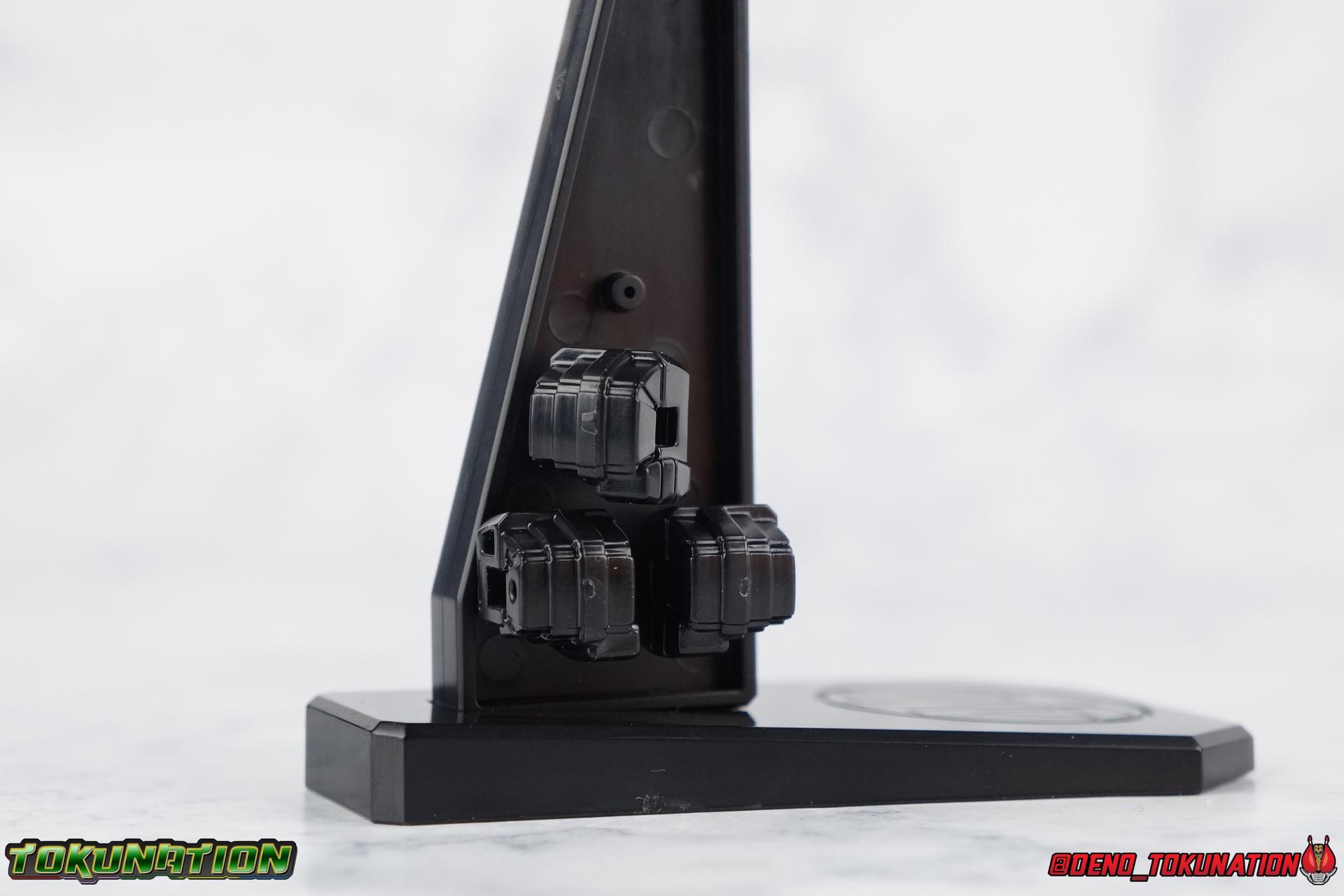 Either of the names Sky Machine or Jet Falcon are acceptable and they've been used interchangeably by Bandai over the years to refer to this machine. The Super Minipla packaging uses the name Sky Machine though so for consistency I'll be using that from here on. I won't be focusing on describing the process to build this figure so much as just it's functionality as an individual once built. I've included extensive step by step photos to build each of the 3 machines so hopefully that should do a better job of explaining the building process than I could. Now like I said in the first post, these Super Minipla are a lot more complex than what customers of the old line have become accustomed to. That means a larger number of parts and a more complex build. However it ALSO means fewer stickers. Because of the line's more collector oriented nature it means that some parts come pre-painted from the factory for you! Often Minipla collector's either choose to paint certain parts (or entire kits) or in order to get that little bit of accuracy that was missing they have to. Thankfully with this line Bandai is opting to paint relevant parts that otherwise be very difficult to sticker up, for you. In Sky Machine's case that means you get both halves of the Jet's bird face as well as the combined Live Robo head. There is a small sticker sheet included to finish detailing up this bad boy, much of which gets applied to the wings and back plate. Sky Machine by far needs more stickers than the other two components but just get yourself some fine tipped tweezers and you'll manage. On it's own the Sky Machine doesn't do much honestly. The tail fins and wings do move, though that's more a by-product of it's transformation than any thing else. The figure actually does have extending bird talons it can stand on too. The grey chunks that become the Live Robo's thighs in combined mode have caps on the end that can be removed, when done you can extend these bird legs out. Though they don't serve a ton of purpose, you have to lean Sky Machine pretty far back to make use of them. However, this piece of the set also includes the parts to make a Display Base! This simple single arm base does wonders for displaying any of the 3 Machines but is primarily meant for Sky Machine. It's a simple plug type base with no poseable arm, but each of the 3 machines has a port that fits it. A port that is also the same size as a Tamashii Stage arm, so you have options. Thankfully the Live Robo Base also has peg hole storage on the side to store the extra fists that come with Land Machine.