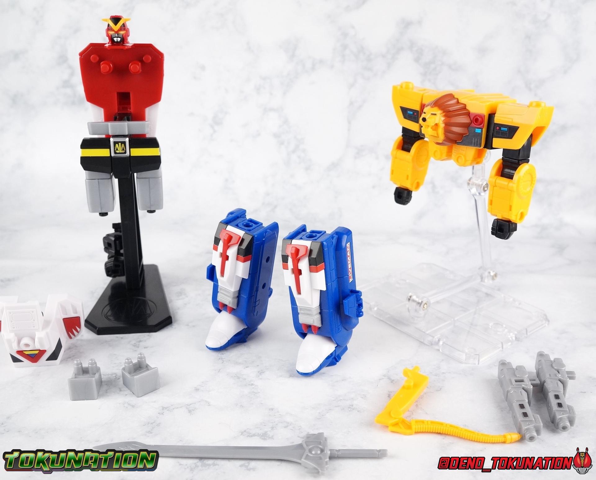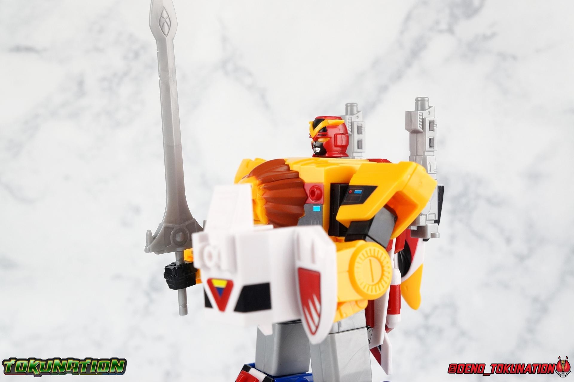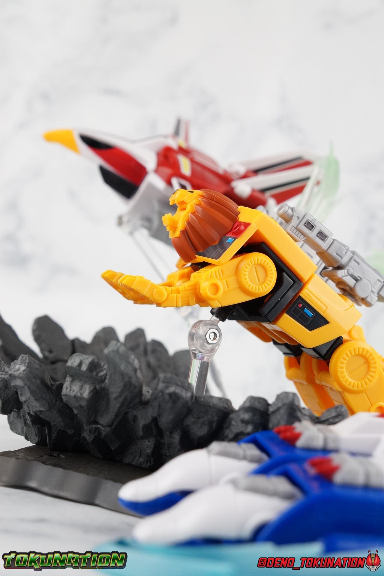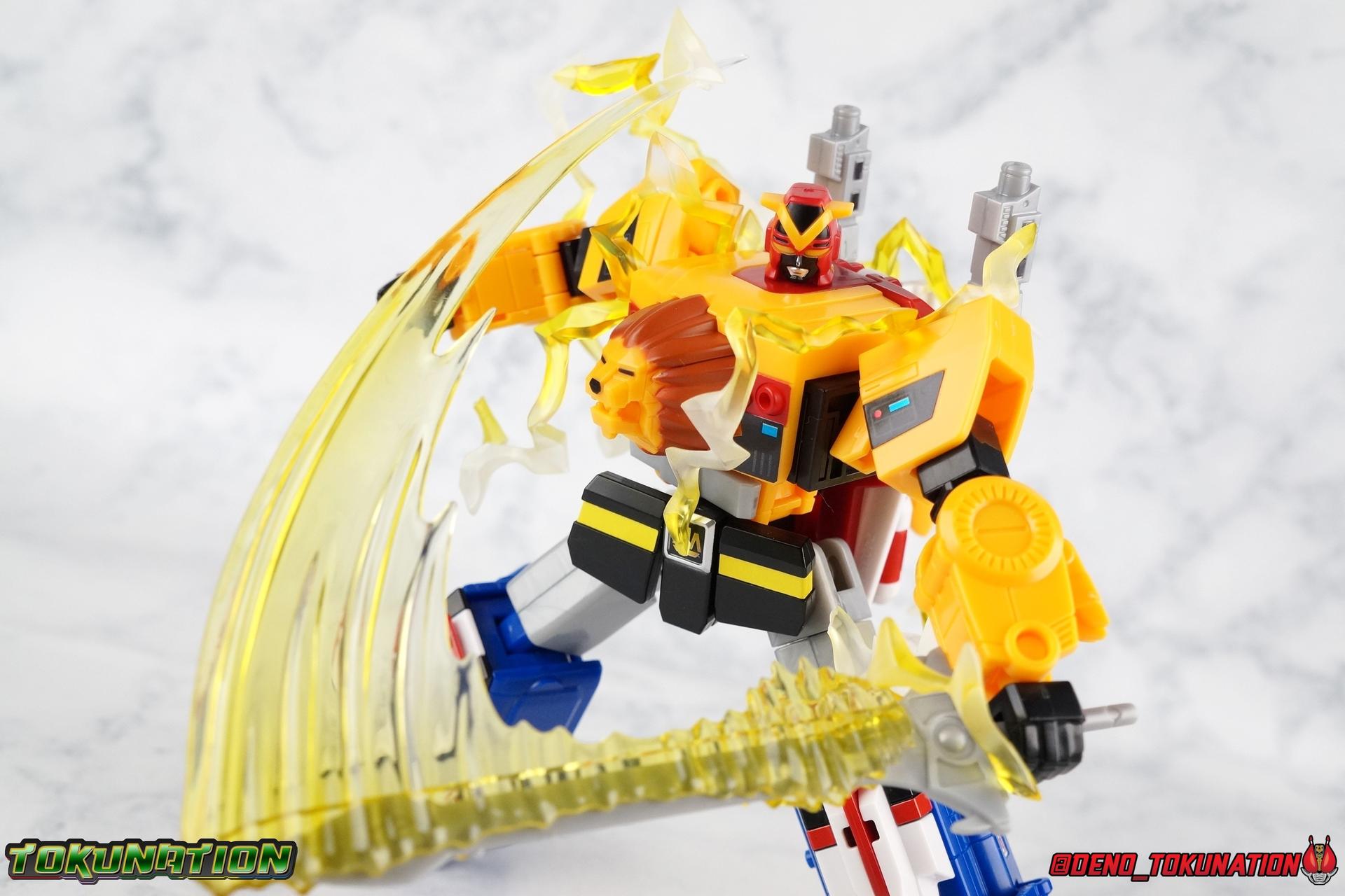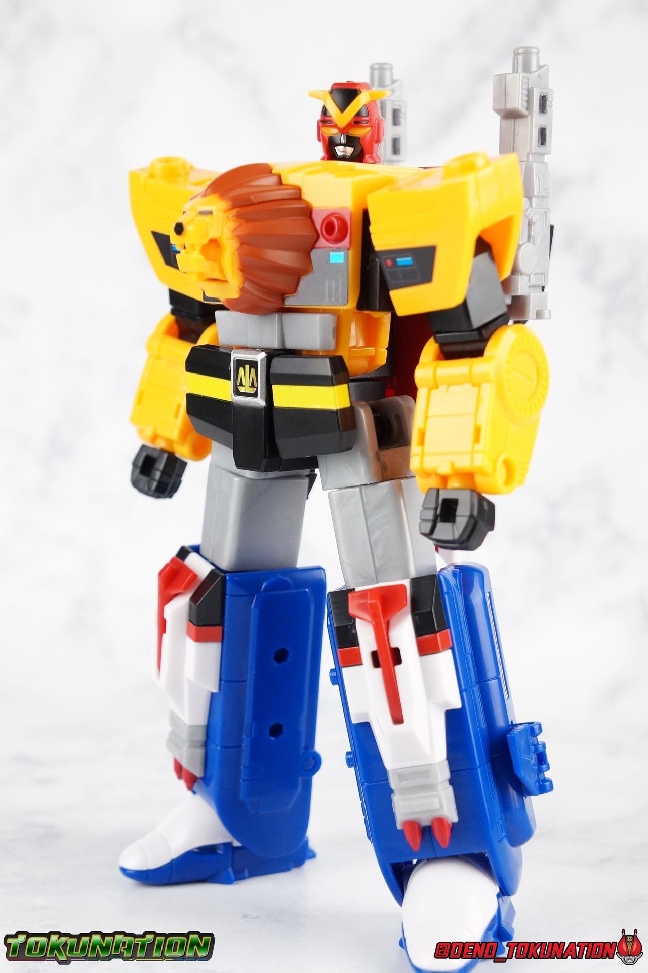 Now for the main event, Live Dimension! By far the greatest strength of the Super Minipla line is it's ability to recreate combined robots so excellently. You get a great functional toy with some fantastic proportions and accessories. Unlike many minipla of the past, you can also get around most part swapping for the transformations. In Live Robo's case, a mere 3 parts are removed and totally set aside for this transformation. Only the plugs that cover the knee plugs on Sky Machine and the tail from Land Machine are left over in the end. I've included step by step photos to show you how to get from each individual machine into the parts you need. While I think those images can speak for themselves I do want to mention a couple of fascinating things about the combination that I love. First, the way the lower half of Sky Machine slides down to accommodate the Land Machine chest, then slides back up to lock it in place and hide Land Machine's front legs just blows my mind. Likewise the way in which Land Machine's legs rotate out on that shared black joint within the chest is just incredible to me. The way it moves is just so fluid it's hard to believe this is a minipla. Once you've assembled Live Robo, you have one hell of a fun little figure. Without getting into the weapons yet, Live Robo is a great and poseable action figure in it's own right. The feet have side tilting joints thanks to how the feet are built, while the ankles can tilt forward and back too. Because of the nature of joints in the thighs we also get a nice knee joint connected to Aqua Machine that extends out it's main body. Then there's a mid-thigh swivel as well as a rotating hip joint. Now the hips are TIGHT, scary forceful on my Live Robo. Just be wary. All of this adds up to some extraordinary articulation in the lower body. This thing can stand on one leg with the other wrapped around it's back even. Despite it's complicated assembly even the torso can rotate pretty freely. The shoulders are each on a sort of butterfly joint that allows them to move very high up (at the cost of looking a bit inaccurate) but the arms can also swing out quite wide. Now for my one big complaint, the elbows have almost no range. Mostly because they have to accommodate the way the lion legs transform, they can only rotate forward about a quarter turn before they impact the opening forearm panel. The rotating biceps and fists can help alleviate some of this but it's still imperfect. Finally the head is on a small but useful balljoint that allows it to move a lot more than it appears at first glance. Able to spin around completely and angle up or down just a bit goes a long way to helping create personality for this mecha. Now for weapons. Live Robo comes with a shield formed from Sky Machine called the Live Shield. A square peg on the handle allows it to fit snugly into either hand of the Live Robo and it's hinged to pose it out of the way. We also get the mighty Chojuken or Super Beast Sword. Oddly this accessory isn't painted nor are there stickers included for it so the hilt remains in accurate. I don't paint or panel line or do anything outside of what the stock instructions give me for model kits. I like to straight build everything, that's just the way I am and I'll always be. If you've ever seen Gundam Build Fighters, think of me like Straight Build Shimon. I don't feel like I should have to recreate missing details they should simply be there, and I'm not particularly good at it either. So these little inaccuracies are frustrating, but not deal breaking. Final Thoughts Super Minipla is a revolutionary toyline for Super Sentai. As someone who typically collects DX toys, Robot Damashii, S.H. Figuarts, and Chogokin type figures, I was not prepared to be up for another toyline. But the chance to own a classic design like the Live Robo in an affordable way was something I couldn't pass up on. And I'm glad I didn't. If Bandai keeps it up and does more pre-Zyuranger mecha then I may actually be all in on this line. For now, I'm extremely please with how Super Minipla Live Robo has turned out.