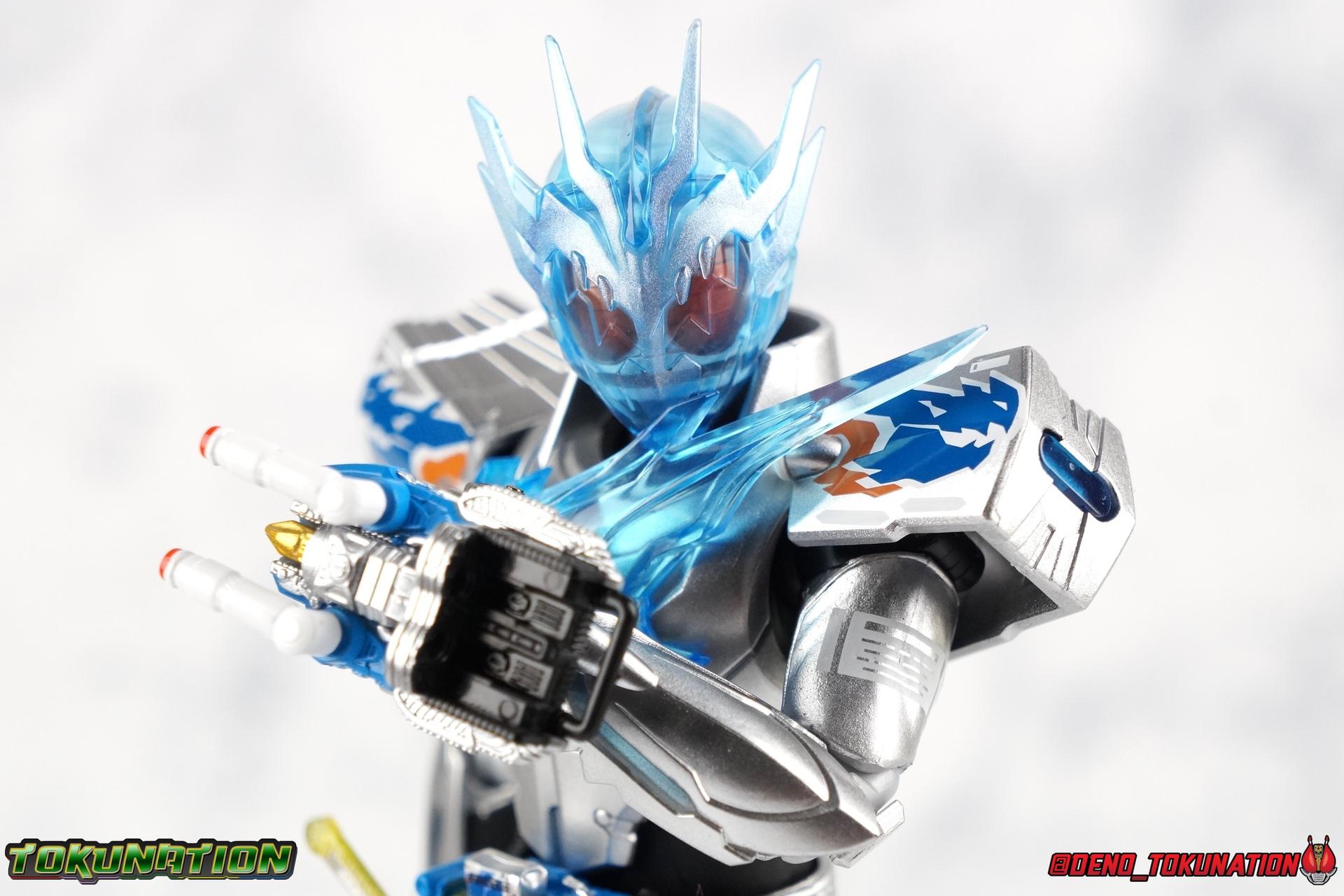 With a 3 sided war for Japan's future (and the power of Pandora's Box) underway, Hokuto's own warrior Kamen Rider Grease has appeared. His arrival on the battlefield brings with it the powerful and dangerous Sclash Driver. Fueled by Sclash Jellies, this wild driver has detrimental side effects on the users' body. In Ryuga Banjou's case, his drive to find a reason to fight, to protect his friends has given him the strength to overcome these hazards. But will this power be enough? When the time comes, can the muscle headed hero face his destiny? We'll see today in our gallery of S.H. Figuarts Kamen Rider Cross-Z Charge! Packaging Charge continues the trend of two-tone boxes for Build releases despite the rather bland combination of blue & gray on it. This one's not particularly interesting honestly, but I'm not here for the box. I'm legitimately quite happy to finally have a chance to review this figure and form. Main Figure It's odd the by the time this form has finally made the crossover to figuarts, that it literally doesn't exist in the show anymore. Cross-Z Charge took over for Banjou's original Cross-Z form fairly early on. The original only having a few outings to speak of including 1 movie. But with the introduction of Cross-Z Magma, Charge was literally no longer viable. That was several months ago now. Despite this I've been excited to see how this design translated to toy form and I'm pretty happy with the results. Cross-Z Charge is pretty strikingly different when compared to Cross-Z, Magma, or Great. It's shiny silver and translucent blue color scheme really go a long way to setting it apart from Cross-Z's various evolution's. But that's pretty appropriate given the different Driver being used, the transition from Grease to Grease Blizzard is very similar. Anyways, that striking color scheme is what I'd like to touch on first. Charge is almost fully painted in a really gorgeous metallic silver. The only notable exceptions being the shins, abdomen, and translucent parts. The finish on this is really excellent, I've only noticed a few iffy spots where the application is either over sprayed or a little under applied. The legs are accented by some ice blue on the feet, and some very sharp white techy detailing on the thighs. The legs themselves feel like they have a much greater range of movement than the standard Build/Cross-Z or Night Rogue/Stalk molds. I do wish the ankles had a little more clearance, but the overall performance of the legs is nice. The waist features a brand new driver as well, the Sclash Driver! I always liked the design of this driver and felt like it's ultimately been under used. Originally billed as the "big upgrade" near the middle of the series, and certainly used to great effect by Grease, Rogue, & Cross-Z, it has been outclassed. To the point that by the oncoming series finale, only Rogue is still using it. And even then he's about to get a Build Driver based upgrade form in an upcoming DVD/V-Cinema. That's all beside the point. This driver works very well at this scale. The Wrench handle can move up and down and the include Dragon Sclash Jelly can be removed as well as inserted into the Twin Breaker weapon. The upper body has an elaborate translucent blue dragon emblem stretched across it that I'm totally in love with. In a coincidence of the suit and toy designs, the peg holding the dragon to the chest is placed where the eye is so it syncs up well enough to hide it despite the translucence. The sculpt for this part is very well defined and the blue plastic just the right opacity. The arms are pretty much standard, though the elbows are hindered a little bit by the way the forearm ends on a point. They do look quite nice thanks to that silver paint application and the white tamphographed details on the biceps. The shoulder pads have magnificent airbrushed style dragon art that would look very much at home on the side of a van I would love to drive. I love it. These big dumb shoulder do however limit some of what you can do with the upper arms, they tend to impact the chest at very strange angles, though they are surprisingly well jointed. It's imperfect but they work. Finally, the head. Made with the same glorious clear plastic as the chest. I absolutely *Love* how it turned out. I half expected the opaqueness of the plastic to be off like in the past with Meteor Storm. But I'm happy to report that it's dead on. The faceplate is sharp and well defined, while the features underneath it shine through in almost any lighting. They just nailed it on this one. Bravo. Overall this is a really excellent figure that I think excels in several areas that the first Cross-Z did not. It's not absolutely perfect, but it's turned out so much better than I ever expected too. Accessories Charge comes with a pretty balanced set of accessories: 2.5 - sets of hands. That's an open pair, one set of open fists for either holding the Sclash Driver handle or possibly the handlebars of the Machine Builder, and one left hand to hold the Twin Breaker. 1 - Twin Breaker. This dual mode weapon always looked a bit clumsy to me in the show, but I like it for the most part here. The hand meant to grip it, holds it an angle but that can help navigate around the forearm a bit. I wish it could rest flush against the arm but that wouldn't be entirely accurate. The twin breaker comes packaged in Beam Mode with the gun barrels pointed forward. You can easily transition it to Attack Mode by rotating them back and extending the golden spear point in the middle. This locks nice and snugly in place, just be careful not to scratch it. The Twin Breaker also comes equipped with the Cross-Z Dragon and Dragon Full Bottle. They can be removed and are identical to those included with standard Cross-Z. They fit very snugly into the slots of the Breaker so you'll need a little force to get it out. These slots can also accommodate any Full Bottle, or Sclash Jelly. Really that's everything this form coul