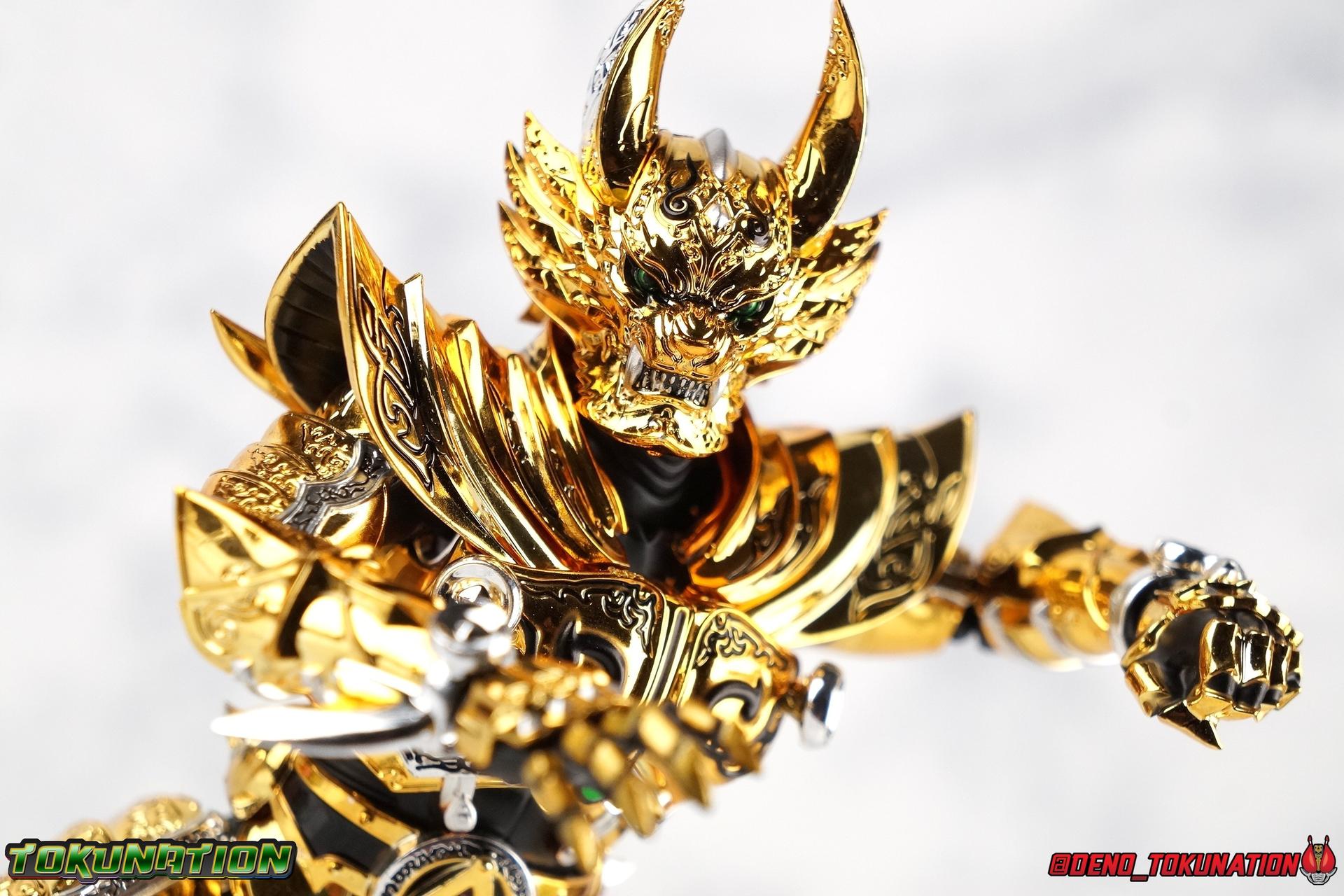 And now, after 7 years, collectors have been given hope with a brand new rendition of the iconic Golden Knight Garo! The original S.H. Figuarts Garo was released in 2011, but it was a terribly flawed and inaccurate release which collector's have complained about for years. Given the insane popularity of Tamashii Nation's high end Kamen Rider renewals in the last few years, it was perhaps only a matter of time before the treatment was applied elsewhere. Now, the first S.H. Figuarts Shinkocchou Seihou release for the Garo franchise has arrived! Packaging Being that Garo is the first non-Kamen Rider to be released in the Shinkocchou Seihou line, his packaging is a really great departure from the norm while keeping the same style. The slipcover box has returned but thankfully we've lost the dull white/black design and gotten a sleek glossy black box this time around. The character art on the front is absolutely gorgeous and the green flames accent it very well. I'm very much in love with the gold foil lettering on the spines of the box as well. While this box is clearly the same as what we've seen before, the presentation of it is greatly improved and really sets this release apart from the others. Main Figure Can I just say "wow"? I haven't been quite this impressed by a new figuart in some time. I've never been a huge fan of the Garo franchise personally. I have so many friends that love it and the various Makai Knights within it. I have attempted to immerse myself in it more than once over the last decade as well. But I have never found a compelling reason to actively like these shows. Bearing that in mind, can I admit that Shinkocchou Seihou Garo is one of my favorite figures ever? Because it actually really is. If that's not a winning endorsement, I doubt you'll find one better. Seihou Garo truly is the renewal collectors and fans have waited for over the better part of a decade. Functionally the old figure was pretty lackluster, but it wasn't even just that, visually the details were wrong, the armor the wrong color, some features were just missing entirely. The Seihou fixes all of the issues. The most striking change is of course the glorious golden chrome paint application over the entire armor, along with some extra silver accents. The armor is extremely shiny and the finish is very crisp. Every surface detail that can be covered in this gold is. Connecting moving joints are not where necessary. But literally anything else that can be, is. The entire armor is also ornately detailed. Every single detail is immaculately recreated here. Every etching, every line, everything. I'm just so massively impressed by it. On to a bit of how the figure works, it's imperfect, but a vast improvement on the original. The armor is big and bulky, but surprisingly there's much more flexibility to the joints than you'd imagine. The ankles are fantastically unhindered, while the knees can only bend about 90 degrees. The hips leave a little bit to be desired though. They can angle out just fine, but pulling them forward and back inevitably hits the waist armor meaning you lose a small bit of movement. I appreciate that the silver details on the hips are not painted chrome but molded in silver along with the black parts so there won't be any chrome where there. However the actual waist is two separate pieces of armor, chrome on top of chrome, so that really scares me for the future. As mentioned before, the details on this thing are indescribably nice. The upper body is just a spectacle, especially the back plate. And while it may not look like it, the upper bod floats on the lower torso quite well, and luckily the details on the interior part are painted in flat silver and gold rather than chrome so no scraping concerns. The arms are actually pretty ingenious as well, despite having so many protrusions you aren't going to draw blood trying to put new hands on him. The wrists are nice and unrestricted, the elbows actually bend very nicely and have a weird rotational joint built in so they can swivel a bit too. The bicep also features a swivel and the shoulder joint itself is wide open so the arms can freely move. And why are they so free? The shoulder armor is hinged. The plates that make up the shoulder and neck armor are jointed and can move up and down depending on where you need them in relation ot the actual shoulder. It's frankly brilliant. At one time Bandai even stated that this sliding armor gimmick is what had kept the figure in limbo for a while as they perfected it. Well damn they perfected it alright. Finally, Garo's head is a magnificent recreation of this hero's fierce visage. Thanks to the chrome gold and silver applications, punctuated by those piercing green eyes, and the black paint wash that brings out the minor details, Garo's face has come alive. Accessories Garo comes with most of what he needs, missing at least one key item that I'm disappointed about: 3 - sets of hands. That's one open set for action poses, 1 set used to hold the sword, and 1 set specifically for holding the sword scabbard instead. 1 - Garoken Scabbard. This is a bit of a dummy accessory which is disappointing. The scabbard has a nice metal chain which I appreciate, but the sword grip sticking out of it is a dummy accessory. The grip can be removed to simulate the sword being removed. But the sword itself cannot actually be put in the scabbard. I'm kind of baffled as to why. Numerous, *numerous*, Garo figures in the long running Makai Kado line from Bandai have had fully functional scabbards. It's just silly that this one isn't despite it clearly being the right size to house a sword. 1 - Garoken. Garo's signature weapon is ornately detailed along the handle and blade. While many counterparts to this weapon in the Makai Kado line feature die cast for weight, I'm quite glad this one doesn't. The wrists are fairly strong but they couldn't hold up to that kind of weight. I've included a couple images of Seihou Garo h