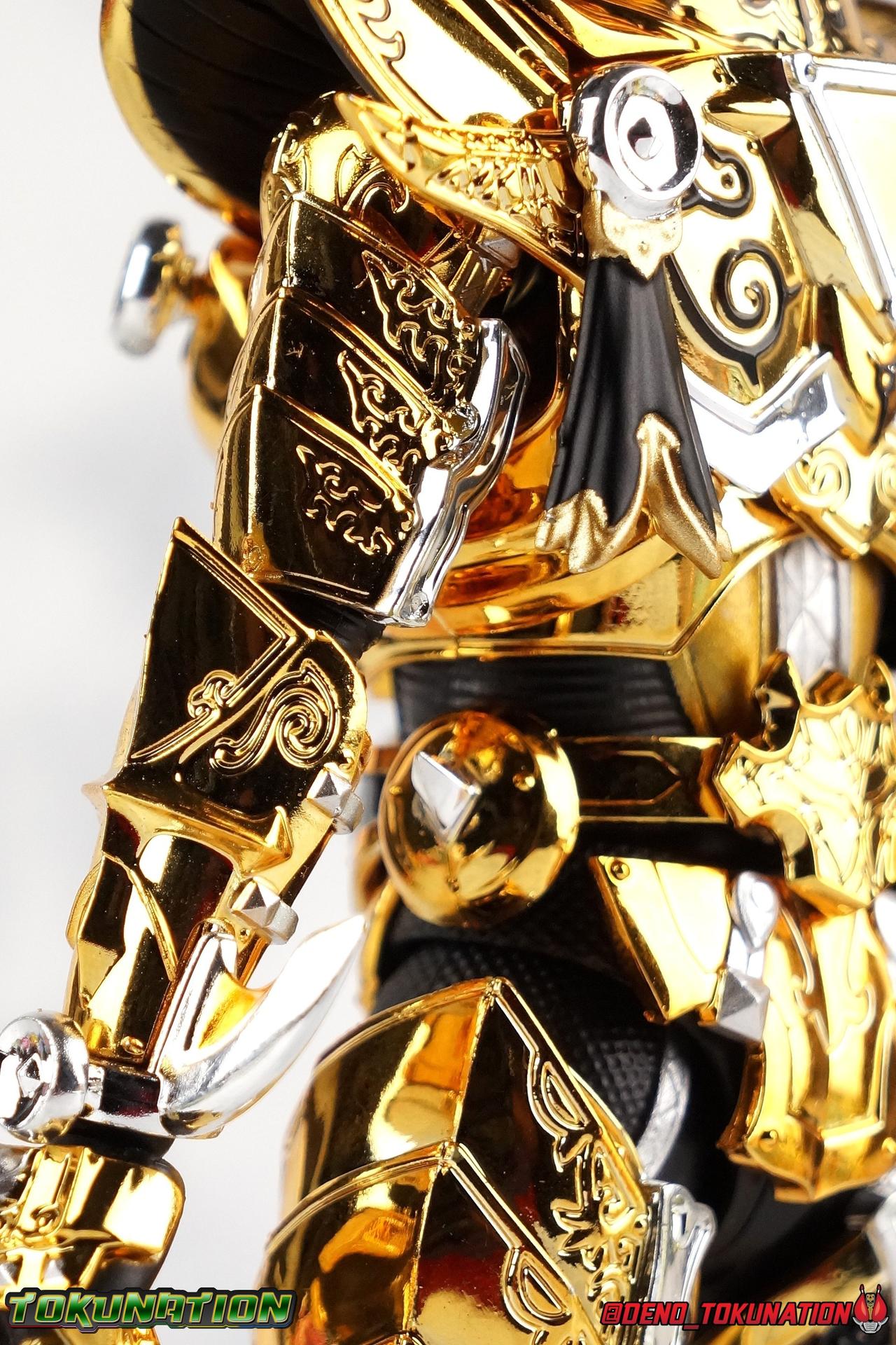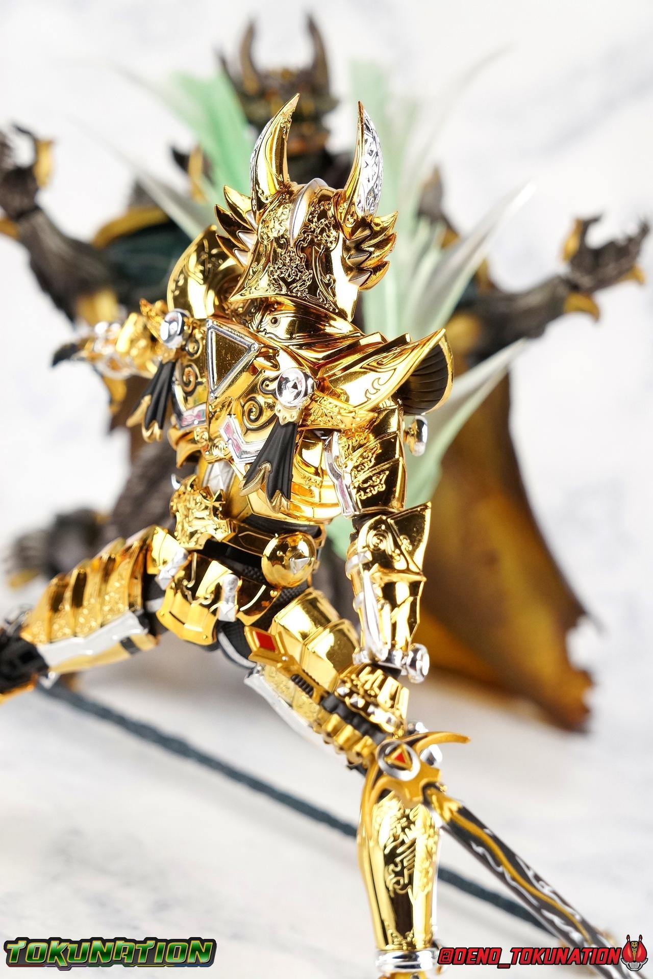 And now, after 7 years, collectors have been given hope with a brand new rendition of the iconic Golden Knight Garo! The original S.H. Figuarts Garo was released in 2011, but it was a terribly flawed and inaccurate release which collector's have complained about for years. Given the insane popularity of Tamashii Nation's high end Kamen Rider renewals in the last few years, it was perhaps only a matter of time before the treatment was applied elsewhere. Now, the first S.H. Figuarts Shinkocchou Seihou release for the Garo franchise has arrived! Packaging Being that Garo is the first non-Kamen Rider to be released in the Shinkocchou Seihou line, his packaging is a really great departure from the norm while keeping the same style. The slipcover box has returned but thankfully we've lost the dull white/black design and gotten a sleek glossy black box this time around. The character art on the front is absolutely gorgeous and the green flames accent it very well. I'm very much in love with the gold foil lettering on the spines of the box as well. While this box is clearly the same as what we've seen before, the presentation of it is greatly improved and really sets this release apart from the others. Main Figure Can I just say "wow"? I haven't been quite this impressed by a new figuart in some time. I've never been a huge fan of the Garo franchise personally. I have so many friends that love it and the various Makai Knights within it. I have attempted to immerse myself in it more than once over the last decade as well. But I have never found a compelling reason to actively like these shows. Bearing that in mind, can I admit that Shinkocchou Seihou Garo is one of my favorite figures ever? Because it actually really is. If that's not a winning endorsement, I doubt you'll find one better. Seihou Garo truly is the renewal collectors and fans have waited for over the better part of a decade. Functionally the old figure was pretty lackluster, but it wasn't even just that, visually the details were wrong, the armor the wrong color, some features were just missing entirely. The Seihou fixes all of the issues. The most striking change is of course the glorious golden chrome paint application over the entire armor, along with some extra silver accents. The armor is extremely shiny and the finish is very crisp. Every surface detail that can be covered in this gold is. Connecting moving joints are not where necessary. But literally anything else that can be, is. The entire armor is also ornately detailed. Every single detail is immaculately recreated here. Every etching, every line, everything. I'm just so massively impressed by it. On to a bit of how the figure works, it's imperfect, but a vast improvement on the original. The armor is big and bulky, but surprisingly there's much more flexibility to the joints than you'd imagine. The ankles are fantastically unhindered, while the knees can only bend about 90 degrees. The hips leave a little bit to be desired though. They can angle out just fine, but pulling them forward and back inevitably hits the waist armor meaning you lose a small bit of movement. I appreciate that the silver details on the hips are not painted chrome but molded in silver along with the black parts so there won't be any chrome where there. However the actual waist is two separate pieces of armor, chrome on top of chrome, so that really scares me for the future. As mentioned before, the details on this thing are indescribably nice. The upper body is just a spectacle, especially the back plate. And while it may not look like it, the upper bod floats on the lower torso quite well, and luckily the details on the interior part are painted in flat silver and gold rather than chrome so no scraping concerns. The arms are actually pretty ingenious as well, despite having so many protrusions you aren't going to draw blood trying to put new hands on him. The wrists are nice and unrestricted, the elbows actually bend very nicely and have a weird rotational joint built in so they can swivel a bit too. The bicep also features a swivel and the shoulder joint itself is wide open so the arms can freely move. And why are they so free? The shoulder armor is hinged. The plates that make up the shoulder and neck armor are jointed and can move up and down depending on where you need them in relation ot the actual shoulder. It's frankly brilliant. At one time Bandai even stated that this sliding armor gimmick is what had kept the figure in limbo for a while as they perfected it. Well damn they perfected it alright. Finally, Garo's head is a magnificent recreation of this hero's fierce visage. Thanks to the chrome gold and silver applications, punctuated by those piercing green eyes, and the black paint wash that brings out the minor details, Garo's face has come alive. Accessories Garo comes with most of what he needs, missing at least one key item that I'm disappointed about: 3 - sets of hands. That's one open set for action poses, 1 set used to hold the sword, and 1 set specifically for holding the sword scabbard instead. 1 - Garoken Scabbard. This is a bit of a dummy accessory which is disappointing. The scabbard has a nice metal chain which I appreciate, but the sword grip sticking out of it is a dummy accessory. The grip can be removed to simulate the sword being removed. But the sword itself cannot actually be put in the scabbard. I'm kind of baffled as to why. Numerous, *numerous*, Garo figures in the long running Makai Kado line from Bandai have had fully functional scabbards. It's just silly that this one isn't despite it clearly being the right size to house a sword. 1 - Garoken. Garo's signature weapon is ornately detailed along the handle and blade. While many counterparts to this weapon in the Makai Kado line feature die cast for weight, I'm quite glad this one doesn't. The wrists are fairly strong but they couldn't hold up to that kind of weight. I've included a couple images of Seihou Garo h
