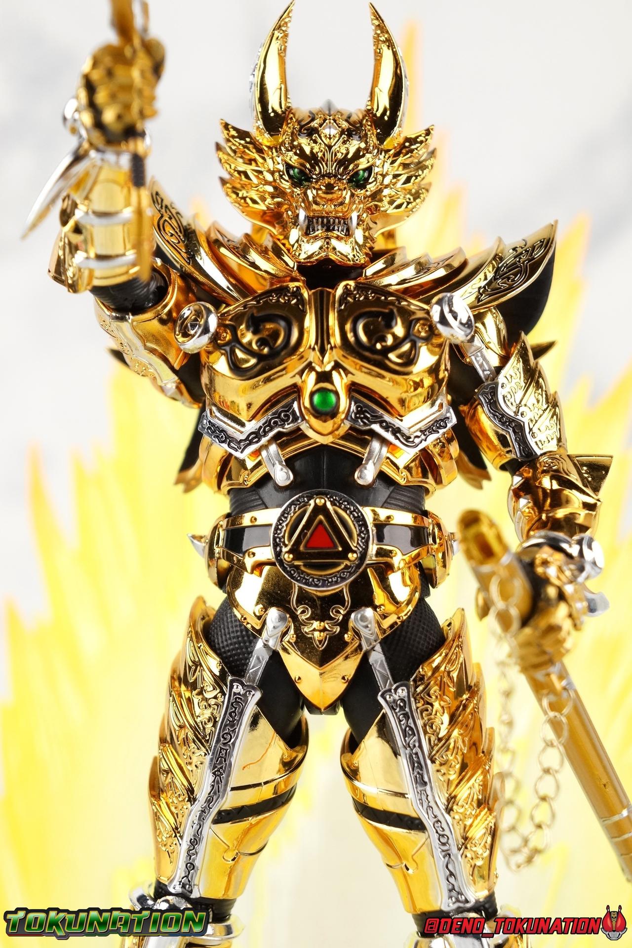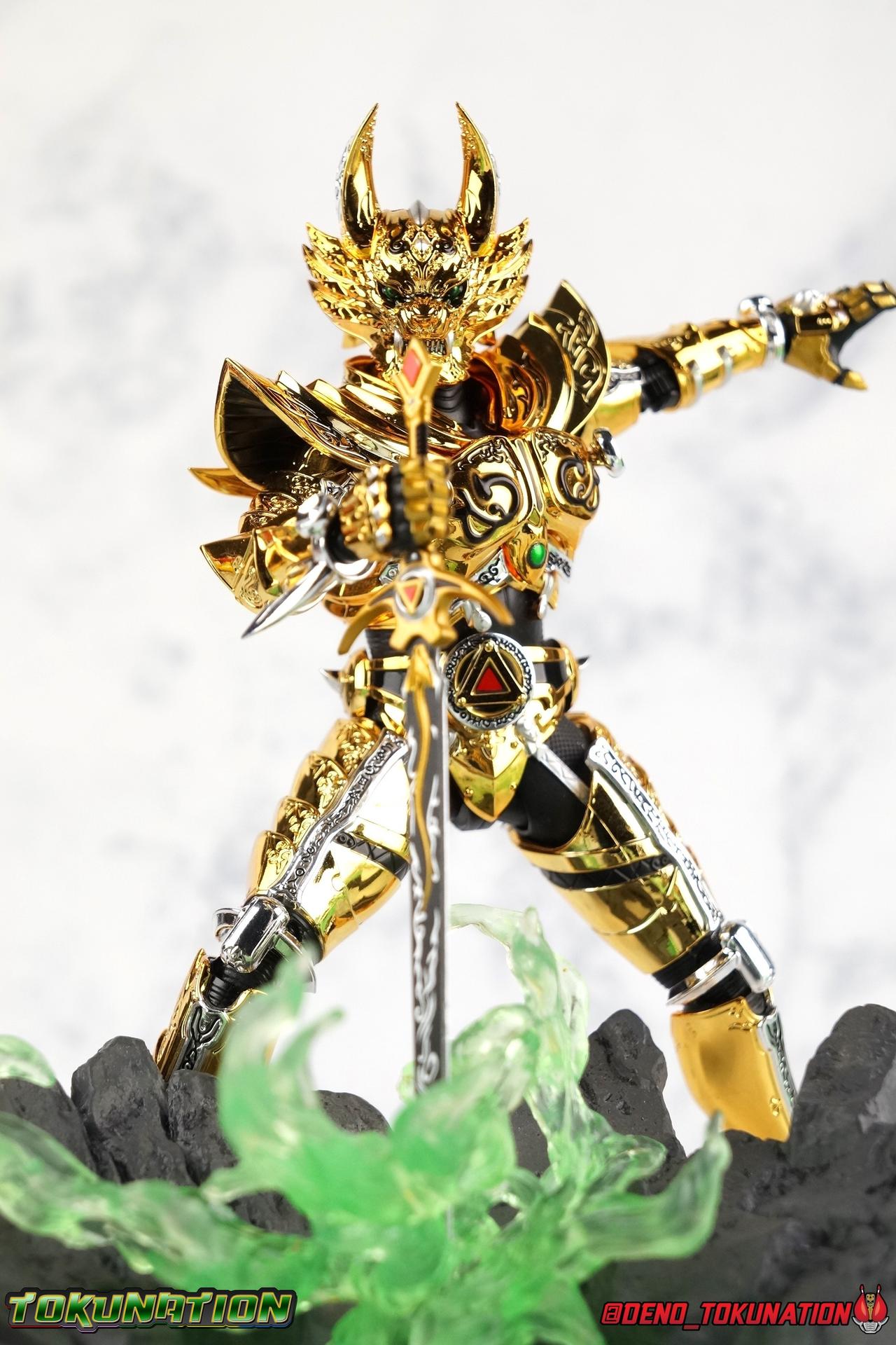 And now, after 7 years, collectors have been given hope with a brand new rendition of the iconic Golden Knight Garo! The original S.H. Figuarts Garo was released in 2011, but it was a terribly flawed and inaccurate release which collector's have complained about for years. Given the insane popularity of Tamashii Nation's high end Kamen Rider renewals in the last few years, it was perhaps only a matter of time before the treatment was applied elsewhere. Now, the first S.H. Figuarts Shinkocchou Seihou release for the Garo franchise has arrived! Packaging Being that Garo is the first non-Kamen Rider to be released in the Shinkocchou Seihou line, his packaging is a really great departure from the norm while keeping the same style. The slipcover box has returned but thankfully we've lost the dull white/black design and gotten a sleek glossy black box this time around. The character art on the front is absolutely gorgeous and the green flames accent it very well. I'm very much in love with the gold foil lettering on the spines of the box as well. While this box is clearly the same as what we've seen before, the presentation of it is greatly improved and really sets this release apart from the others. Main Figure Can I just say "wow"? I haven't been quite this impressed by a new figuart in some time. I've never been a huge fan of the Garo franchise personally. I have so many friends that love it and the various Makai Knights within it. I have attempted to immerse myself in it more than once over the last decade as well. But I have never found a compelling reason to actively like these shows. Bearing that in mind, can I admit that Shinkocchou Seihou Garo is one of my favorite figures ever? Because it actually really is. If that's not a winning endorsement, I doubt you'll find one better. Seihou Garo truly is the renewal collectors and fans have waited for over the better part of a decade. Functionally the old figure was pretty lackluster, but it wasn't even just that, visually the details were wrong, the armor the wrong color, some features were just missing entirely. The Seihou fixes all of the issues. The most striking change is of course the glorious golden chrome paint application over the entire armor, along with some extra silver accents. The armor is extremely shiny and the finish is very crisp. Every surface detail that can be covered in this gold is. Connecting moving joints are not where necessary. But literally anything else that can be, is. The entire armor is also ornately detailed. Every single detail is immaculately recreated here. Every etching, every line, everything. I'm just so massively impressed by it. On to a bit of how the figure works, it's imperfect, but a vast improvement on the original. The armor is big and bulky, but surprisingly there's much more flexibility to the joints than you'd imagine. The ankles are fantastically unhindered, while the knees can only bend about 90 degrees. The hips leave a little bit to be desired though. They can angle out just fine, but pulling them forward and back inevitably hits the waist armor meaning you lose a small bit of movement. I appreciate that the silver details on the hips are not painted chrome but molded in silver along with the black parts so there won't be any chrome where there. However the actual waist is two separate pieces of armor, chrome on top of chrome, so that really scares me for the future. As mentioned before, the details on this thing are indescribably nice. The upper body is just a spectacle, especially the back plate. And while it may not look like it, the upper bod floats on the lower torso quite well, and luckily the details on the interior part are painted in flat silver and gold rather than chrome so no scraping concerns. The arms are actually pretty ingenious as well, despite having so many protrusions you aren't going to draw blood trying to put new hands on him. The wrists are nice and unrestricted, the elbows actually bend very nicely and have a weird rotational joint built in so they can swivel a bit too. The bicep also features a swivel and the shoulder joint itself is wide open so the arms can freely move. And why are they so free? The shoulder armor is hinged. The plates that make up the shoulder and neck armor are jointed and can move up and down depending on where you need them in relation ot the actual shoulder. It's frankly brilliant. At one time Bandai even stated that this sliding armor gimmick is what had kept the figure in limbo for a while as they perfected it. Well damn they perfected it alright. Finally, Garo's head is a magnificent recreation of this hero's fierce visage. Thanks to the chrome gold and silver applications, punctuated by those piercing green eyes, and the black paint wash that brings out the minor details, Garo's face has come alive. Accessories Garo comes with most of what he needs, missing at least one key item that I'm disappointed about: 3 - sets of hands. That's one open set for action poses, 1 set used to hold the sword, and 1 set specifically for holding the sword scabbard instead. 1 - Garoken Scabbard. This is a bit of a dummy accessory which is disappointing. The scabbard has a nice metal chain which I appreciate, but the sword grip sticking out of it is a dummy accessory. The grip can be removed to simulate the sword being removed. But the sword itself cannot actually be put in the scabbard. I'm kind of baffled as to why. Numerous, *numerous*, Garo figures in the long running Makai Kado line from Bandai have had fully functional scabbards. It's just silly that this one isn't despite it clearly being the right size to house a sword. 1 - Garoken. Garo's signature weapon is ornately detailed along the handle and blade. While many counterparts to this weapon in the Makai Kado line feature die cast for weight, I'm quite glad this one doesn't. The wrists are fairly strong but they couldn't hold up to that kind of weight. I've included a couple images of Seihou Garo h