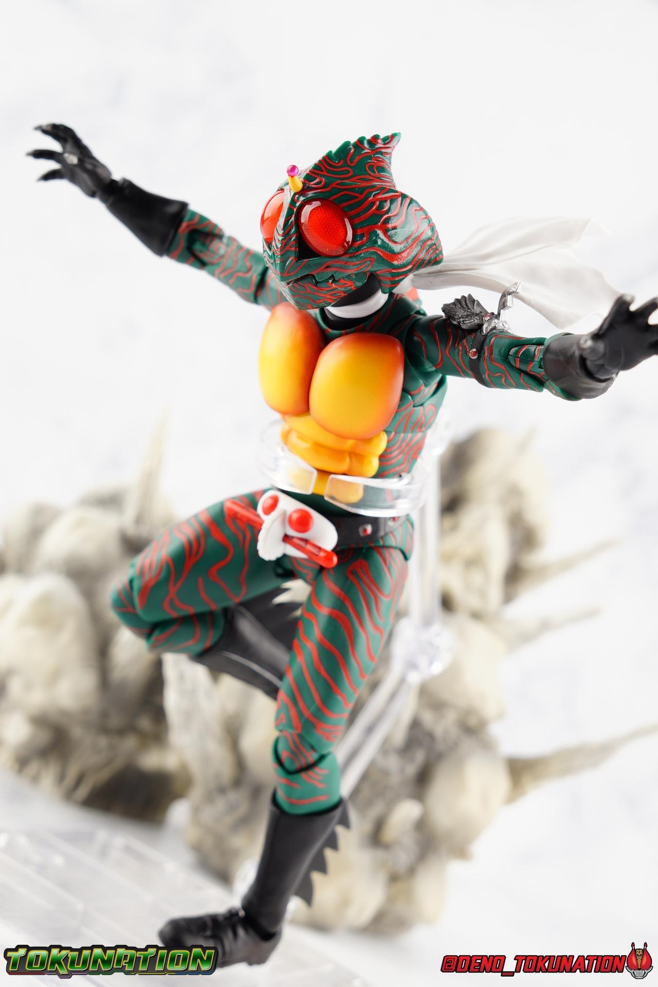 When the village Elder Bago passed the Incan GiGi Armlet to the wild boy Daisuke Yamamoto, he also performed an ancient ritual to save his life. In order to battle against the Ten-Faced Demon Gorgos, Daisuke would learn to use the ancient artifact he'd been entrusted with and master it's powers as Kamen Rider Amazon! Today, we see how Daisuke has evolved with a brand new figure, and the Amazon Series' first foray into the renewal era with S.H. Figuarts Shinkkocchou Seihou Kamen Rider Amazon! Packaging The familiar Shinkocchou Seihou slip cover box makes another appearance! Not much can be said about it this time that hasn't been said before. It's gotten a bit stale over time but it's still a pleasing type of collector's box. For Amazon we do have some cosmetic changes however. The new Bandai Spirits blue logo is featured on the box, as well as a new holofoil Tamashii Nations brand sticker. Main Figure 7 years ago, the original S.H. Figuarts Amazon was released, we reviewed it in 2016. At the time of it's release, this Amazon was already beginning to shift the quality of Showa figuarts, though it would be some time before real change came about with the Black & RX Renewals. Looking back now, Amazon is an extremely dated figure. But for it's time, it really was something else. The functionality & detail presented in it's sculpt was unprecedented. But things change, and now we have something of a next leap in the decade+ long history of S.H. Figuarts. Shinkocchou Seihou has slowly, but much more rapidly in the last 3 years, reshaped what figuarts are. Redesigning characters from the ground up with engineering that takes into account what these suits really looked like on screen, while accommodating the fact that there would be an actual person inside. As the first figure in the line, Kabuto really set the bar high, and I was highly impressed then. When Seihou W was released I found it easily to be the greatest release in the line thus far. Rider 1 was also an incredibly impressive change from it's original counterpart. With ALL of that being said, Shinkocchou Seihou Amazon is absolutely the best the line has to offer so far. Bar none. This version of Amazon, finally puts the original Figuart to shame. Just seeing the two side by side, it's evident just how short, wrongly colored, disproportionate, small overall, and frankly emaciated looking that figure was. The entire shape of it is just wrong. The Seihou is a thing of pure beauty to me. From the ground up, the suit has been fully realized and given the absolute best articulation possible given the design. Where the original had hollow ankles you could see straight through, the Seihou has fully formed feet on wide angle ball joints that provide plenty of posing opportunities. The knees are likewise just about perfect, they have far more range than the original, but like it, the calve spikes will impact the back of the leg when bent far enough. The hips also feature that wonderful interlaced style joint we've come to appreciate in recent years. Some people call it a diaper, but I greatly appreciate the separation of parts and joints in these hips. This complex design allows Amazon to assume some of his moist savage and acrobatic poses. Aside from functionality, the legs are detailed *perfectly*. Every red stripe is sculpted into the body of the figure, and this applies to their placement on the entire body. Then it's painted over. The sculpt is shallow as well, allowing the paint to look like red color on green fabric as with the actual suit. But the detailing isn't limited to just the body and appendages, Bandai has gone the extra mile and made sure that even the connecting joints of the figure feature this detail. Gone are the days of miscolored joints holding limbs together. This is perhaps my favorite minute detail. Moving up, we see Amazon's belt, the Condorer. Though not his henshin device, the Condorer is still just as iconic. The Seihou's belt is a bit more properly round, and has the black detailing the original lacked, while also being more proportionate to the body. Like the original it can be replaced with an open Condorer accessory. As huge an improvement as the legs are, the arms may be more so. The original figure suffered from long scrawny arms that lacked girth. Seihou Amazon is kind of jacked. Thankfully these arms also have a wealth of articulation. Fully unencumbered wrists, a natural elbow joint that fills in the gap as it moves, in much the same way as the knees. A full 360 bicep swivel, and possibly the best shoulder joint I've ever handled. More so than some other Seihou's (looking at you Rider 1), Amazon can bring his arms down to his sides a bit better, though still not totally flat. The trade-off is the excellent shoulder which allows full movement of the arms up and down in nearly any direction. The left arm features the GiGi Armlet, which looks a lot more natural this go around than with the original, as it actually goes around the entire bicep. The sculpt for it is phenomenally better as well. The abdomen and chest now are really something else. The original figure was separated into two chunks, with the pectoral section rotating a little above the lower half. The Seihou takes a cue from Rider 1 and separates this into 3 sections, which can each move independently. There are 3 rows of "abs", the lower most one being it's own ring on the torso, plugged into the waist itself. The middle section has the most movement, then the pecs can rotate a bit as well, but are actually more for arching the back or bending forward. Sometimes this can expose an ugly gap on the side, but it also just goes to show how much this figure can move. This section of the suit is just so much more accurate than the original, and thankfully doesn't have those wacky articulated pecs it did either. While these can move on the Seihou, you don't have giant gaps in them that expose the plastic underneath. And on Amazon's back is a finned spine