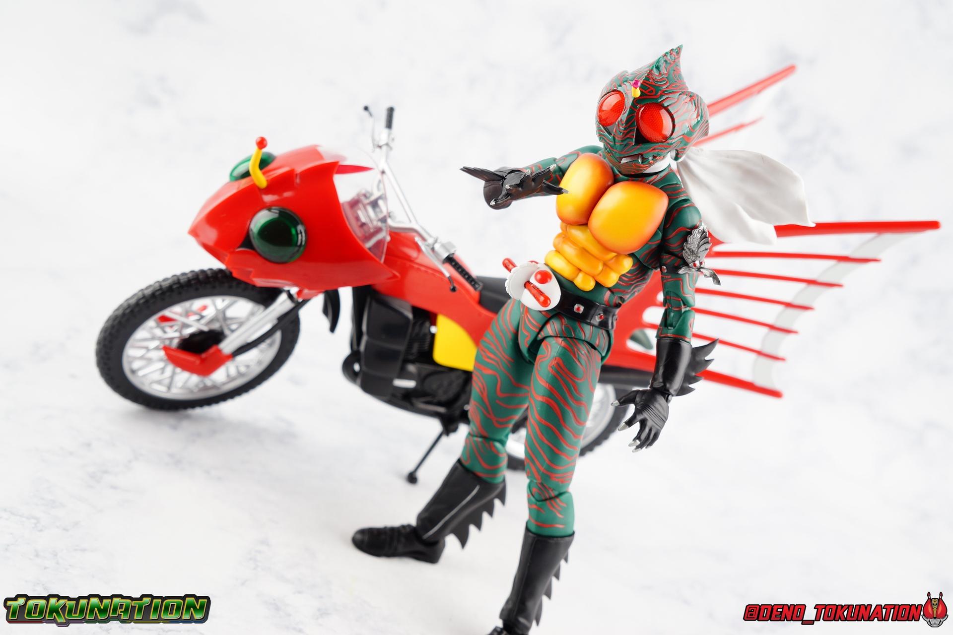When the village Elder Bago passed the Incan GiGi Armlet to the wild boy Daisuke Yamamoto, he also performed an ancient ritual to save his life. In order to battle against the Ten-Faced Demon Gorgos, Daisuke would learn to use the ancient artifact he'd been entrusted with and master it's powers as Kamen Rider Amazon! Today, we see how Daisuke has evolved with a brand new figure, and the Amazon Series' first foray into the renewal era with S.H. Figuarts Shinkkocchou Seihou Kamen Rider Amazon! Packaging The familiar Shinkocchou Seihou slip cover box makes another appearance! Not much can be said about it this time that hasn't been said before. It's gotten a bit stale over time but it's still a pleasing type of collector's box. For Amazon we do have some cosmetic changes however. The new Bandai Spirits blue logo is featured on the box, as well as a new holofoil Tamashii Nations brand sticker. Main Figure 7 years ago, the original S.H. Figuarts Amazon was released, we reviewed it in 2016. At the time of it's release, this Amazon was already beginning to shift the quality of Showa figuarts, though it would be some time before real change came about with the Black & RX Renewals. Looking back now, Amazon is an extremely dated figure. But for it's time, it really was something else. The functionality & detail presented in it's sculpt was unprecedented. But things change, and now we have something of a next leap in the decade+ long history of S.H. Figuarts. Shinkocchou Seihou has slowly, but much more rapidly in the last 3 years, reshaped what figuarts are. Redesigning characters from the ground up with engineering that takes into account what these suits really looked like on screen, while accommodating the fact that there would be an actual person inside. As the first figure in the line, Kabuto really set the bar high, and I was highly impressed then. When Seihou W was released I found it easily to be the greatest release in the line thus far. Rider 1 was also an incredibly impressive change from it's original counterpart. With ALL of that being said, Shinkocchou Seihou Amazon is absolutely the best the line has to offer so far. Bar none. This version of Amazon, finally puts the original Figuart to shame. Just seeing the two side by side, it's evident just how short, wrongly colored, disproportionate, small overall, and frankly emaciated looking that figure was. The entire shape of it is just wrong. The Seihou is a thing of pure beauty to me. From the ground up, the suit has been fully realized and given the absolute best articulation possible given the design. Where the original had hollow ankles you could see straight through, the Seihou has fully formed feet on wide angle ball joints that provide plenty of posing opportunities. The knees are likewise just about perfect, they have far more range than the original, but like it, the calve spikes will impact the back of the leg when bent far enough. The hips also feature that wonderful interlaced style joint we've come to appreciate in recent years. Some people call it a diaper, but I greatly appreciate the separation of parts and joints in these hips. This complex design allows Amazon to assume some of his moist savage and acrobatic poses. Aside from functionality, the legs are detailed *perfectly*. Every red stripe is sculpted into the body of the figure, and this applies to their placement on the entire body. Then it's painted over. The sculpt is shallow as well, allowing the paint to look like red color on green fabric as with the actual suit. But the detailing isn't limited to just the body and appendages, Bandai has gone the extra mile and made sure that even the connecting joints of the figure feature this detail. Gone are the days of miscolored joints holding limbs together. This is perhaps my favorite minute detail. Moving up, we see Amazon's belt, the Condorer. Though not his henshin device, the Condorer is still just as iconic. The Seihou's belt is a bit more properly round, and has the black detailing the original lacked, while also being more proportionate to the body. Like the original it can be replaced with an open Condorer accessory. As huge an improvement as the legs are, the arms may be more so. The original figure suffered from long scrawny arms that lacked girth. Seihou Amazon is kind of jacked. Thankfully these arms also have a wealth of articulation. Fully unencumbered wrists, a natural elbow joint that fills in the gap as it moves, in much the same way as the knees. A full 360 bicep swivel, and possibly the best shoulder joint I've ever handled. More so than some other Seihou's (looking at you Rider 1), Amazon can bring his arms down to his sides a bit better, though still not totally flat. The trade-off is the excellent shoulder which allows full movement of the arms up and down in nearly any direction. The left arm features the GiGi Armlet, which looks a lot more natural this go around than with the original, as it actually goes around the entire bicep. The sculpt for it is phenomenally better as well. The abdomen and chest now are really something else. The original figure was separated into two chunks, with the pectoral section rotating a little above the lower half. The Seihou takes a cue from Rider 1 and separates this into 3 sections, which can each move independently. There are 3 rows of "abs", the lower most one being it's own ring on the torso, plugged into the waist itself. The middle section has the most movement, then the pecs can rotate a bit as well, but are actually more for arching the back or bending forward. Sometimes this can expose an ugly gap on the side, but it also just goes to show how much this figure can move. This section of the suit is just so much more accurate than the original, and thankfully doesn't have those wacky articulated pecs it did either. While these can move on the Seihou, you don't have giant gaps in them that expose the plastic underneath. And on Amazon's back is a finned spine