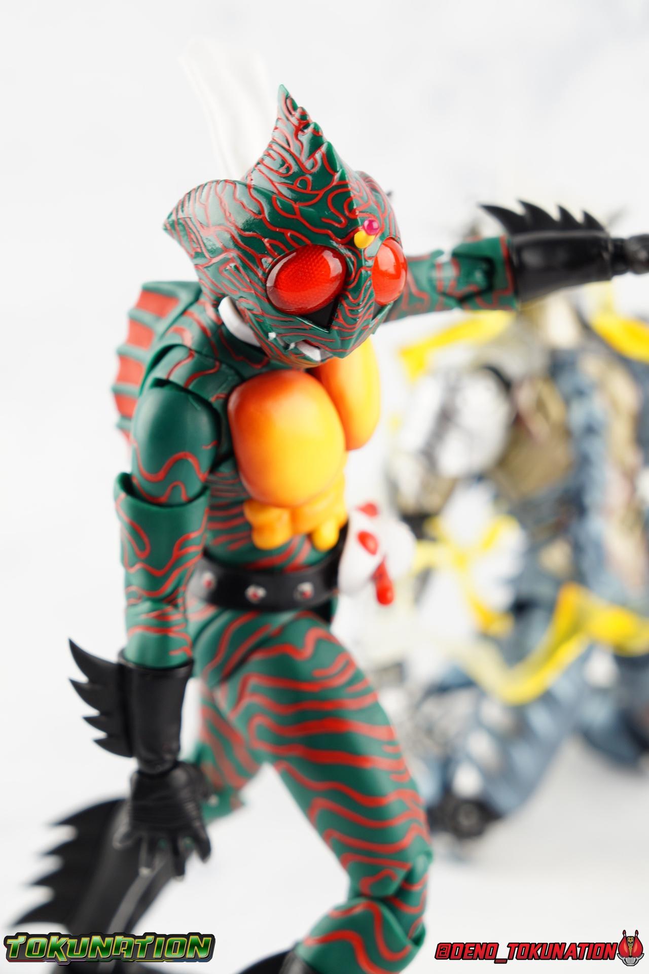 When the village Elder Bago passed the Incan GiGi Armlet to the wild boy Daisuke Yamamoto, he also performed an ancient ritual to save his life. In order to battle against the Ten-Faced Demon Gorgos, Daisuke would learn to use the ancient artifact he'd been entrusted with and master it's powers as Kamen Rider Amazon! Today, we see how Daisuke has evolved with a brand new figure, and the Amazon Series' first foray into the renewal era with S.H. Figuarts Shinkkocchou Seihou Kamen Rider Amazon! Packaging The familiar Shinkocchou Seihou slip cover box makes another appearance! Not much can be said about it this time that hasn't been said before. It's gotten a bit stale over time but it's still a pleasing type of collector's box. For Amazon we do have some cosmetic changes however. The new Bandai Spirits blue logo is featured on the box, as well as a new holofoil Tamashii Nations brand sticker. Main Figure 7 years ago, the original S.H. Figuarts Amazon was released, we reviewed it in 2016. At the time of it's release, this Amazon was already beginning to shift the quality of Showa figuarts, though it would be some time before real change came about with the Black & RX Renewals. Looking back now, Amazon is an extremely dated figure. But for it's time, it really was something else. The functionality & detail presented in it's sculpt was unprecedented. But things change, and now we have something of a next leap in the decade+ long history of S.H. Figuarts. Shinkocchou Seihou has slowly, but much more rapidly in the last 3 years, reshaped what figuarts are. Redesigning characters from the ground up with engineering that takes into account what these suits really looked like on screen, while accommodating the fact that there would be an actual person inside. As the first figure in the line, Kabuto really set the bar high, and I was highly impressed then. When Seihou W was released I found it easily to be the greatest release in the line thus far. Rider 1 was also an incredibly impressive change from it's original counterpart. With ALL of that being said, Shinkocchou Seihou Amazon is absolutely the best the line has to offer so far. Bar none. This version of Amazon, finally puts the original Figuart to shame. Just seeing the two side by side, it's evident just how short, wrongly colored, disproportionate, small overall, and frankly emaciated looking that figure was. The entire shape of it is just wrong. The Seihou is a thing of pure beauty to me. From the ground up, the suit has been fully realized and given the absolute best articulation possible given the design. Where the original had hollow ankles you could see straight through, the Seihou has fully formed feet on wide angle ball joints that provide plenty of posing opportunities. The knees are likewise just about perfect, they have far more range than the original, but like it, the calve spikes will impact the back of the leg when bent far enough. The hips also feature that wonderful interlaced style joint we've come to appreciate in recent years. Some people call it a diaper, but I greatly appreciate the separation of parts and joints in these hips. This complex design allows Amazon to assume some of his moist savage and acrobatic poses. Aside from functionality, the legs are detailed *perfectly*. Every red stripe is sculpted into the body of the figure, and this applies to their placement on the entire body. Then it's painted over. The sculpt is shallow as well, allowing the paint to look like red color on green fabric as with the actual suit. But the detailing isn't limited to just the body and appendages, Bandai has gone the extra mile and made sure that even the connecting joints of the figure feature this detail. Gone are the days of miscolored joints holding limbs together. This is perhaps my favorite minute detail. Moving up, we see Amazon's belt, the Condorer. Though not his henshin device, the Condorer is still just as iconic. The Seihou's belt is a bit more properly round, and has the black detailing the original lacked, while also being more proportionate to the body. Like the original it can be replaced with an open Condorer accessory. As huge an improvement as the legs are, the arms may be more so. The original figure suffered from long scrawny arms that lacked girth. Seihou Amazon is kind of jacked. Thankfully these arms also have a wealth of articulation. Fully unencumbered wrists, a natural elbow joint that fills in the gap as it moves, in much the same way as the knees. A full 360 bicep swivel, and possibly the best shoulder joint I've ever handled. More so than some other Seihou's (looking at you Rider 1), Amazon can bring his arms down to his sides a bit better, though still not totally flat. The trade-off is the excellent shoulder which allows full movement of the arms up and down in nearly any direction. The left arm features the GiGi Armlet, which looks a lot more natural this go around than with the original, as it actually goes around the entire bicep. The sculpt for it is phenomenally better as well. The abdomen and chest now are really something else. The original figure was separated into two chunks, with the pectoral section rotating a little above the lower half. The Seihou takes a cue from Rider 1 and separates this into 3 sections, which can each move independently. There are 3 rows of "abs", the lower most one being it's own ring on the torso, plugged into the waist itself. The middle section has the most movement, then the pecs can rotate a bit as well, but are actually more for arching the back or bending forward. Sometimes this can expose an ugly gap on the side, but it also just goes to show how much this figure can move. This section of the suit is just so much more accurate than the original, and thankfully doesn't have those wacky articulated pecs it did either. While these can move on the Seihou, you don't have giant gaps in them that expose the plastic underneath. And on Amazon's back is a finned spine