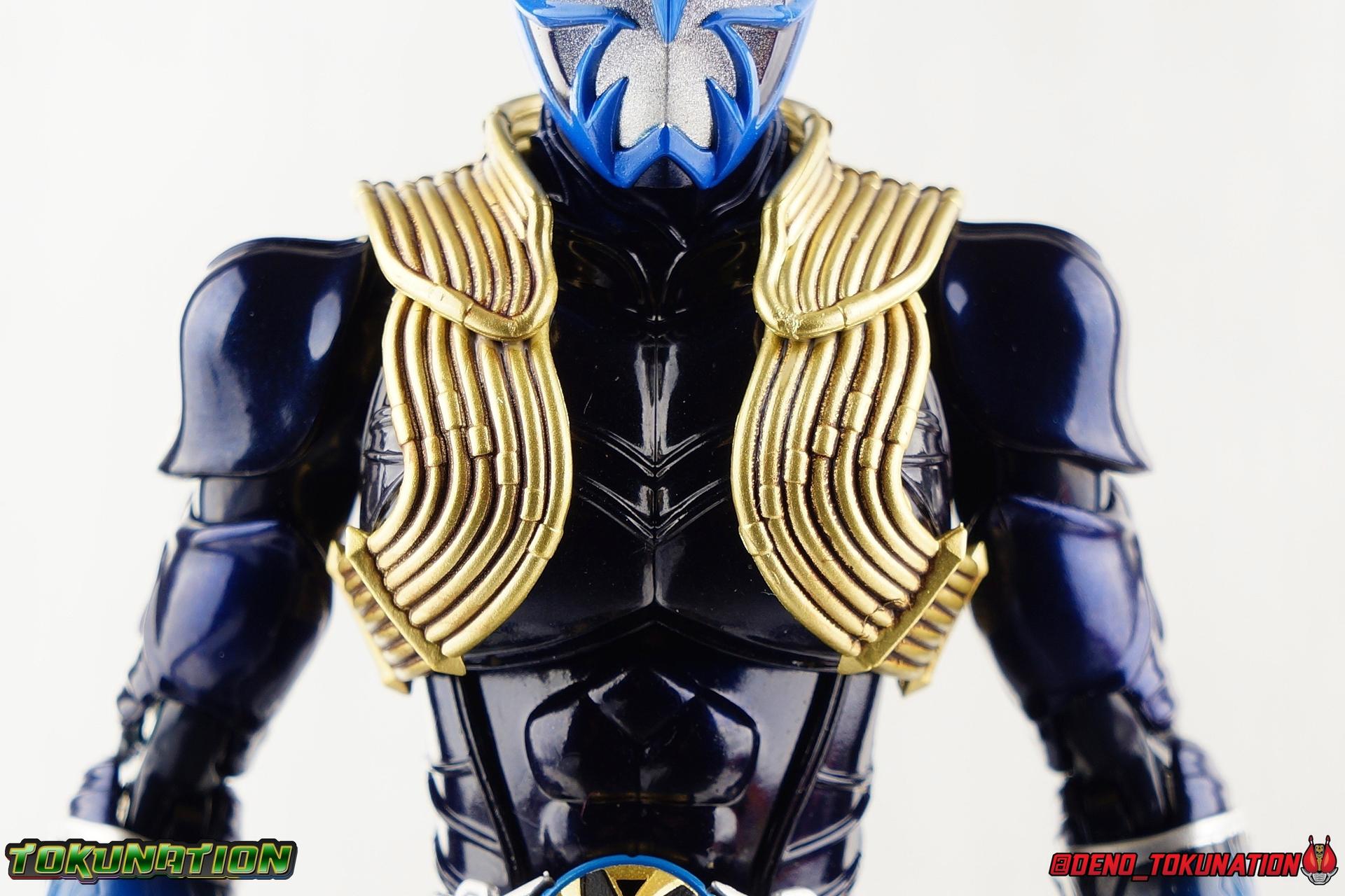 Iori Izumi was born into the head Oni family of the Kanto region. A prodigy driven by loyalty to his family, and to his duty to defeat the Makamou, Izumi fully abandoned his human identity and fully became the Oni of the Izumi family, Kamen Rider Ibuki! Convinced that he cannot be defeated, convinced of his family's strength, Ibuki is a formidable fighter and master of the trumpet weapon Ongekikan Reppuu. This Oni of breath will blow away any Makamou that stand in his path. And for the first time ever, Ibuki makes his debut in the S.H. Figuarts line as a Shinkocchou Seihou! Packaging It's the familiar Shinkocchou Seihou slip cover box once again! Not much can be said about it this time that hasn't been said before. It's gotten a bit stale (to me) over time but it's still a pleasing type of uniform collector's box. Main Figure First things first, like Hibiki, Ibuki is just a really pretty figure. The sculpt of this body type is superb, really bringing to life these unique Oni Rider suits. In every way imaginable it captures the look of the on screen suit right down to the textured musculature. The design process Seihou's go through has always been much much more involved than that of the standard figuarts line. The best example of this having been the special booklets that were included with Kabuto & Hibiki. When the design begins with a sort of skeletal inner frame, and builds out what would be like a suit on a real body like this, you get a much more realistic application of articulation and proportion to the body as a result. Now despite the obvious cosmetic changes, Ibuki is exactly the same basic figure as Hibiki. Featuring identical articulation even. When Bandai nails the design of the body, it can be truly astounding how outer level changes can create two vastly different figures from the same toy. But of course, even 4 years later some of my issues with this mold still persist. I've always found the legs to be quite odd. To me, they look really long and at odds with the torso, especially when bent for crouching poses. Something about them looks off. They function well enough, though I've always thought the Hibiki mold had one of the more strange figuarts hip joints out there. While the part separation undoubtedly gives them great range, the hips look very small by the time you angle them out fully, making the thigh seem huge by comparison. And while the knees function just fine, the feet irk me to no end. Despite being pretty big, too big if you ask me, they don't easily rest flat on any surface, and the toe bends are perpetually difficult to line up straight. It's just hard to get Ibuki or Hibiki for that matter, in a flat footed stance. Ibuki's belt is really loaded up with accessories like Hibiki. This figure comes with a lot any way, luckily you can store multiple things on the belt, in various interchangeable forms. When loaded out for static poses, Ibuki's right hip has the Henshin Onibue Onteki, Ibuki's transformation whistle. The left hip features a Disc Animal holster with 3 non-removable discs sculpted in. Straight out of the box, the center of the belt has Ibuki's Ongekimei Narukaze attached. This disc piece is removable to simulate how it combines with Ibuki's Ongekikan Reppuu, though it does not actually combine with either of the Reppuu's included with the figure. It can be used with any Oni Rider that has a similarly designed belt. The upper body is identical to Hibiki, just removing the silver accent parts and replacing them with golden trumpet like tubing. The upper and lower halves of the torso move well enough, independent of one another, though it's a tight fit to get either to move very far. I've always felt this body type was a bit stiff, but it gets the job done. Ibuki's arms are basically identical to Hibiki, though like the rest of the body are painted in a nice glossy blue rather than Hibiki's metallic purple. The shoulder pads still annoy me to no end, they just pop off basically all the time. And like Hibiki, Ibuki has a stunning headsculpt. In particular the blue lines along the faceplate and visor are crisply painted, while the visor itself has a near perfect silver fade into the blue of the helmet. Likewise the blue on the visor transitions into gold on the horns near perfectly. And the sculpt on the second Oni face on the forehead is just spot on perfect. The tubing around the neck can impact some of it's outward movement, but overall it's just incredibly nice looking. While I have my gripes about the various components of the figure, the total package taken at once is really very nice. Accessories Much like Hibiki, Ibuki is fully loaded: 4 - sets of hands. This gives you basically everything you need to hold any of the included accessories, though the ones intended to hold the Reppuu do not work well at all. In it's complete form it's intended to be held from the center like an actual trumpet, rather than the trigger and stock as the gun form is. But the hand meant to hold it has a very very poor grip. I also really wish there were more and proper expressive open hands. There just aren't really the right hands to make Ibuki feel like he's really moving. 1 - Ongekikan Reppuu (gun mode). This incomplete form of the Reppuu is what Ibuki uses most often for basic attacks against Makamou. Held like a traditional side arm, this is how I prefer to pose him for display. 1 - Ongekikan Reppuu (trumpet mode). The Trumpet mode in show takes the Reppuu and combines it with the Narukaze on Ibuki's belt to form the end of the instrument. The mouthpiece would also be removed from the front section and plugged onto the back. The Figuart opts to just have this version of the Reppuu included as a complete weapon so you don't risk losing any tiny parts. Which at this scale I'm totally okay with. 1 - open mouth head. When Ibuki uses the Reppuu in Trumpet mode to actually play it properly as an instrument to attack Makamou, a sculpted mouth appears on his helmet. Thank