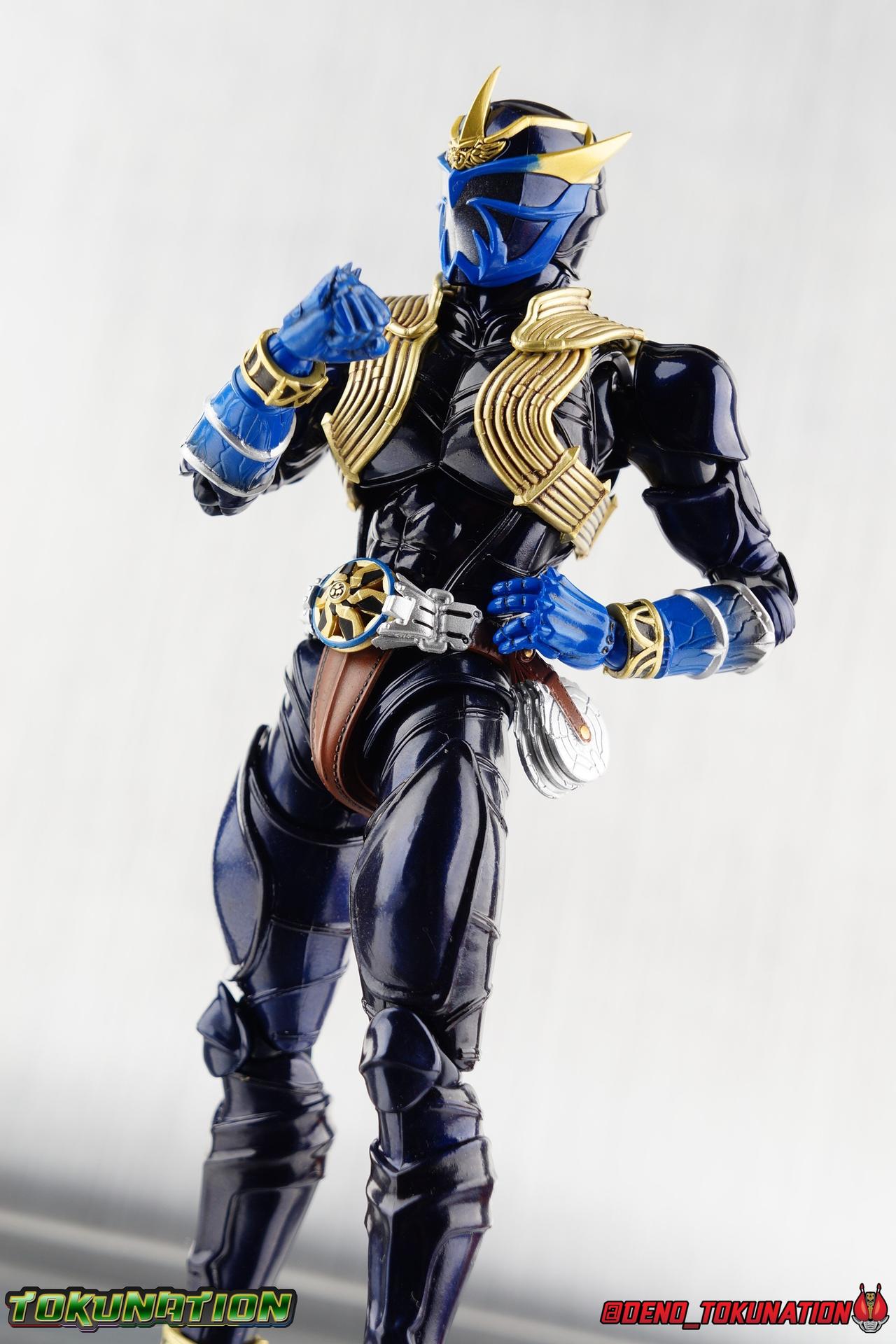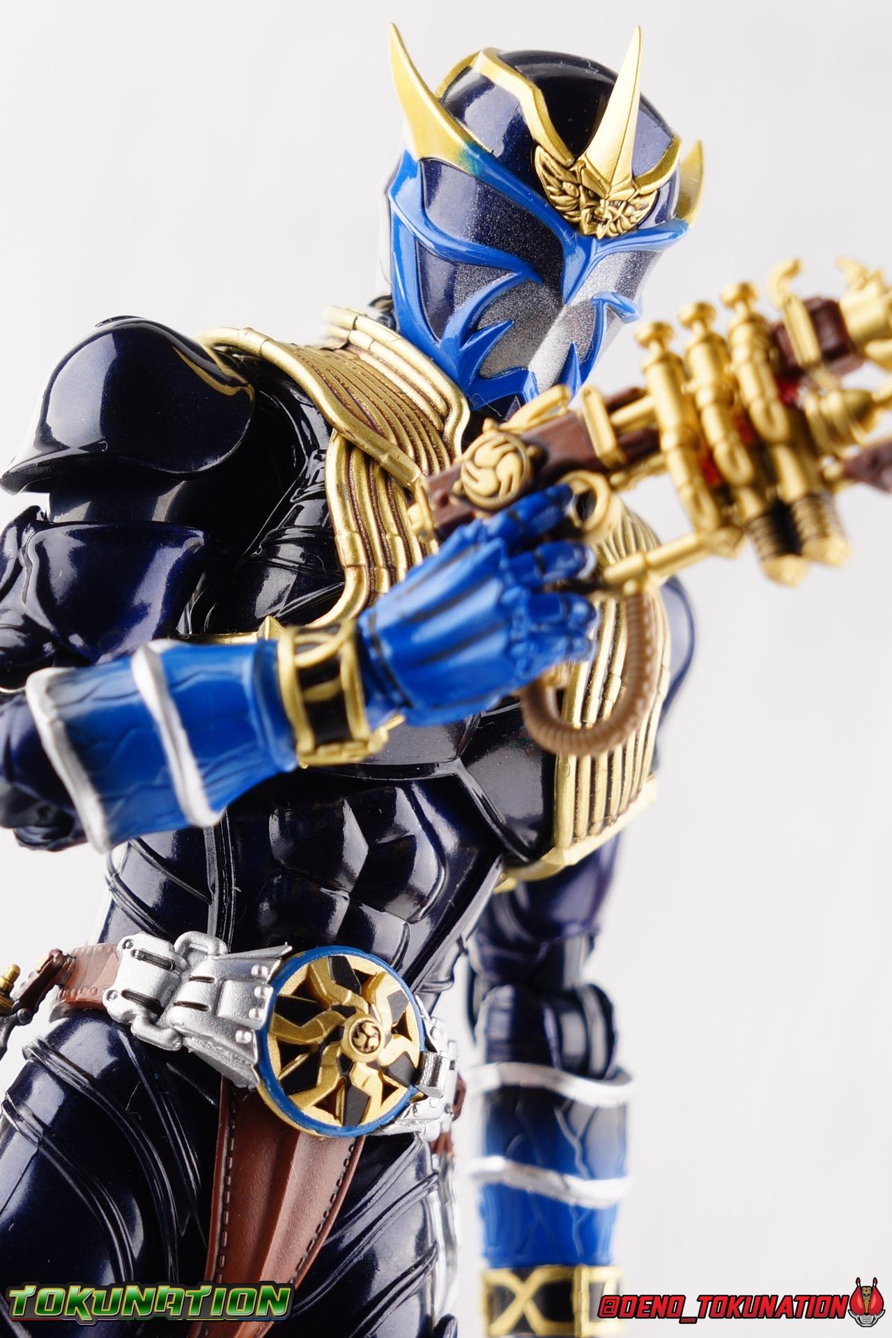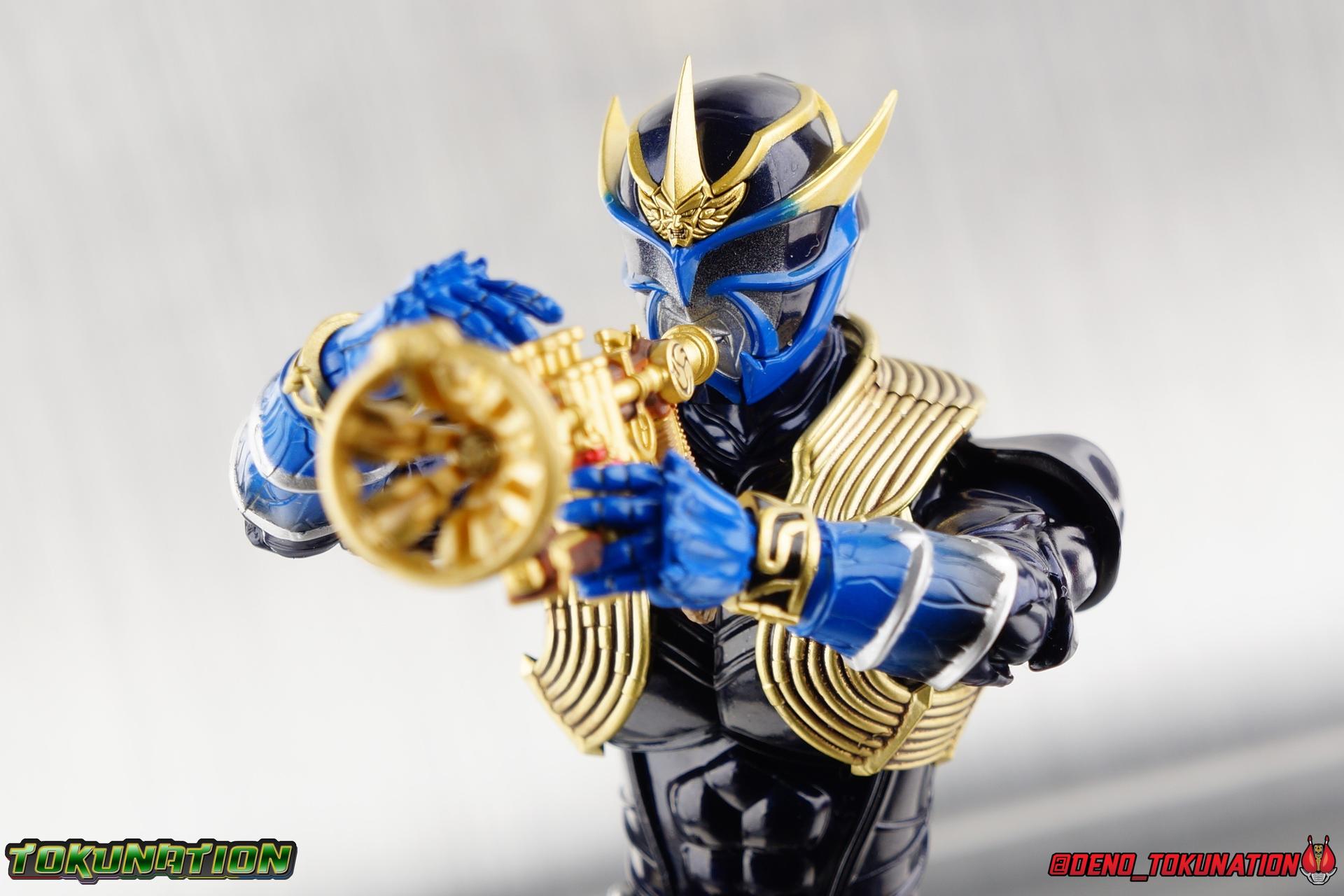 Iori Izumi was born into the head Oni family of the Kanto region. A prodigy driven by loyalty to his family, and to his duty to defeat the Makamou, Izumi fully abandoned his human identity and fully became the Oni of the Izumi family, Kamen Rider Ibuki! Convinced that he cannot be defeated, convinced of his family's strength, Ibuki is a formidable fighter and master of the trumpet weapon Ongekikan Reppuu. This Oni of breath will blow away any Makamou that stand in his path. And for the first time ever, Ibuki makes his debut in the S.H. Figuarts line as a Shinkocchou Seihou! Packaging It's the familiar Shinkocchou Seihou slip cover box once again! Not much can be said about it this time that hasn't been said before. It's gotten a bit stale (to me) over time but it's still a pleasing type of uniform collector's box. Main Figure First things first, like Hibiki, Ibuki is just a really pretty figure. The sculpt of this body type is superb, really bringing to life these unique Oni Rider suits. In every way imaginable it captures the look of the on screen suit right down to the textured musculature. The design process Seihou's go through has always been much much more involved than that of the standard figuarts line. The best example of this having been the special booklets that were included with Kabuto & Hibiki. When the design begins with a sort of skeletal inner frame, and builds out what would be like a suit on a real body like this, you get a much more realistic application of articulation and proportion to the body as a result. Now despite the obvious cosmetic changes, Ibuki is exactly the same basic figure as Hibiki. Featuring identical articulation even. When Bandai nails the design of the body, it can be truly astounding how outer level changes can create two vastly different figures from the same toy. But of course, even 4 years later some of my issues with this mold still persist. I've always found the legs to be quite odd. To me, they look really long and at odds with the torso, especially when bent for crouching poses. Something about them looks off. They function well enough, though I've always thought the Hibiki mold had one of the more strange figuarts hip joints out there. While the part separation undoubtedly gives them great range, the hips look very small by the time you angle them out fully, making the thigh seem huge by comparison. And while the knees function just fine, the feet irk me to no end. Despite being pretty big, too big if you ask me, they don't easily rest flat on any surface, and the toe bends are perpetually difficult to line up straight. It's just hard to get Ibuki or Hibiki for that matter, in a flat footed stance. Ibuki's belt is really loaded up with accessories like Hibiki. This figure comes with a lot any way, luckily you can store multiple things on the belt, in various interchangeable forms. When loaded out for static poses, Ibuki's right hip has the Henshin Onibue Onteki, Ibuki's transformation whistle. The left hip features a Disc Animal holster with 3 non-removable discs sculpted in. Straight out of the box, the center of the belt has Ibuki's Ongekimei Narukaze attached. This disc piece is removable to simulate how it combines with Ibuki's Ongekikan Reppuu, though it does not actually combine with either of the Reppuu's included with the figure. It can be used with any Oni Rider that has a similarly designed belt. The upper body is identical to Hibiki, just removing the silver accent parts and replacing them with golden trumpet like tubing. The upper and lower halves of the torso move well enough, independent of one another, though it's a tight fit to get either to move very far. I've always felt this body type was a bit stiff, but it gets the job done. Ibuki's arms are basically identical to Hibiki, though like the rest of the body are painted in a nice glossy blue rather than Hibiki's metallic purple. The shoulder pads still annoy me to no end, they just pop off basically all the time. And like Hibiki, Ibuki has a stunning headsculpt. In particular the blue lines along the faceplate and visor are crisply painted, while the visor itself has a near perfect silver fade into the blue of the helmet. Likewise the blue on the visor transitions into gold on the horns near perfectly. And the sculpt on the second Oni face on the forehead is just spot on perfect. The tubing around the neck can impact some of it's outward movement, but overall it's just incredibly nice looking. While I have my gripes about the various components of the figure, the total package taken at once is really very nice. Accessories Much like Hibiki, Ibuki is fully loaded: 4 - sets of hands. This gives you basically everything you need to hold any of the included accessories, though the ones intended to hold the Reppuu do not work well at all. In it's complete form it's intended to be held from the center like an actual trumpet, rather than the trigger and stock as the gun form is. But the hand meant to hold it has a very very poor grip. I also really wish there were more and proper expressive open hands. There just aren't really the right hands to make Ibuki feel like he's really moving. 1 - Ongekikan Reppuu (gun mode). This incomplete form of the Reppuu is what Ibuki uses most often for basic attacks against Makamou. Held like a traditional side arm, this is how I prefer to pose him for display. 1 - Ongekikan Reppuu (trumpet mode). The Trumpet mode in show takes the Reppuu and combines it with the Narukaze on Ibuki's belt to form the end of the instrument. The mouthpiece would also be removed from the front section and plugged onto the back. The Figuart opts to just have this version of the Reppuu included as a complete weapon so you don't risk losing any tiny parts. Which at this scale I'm totally okay with. 1 - open mouth head. When Ibuki uses the Reppuu in Trumpet mode to actually play it properly as an instrument to attack Makamou, a sculpted mouth appears on his helmet. Thank