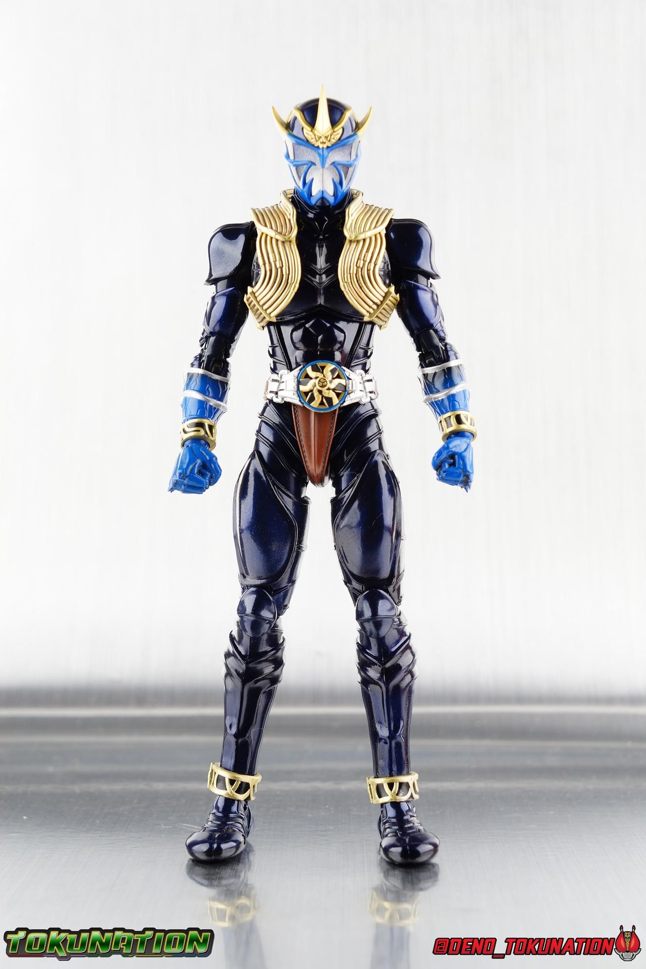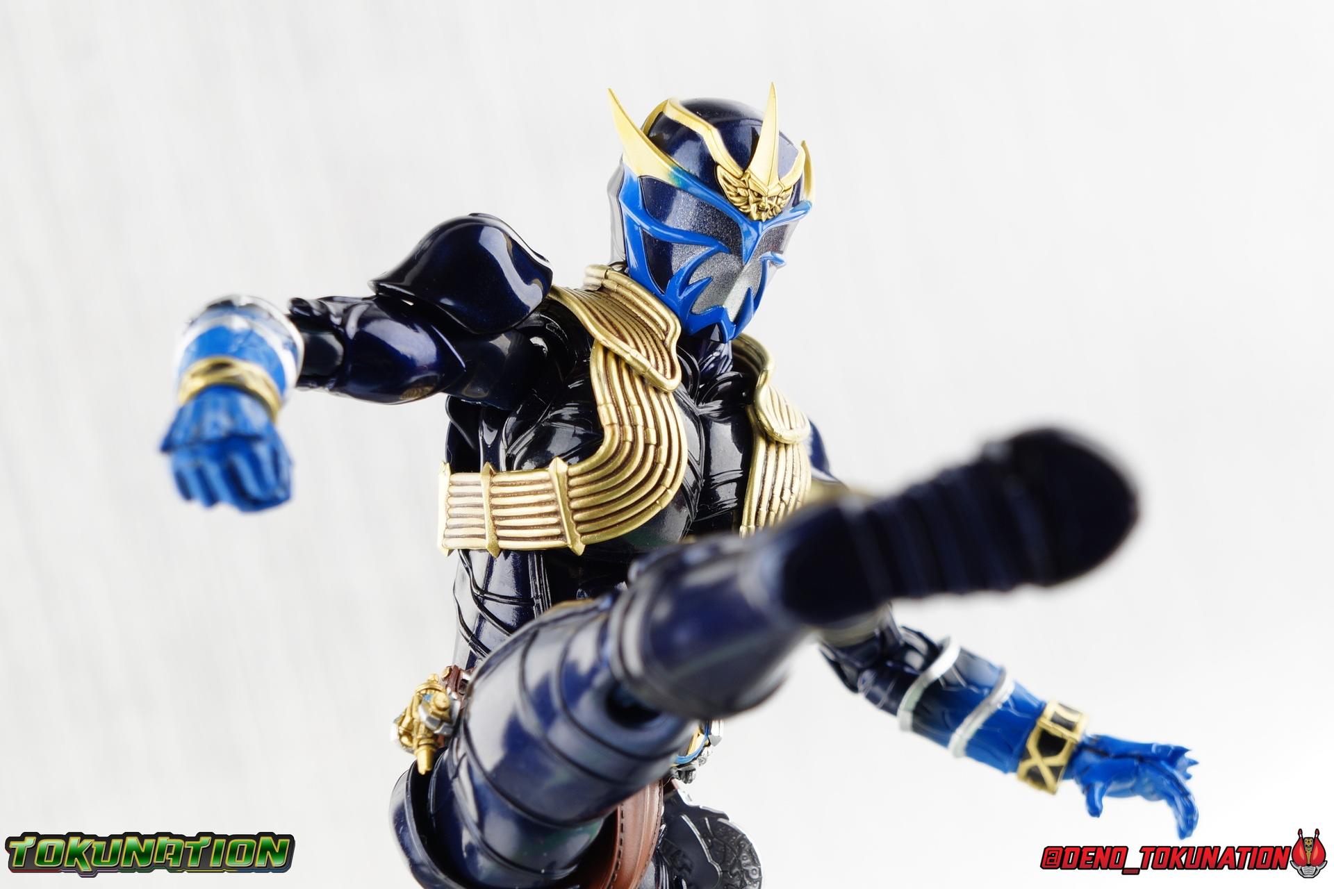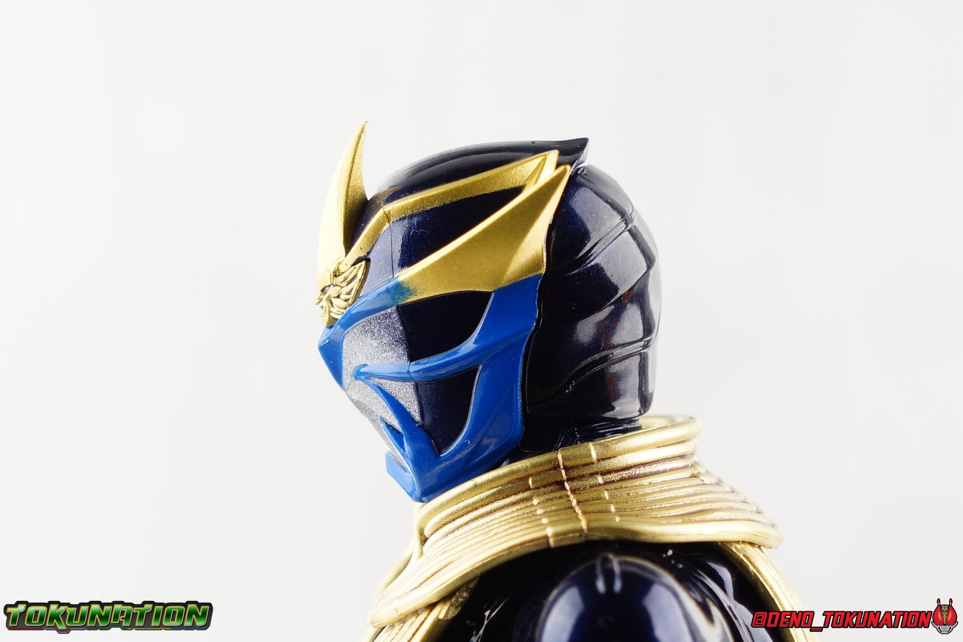 Iori Izumi was born into the head Oni family of the Kanto region. A prodigy driven by loyalty to his family, and to his duty to defeat the Makamou, Izumi fully abandoned his human identity and fully became the Oni of the Izumi family, Kamen Rider Ibuki! Convinced that he cannot be defeated, convinced of his family's strength, Ibuki is a formidable fighter and master of the trumpet weapon Ongekikan Reppuu. This Oni of breath will blow away any Makamou that stand in his path. And for the first time ever, Ibuki makes his debut in the S.H. Figuarts line as a Shinkocchou Seihou! Packaging It's the familiar Shinkocchou Seihou slip cover box once again! Not much can be said about it this time that hasn't been said before. It's gotten a bit stale (to me) over time but it's still a pleasing type of uniform collector's box. Main Figure First things first, like Hibiki, Ibuki is just a really pretty figure. The sculpt of this body type is superb, really bringing to life these unique Oni Rider suits. In every way imaginable it captures the look of the on screen suit right down to the textured musculature. The design process Seihou's go through has always been much much more involved than that of the standard figuarts line. The best example of this having been the special booklets that were included with Kabuto & Hibiki. When the design begins with a sort of skeletal inner frame, and builds out what would be like a suit on a real body like this, you get a much more realistic application of articulation and proportion to the body as a result. Now despite the obvious cosmetic changes, Ibuki is exactly the same basic figure as Hibiki. Featuring identical articulation even. When Bandai nails the design of the body, it can be truly astounding how outer level changes can create two vastly different figures from the same toy. But of course, even 4 years later some of my issues with this mold still persist. I've always found the legs to be quite odd. To me, they look really long and at odds with the torso, especially when bent for crouching poses. Something about them looks off. They function well enough, though I've always thought the Hibiki mold had one of the more strange figuarts hip joints out there. While the part separation undoubtedly gives them great range, the hips look very small by the time you angle them out fully, making the thigh seem huge by comparison. And while the knees function just fine, the feet irk me to no end. Despite being pretty big, too big if you ask me, they don't easily rest flat on any surface, and the toe bends are perpetually difficult to line up straight. It's just hard to get Ibuki or Hibiki for that matter, in a flat footed stance. Ibuki's belt is really loaded up with accessories like Hibiki. This figure comes with a lot any way, luckily you can store multiple things on the belt, in various interchangeable forms. When loaded out for static poses, Ibuki's right hip has the Henshin Onibue Onteki, Ibuki's transformation whistle. The left hip features a Disc Animal holster with 3 non-removable discs sculpted in. Straight out of the box, the center of the belt has Ibuki's Ongekimei Narukaze attached. This disc piece is removable to simulate how it combines with Ibuki's Ongekikan Reppuu, though it does not actually combine with either of the Reppuu's included with the figure. It can be used with any Oni Rider that has a similarly designed belt. The upper body is identical to Hibiki, just removing the silver accent parts and replacing them with golden trumpet like tubing. The upper and lower halves of the torso move well enough, independent of one another, though it's a tight fit to get either to move very far. I've always felt this body type was a bit stiff, but it gets the job done. Ibuki's arms are basically identical to Hibiki, though like the rest of the body are painted in a nice glossy blue rather than Hibiki's metallic purple. The shoulder pads still annoy me to no end, they just pop off basically all the time. And like Hibiki, Ibuki has a stunning headsculpt. In particular the blue lines along the faceplate and visor are crisply painted, while the visor itself has a near perfect silver fade into the blue of the helmet. Likewise the blue on the visor transitions into gold on the horns near perfectly. And the sculpt on the second Oni face on the forehead is just spot on perfect. The tubing around the neck can impact some of it's outward movement, but overall it's just incredibly nice looking. While I have my gripes about the various components of the figure, the total package taken at once is really very nice. Accessories Much like Hibiki, Ibuki is fully loaded: 4 - sets of hands. This gives you basically everything you need to hold any of the included accessories, though the ones intended to hold the Reppuu do not work well at all. In it's complete form it's intended to be held from the center like an actual trumpet, rather than the trigger and stock as the gun form is. But the hand meant to hold it has a very very poor grip. I also really wish there were more and proper expressive open hands. There just aren't really the right hands to make Ibuki feel like he's really moving. 1 - Ongekikan Reppuu (gun mode). This incomplete form of the Reppuu is what Ibuki uses most often for basic attacks against Makamou. Held like a traditional side arm, this is how I prefer to pose him for display. 1 - Ongekikan Reppuu (trumpet mode). The Trumpet mode in show takes the Reppuu and combines it with the Narukaze on Ibuki's belt to form the end of the instrument. The mouthpiece would also be removed from the front section and plugged onto the back. The Figuart opts to just have this version of the Reppuu included as a complete weapon so you don't risk losing any tiny parts. Which at this scale I'm totally okay with. 1 - open mouth head. When Ibuki uses the Reppuu in Trumpet mode to actually play it properly as an instrument to attack Makamou, a sculpted mouth appears on his helmet. Thank