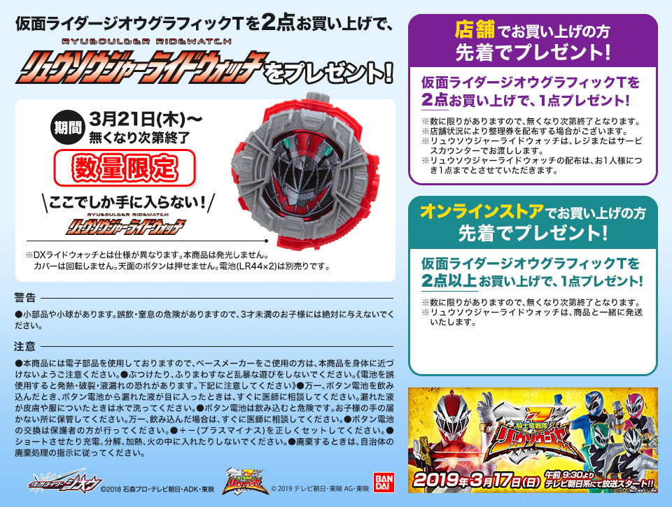 The Ryusoul Red SG Ridewatch will be made available exclusively through Uniqlo stores in Japan. 3/21 is the start of the giveaway campaign, customers will have to buy two Kamen Rider Zi-O graphic T-Shirts to qualify for it. Quantities will be limited, so expect this Ridewatch to increase in value on the secondary market pretty quickly. This is an SG Ridewatch, not DX, but it of course will still work just fine with the DX Ziku Driver.
