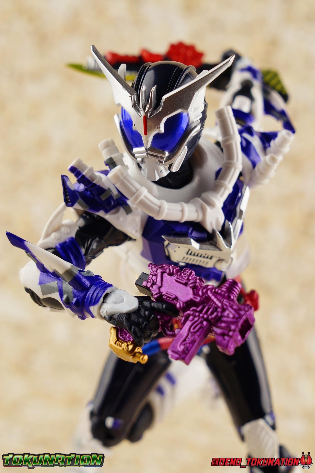 Utsumi Nariaki was one of the Nanba Children. Raised to be loyal to one man only, Juzaburo Nanba, he spent his life in service to his mentor. Loyal until the day Juzaburo was murdered, Utsumi faithfully served. But seeing his master's death at the hands of Kamen Rider Evol pushed him over the edge. With Utsumi's spirit broken, he was faced with the impossible option to take revenge, or serve Evol. Accepting the power of the Evol Driver and rejecting the pain of his grief, Utsumi is reborn as Kamen Rider Mad Rogue! Packaging As with practically all Build releases Mad Rogue has a pleasing two tone package design. Nothing's really changed aside from color choice and stock photos this go around. Main Figure The 4th times the charm right? If you're looking at Kamen Rider Mad Rogue and thinking that he looks pretty familiar, then you'd be right. This is the 4th outing so far of the mold at the core of this figure from Build's lineup. Previously we've seen a lot of this figure through Night Rogue, Blood Stalk, and of course Hell Bros. So you know what to expect out of a lot of this mold. That being said, I think this may be the best version of it released yet. Much like Night Rogue, Mad Rogue has an under suit that is ostensibly black, but upon closer inspection looks to be a dark dark blue instead. So far, Hell Bros is the only release that's used the brown suit parts. Now one of the few flaws I originally found with the mold, was the ankle design. Because of the way the cuff of the shin armor comes down around them, you do lose a small portion of movement in all directions. But the ankle ball is also designed in such a way that you can't really angle the feet outward properly. It's still a bother but it still works well enough too. Despite appearances, the bulk of the thighs doesn't impede leg movement either. As with the others, this figure can pose with the best. As before with this mold, I recommend you definitely pull the hips down far enough before moving them up, if you don't then the waist armor can dig some small grooves into the hips. The hips on this release are quite tight as well. This release of the mold also features the first driver attached to it, as well as the first release of Evol Driver itself. While the just announced Kamen Rider Evol will also feature this Driver, Mad Rogue is the first physical release of it in this line. A lavish repaint of the Build Driver in Gold, Red, & blue and features two new Full Bottles. The Bat & Engine Bottles. Both are removable as with any version of this mold and can interact with any accessory in the line that accepts them. The really pronounced difference with this release is of course the new molding and colors for the upper body. I should have mentioned the new white shin pads on the legs before, because they really help break up all that black as well, and tie it all together. While the upper body is hugely different, it shares so much with Night Rogue. Nearly all the parts are physically identical, but in a radically different paint scheme. And I can't be the only one who sees Mad Rogue and thinks he looks an awful lot like Transformers G2 Blast Off right? Anyways, the lower torso is the same part as what's featured on night rogue. In this instance the cables running around the ribs are left black, while the ab section is painted silver letting it stand out a bit more. The chest armor is really gorgeous. Basically the only molded difference is the new grill with the bat emblem that replaces the old gold bat on Night Rogue. But it's that stark difference from black/gold/silver to purple/silver/white that really sells how gorgeous this figure is by comparison. And I was seriously wowed by Night Rogue at the time of release. Mad Rogue has lot's of room to move in his waist and also has the same fluid movement in the upper torso as his mold predecessors. The arms are likewise identical molds, just with the new paint job. I have to say that I thoroughly enjoy the way the purple on white does look like a camouflage pattern. Again it's just amazing the stark difference that a paint job and a few new parts can illustrate. While the bicep swivel works wonderfully the elbow still can only hit about a 90 degree angle. Luckily this release does have the same great shoulder pads as Night Rogue giving him plenty of range that Hell Bros & Blood Stalk did not. The wrist joint is still a bit too close to the wrist cuff so you lose a bit of up and down movement, but ultimately the loss doesn't amount to much of an issue in the end. Finally Mad Rogue has a brand new head that takes inspiration from his mold mate & name sake Night Rogue. While still absolutely portraying a bat theme it's done very differently. Honestly this head has always evoked the look of Kamen Rider Saga from Kiva to me. Between the bat theme and the colors this rider as a whole reminds me of Saga or perhaps even Kiva-La. All in all this figure has turned out wonderfully and I think easily is the most striking and interesting use of the Kaiser/Transteam System body type we've gotten so far. Accessories As with any Build Rider worth their salt, Mad Rogue comes with everything he needs: 1 - Nebula Steam Gun. This is a straight repack of the accessory that Kamen Rider Rogue came with. Which is interesting given the the Hell Bros release included a purposefully different version of the weapon. This also marks the 5th release of this weapon across the line. Night Rogue, Blood Stalk, Rogue, Hell Bros, Mad Rogue. 1 - Steam Blade. A repack of the components that have been included with the Nebula Steam Gun, 5 times now. Use them as a stand alone blade, or the Nebula Steam Gun can still use them in the exact same way, combining to form the Nebula Steam Rifle. 3 - sets of hands. That's a set of open pose hands, 1 for holding the gun, and 1 for holding the blade. Everything you need! Given the late stage appearances of Mad Rogue, his arsenal was pretty focused, so this is a pretty much perfect