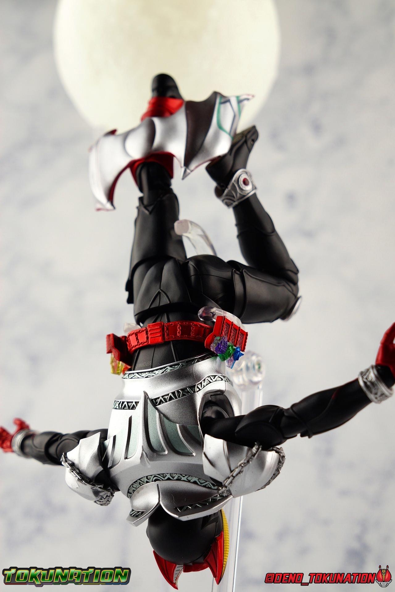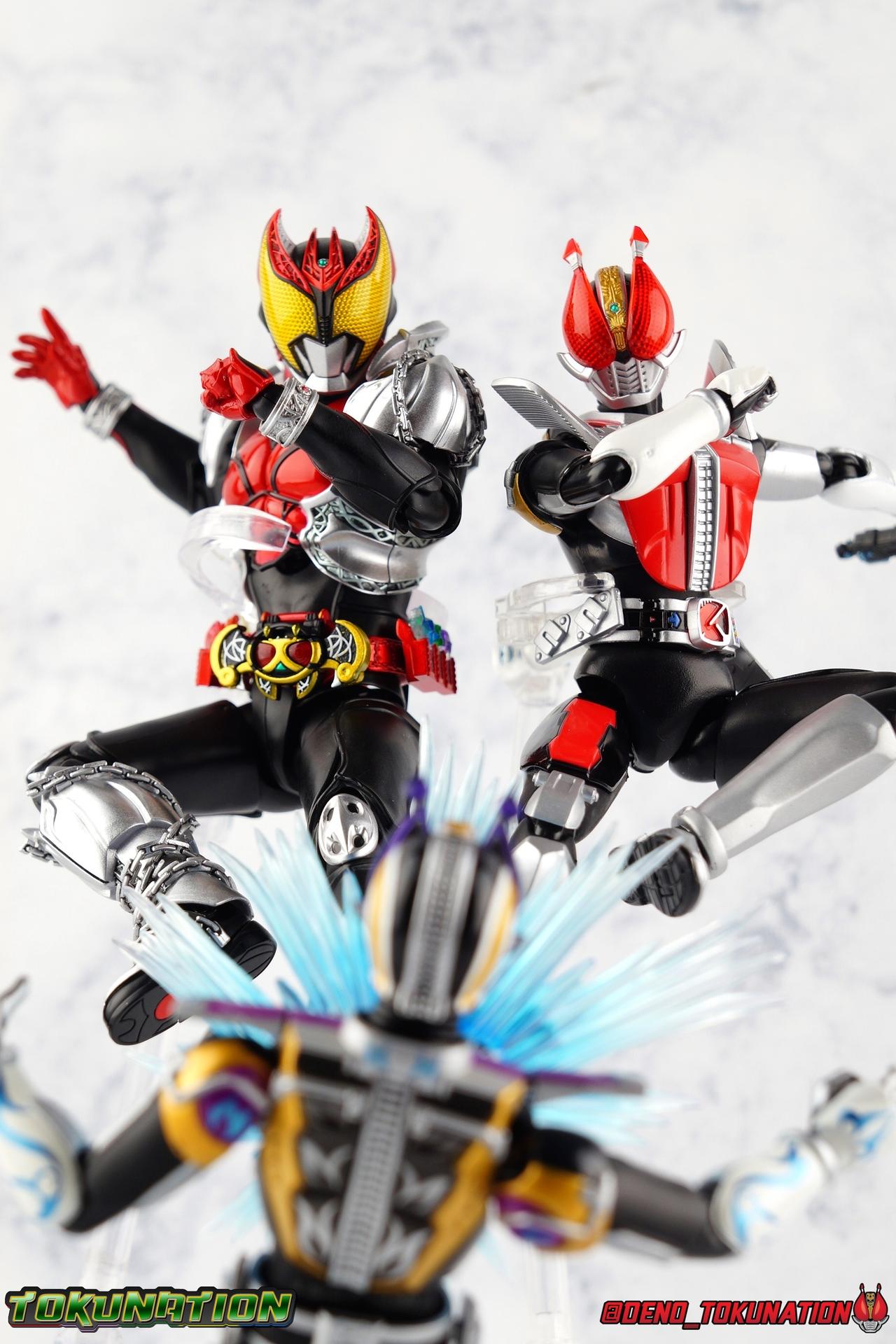 The shy young man Wataru Kurenai would rather spend his time crafting violins as his father Otoya did in life. But given that he's the son of the Fangire Queen as well, he was destined to become Kamen Rider Kiva, the Fangire King. And like the King's before him Wataru has one trusted partner, a member of the Kivat family, Kivat Bat III. With Kivat in tow, Wataru sets out to fight Fangires and protect humanity, just as his father did 20 years prior. But can Wataru overcome the fear and anxiety that have haunted him his entire life? Can he break the chains of his own fate and save the world? With a host of friends, family, and allies along the way, the history of Kiva and the Fangire plays out, across the past & present! It's time to break the chains and bust out a long awaited brand new gallery from Kamen Rider Kiva! S.H. Figuarts collectors have waited with baited breath for years, and years, for Tamashii Nations to finally deliver on the promise of Kiva. Well it may have taken until the end of the Heisei Era but he's finally here and we couldn't be more excited to share a proper review of S.H. Figuarts Shinkocchou Seihou Kamen Rider Kiva! ** This gallery contains 100 images, and is spread across the first three posts of this thread. Skip below to see the good stuff if you like! Packaging It's the familiar Shinkocchou Seihou slip cover box once again! Not much can be said about it this time that hasn't been said before. While it hasn't really changed, maintaining the same basic form factor with every single release, it's still a pleasing type of uniform collector's box thats great for storage. It's just great to finally see one of these boxes with Kiva's art adorning it! Main Figure It's been some time since the last new mold joined the Shinkocchou Seihou line. In fact Seihou Wizard was the last brand new mold the line gave us and that was last year. Since then we've had a few remolds/repaints but Kiva is the first truly new figure in a while. And with the Seihou line in particular, that always brings huge levels of excitement, and big expectations. How does the long awaited king stack up? Find out below! Kiva is an incredible addition to the line. I've said this many times with Shinkocchou Seihou releases in the past, but this one truly looks like it walked off the screen. It's an absolutely stunning recreation. From an engineering standpoint I'd say it's one of the best as well. The W mold was my long time favorite from the line, Rider 1 really upped the ante, and Wizard was an absolute delight. While I'm not sure that Kiva necessarily blows any of the other releases away, it is remarkably nice. Starting with Kiva's feet and legs, they provide a very solid base of support. The asymmetrical design of his right leg has always struck me as well, the chains always draw my attention. It's just such a unique look that sticks with you, much like how I've always loved Kamen Rider Kickhopper's leg design. For their part, these chains are molded in place but have some minor flexibility to them so that you can hopefully avoid litearlly breaking them. Kiva's toe bends function properly on both feet despite the bulk of the chains on one and the ankle tilts seem to be pretty even as well. Always good to see asymmetry that somehow still leads to symmetrical articulation cuts. The knee bends leave a little to be desired, coming out to about a 45 degree angle, but the hips make up for this shortcoming with a wealth of range. Which is totally necessary to recreate that iconic kick pose of Kiva's. Kiva's waist in it's dormant state out of box is just the red Kibuckle belt which holds his driver and trinkets. Fun fact, Kiva's belt was actually the final Heisei henshin belt to not be called a "Driver". From Decade on we've had nothing but Drivers. You'll need to grab the 6 individual Fuestels and 2 Fuestel holders included with Kiva and attach them to the sides of the belt to get his hips looking right. The big thing here of course is really the second star of the Kiva show, Kivat Bat III! The talkative sidekick to Watar Kurenai, Kivat also allows him to transform into Kamen Rider Kiva. On his own, Kivat is a tiny but slightly poseable bat. The ends of his wings can rotate up to simulate flight while his mouth opens to simulate his speech as well as to accept Fuestles. A small tamashii stage adapter is included to let you display Kivat flying around Kiva as well. To get him on the belt just plug his feet over the bar along the top of the belt and rotate him down, plugging him in place. He can still accept Fuestels in this state as well, plenty of clearance for the mouth to open. Kiva's upper body does some really interesting things that I appreciate too. The red armor that makes up his chest extends down around the ab area of the figure. Despite appearing to be one piece, the lower section actually sits under the chest and is independently articulated. As you push the torso down towards the waist, arching the back, the abs push up into the chest. This increases the range of movement and makes for more natural articulation as well. If you straighten the torso back out, you can see where th e tip of this ab armor is sort of tucked up into the chest and there's a small gap, pushing it back down seamlessly fills the torso once more. It's really genius. Likewise the figure's back also tries something interesting. The entire chunk of armor that makes up the collar around Kiva's neck and the armor extending down his back, is on it's own sort of raised joint that allows it to lift up from the back & shoulders. This gives the figure an interesting clearance extension. It's unnecessary, kind of bizarre, but really cool and appreciated. While side to side torso movement may be hindered somewhat by the silver armor around Kiva's ribs, it's hard to deny just how good and seamless the entire upper body looks. At first glance every bit of it look likes one piece, but there's so much complexity involved. I was worried tha