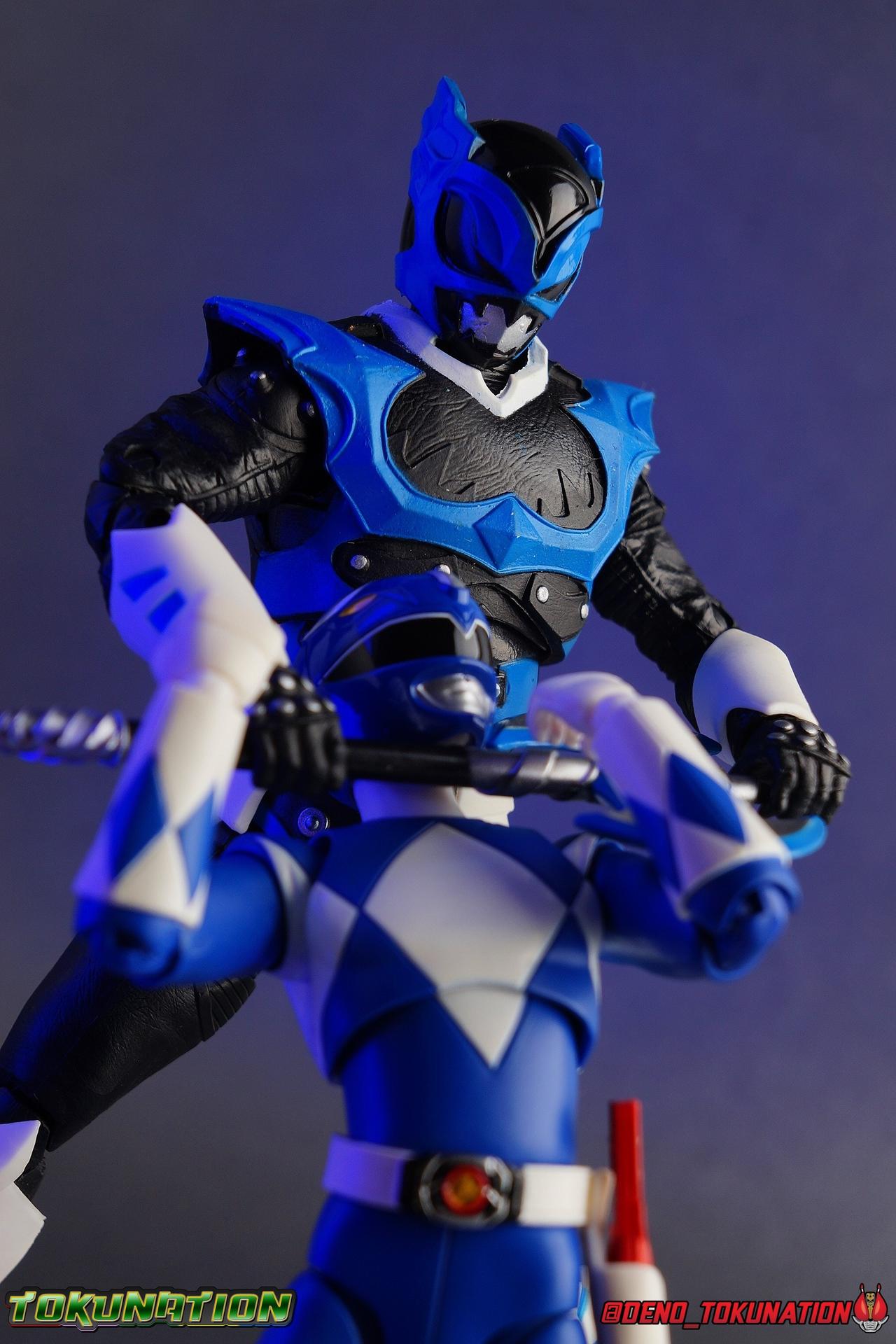As the Space Rangers quest through the stars to save Zordon and bring peace to the galaxy, the newly brainwashed Astronema has finally found the key to their defeat. Drawing their power from the great Dark Specter, these malevolent machines are faster smarter stronger, and evil. First posing as the Power Rangers then attacking them relentlessly, the Psycho Rangers hide even more monstrous strength just below the surface. Each Psycho Ranger is programmed to ruthlessly hunt down the opposing Power Ranger of their color, and Psycho Blue will stop at nothing to find and defeat TJ, the Blue Space Ranger. Easily the most memorable and powerful team of evil rangers in franchise history, the Psycho Rangers have earned their place in the hearts of fans and collectors. So it's no surprise that seeing this team shaping up in Hasbro's Lighting Collection line has been received so well. Let's dive in and see just how much of an improvement the Hasbro Psychos are compared to the slightly older Bandai America releases! Packaging As we are all pretty familiar with the line by now, I'm sure I probably don't need to go through my usual list of reasons why it's awesome. Hasbro was keen to make sure these appealed to collectors and fans of the franchise from throughout it's various eras. And they also really pop thanks in no small part to some wonderful box art, lovingly crafted by artist Tom Whalen aka @strongstufftom on twitter. His artwork is breathtaking, and makes these figure's feel like just a bit more of a passion project from the folks at Hasbro. Psycho Blue's profile artwork takes up a majority of the packaging, while the back of the box is relegated to a single stock photo of the figure. Like Goldar and the recently released Dragon Shield Black Ranger, Psycho Blue features a non-standard color palette for the box. Main Figure Who would have thought, even just a year ago, that we'd be on our second round of Psycho Ranger figures? In the dying days of Bandai America's grip on the Power Rangers license, they did finally cater to at least one big fan demand by beginning to release Psycho Rangers in their Legacy Collection 6.5" line. Since their appearance in Power Rangers In Space in 1998, the Psycho Ranger designs had never been translated to toy form. In fact, no proper figures had ever been produced of these characters even for Denji Sentai Megaranger the year prior. So the prospect of having them at the time, was really appealing. That hopeful prospect was pretty quickly derailed by terrible QC on Bandai's Psycho's as well as the fact that they never even completed the team. Yellow & Pink were never released, while Psycho Silver & Boom! Comic character Psycho Green were exclusives. In comes Hasbro to save the day. Within their first year of having the Power Rangers license, the Lightning Collection line has now touched on a number of seasons and rangers that run the spectrum of the franchise. And now this includes a foray back to the days of In Space with their own takes on the Psycho Rangers. A true case of one upping Bandai's less than perfect attempt at the characters. Kicking off Hasbro's line is an odd choice, Psycho Blue. Released as a Gamestop Exclusive in the US (and through various other retailers internationally) Psycho Blue is our first look at the new Hasbro 6" mold that will be used to produced the rest of the team. While Understandably there may be some collector's who don't necessarily see many differences from the old Bandai Psycho's to Hasbro's, I'm here to tell you it's a world of difference. Hasbro's Psycho's come in at a much more agreeable scale than the old Bandai 6.5" line. As you can see bleow, when compared to other villains in the line like Zedd or Goldar, he's a bit shorter than them, and basically the same height as most of the Power Rangers in the line. While he also scales decently well with S.H. Figuarts. Oddly Psycho Blue is the first and so far only Blue Ranger of any kind in the Lightning Collection line as well, so I tossed in my S.H. Figuarts Tricera Ranger (MMPR Blue) as well as Vul Shark for some fun shots. Scale aside, the figure also functions much better than the last attempt at these characters, and sets a great bench mark for the rest of the team. Just looking physically at these figures its oh so apparent how much more accurate the sculpt on the Hasbro figures are by comparison. Much of the articulation present in the Lightning Collection line is pretty standard, generally with a few adjustments to suit a new mold here and there. Psycho Blue starts with tried and true side to side rocker ankle joints and ratchets for forward and back. These provide plenty of range for wide stances and stability for the figure to lean front or back. As with other Rangers, Psycho Blue also has a hidden cut below the shin armor allowing you to rotate the leg beneath the knee joint, while the knee itself is double jointed to fold back upon itself. The upper kneew joints on mine function as normal, but the lower hinge is quite tight, so just be careful if yours is the same. The sculpt on the hips is much sharper and more accurate and disguises pretty well the thigh swivel, where the old Psycho figures had limited in set hip joints. The hips themselves aren't really obstructed in any appreciable way, so thankfully them combined with the ankles and knees gives you plenty of play for posing. The waist itself is another area of huge improvement. Where Bandai opted for soft flat surfaces, Bandai has fully sculpted raised 3 dimensional detailing, particularly on the hip armor and Psycho Ranger emblem. The upper body takes a page out of the book for basically all the shield wearing rangers in this line as well. Bandai handled the Psychos' torsos by making them two vertical parts, interlocked by an ab crunch joint. Hasbro opts to have a lower torso with ab crunch coming out the waist, while the upper body is on a floating rotating joint that can move independently and provide you a 