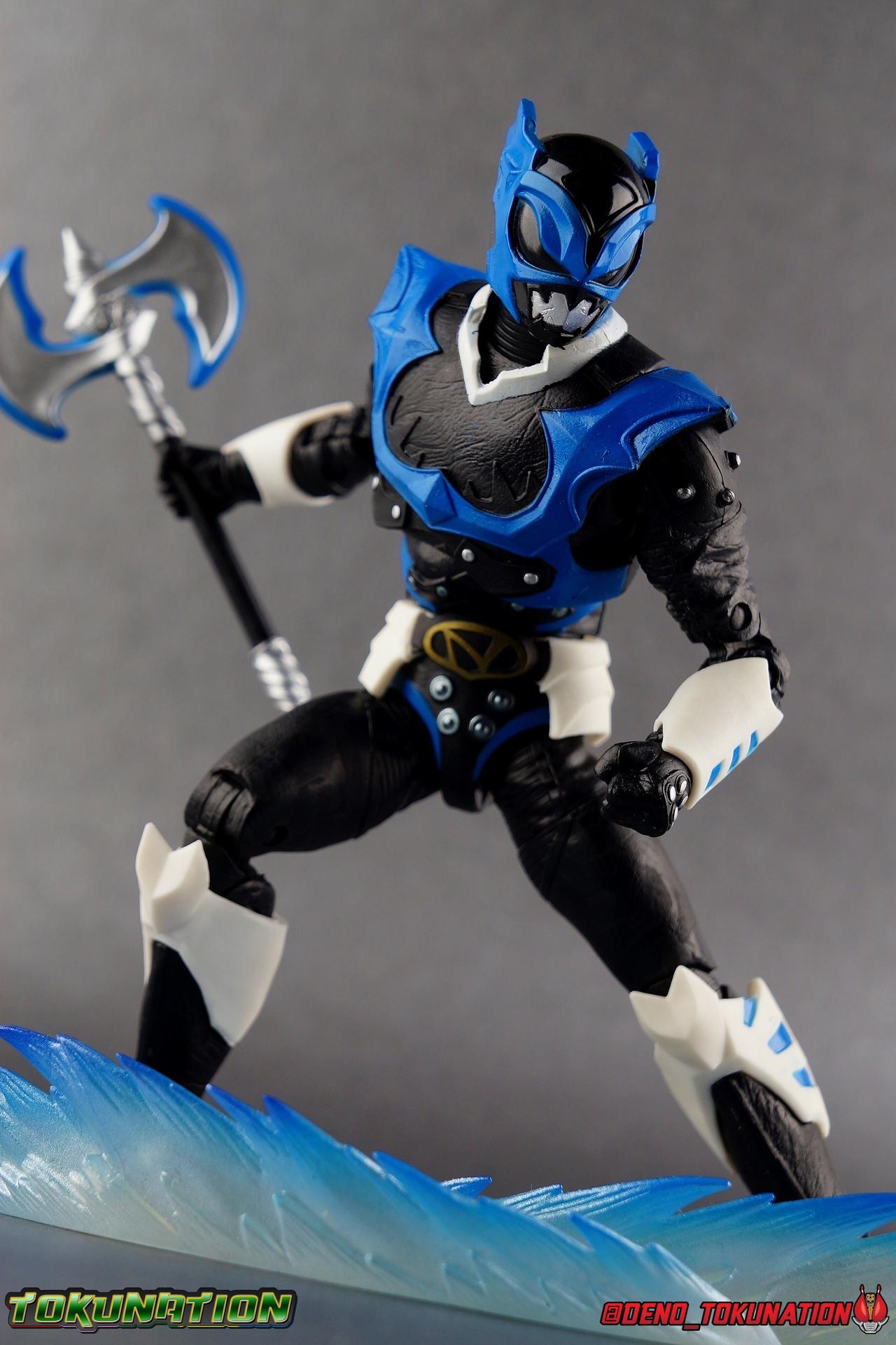 As the Space Rangers quest through the stars to save Zordon and bring peace to the galaxy, the newly brainwashed Astronema has finally found the key to their defeat. Drawing their power from the great Dark Specter, these malevolent machines are faster smarter stronger, and evil. First posing as the Power Rangers then attacking them relentlessly, the Psycho Rangers hide even more monstrous strength just below the surface. Each Psycho Ranger is programmed to ruthlessly hunt down the opposing Power Ranger of their color, and Psycho Blue will stop at nothing to find and defeat TJ, the Blue Space Ranger. Easily the most memorable and powerful team of evil rangers in franchise history, the Psycho Rangers have earned their place in the hearts of fans and collectors. So it's no surprise that seeing this team shaping up in Hasbro's Lighting Collection line has been received so well. Let's dive in and see just how much of an improvement the Hasbro Psychos are compared to the slightly older Bandai America releases! Packaging As we are all pretty familiar with the line by now, I'm sure I probably don't need to go through my usual list of reasons why it's awesome. Hasbro was keen to make sure these appealed to collectors and fans of the franchise from throughout it's various eras. And they also really pop thanks in no small part to some wonderful box art, lovingly crafted by artist Tom Whalen aka @strongstufftom on twitter. His artwork is breathtaking, and makes these figure's feel like just a bit more of a passion project from the folks at Hasbro. Psycho Blue's profile artwork takes up a majority of the packaging, while the back of the box is relegated to a single stock photo of the figure. Like Goldar and the recently released Dragon Shield Black Ranger, Psycho Blue features a non-standard color palette for the box. Main Figure Who would have thought, even just a year ago, that we'd be on our second round of Psycho Ranger figures? In the dying days of Bandai America's grip on the Power Rangers license, they did finally cater to at least one big fan demand by beginning to release Psycho Rangers in their Legacy Collection 6.5" line. Since their appearance in Power Rangers In Space in 1998, the Psycho Ranger designs had never been translated to toy form. In fact, no proper figures had ever been produced of these characters even for Denji Sentai Megaranger the year prior. So the prospect of having them at the time, was really appealing. That hopeful prospect was pretty quickly derailed by terrible QC on Bandai's Psycho's as well as the fact that they never even completed the team. Yellow & Pink were never released, while Psycho Silver & Boom! Comic character Psycho Green were exclusives. In comes Hasbro to save the day. Within their first year of having the Power Rangers license, the Lightning Collection line has now touched on a number of seasons and rangers that run the spectrum of the franchise. And now this includes a foray back to the days of In Space with their own takes on the Psycho Rangers. A true case of one upping Bandai's less than perfect attempt at the characters. Kicking off Hasbro's line is an odd choice, Psycho Blue. Released as a Gamestop Exclusive in the US (and through various other retailers internationally) Psycho Blue is our first look at the new Hasbro 6" mold that will be used to produced the rest of the team. While Understandably there may be some collector's who don't necessarily see many differences from the old Bandai Psycho's to Hasbro's, I'm here to tell you it's a world of difference. Hasbro's Psycho's come in at a much more agreeable scale than the old Bandai 6.5" line. As you can see bleow, when compared to other villains in the line like Zedd or Goldar, he's a bit shorter than them, and basically the same height as most of the Power Rangers in the line. While he also scales decently well with S.H. Figuarts. Oddly Psycho Blue is the first and so far only Blue Ranger of any kind in the Lightning Collection line as well, so I tossed in my S.H. Figuarts Tricera Ranger (MMPR Blue) as well as Vul Shark for some fun shots. Scale aside, the figure also functions much better than the last attempt at these characters, and sets a great bench mark for the rest of the team. Just looking physically at these figures its oh so apparent how much more accurate the sculpt on the Hasbro figures are by comparison. Much of the articulation present in the Lightning Collection line is pretty standard, generally with a few adjustments to suit a new mold here and there. Psycho Blue starts with tried and true side to side rocker ankle joints and ratchets for forward and back. These provide plenty of range for wide stances and stability for the figure to lean front or back. As with other Rangers, Psycho Blue also has a hidden cut below the shin armor allowing you to rotate the leg beneath the knee joint, while the knee itself is double jointed to fold back upon itself. The upper kneew joints on mine function as normal, but the lower hinge is quite tight, so just be careful if yours is the same. The sculpt on the hips is much sharper and more accurate and disguises pretty well the thigh swivel, where the old Psycho figures had limited in set hip joints. The hips themselves aren't really obstructed in any appreciable way, so thankfully them combined with the ankles and knees gives you plenty of play for posing. The waist itself is another area of huge improvement. Where Bandai opted for soft flat surfaces, Bandai has fully sculpted raised 3 dimensional detailing, particularly on the hip armor and Psycho Ranger emblem. The upper body takes a page out of the book for basically all the shield wearing rangers in this line as well. Bandai handled the Psychos' torsos by making them two vertical parts, interlocked by an ab crunch joint. Hasbro opts to have a lower torso with ab crunch coming out the waist, while the upper body is on a floating rotating joint that can move independently and provide you a 