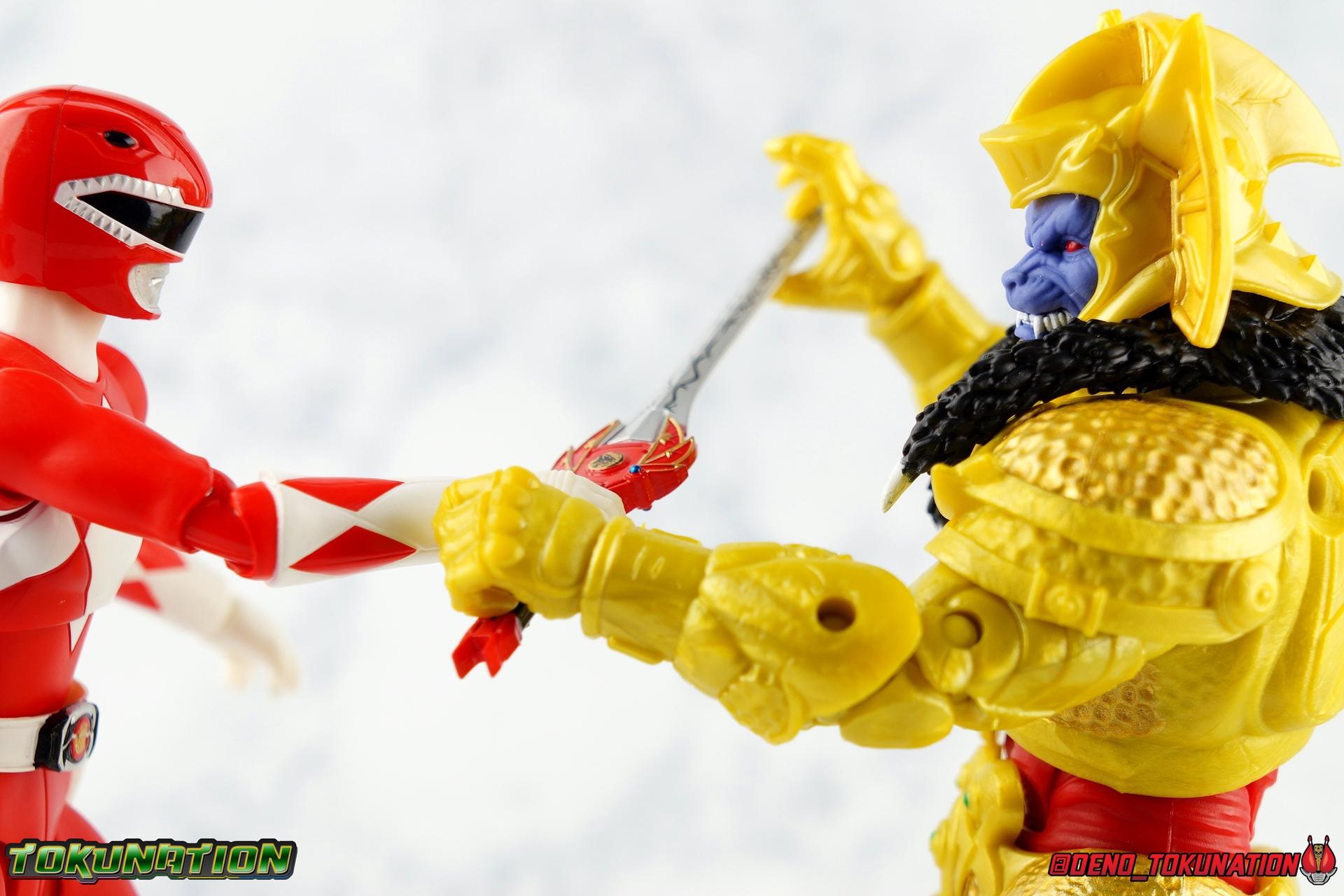 This mighty winged menace has been known to terrorize heroes far and wide across the galaxy. Waging wars on countless worlds, he's made his mark in the fight to control the universe. But after being freed from a 10,000 year slumber, the Power Rangers of Earth became his greatest foes. For millennia, he has served at the beck and call of his empress, Rita Repulsa. And even before that, he was a loyal general in the armies of the fearsome Lord Zedd. Born on Titan, Saturn's largest moon, the shining warrior Goldar is a force for all heroes to reckon with. For (more or less) 4 seasons and two movies Goldar has menaced the Power Rangers, while sometimes being a bit of a goof about it. While he fought the Mighty Morphin Power Rangers many times, as the series began to phase out of usable Zyuranger footage, he certainly took less of a starring villain role. But even by the time of the third season/Alien Rangers, he still had plenty of scenery to chew with his best bud Rito Revolto. Though he became more of a comedic relief character in Zeo (honestly my favorite characterization of him) he would eventually albeit briefly return for In Space. As a member of the Alliance of Evil, still faithfully serving Rita & Zedd. Goldar went out fighting as Zordon's light engulfed all evil in the galaxy, thus expunging it and him. Goldar is honestly one of the most complex villains the franchise has ever produced. Like Zedd, Rita, and Rito he's had multiple seasons of evolving characterization, but in his case even more so. Goldar is the standard bearer of all villains for this franchise. And his debut in the Lightning Collection toyline is honestly a huge deal to me, and I think it should be a huge deal to all collectors. For years fans begged Bandai America to make more villains. Hasbro has already delivered 3 pretty snazzy ones in this line so far with Lord Zedd, the Putty and now Goldar. Packaging In creating this line, Hasbro was keen to make sure they appealed to collectors and fans of the franchise from throughout it's various eras. Given the aim to make this appeal to an older crowd, the packaging seems to have taken a page out of the Star Wars Black Series book. In similar collector style boxes, the Lightning collection figure's look a bit brighter thanks to a primarily white color scheme. But they also really pop thanks in no small part to some wonderful box art, lovingly crafted by artist Tom Whalen aka @strongstufftom on twitter. His artwork is breathtaking, and makes these figure's feel like just a bit more of a passion project from the folks at Hasbro. Goldar's profile artwork takes up a majority of the packaging, while the back of the box is relegated to a single stock photo of the figure. I find this box delightfully loud and garish too. Goldar comes in a primarily orange and gold box, at odds with the predominantly white standard packaging of the rest of the line. So it's a nice pop of color to the otherwise uniform collection. Main Figure The likeness of this Goldar figure strikes (in my opinion) a pretty great balance of the original Grifforzer suit most often seen during MMPR season 1 Zyuranger based footage, and the slightly adjusted suit that would become standard in all american footage throughout the rest of his canonical appearances. As time went on in the American footage the particular type of gold coloring seemed to change a bit, but also a specific physical change was made to the suits' mouth after season 1, episode 45. As with any prop used for long term filming, wear/tear/repair takes a toll, and small fixes add up over time to make drastic change. I know some collector's may dislike the particular way this figure is colored, but I have to say, I think it's a fantastic compromise of the show suits used. The two movie designs are an entirely different can of worms we won't get into. It should be noted that the stock photo on the box portrays a uniformly gold painted figure, something I would have liked. But who knows what happened between the time that was mocked up, and the figure was actually getting ready to drop for mass production. But enough about paint, how about how the figure is engineered? Purely based on the finer details, this figure has the most intricate sculpt in the line, even more so than Zedd. Goldar is adorned with pads, and armor, and straps, and rivets, and fabric folds, the works. While the somewhat uniform color scheme can sometimes mask these details, on closer inspection they really do shine so to speak. The shins in particular features some of my favorites like the subtle scarring or fabric fold on the shin armor, or the sculpted leather straps that run around the back of the leg as though to keep the two halves of the muscle together. While impressive looking though, these shins do impact the foot's movement. The forward tilt of the ankle is sadly nullified, but the backward tilt works pretty well. Thankfully the ankle rockers can compensate somewhat, but even they suffer a bit from this design. The bulky sculpt of the legs is broken only by the glaringly narrow knees, particularly from a side view. Though the bulk of the lower legs still means you lose a little of the knee bend. If the ankles were less restricted then this wouldn't be a huge issue but as is it it's not a great mix. Goldar's waste skirt armor is something that looks absolutely stunning, but could have probably used another pass on design. The extra gold paint apps are gorgeous, though one of the green jewels isn't fully painted on mine. The back of the skirt has Goldar's tail molded to it, and although it's not a rigid plastic, it's not exactly flexible either so it may get in the way while posing. The armor itself as one an entire piece though really knocks out a lot of the usefulness of the hips themselves. It's quite frustrating how the design choices of the lower body impact the way the overall figure looks when posed, because everything else about it like the paint and sculpt are ex