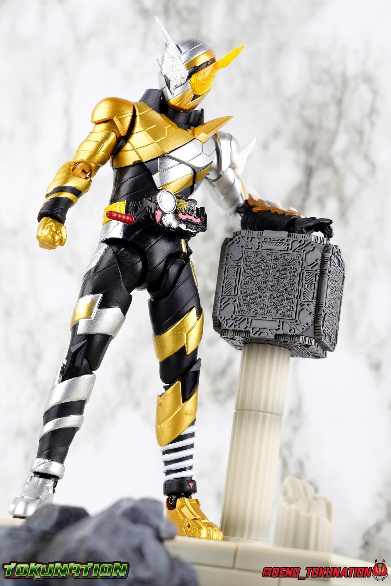 Two Earths, a single future. To save his world Sento has gambled everything on the power of the Pandora Box. Opening a bridge between universes, and using Evolt's energy as the catalyst, Sento seeks to fuse the two worlds to save them both. To create a New World, without Evolt. But when the alien menace possesses Ryuga one last time, Sento will use every last ounce of power he has to fight for this future. With Ryuga's help, one last experiment to save humanity begins. Gold & Silver, Rabbit & Dragon, Sento AND Ryuga. Build's final transformation, his Trial Form is born! With the unstable power of two Kamen Riders, can Sento save the New World he wishes to create? Packaging As a Tamashii Nations event exclusive, Rabbit Dragon has some seriously gorgeous packaging and box art. Event exclusives have gotten much more elaborate in recent years and this is by far the most gorgeous I've seen. The outer slip cover features the amazing logo for Tamashii Nations 2019 while the back side of it has a brilliant piece of monochrome artwork. Under the slip cover is the more standard type of Build packaging, but it still looks just a as good. Main Figure It shouldn't be any surprise by now, but I absolutely love Kamen Rider Build. The show resonated so much with me when it was airing. Few rider series have had the same impact on me that it did. It's right up there at the top with Den-O & Drive for me. So each new release this series manages to squeeze out is another small victory for me. And this form is something I absolutely never expected to happen, but always hoped for. Trial Form is honestly a pretty basic repaint for the most part. Much of this line is pretty basic parts reuse, with elaborate paint additions to differentiate them so Rabbit Dragon fits right in in that respect. The legs are physically identical to the base Build Rabbit/Tank form. If you haven't handled this mold by now, it's pretty great. The ankles don't have any armor to impeded their movement, the knees have a great back bend, and the hips are free of obstruction. As is usually the case with this mold these joints are nice and tight and provide a very stable base of support. The on indication in the legs you'll find that Cross-Z is part of this combination, is in the thighs. While the physical parts are from the original build mold, and we get new silver and gold paint apps, the right thigh features Kamen Rider Cross-Z's flame band paint app. The torso features yet another outing for the wonderful Build Driver. This item has made a number of outings in the line now, having only had significant paint alterations once with Mad Rogue. In this case the big change is in the Full Bottles. As the name of the form states, we get the Rabbit & Dragon bottles, which are not traditionally a Best Match, but due to Sento & Ryuga's bond, are compatible now. Rabbit is now Gold while Dragon is Silver. As always the bottles are removable and the crank on the right of the driver can turn. It's still one of my favorite 1/12 scale Drivers. There's still a Full Bottle holster on the left hip as well if you want to store any extra bottles there, though in my experience the fit is quite loose. Outside paint apps on the torso there are no mold changes. As always the combination of a ball jointed waste and upper body with a unique ab crunch, create a lot of possibility. I particularly love that the small angular part of the armor on the abs can actually hing upward allowing you to bend the torso a bit further. It was a feature I didn't even notice the first few times around with this mold, but ever since I discovered it it still blows me away. The right gold arm is the classic Rabbit/Dragon mold with no physical changes. The shoulder, elbow, and wrist all work fantastically allowing you to get Build in his signature poses. The right silver arm however, is a direct carry over from Cross-Z, and I love that sculpt so much. We get the protruding shoulder pad, the flame band on the bicep, the dragon flames molded into the forearm. I absolutely love it. Asymmetry in Build forms is my favorite aspect of them, and Rabbit Dragon illustrates this so so well. Finally, Trial Forms head is a wonderful fusion of Build & Cross-Z. Taking the right side Rabbit visor and combining it with half Cross-Z's dragon visor is a brilliant idea. The head itself is just builds without all the added Cross-Z bits, but the new compound eye combo looks brilliant in these colors. The Build line has absolutely some of the best Compound Eyes in the S.H. Figuarts line and Trial Forms just come alive in the right light. This whole figure comes alive. It's just stunning complete package. Absolutely everything I could have hoped for. Accessories This may seem sparse, but it's honestly perfect: 7 - additional hands. While we only get 2 left and 5 right, you get basically anything you need to replicate the forms briefs appearances as well as utilize other items in the Build SHF line. The gripping hands are good for using with the Machine Builder or Drill Crusher in particular. The expressive hands perfectly allow you recreate Build's poses, you get plenty of variety for display. 1 - Pandora Box. This is clearly the big draw of this figure. While the form itself is something truly special already, the inclusion of the Pandora Box is just the cherry on top. The build line has had quite a number of releases since it began, but the big question has always been, where on earth is the box? I was surprised it didn't come with the likes of Blood Stalk or Night Rogue, but seeing it finally hit the market like this is very satisfying. This is a hefty little cube with outrageously well defined details. The sculpt has so much depth and care put into it, it's a truly incredible little accessory. The only thing that could be better, is maybe one day getting the complete box with panels and molded in bottles. As is though, this is the ideal Build SHF accessory. This form has about a minute worth of screen tim