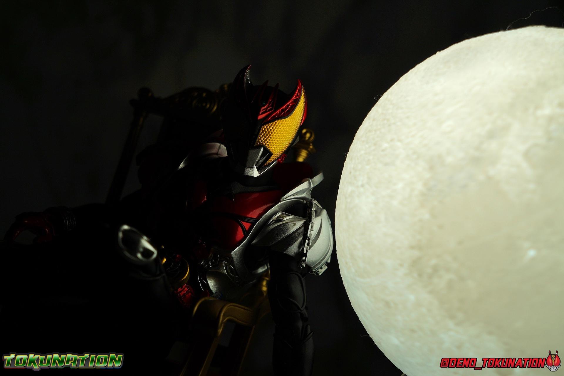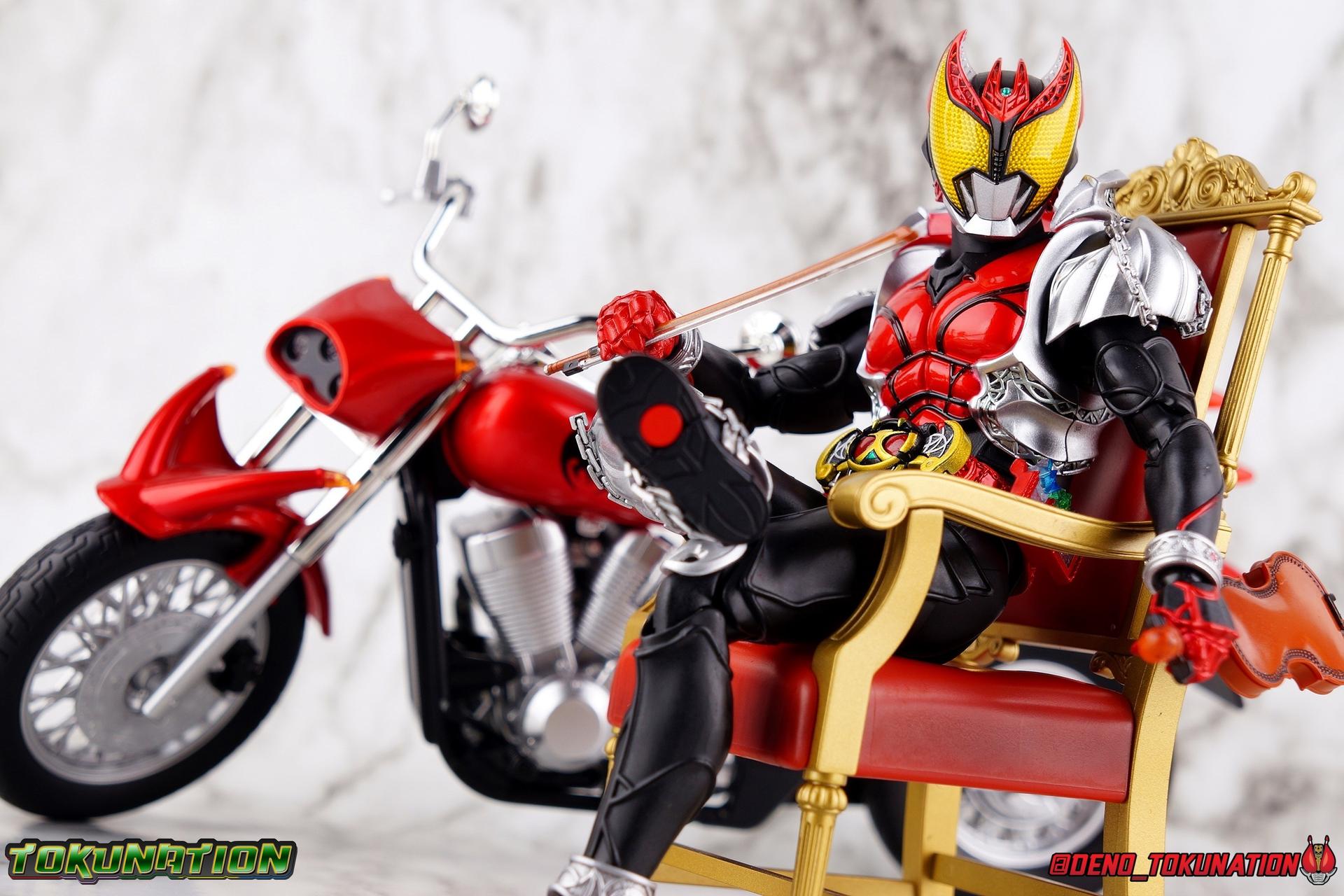 Wataru Kurenai was fated to be king. (No, not like you Zi-O!) As Kamen Rider Kiva, Wataru destroyed the Fangire's threatening humanity while still finding time to craft beautiful instruments as his father had before him. But what's a Kamen Rider without his well, ride? Overcoming his own fears and anxieties, Wataru discovered what real self reliance and confidence could do to transform a person. Though the whimsical talking belt certainly helps too! But what is a Kamen Rider without their, well, ride? Only a few short months after releasing the long demanded Shinkocchou Seihou Kiva, Tamashii has satisfied collectors once again by releasing not only his Rider Machine the Machin Kivaa, but also his signature throne and the Bloody Rose violin he inherited form his father! This massive accessory set completes any Kiva collection, and today we're breaking down the whole thing for a full gallery/review. Main Figure The biggest item, and maybe the big draw of this set if of course the Machine Kivaa. As I mentioned above, and I've said many time before, what's a rider without their ride? I find myself almost compelled to buy every Kamen Rider's bike to accompany their figuart. So seeing the Kivaa happen so soon after Kiva himself was incredibly satisfying. It's easy to look past bike and vehicle releases like this when they don't have transformations or action gimmicks as DX toy equivalents often do. We have to look more at the presentation and craftsmanship to get sense of value from these things. And in that regard, the Machine Kivaa is unmatched. Of the myriad number of S.H. Figuarts and accompanying vehicles I've handled in the last decade, the Kivaa is one of the most stunning. Kiva's bike is a bit unique among Rider Machine in that it's a street style bike (ala Hibiki) rather than a dirt biks (ala nearly everyone else). Based on a Honda Shadow 750, the curvature of the original chasis and design shine through the additional elements. It's a gorgeous standard bike anyway, but this facelift it's gotten as Kivaa is something else. The Figuart is superbly detailed, right down to the tread on each tire. No detail appears to be missing. Even the Speedometer is present thanks to a very crisp and very tiny label permanently affixed to it. The grooves on the engine are well defined and have depth. That gorgeous blood red glossy paint reflects light like the real thing from any angle. And the silver chrome that marks the handlebars and mirrors as well as the exhaust system, is truly magnificent. If you zoom in and look closely, you can even see my camera staring back at you in the chrome. It's that good! When Tamashii gets a chrome application right boy do they ever get it right. But more than just how it's detailed, this bike lives up to expectation as a magnificent vehicle for Kiva. It took 10 years of S.H. Figuarts to finally get Kiva himself, so when his bike arrived as well, it had to be a match made in heaven. And it is. Seihou molds are engineered so well, to function as closely to real people in actual suits as possible, that this figure looks natural and downright like a real person when seated on the bike. These two are a perfect pairing many years in the making in from Tamashii. On a funnier note, it's interesting that in the context of the series itself, we know that the Machine Kivaa is both sentient and houses the brain of a horse (presumably Fangire-like) creature. But the bike is oh so clearly designed like a bat on wheels. The blood red coloring of the bike would even helps suggest that link, but hey it's a horse apparently. Accessories While the Machine Kivaa itself is definitely a huge draw, if you're a big fan of Kamen Rider Kiva there's a good chance that the included accessories are what really sold you on the set: 1 - clear pedestal. I was confused at first when I saw this thing, but it's a brilliant little part. Rather than going for the mostly standard wheel base, or even including an optional Tamashii Stage adapter, the Machine Kivaa comes with it's own unique part. This small rectangle with a single peg on it plugs directly into the undercarriage of the Kivaa, with a couple grooves cut into it to work around the exhaust pipes even. This little block provides the most stable and balanced way to display an SHF bike I've ever seen. It's so simple, but brilliant and unobtrusive. 1 - Throne. While throne may be a bit more generous than calling it what it actually is, a fancy chair, it certainly looks regal. And with Kiva seated in this throne, it's hard to imagine doing anything else with him when he's not on the Machine Kivaa instead. Much in the same way Kiva looks like a real person riding a real motorcycle while sat on the Kivaa, in the Throne he looks much like the king he is. 1 - Bloody Rose violin & bow. Absolutely the signature item needed for any Kiva collection. I was astounded that the Bloody Rose wasn't included with Kiva himself, but waiting until now to include it with the Machine Kivaa is pretty brilliant. While basically any 1/12 violin would work fine with the figure, including the real deal in vehicle/accessory pack like this is a brilliant selling point to most fans. A gorgeously detailed accessory, it feels right at home in Wataru's hands. 2 - sets of additional hands. While the Seihou Kiva Figuart itself came with 2.5 sets of hands, it didn't include any specific to the accessories in this set, which at the time hadn't even been announced yet. So the added value of the sets we get here is a bonus on top of the excellent main item.s We get one set of Machin Kivaa hands so that Kiva's fingers are extended to grip the handlebars properly. And we get one asymmetrical set for holding the Bloody Rose & bow. The left hand for the rose, the right for the bow. Be careful putting the rose in hand though, it's pretty thin plastic and the gap it goes in isn't very wide. Always best to be careful. Considering this is a huge accessory set anyway, I can't imagine anything