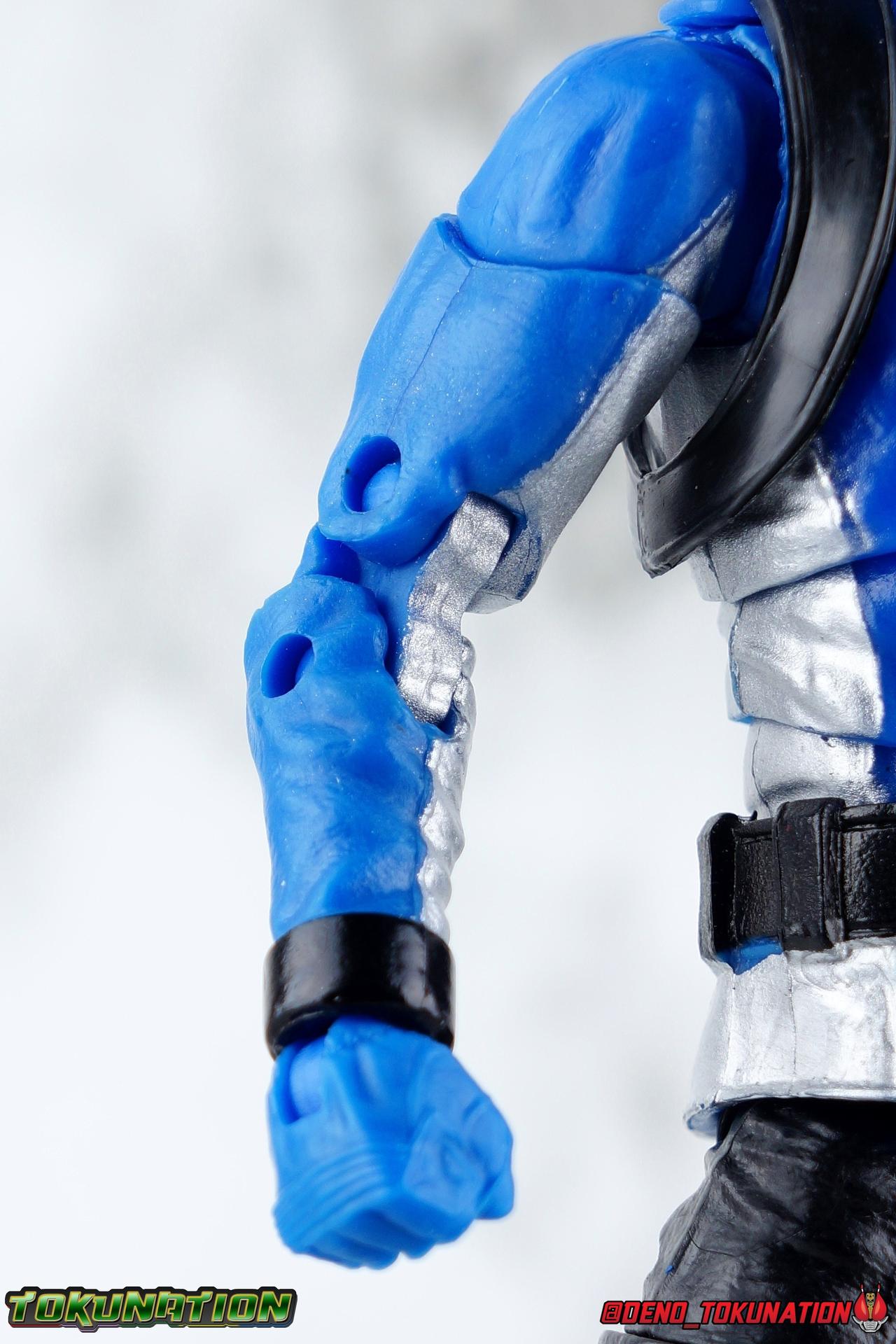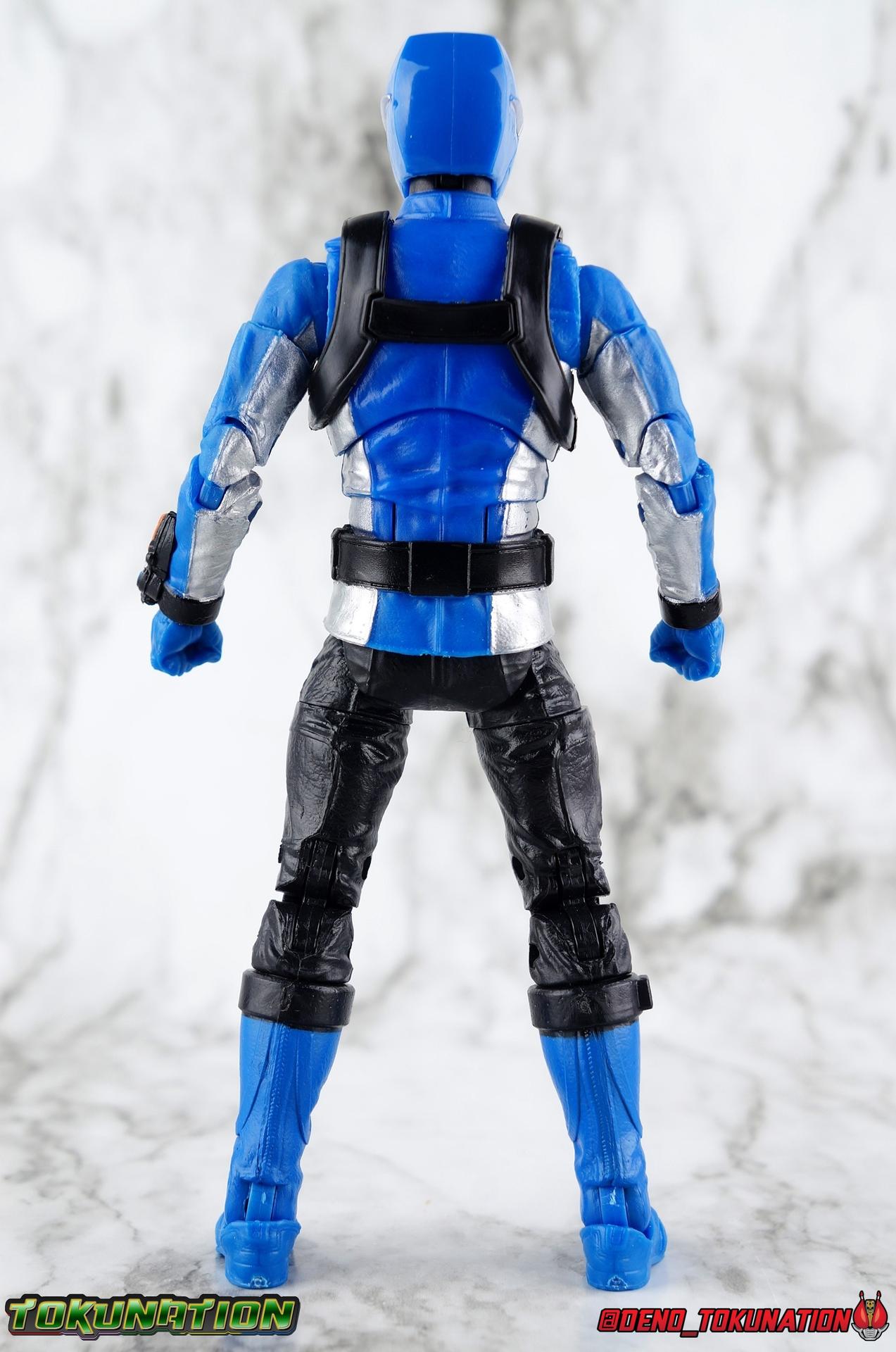 Ravi Shaw was meant to be a Power Ranger. Selected by Grid Battleforce, Ravi trained tirelessly to earn his place & his power with his teammates. But before they could become Rangers, Blaze & Roxy became something else entirely. Avatars, loyal only to the villain Evox! And Ravi's former comrades would have done the same to him if not for the intervention of Devon Daniels & Zoey Reeves. Joining his new friends, Ravi's body is infused with Morph-X energy as well as gorilla DNA, turning him into the mighty Beast Morphers Blue Ranger! Heading into battle with his less experienced friends, Ravi's training will help him build a united front against the enemies who threaten Grid Battleforce and Coral Harbor. Packaging In creating this line, Hasbro was keen to make sure they appealed to collectors and fans of the franchise from throughout it's various eras. Given the aim to make this appeal to an older crowd, the packaging seems to have taken a page out of the Star Wars Black Series book. In similar collector style boxes, the Lightning collection figure's look a bit brighter thanks to a primarily white color scheme. But they also really pop thanks in no small part to some wonderful box art, lovingly crafted by artist Tom Whalen aka @strongstufftom on twitter. His artwork is breathtaking, and makes these figure's feel like just a bit more of a passion project from the folks at Hasbro. Main Figure The Power Rangers Lighting Collection continues to truck right along with the recent releases of Wave 3 as well as official images of the upcoming Wave 4. Recently I had a chance to sit down and give the Beast Morphers Red Ranger a proper gallery & review, so I'm more than ready to tackle the Blue Ranger now as well. These two figures share an identical mold aside from their headsculpts, so my review will be mostly the same. Feel free to skip it if you read the previous one and just check out the pics attached below! This is the second outing for the main Beast Morphers male body. The Gold Ranger set an excellent standard for this team in the line, so I was really pleased with how the core member mold turned out. For years I'd wanted to have a better set of Go-Busters in my collection. I've had all the Go-Busters Figuarts for years, but they definitely have their flaws. This LC mold really does fulfill my desires. Like many LC figures, the Blue Ranger carries through much of the same standard articulation cuts we've come to know. Full rotating rocker ankles and a clicking swivel joint for them to go back and forth. A shin swivel at the boot cuff, allowing you to rotate that portion of the leg 360 degrees below the knee if you wish. A really solid double jointed knee which allows you to fully bend the leg back in on itself. In addition is a 360 thigh swivel as well as full hips with back/forth and outward motion. This standard articulation is wonderful and obvious, but it's the subtle sculpt on these parts that will sneak up on you. The boots themselves are uniformly painted red, which can hide the expertly sculpted design. But it's really the black thighs and knees that hide the most detail. The entire leg has this subtle sort of folded or creased look to it. It looks exactly like the kind of creasing you'd see on real leather, like what the show suits are made of. It's a brilliant and easily over looked detail on this figure. The upper body features the more or less standard design of the ratchet ab joint and the ball jointed upper body. The design pairing just makes so much sense and works so well, and always makes up for the lack of a proper rotating waste joint. You just can't beat it. Obviously with the way the Beast Morphers design features a zipper down the middle of the torso, the design will be broken up by using the upper body joint, but hey it's a toy, not a real person. Around the shoulders is a black harness with a molded in Transporter, just like what the Gold Ranger had. Both figures can quite easily slide these off their arms and swap them if you so choose. The arms are solidly designed, anchored by the butterfly joint in the torso, they provide a full range of movement. The double jointed elbow and peg in hands with wrist swivels really give the Blue Ranger all the flexibility he needs, honestly even more so than an actor in the actual suit has available to them. The two-tone silver/red coloring of the arms means that the bicep swivel can break things up a bit, but it's not the kind of eyesore you'd expect it to be. The left wrist of course features a pretty decently detailed Beast-X Morpher as well. That brings us to the head. The Lightning Collection really has featured so many good headsculpts, ranger & civilian wise. Some do miss the mark ever so slightly, and I think that the Beast Morphers Blue Ranger helmet looks a bit softer than many of the others. Much like the MMPR Pink Ranger. It's a decently sculpted helmet with mostly solid paint apps, the finer details just look a bit soft to my eyes. As an overall package though this is still an excellent figure. It's take nearly 8 years for the Go-Busters designs, now as Beast Morphers, to finally get their due. Hasbro is doing fans like myself a real solid with releases like this. The gallery below also features some side by side comparisons with the S.H. Figuarts Blue Buster to illustrate the big differences between the two. And we've got the perfect buddy to compliment the Blue Ranger with S.H. Figuarts Gorisaki Banana! To terrorize our heroes this go around you can also see how compatible the 6" Basic Tronic, Blaze, & Roxy figures are below. Accessories As always, you should expect a Lightning Collection figure to come with all the right accessories: 1 - Beast-X Saber. Beast Morpher's version of the Sougan Blade from Go-Busters. This version is a bit nicer than the 6" Basic one with slightly better paint apps, though the scale is more or less the same. Obviously something like the Figuarts one is more accurate, but smaller. I wish th