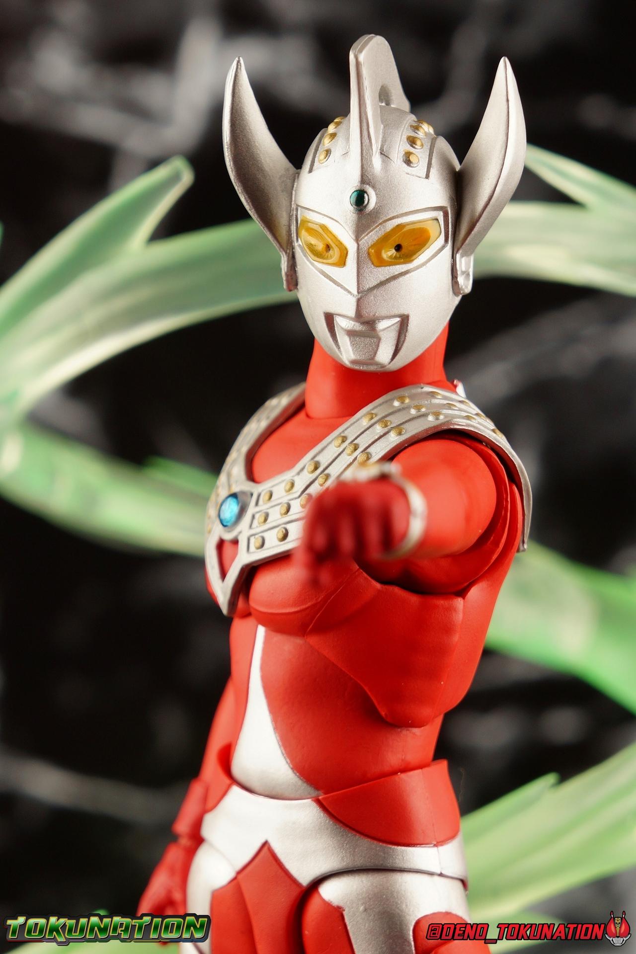 7 years after Earth first encountered the giant of light Ultraman, Ultraman Taro arrived! Taking the human Kotaro Higashi as his host, Taro fought against legions of Kaiju as they invaded the Earth. And for years since, Taro has fought hard and earned the respect of his peers. Mentoring new generations of heroes at the Ultra Coliseum, Taro also went on to instruct the likes of Mebius & Ginga. This Master fighter has lived a long and hard fought life, but that didn't stop him from settling down either. Passing his skills down to yet another generation, Taro instills the hope & power of the land of light in his son, Ultraman Taiga! This figure comes to us courtesy of our friends at Bluefin Brands and Team Rider. Check out their awesome selection of Kamen Rider items, Ultraman items, and more Tamashii Nations & Bandai Japan products! Packaging Like many figuarts of recent years, the Ultraman style packaging has undergone some drastic changes. Taro comes in a gorgeous and colorful box with a sweeping view of the figure, and an outstanding piece of box art adorning the front. I remember when the first revision of Ultra-Act packaging that began with V2's was something special. But what the line does now is really interesting. Taking the general gray & red of the Ultra's themselves, and adapting it to each classic character, this design looks very stylish. I also find it interesting that Ultraman is keeping in line with the older shape and size of Figuarts packaging that Kamen Rider began to shift away from in the Drive era, in favor of slimmer boxes. As characters of much larger stature, I think it helps set the line apart that Ultra Figuarts still come in larger packaging than their less titanic cousins. Main Figure Like I mentioned in my review for Ultraman Ginga, it had been some time since I reviewed any Ultra release. Before Ginga, one of my last reviews had been of the Ultraman 50th Edition set. So after a pair of modern Ultras with Ginga and the Seven Suit, it's nice to return to one of the classics with Ultraman Taro. In the same way as Ginga & Seven Suit, Taro is recreated lovingly and faithfully in this figure. While there is most certainly always something to be said of the intricacy of modern Ultra suit designs, I think there are volumes to be said of classic suits like Taro as well. There's something unmistakably fantastic about the classic red & silver look of classic Ultras. While I've never been a massive fan of the original Ultraman's design, the way that base has evolved over the decades is kind of magical. Somehow the placement of Taro's silver body lines on his slender build, helps communicate his youth and strength as well. While the figure is largely red, the silver paint apps go a long way to bringing out additional detail. Along Taro's legs, hips, waist, and lower torso, these apps are contoured by sculpted in body lines that help create additional depth and detail. Physically the articulation is sort of the Ultraman standard. The typical hinged ankles we see with almost any SHF are present as are a pair of sturdy toe bends. The added gap between the base of the foot and the cuff of the boot also helps add to the range of this joint. While there's nothing new present here, what we have is a tried and tested formula for good basic support. Like Ginga, Taro features some really great knee bends as well, and similarly the silver paint app on the knee continues above and below the exposed joint. This gives you a sense of continuity for the suit as the joint bends. It's little details like this I just love on any release. The built in hip and swiveling thigh combo works to really accent the lower legs as well. Looking far more visually pleasing than the kind of drop down style hips we see from time to time, the built in ones do a great job of keeping the sculpt and suit design flowing in a natural manner. I always appreciate a good thigh swivel as well. It lets a figure replicate the movements of an actual person in a suit in a way that doesn't compromise the figure or it's design in any tangible way. While Taro isn't one of your new-fangled modern bulging muscle Ultras, he still looks pretty imposing. Like Ginga, Taro's torso is separated into two chunks. The lower half is inset to the waist armor on a ball joint, allowing it to rotate side to side within the waist, while the upper body is on it's own ball joint twisting around the lower half. The combination of the two will let you move taro in a number of satisfying ways, exceeding what someone in a rubber suit could actually manage in reality. Taro's chest does feature one of his more interesting design elements as well, the Protector. Something worn by many an Ultra, such as Seven & Zero, the Protector (along with Taro's head and eyes in particular, convey the familial link that Taro has with cousin Ultra Seven. Unlike old Ultra-Acts of the past, this Protector is the perfect fit for the torso, and won't impact the articulation of the arms at all. On to the arms, Taro is another recent Ultra release that doesn't feature bicep swivels, much in the same way as the Seven Suit. Like that releases it's mostly made up for it with some very free moving shoulders. Though Taro doesn't really have the butterfly style joint of Seven Suit, the execution is largely similar. A red cup like part is inset, and the arm is plugged into it via ball joint. When you push the assembly forward the shoulders move in closer to the chest. This works pretty well, but because of the nature of the design the shoulders can also rotate up to be nearly perpendicular with the chest, and rotate a full 360 degrees around the joint. Though it looks less natural on a design based around a suit without armor, it's undeniable that it actually works. It's a pretty well implement design. Some fairly standard elbows and wrists follow this, but overall these choices make a lot of sense. Taro's left wrist features the sculpted in Taro Bracelet as well. An alterna
