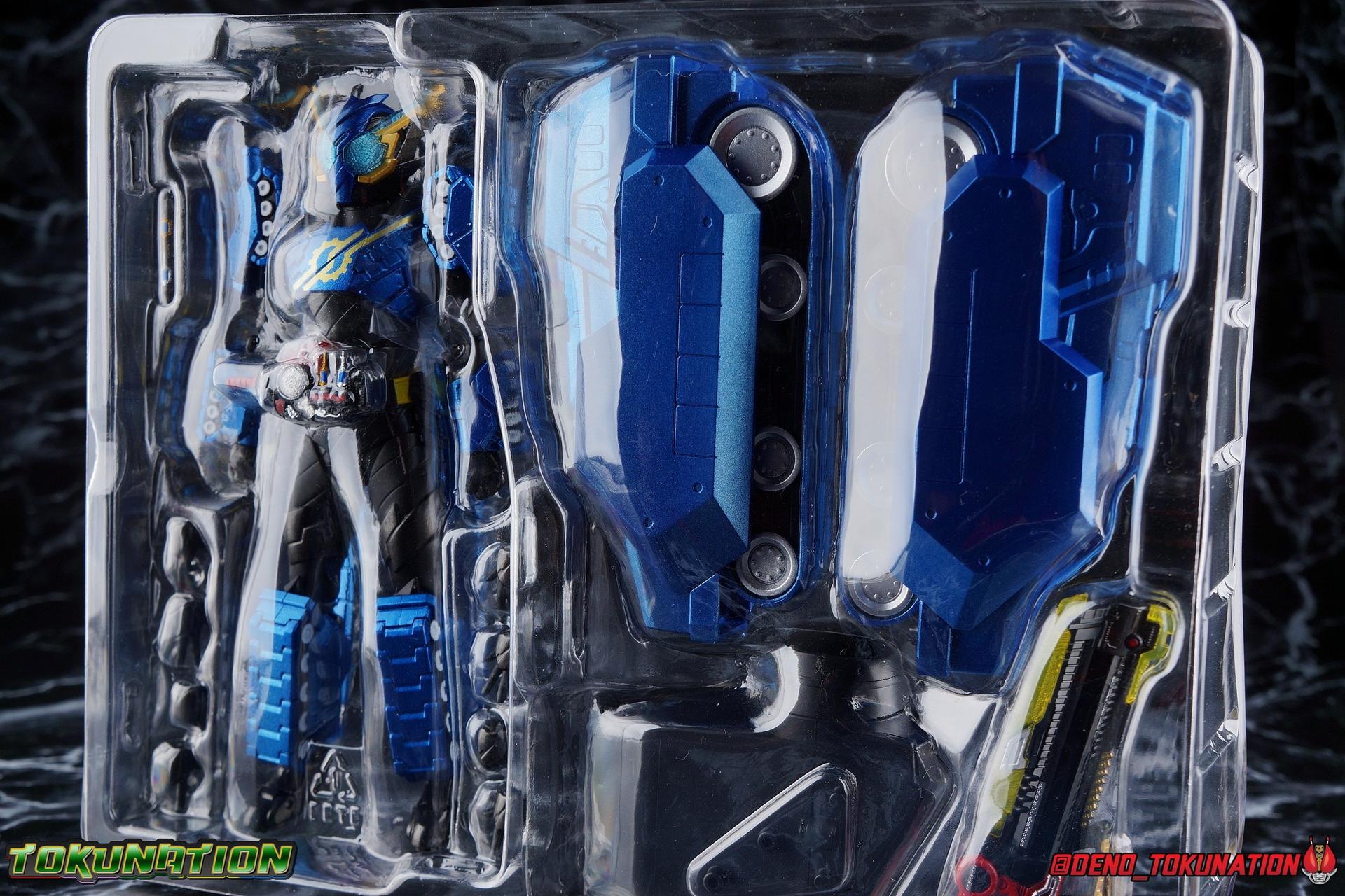 The Hazard Trigger, a weapon of unmatched power. With it, Sento Kiryu can gain the upper hand in any fight, becoming an unstoppable berserker in the process. To contain this uncontrollable power, Sento develops a new Full Bottle to channel his strength and his consciousness. Surpassing the genius of Takumi Katsuragi, and maintaining himself within the chaos of Hazard Form, the Full Full Rabbit Tank Bottle creates two divergent forms! One with all the speed and agility of a rabbit, the crimson speedy jumper Kamen Rider Build Rabbit Rabbit Form! The other, bearing the firepower of it's own military force and the strength to wield it, the steel blue warrior, Kamen Rider Build Tank Tank Form! Representing his home Seito in the 3-round battle, Build will test his new powers against the dangerous Kamen Rider Rogue. Packaging At odds with the regularity of the Build subline's packaging, Tank Tank Form comes in a massive box. While the odd release here and there like the Hokuto Three Crows or Machine Builder have come in expanded packaging styles, this one is quite unique as an alternate form. The large box is primarily the result of the massive Tank Mode parts included with this release, which double the size of the parts trays needed. It's an impressive release and the packaging is evidence of this. Aside from the unusual size the Tank Tank box fits right in thematically with the rest of Build's line. Main Figure Like many figuarts from Build, Tank Tank Form is at a basic structural level, a reuse of the standard Rabbit Tank Form mold. Much of this line is basic parts reuse, with elaborate paint additions to differentiate them, and Tank Tank takes the changes made for the Rabbit Rabbit Form release and builds (ha ha!) on them as well. Essentially the molde is the same with new armor in place of a bulk of Rabbit Rabbit's parts. The legs are identical to Rabbit Rabbit, aside from those massive tank treads on the shins. They may be big but they don't weigh much so they don't cause any instability. And despite the bulk they don't terribly hamper ankle movement, the range is about the same as you can get out of rabbit rabbit, maybe slightly less in the forward direction. The ankle joints *as well as knees and hips) are nice & tight, providing a very stable base of support. And if anything that big raised flat surface on the shin gives the figure a great base to rest one leg down on the ground with. And works well for the included Tank Mode parts. The leg's as a whole function largely unchanged from their very first outing with Rabbit Tank, and really are a dynamic functional design. The torso features yet another outing for the wonderful Build Driver, with a the same additions that came along with both Hazard & Rabbit Rabbit. Carried over from the Hazard Form release is the Hazard Trigger, it's molded in place on the top right of the driver. I wish it was removable for a figure to hold, but if they were going to give us one of those I'm guessing it would have been with the actual Hazard Form figuart. The Driver also feature the new Full Full Rabbit Tank Bottle in it's collapsed form, and colored blue for Tank Tank Form. It's removable as are all Full Bottles in the line, though it can't transform. An alternate accessory is included to replicate the cylinder form. As always an optional Full Bottle holster is attached to the left hip as well, though I refrain from using it out of fear of losing bottles. The torso features armor that's functionally the same as Rabbit Rabbit, but is cosmetically differnet, sporting a really cool tank tread pattern this time. The chest armor feels like a proper piece of torso armor wrapped around the figure, rather than two piece of armor fused together as is traditional of Build's red/blue asymmetrical forms. Emblazoned on the chest is the golden Build emblem as well. I've always really dug this gear like symbol and I wish more riders had something like it on their suits. The arms are likewise mostly the same as what Rabbit Rabbit gave us. The shoulders do feature new rotating mini-tank pads. Each is on an up/down hinge but also has a full 360 ball joint so they can be spun forward to simulate shots being fired. The basic design of builds arms means that the shoulders have plenty of room to move out from the body to maneuver and angle, while maintaining a very natural look. The forearms continue the tank theme with more big beefy treads that thankfully don't add a ton of weight to the design. As always the Build mold's wrist design works wonderfully. Tank Tank also has it's own version of the signature coattails. Rather than pegging directly into the back on a ball jointed peg, these flowing tank treads attach to the underside of a couple panels. You lose a little bit of the freedom of movement from the rabbit rabbit design, but they still work just fine and don't interfere with how the figure functions. Tank Tank's tread are made of a softer plastic and are therefore a bit more flexible, but still lightweight so they're never a problem for balance either. It's the best of both worlds and Tamashii needs to implement something akin to this in more figures. Finally Tank Tank's head has the obvious base of the Hazard Form, as seen by the black spires coming out from behind the mask. The new tank visors are (like rabbit rabbit) easily some of the best I've seen from the line as well. The clarity of the underlying pattern is near crystal clear, and the gold accent really makes them pop. And while this figure can't exactly replicate the little Advance Wars style battalion of tanks descending on the battlefield (much as Rabbit Rabbit has no giant jumping rabbit mode) for Sento to armor up with, it is an absolutely solid retool of an already tried & true mold. The overall package s very impressive without even taking into account the accessories. Accessories 4 - sets of hands. As always, the Build line continues to give us a wealth of expressive options for each figure. Two ty