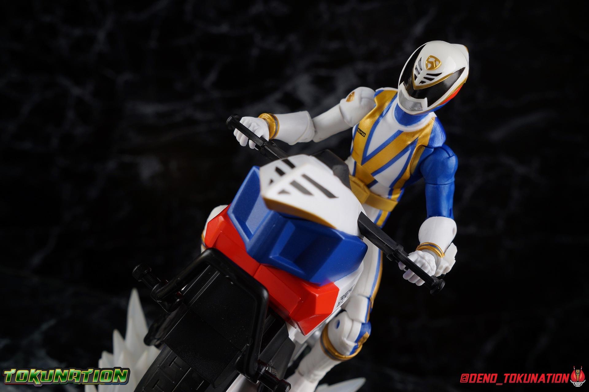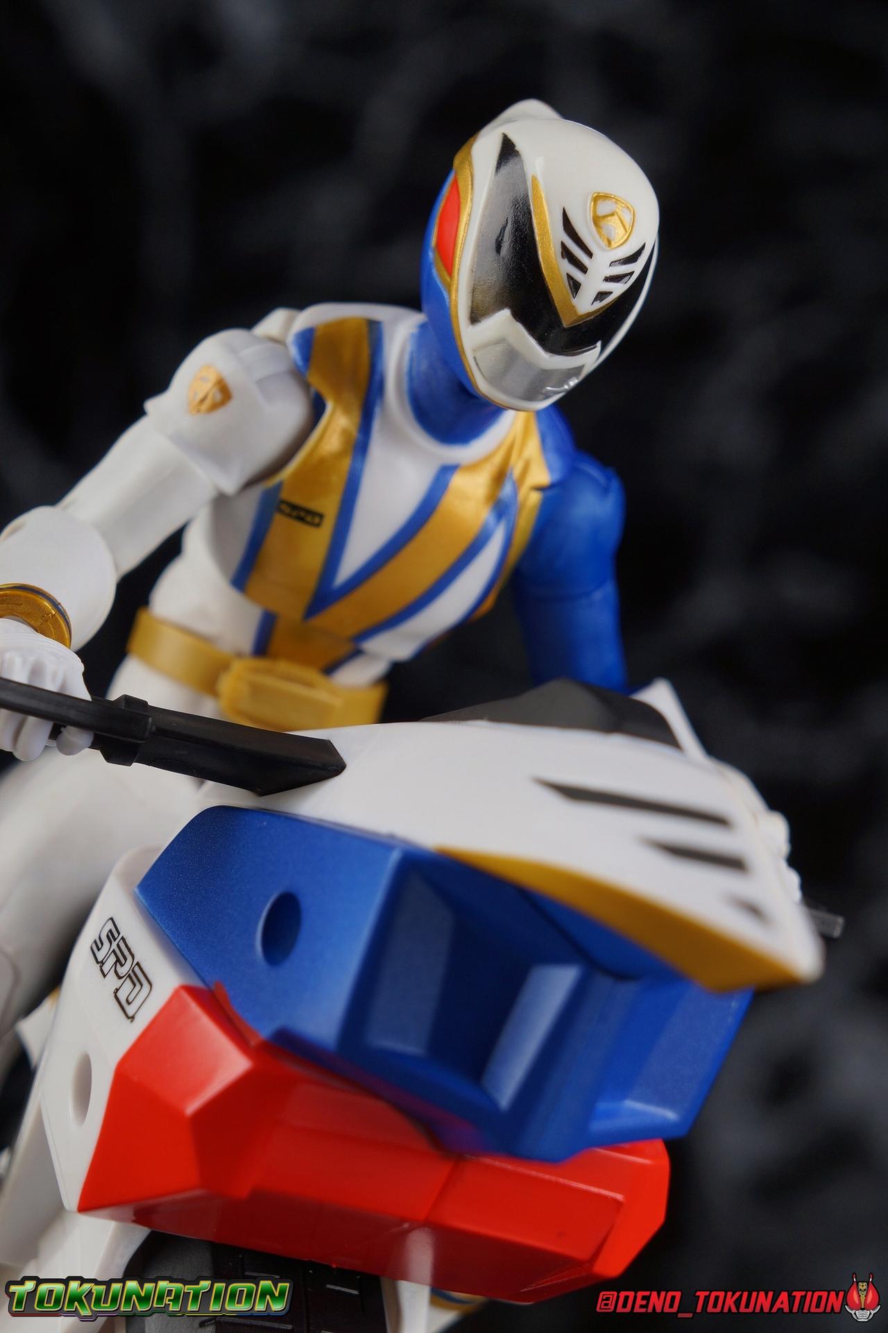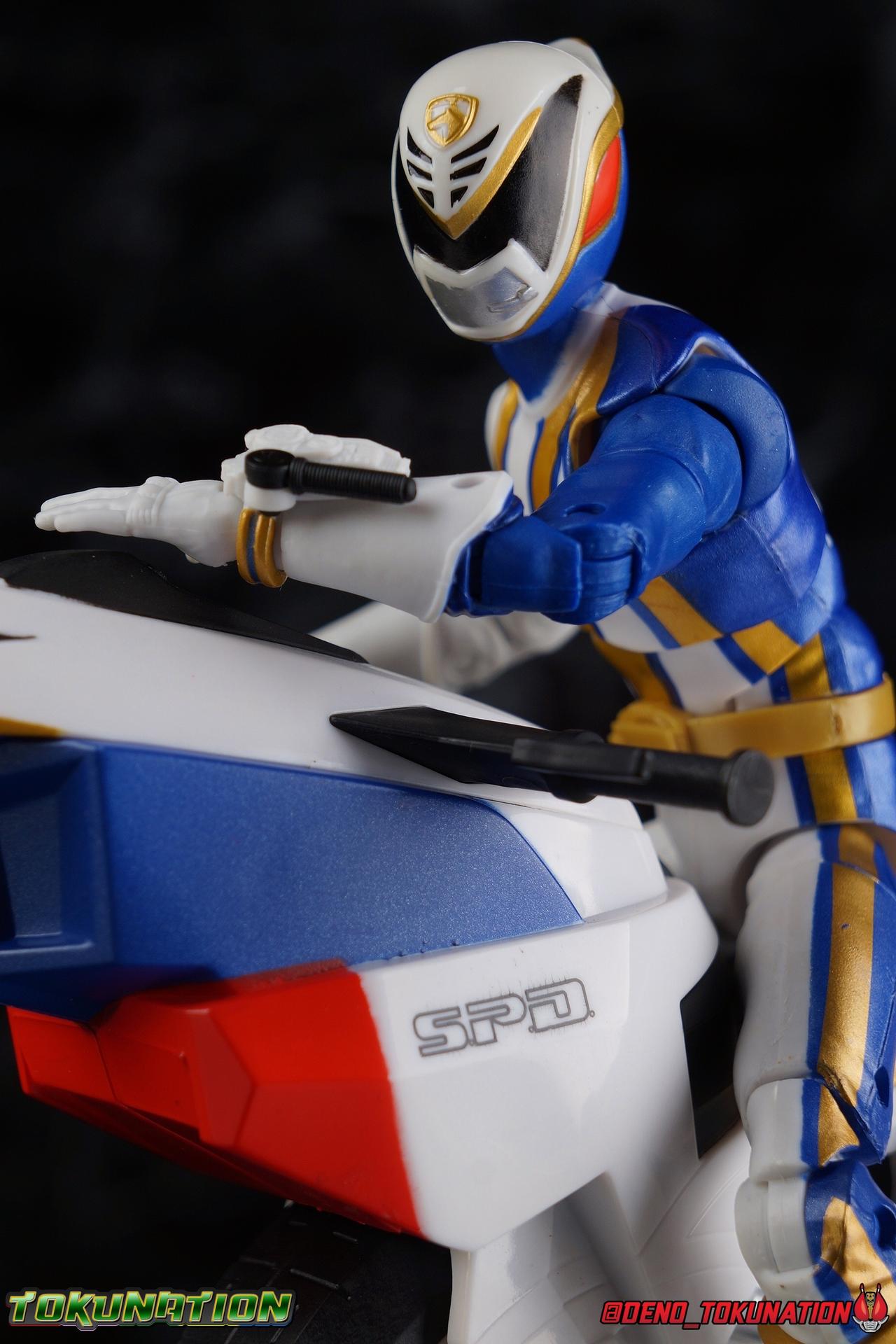 In the year 2025 Space Patrol Delta protects the galaxy and Earth, from threats both terrestrial and extra. And the SPD B-Squad has done a valiant job defending Earth since the mysterious disappearance of the A-Squad Rangers. But facing their toughest enemies yet, and even with the help of Shadow Ranger, they may not be enough. In their darkest hour, a mysterious being of light arrives to turn the tide in the fight against Emperor Grumm and his legions. A force from the future has returned to his past to save it! SPD Omega Ranger! Packaging As we are all pretty familiar with the line by now, I'm sure I probably don't need to go through my usual list of reasons why it's awesome. Hasbro was keen to make sure these appealed to collectors and fans of the franchise from throughout it's various eras. And they also really pop thanks in no small part to some wonderful box art, lovingly crafted by artist Tom Whalen aka @strongstufftom on twitter. His artwork is Magnificent, and makes these figure's feel like just a bit more of a passion project from the folks at Hasbro. This release is a bit more unique because of it's size, giving us a really fantastic full profile spread on the front of the box. Main Figure It goes without saying at this point, Hasbro has got me locked in with this toyline. I buy every release, every slight variation. They've got me. But when they pull out a character and design I really love, there's no question I'm in on that release. Cue SPD Omega Ranger. A fantastic design from one of my favorite Power Rangers seasons, and pack in his unique vehicle as well? This is one of those "chef's kiss" scenarios for me. For starters, I know what you're thinking, this figure likely is a repaint of the SPD Red Ranger mold. This would be a solid, but partially incorrect assumption. This figure actually uses the Time Force Red Ranger mold as it's base, though it does appear to have SPD Red's legs at least. Which is an odd choice for sure, especially given that the SPD Red Ranger had molded SPD badges on the upper body and instead Omega Ranger has a paint application where those would have been. Omega Ranger has a fairly basic body style and no cumbersome armor components and like most of the line he some of the same basic articulation implementations. The essential changes here being cosmetic ones. The entire body is white plastic, but has paint apps to greatly break it up. Starting with the legs here's a sculpted raised line on the boot cuff/shin swivel carried over from SPD Red, that's painted in gold and blue. The figure features full rotating rocker ankles as well as a clicking swivel joint for them to go back and forth. Above this is the shin swivel/boot cuff, allowing you to rotate that portion of the leg 360 degrees below the knee if you wish. Then we get a very playful double jointed knee which allows you to fully bend the leg back in on itself. This is already great but there's also a 360 thigh swivel as well as full hips with back/forth and outward motion. Going backward you will impact that standard sculpted butt plate, but it isn't a major hindrance. All of these cuts are executed in the now standard Lightning Collection styling, doing their best to not be obtrusive to the character's design. The left leg of course has some really nicely done blue and gold striping that goes all the way up from knee to hip and along the torso. The joints can break up this deco a bit but honestly they did a really good job with this. Omega Ranger features the signature SPD buckle and belt around his waist (carried over from Red), though it has a subtle sculpt. It could definitely use a paint wash to bring those details out a bit more. Nothing else to note really on the belt, it's quite a bit simpler affair compared to Red who had blaster holsters and a dummy morpher. The rest of the torso is totally standard stuff, carried over from Time Force Red. The lower half has a satisfying ratchet ab joint, while the upper body sits on a ball joint. The combination of the two gives you quite a bit to work with when posing. The big thing of note here is the wonderful "VI" paint app and the SPD badge app on the upper right. While the spacing of the "VI" is too far apart, I have to say it's done quite well. Moving the body breaks up this design but that's be expected of any ranger with an elaborate paint app like this. The arms hit the sweet spot with that classic butterfly style shoulder joint. As you angle the shoulder back, the body slides out to fill the gap and vice versa. There's a full 360 rotating bicep swivel, double jointed elbows, and the same peg style hands as the rest of the line (though hand options are limited with this one). But, in the same way that a handful of other LC releases have thus far, SPD Omega's arms are oddly positioned. They don't have the ability to rest against the figure's torso naturally and instead angle outward somewhat. The left arm of course features the signature Omega Morpher. The big drawback here is the total lack of paint apps on the Morpher, and I'm super bummed about it as well. But it doesn't kill my interest in the figure or appreciation for it necessarily. The Morpher has a moving throttle that the figure can manage to grab onto pretty well actually too. Lack of paint apps aside the sculpted details are very sharp on this part as well. The head is another really solidly sculpted example from this line. While the paint apps are just a tiny tiny askew on mine, overall I'm quite pleased. Omega Ranger's helmet has always been such a unique design, looking like a futuristic bike helmet or an aerodynamic electric super car. And it works really really well on this figure. The neck features the standard balljoint on a hinge and it still gets the job the done, while I do feel it could use a bit more clearance around the edges of the helmet. Overall the execution of this figure is really brilliant even if there are some minor issues still. Paint deco issues are of cou