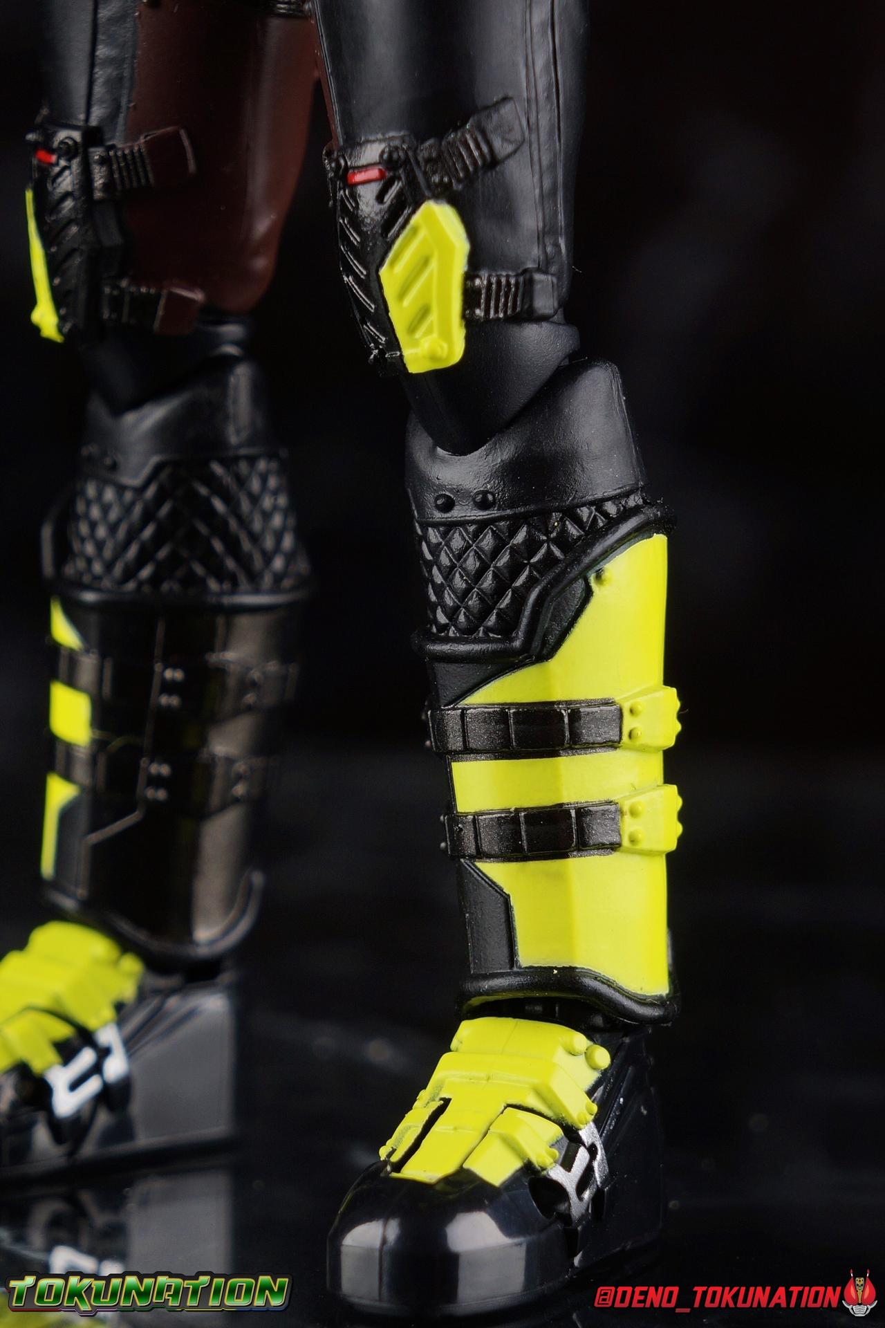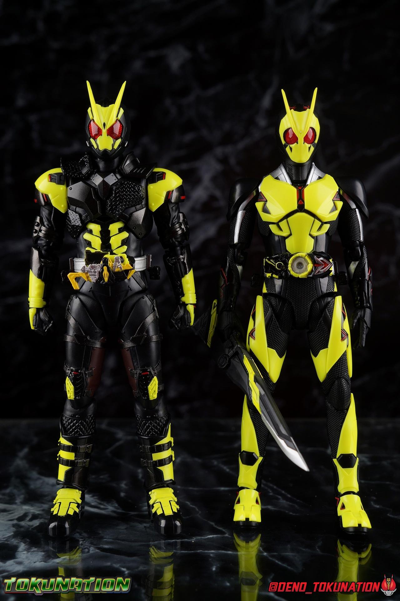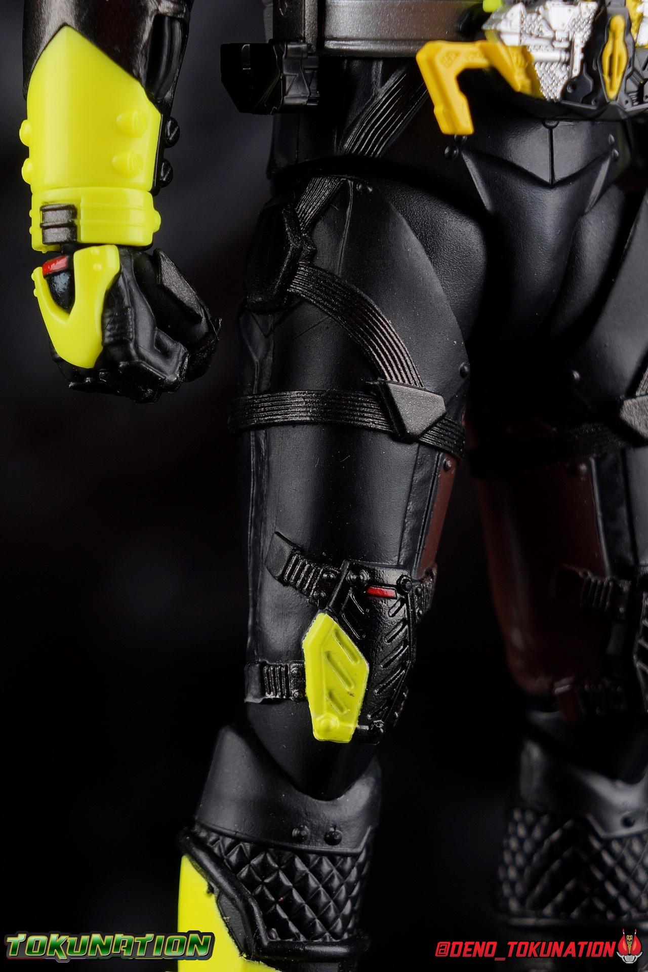 In a world where the life of the average human has been made easier by machines called Humagears, Hiden Intelligence is at the forefront of technological advancement. But with the passing of their founder, Korenosuke Hiden, the duties & responsibilities of president have passed on to his grandson, Aruto. Authorized to use the Progrise Keys & Zero-One Driver, he fights to build a world where Humans & Humagers can coexist, as Kamen Rider Zero-One! But in another world, one where Humagears exterminate humans, Aruto is on the run. His company lost, his driver taken, Aruto must rely on the terrible power of the Forceriser given to him by a mysterious stranger. Working With Zi-O, Geiz, Woz, & Tsukuyomi, Aruto fights to bring his world back and begin a new generation of heroes as Kamen Rider Zero Zero-One! Packaging Kamen Rider Figuart packaging stepped up a bit with Zero-One Rising Hopper's box mostly thanks to the cosmetic effects of black light reactive materials in the box. Zero Zero-One doesn't exactly reinvent the wheel either, but I enjoy the techy aesthetic of Zero-One rider packaging very much so there isn't much to complain about either. We're here for the gorgeous figure inside the box anyway. Main Figure Zero Zero-One is of course Zero-One's movie exclusive form from Reiwa: The First Generation. A team up film between the cast of Zi-O & Zero-One that see Aruto lose his original powers and be forced to fight using a Forceriser. Bearing that in mind, the design of this costume falls right in line with the other early Forceriser based suits of the series, Horobi & Jin. You might imagine this suit being just a repaint of one of those two with a Zero-One head plopped on top as well. I assumed that myself originally. But I was wrong. For starters, and this is pretty wild, the entire lower half of Zero Zero-One's body from the waist down is more or less borrowed from Night Rogue! That's right, the mold that never dies and was used to craft Night Rogue himself as well as Blood Stalk, the Hell Bros, and Mad Rogue. Now those parts have been carried over to create Zero Zero-One. However it's not as simple as the legs being stuck on with new paint apps. At a close inspection you can see that all the general details are present, but they've been altered. The shape of the boot is nigh identical but doesn't go as high up exposing more of the cross pattern print underneath, and the lateral straps are similar but the ones on Zero Zero-One are of a new molding. the feet have all the same molded parts on top, but new paint apps point out rivets that weren't noticeable before. The knee pads share the same design but are attached above the joint on Zero Zero-One, even the thighs and hips are the same, but new straps have been layered on top of this and wrap around fully. The biggest and very odd difference between Zero Zero-One & Night Rogue's legs is that on Zero Zero-One, the upper leg interiors have been painted brown. Something that was entirely missing from Night Rogue when he was released. A feature of the original Night Rogue suit that was eventually dropped during production in favor of the all black costume. The thing is, the Zero Zero-One suit doesn't have any brown on his inner legs! So is this just an oversight on Bandai's part? Are they letting on that we may finally see an accurate brown suit Night Rogue released? It's a weird one to ponder. That being said, with these legs come decent articulation, though not the best. Now one of the few flaws I originally found with the mold, was the ankle design. Because of the way the cuff of the shin armor comes down around them, you do lose a small portion of movement in all directions. But the ankle ball is also designed in such a way that you can't really angle the feet outward properly. It's still a bother but it still works well enough too. Despite appearances, the bulk of the thighs doesn't impede leg movement either. As with the others, this figure can pose with the best. As before with this mold, I recommend you definitely pull the hips down far enough before moving them up, if you don't then the waist armor can dig some small grooves into the hips. Around the waist we get some parts reuse appropriate to this series with a Forceriser carried over from Horobi & Jin. To be fair I haven't reviewed those guys yet, as at the time of their release I didn't have a middleman anymore. I'll track them down eventually. But for now some of my comparison is based on official photos. The Forceriser and belt attached to it are carried straight over with no changes. That means this belt also isn't technically functional. The trigger on the forceriser which forces open Progrise Keys is molded in place, so it's permanently in the opened position. The riser also contains a permanently opened Rising Hopper Progrise Key carried over from Zero-One himself. Same sparse details I'm afraid, but more noticeable since it's out in the open now. Above the waist are some more familiar parts. First the ab chunk of the torso, with it's sculpted musculature that really sets itself apart from Horobi or Jin, is actually the same one from Night Rogue! The difference here is that the abs have been painted giving this section more depth, really setting it apart. The upper half of the torso comes courtesy of Horobi. It's his upper body and strapped armor, just in glossy black instead of brushed silver. Despite being an odd combination of parts from a couple of different molds, the torso has lots of useful range in the joints. The upper body is bulky and certainly more limited than some figures, but it's surprisingly agile. The arms appear to me to be new parts entirely. If they share molding with something else, I haven't been able to place it yet. Regardless of where they came from though, they're pretty bad. They have rather large shoulder pads that impact the chest armor carried over from Horobi, making upward shoulder movement difficult at best. Tight bicep swivels aren't neces